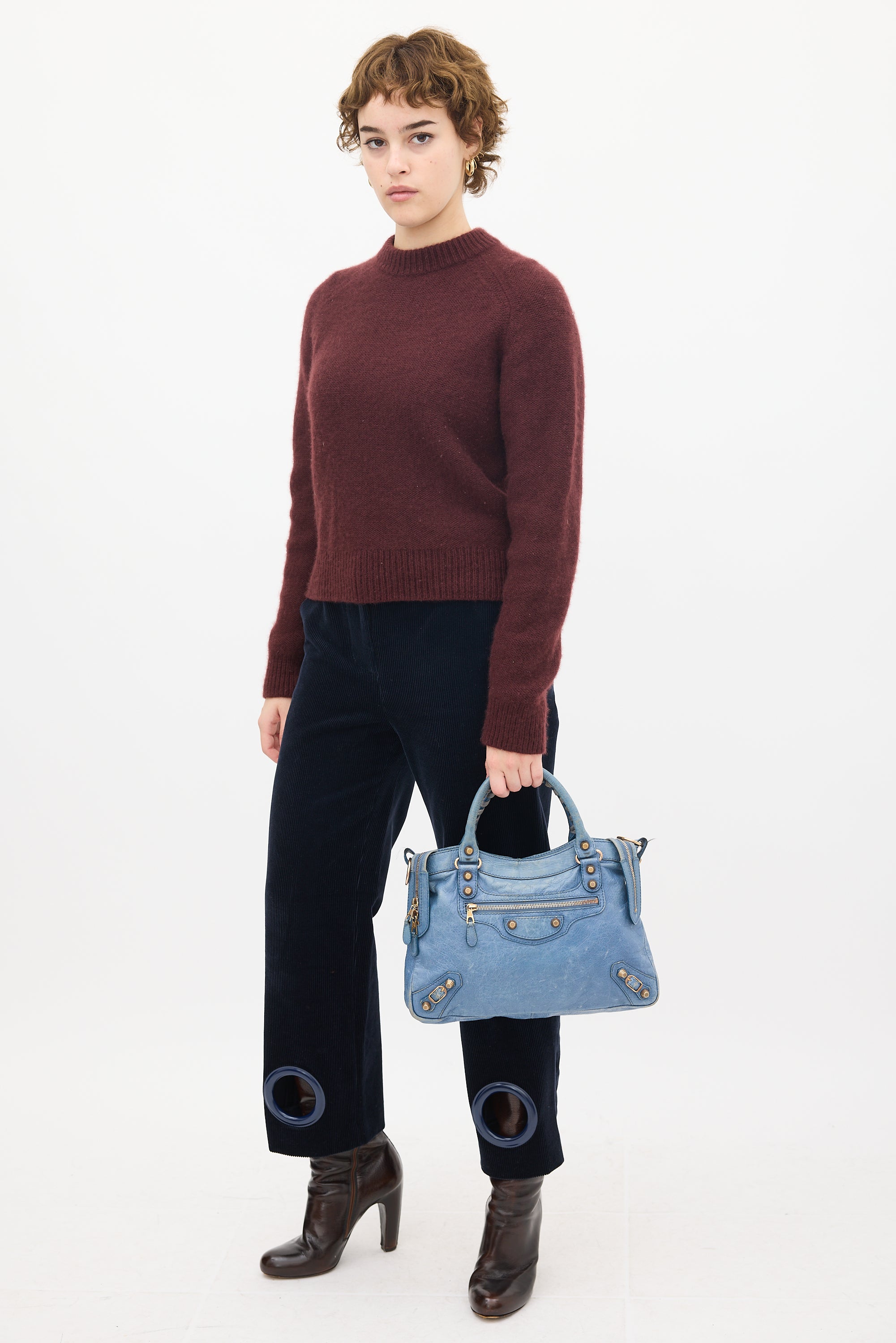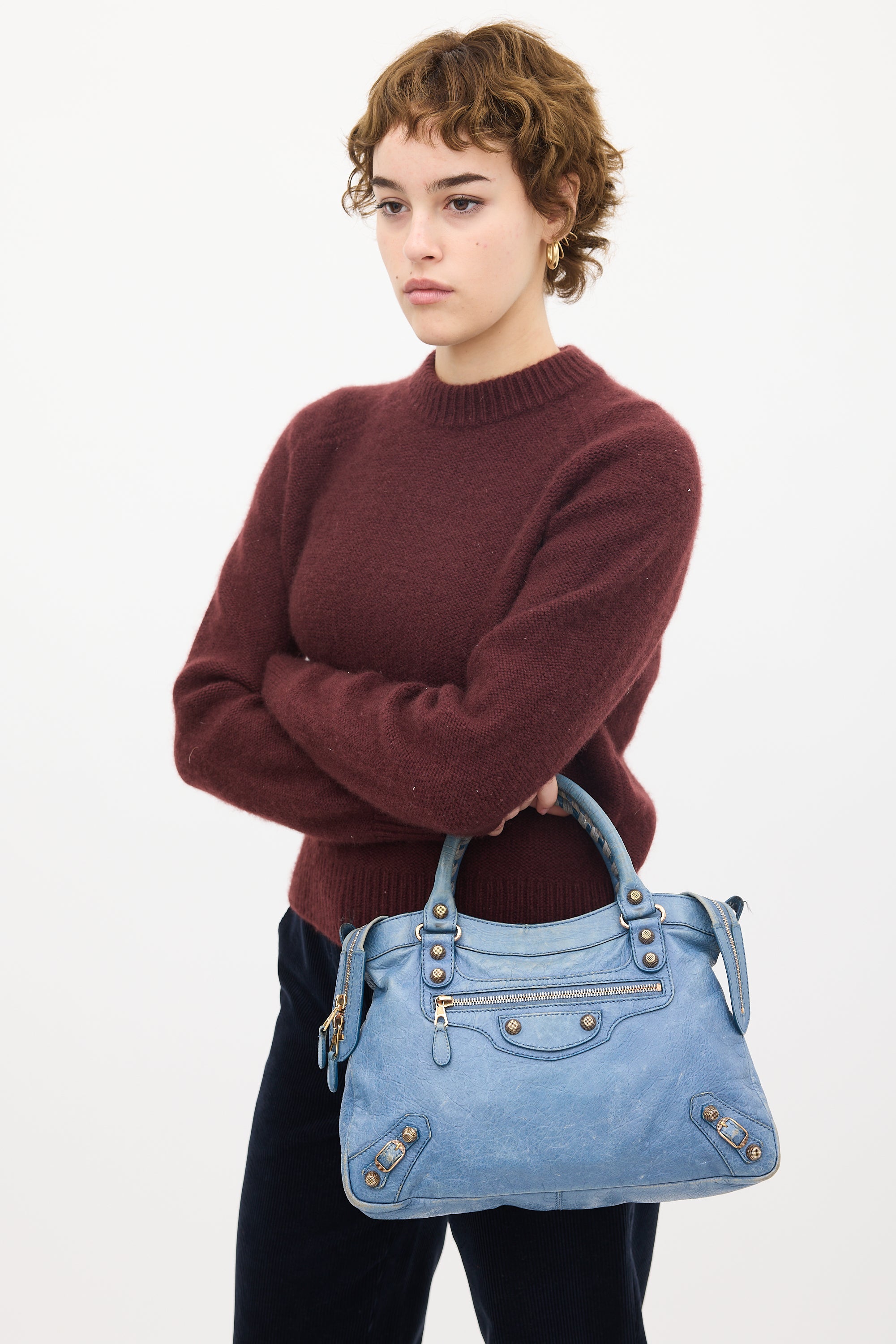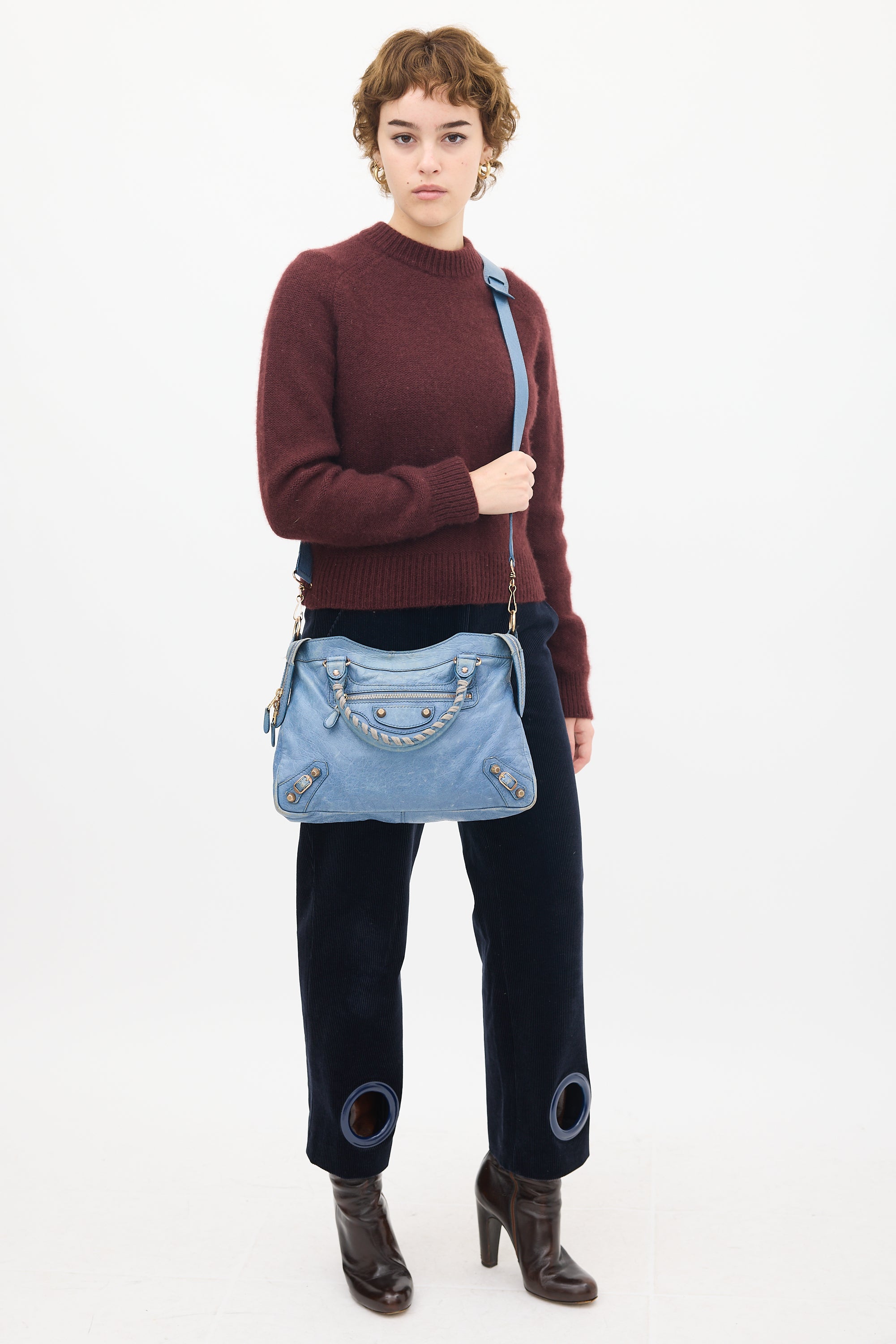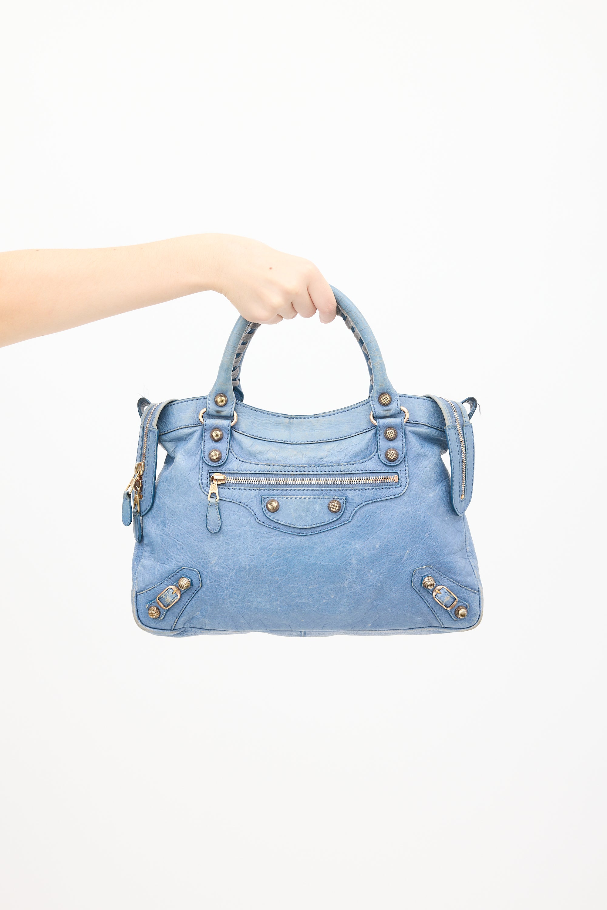 Pre-owned Balenciaga blue Motocross City leather bag featuring two braided top handles, front exterior zip pocket, detachable shoulder strap, one main compartment with two slip pockets and one zip pocket, gold tone hardware, and top zip closure.
