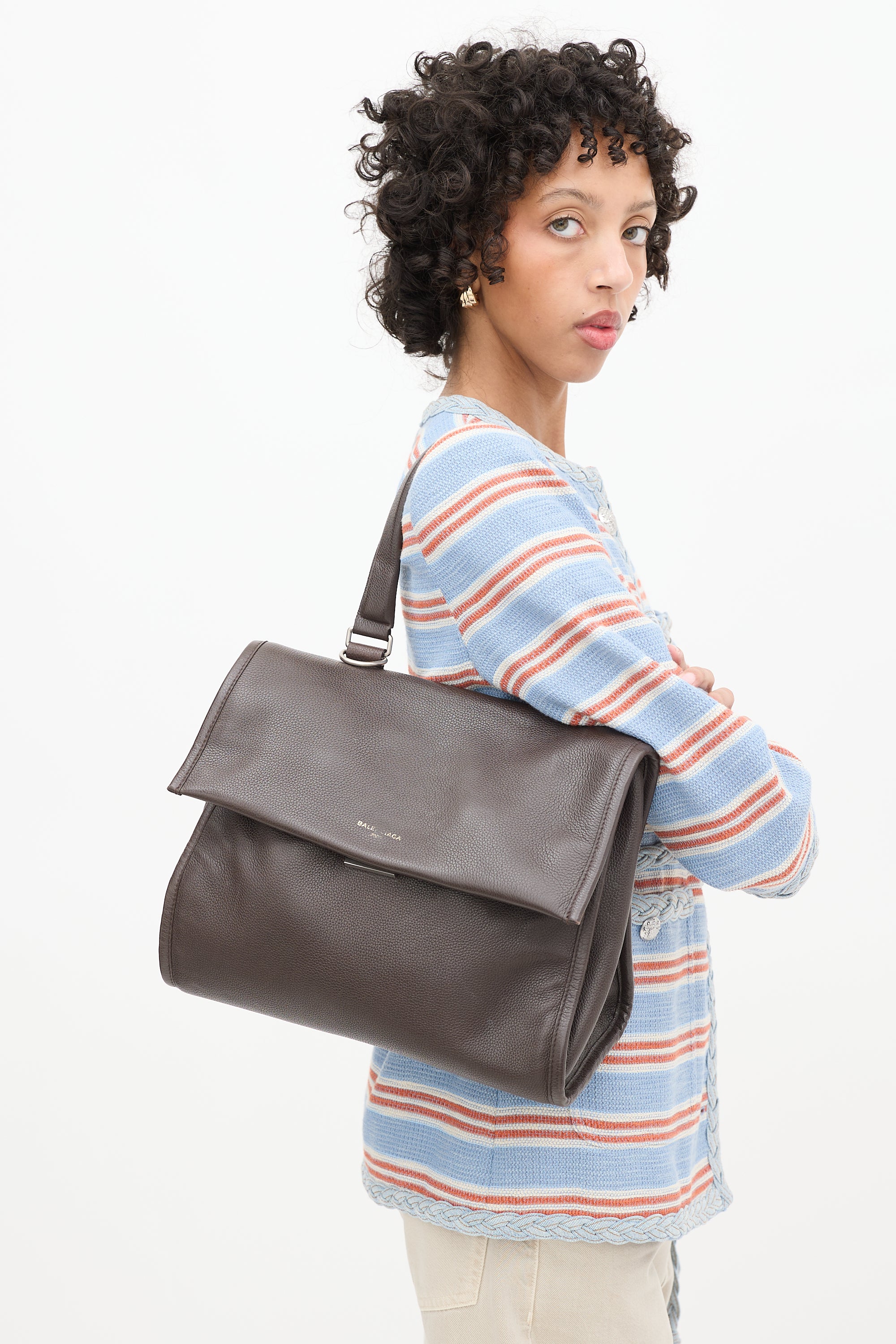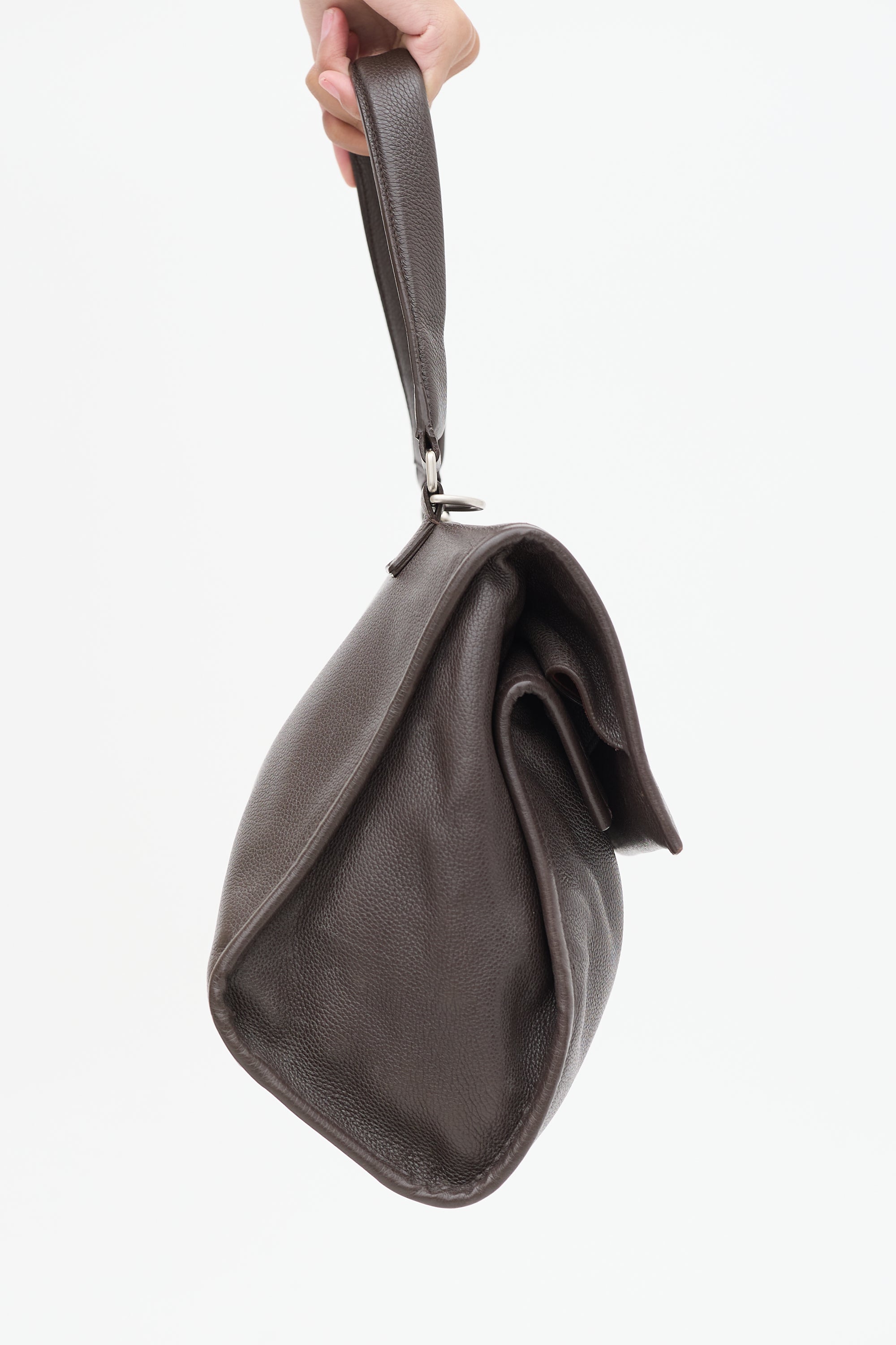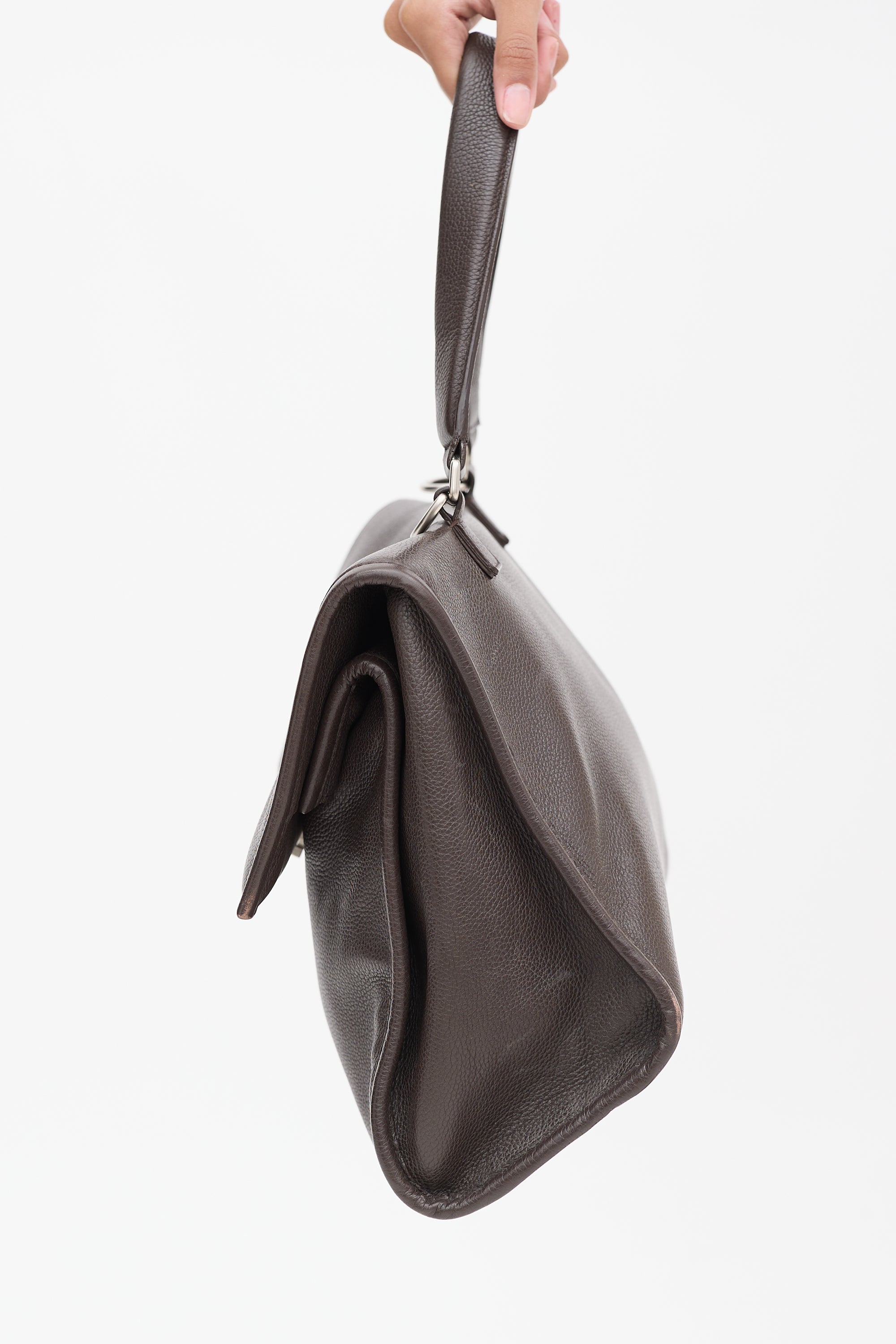 Pre-owned Balenciaga dark brown leather Tool Satchel bag featuring tonal stitching, silver tone hardware, four protective feet at base, single flat top handle, detachable and adjustable leather shoulder strap, front flap with gold tone printed logo, push lock closure, and one lined main compartment with folded construction, one zip pocket, and one slip pocket.