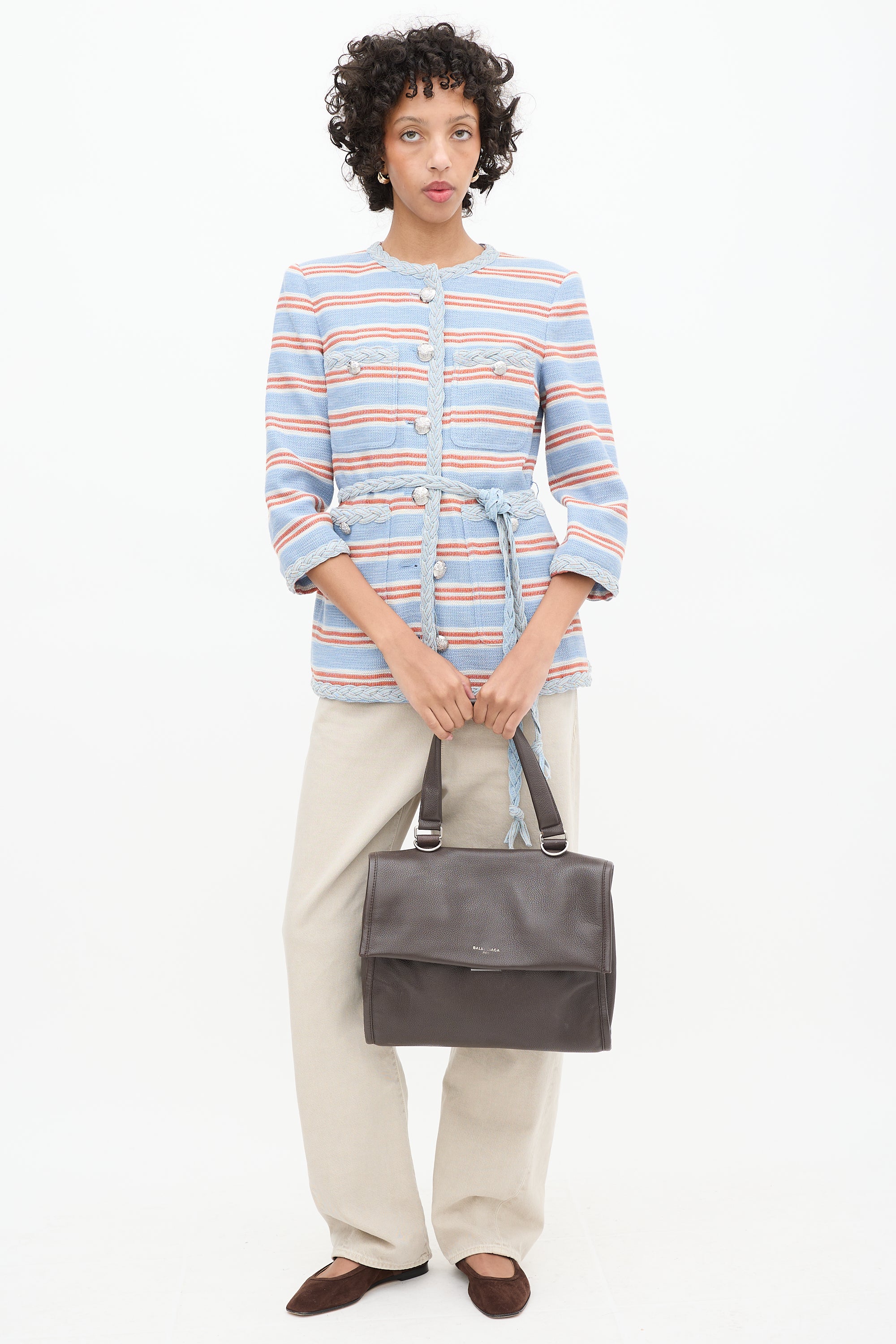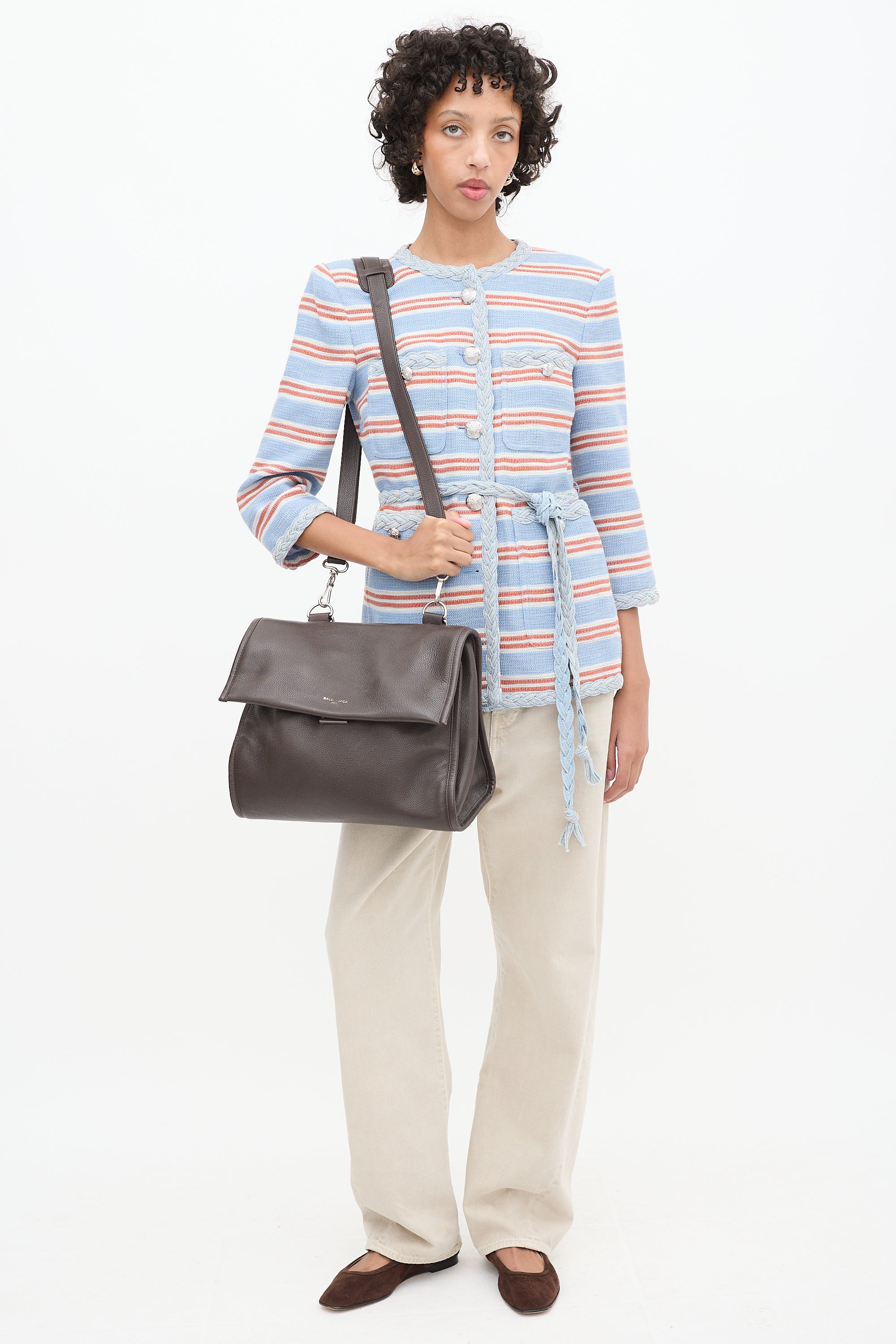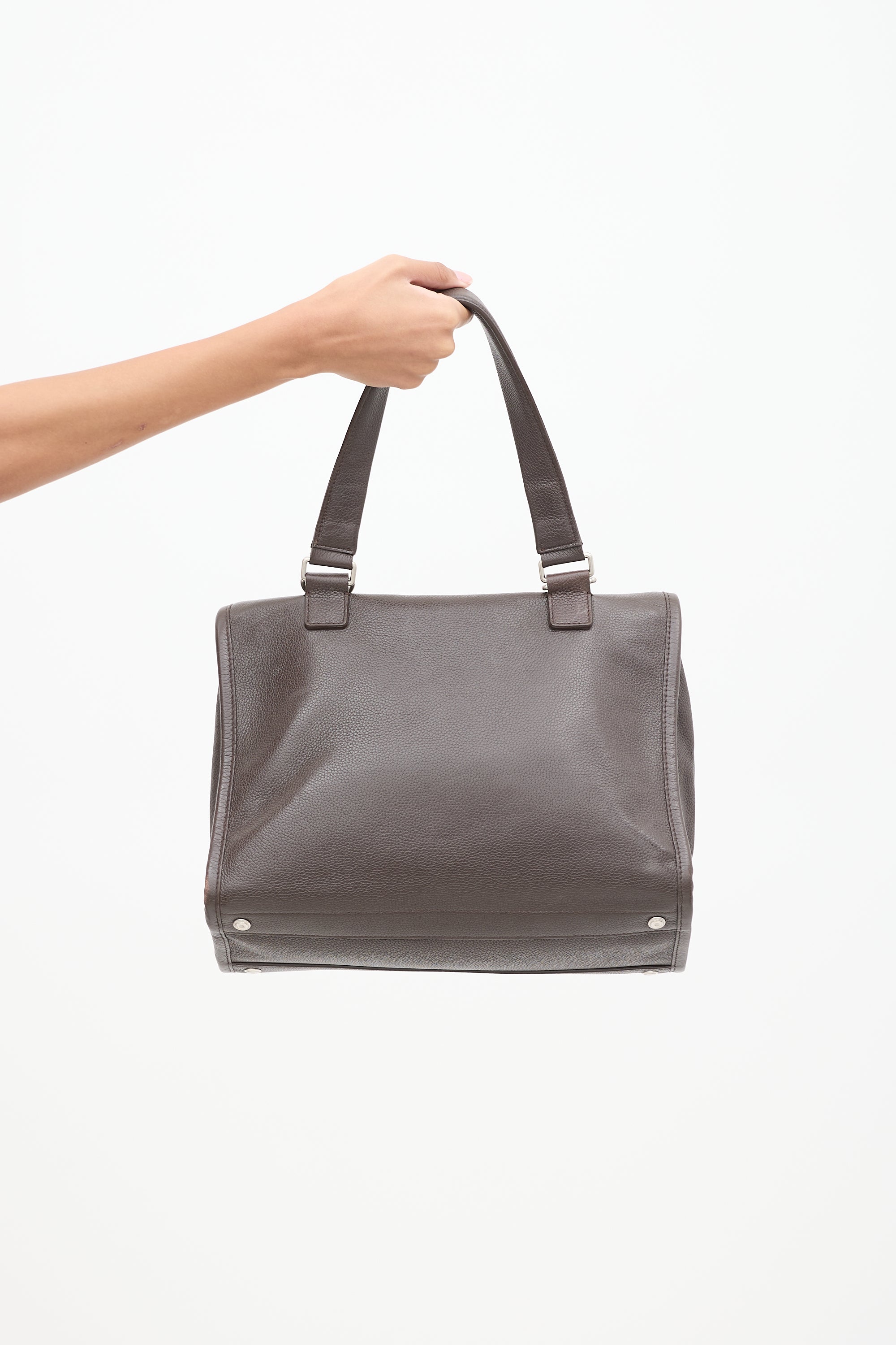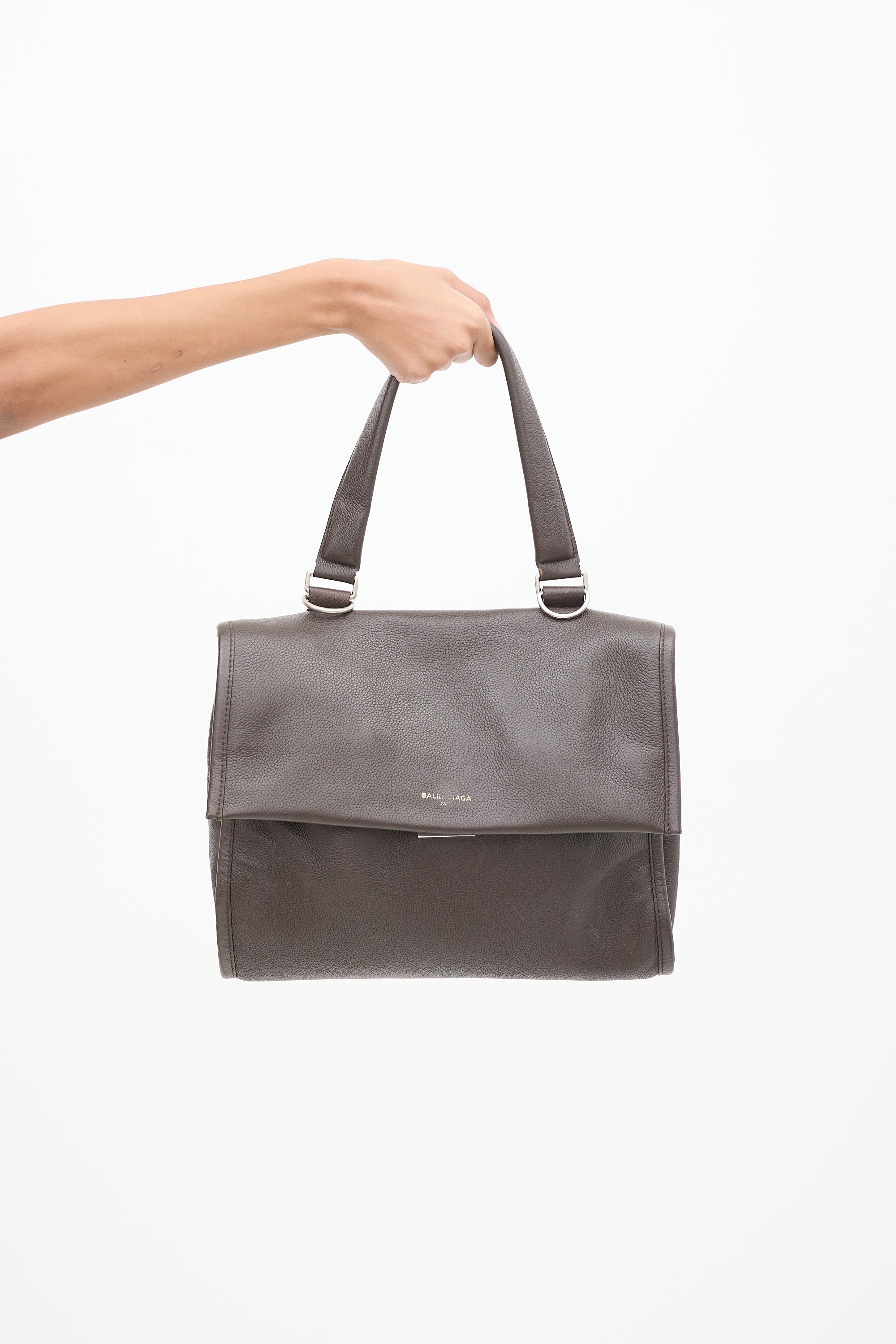 Pre-owned Balenciaga dark brown leather Tool Satchel bag featuring tonal stitching, silver tone hardware, four protective feet at base, single flat top handle, detachable and adjustable leather shoulder strap, front flap with gold tone printed logo, push lock closure, and one lined main compartment with folded construction, one zip pocket, and one slip pocket.