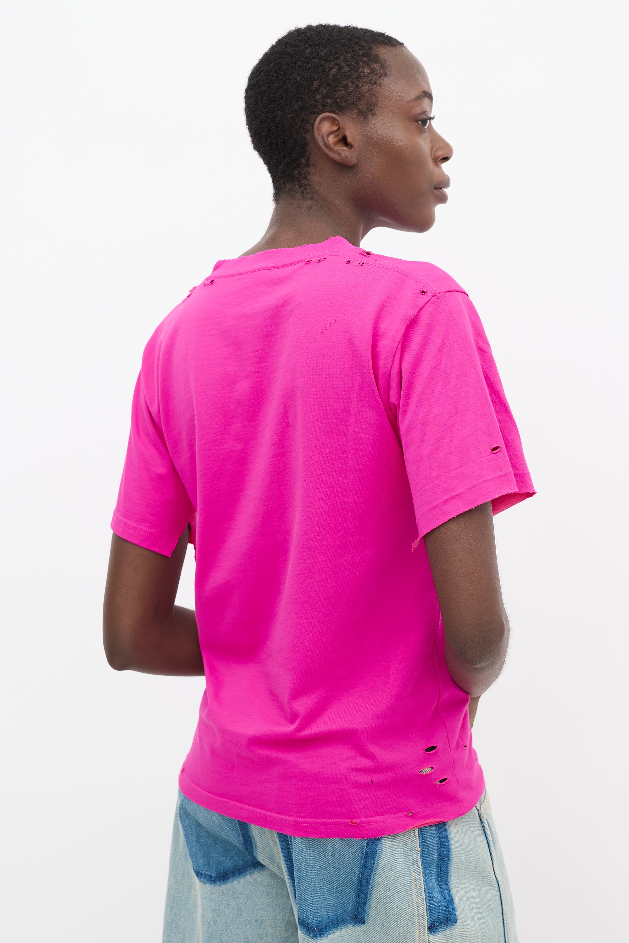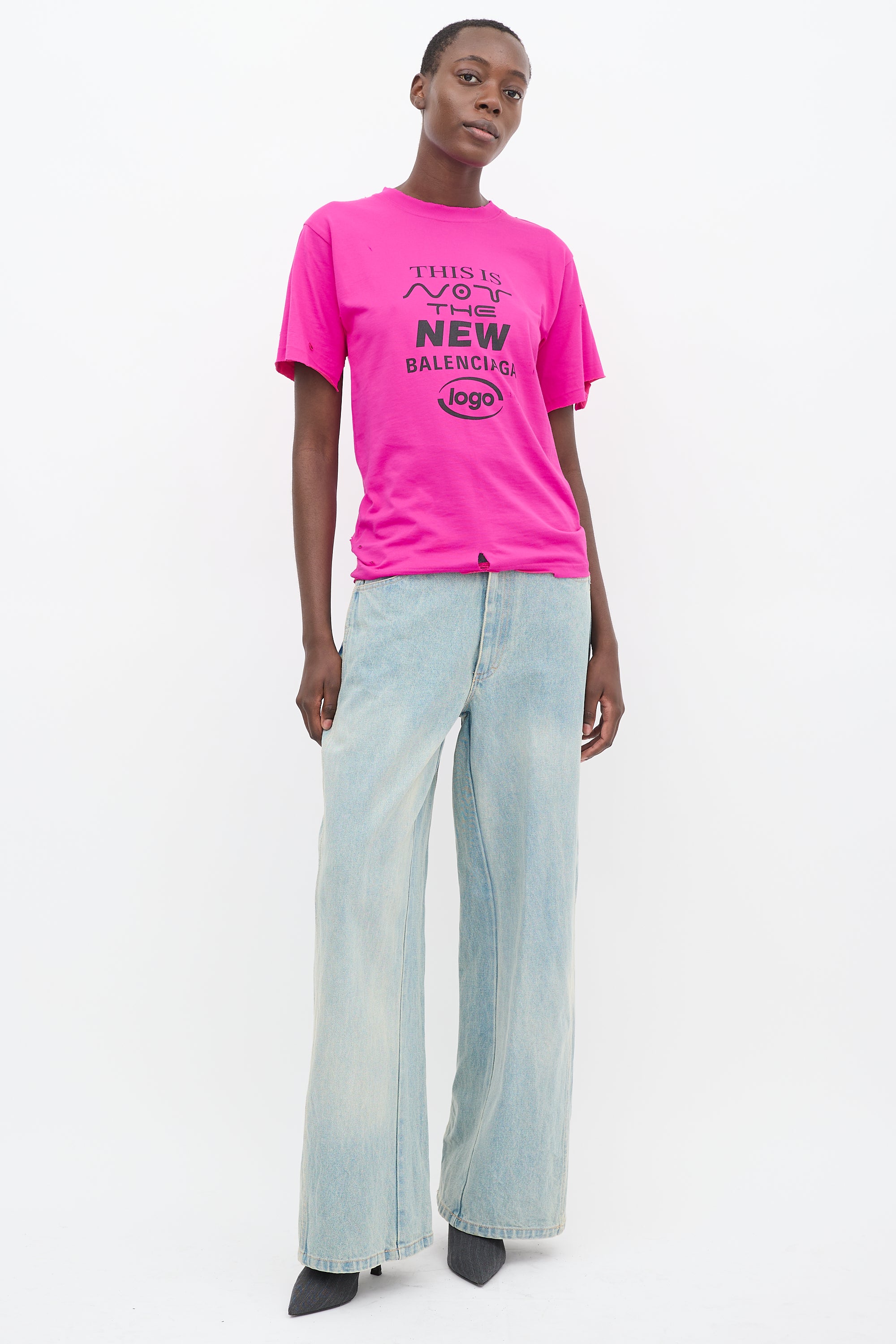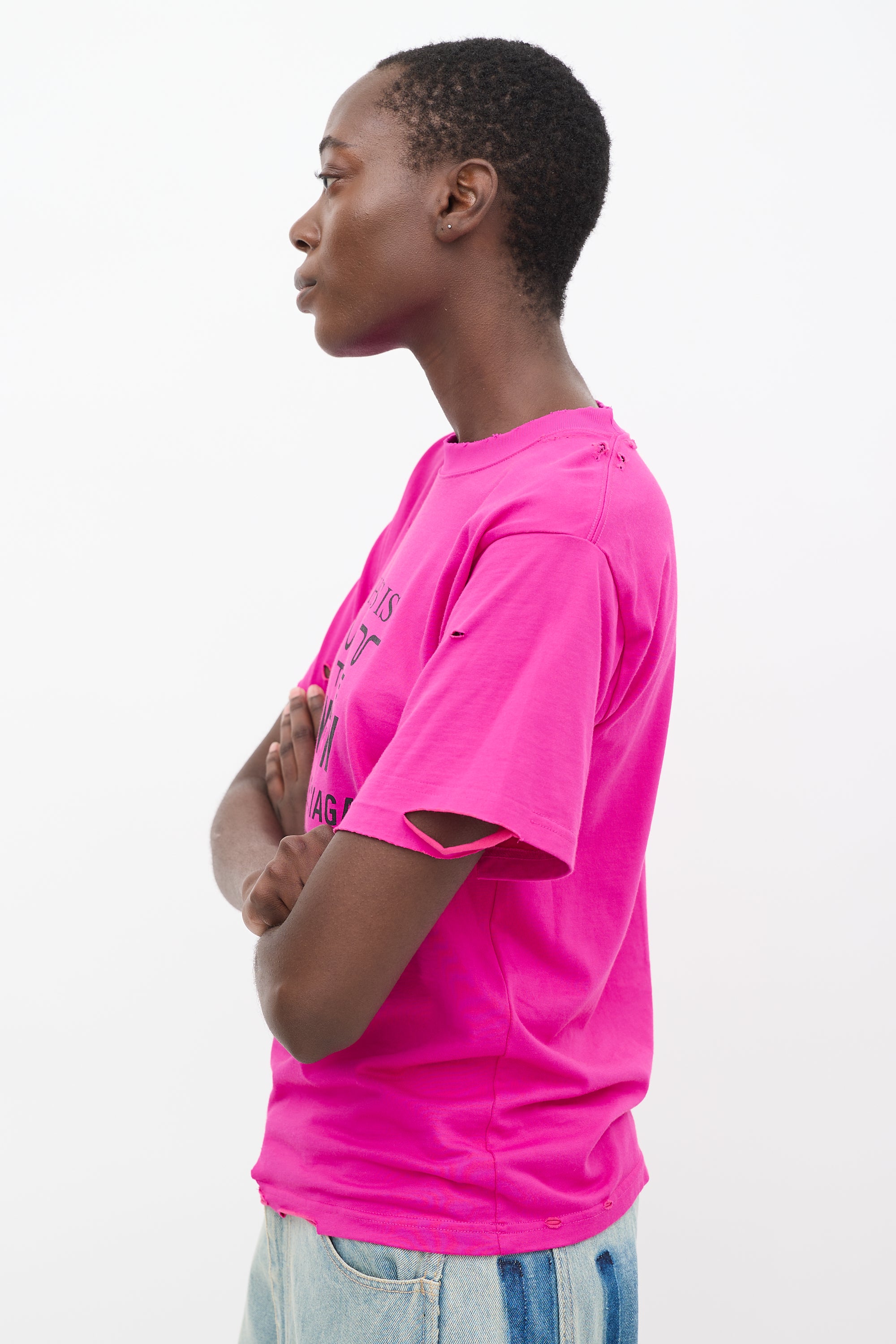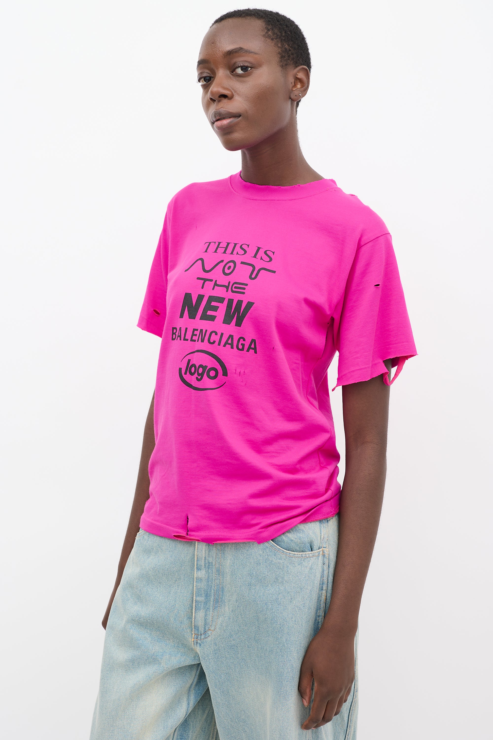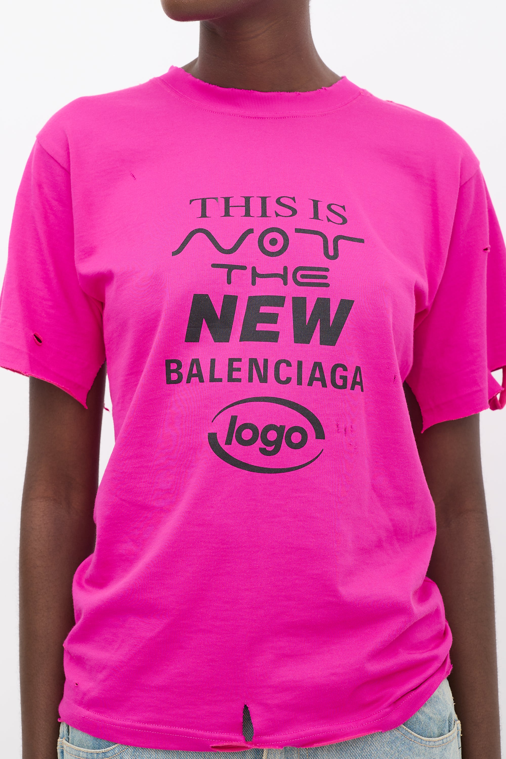 Pre-owned Balenciaga fuchsia T-shirt featuring a ribbed round neckline, "This Is Not The New Balenciaga Logo" stylized lettering at front, even hem, short sleeves, and intentional distressing throughout.