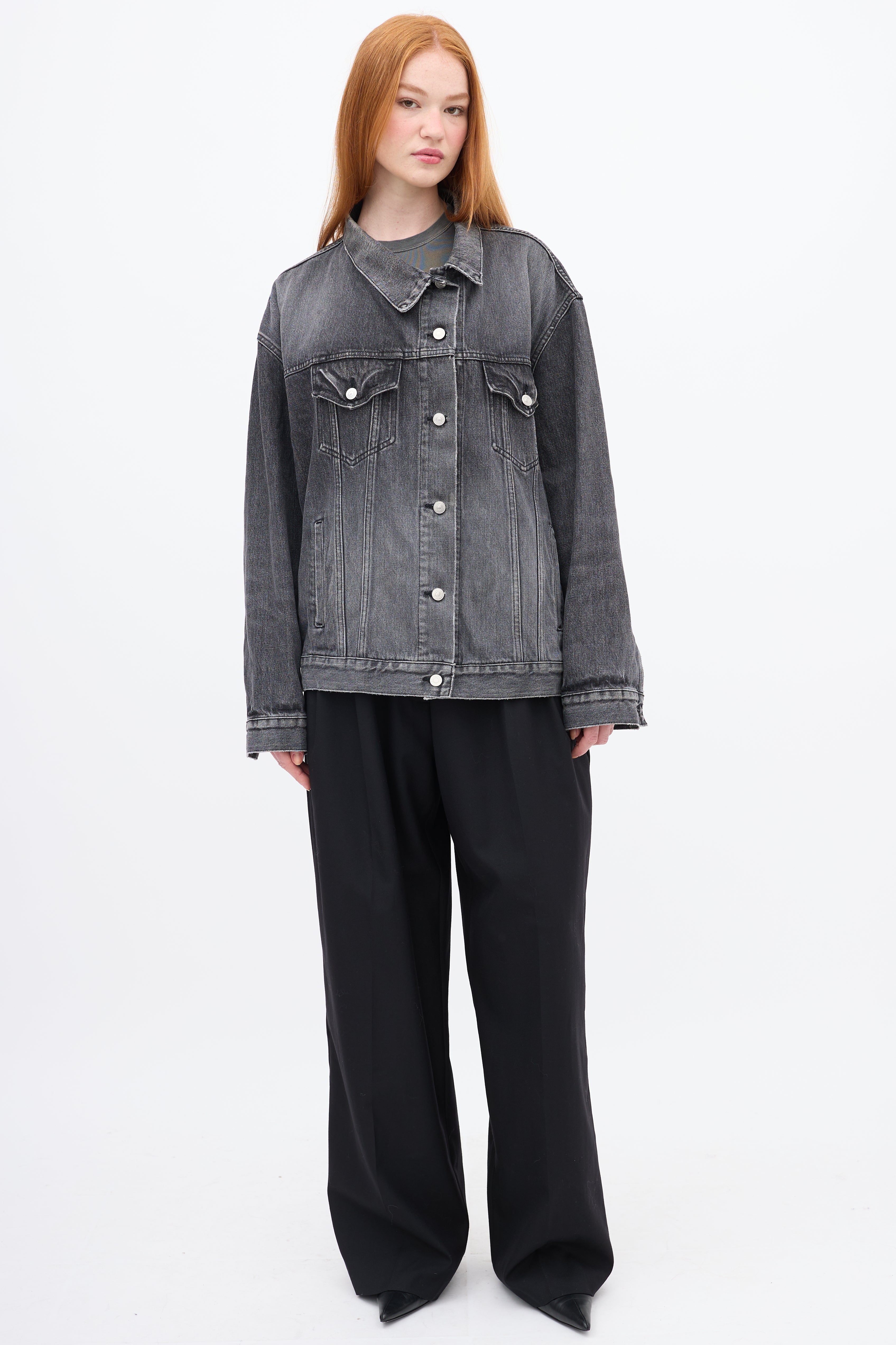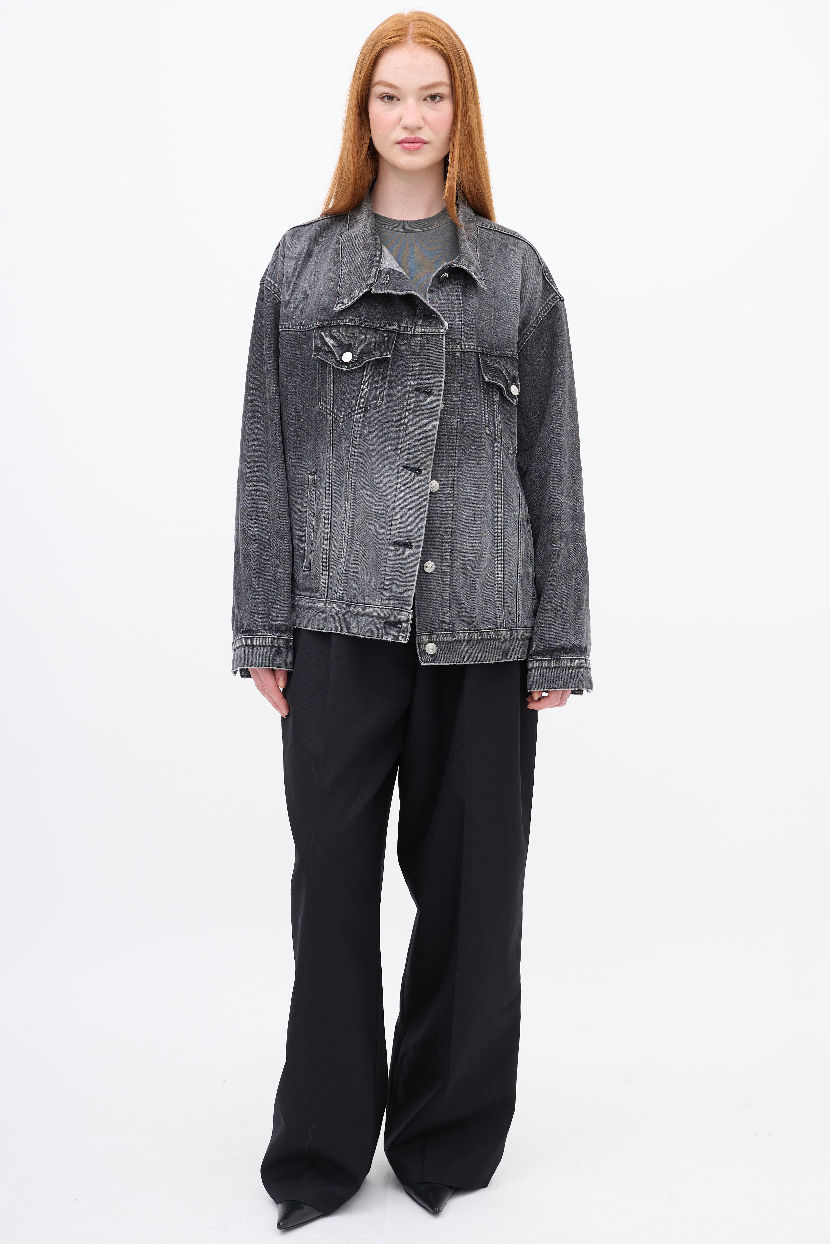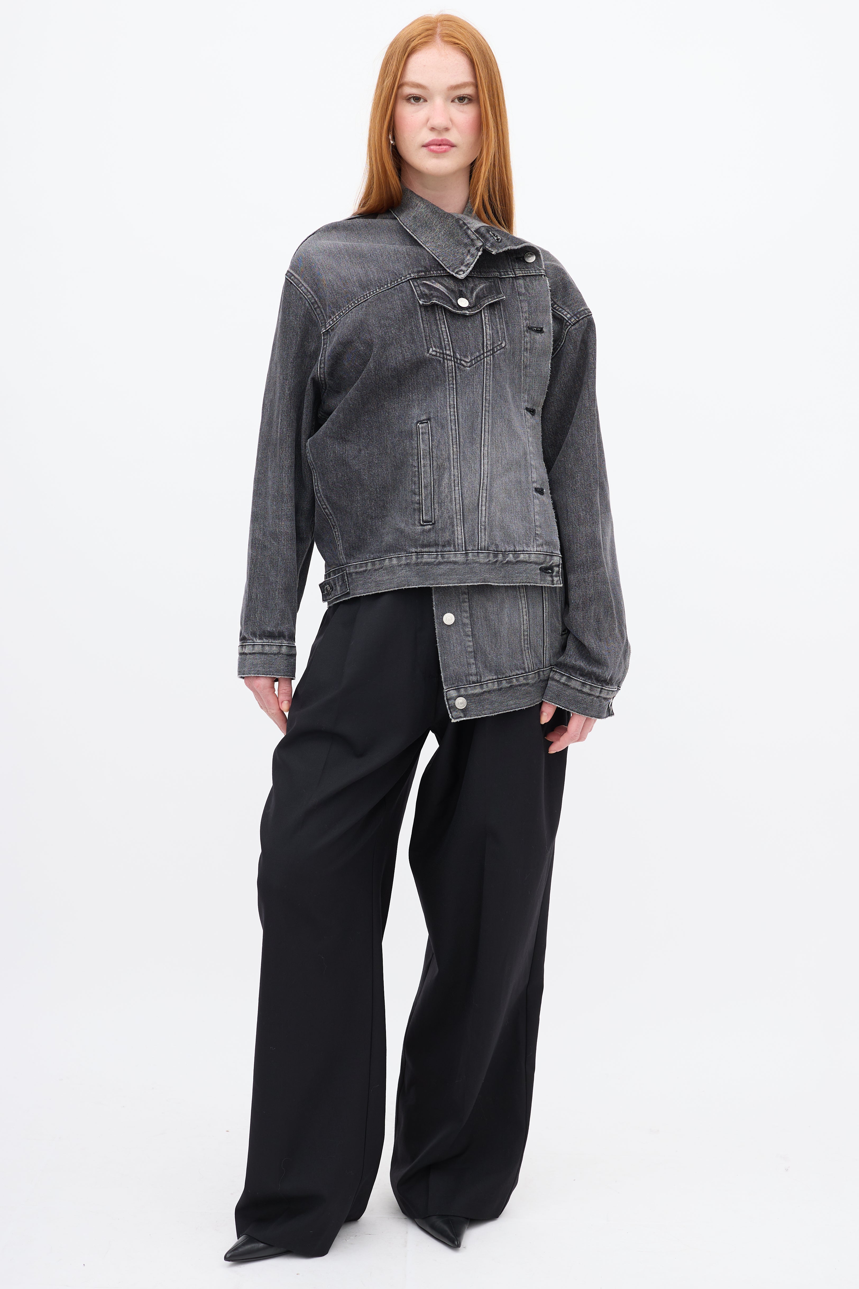 Pre-owned Balenciaga grey Pulled denim jacket featuring a collared neck, asymmetrical button up front, oversized fit, two buttoned flap pockets at chest, two welt pockets at front waist, adjusters at hem, one button at left shoulder for modular styling, long sleeves with buttoned cuffs, and light intentional distressing throughout.