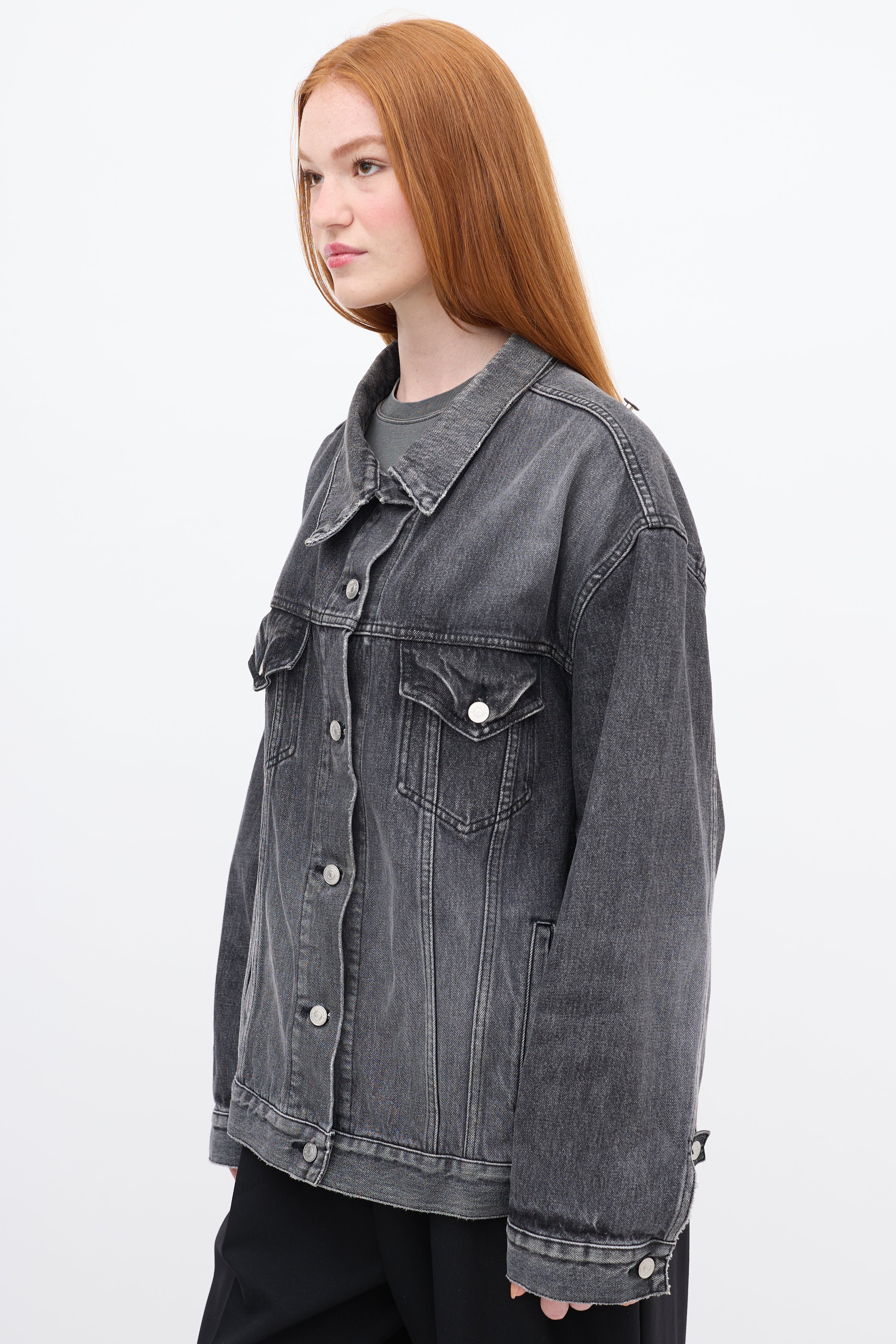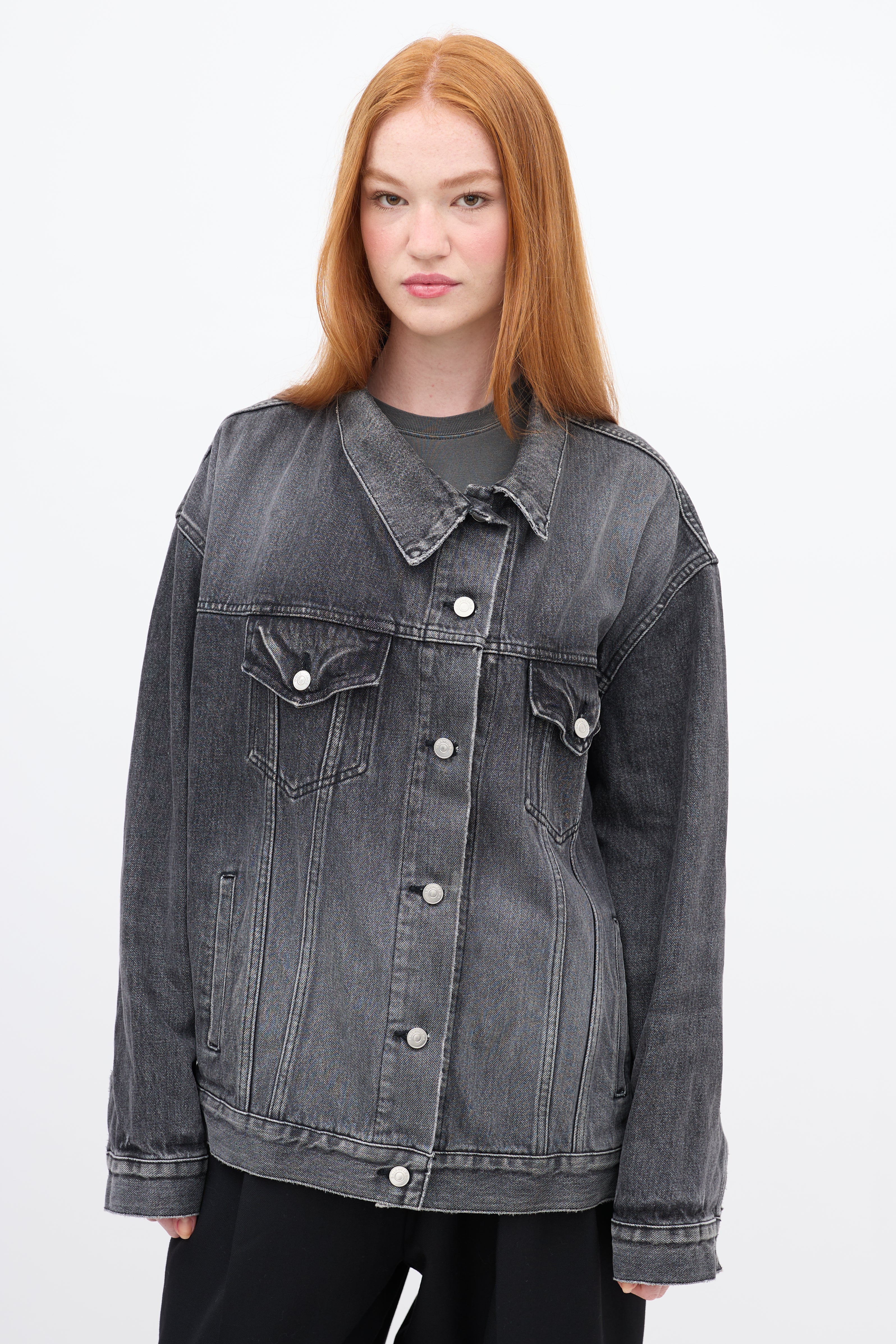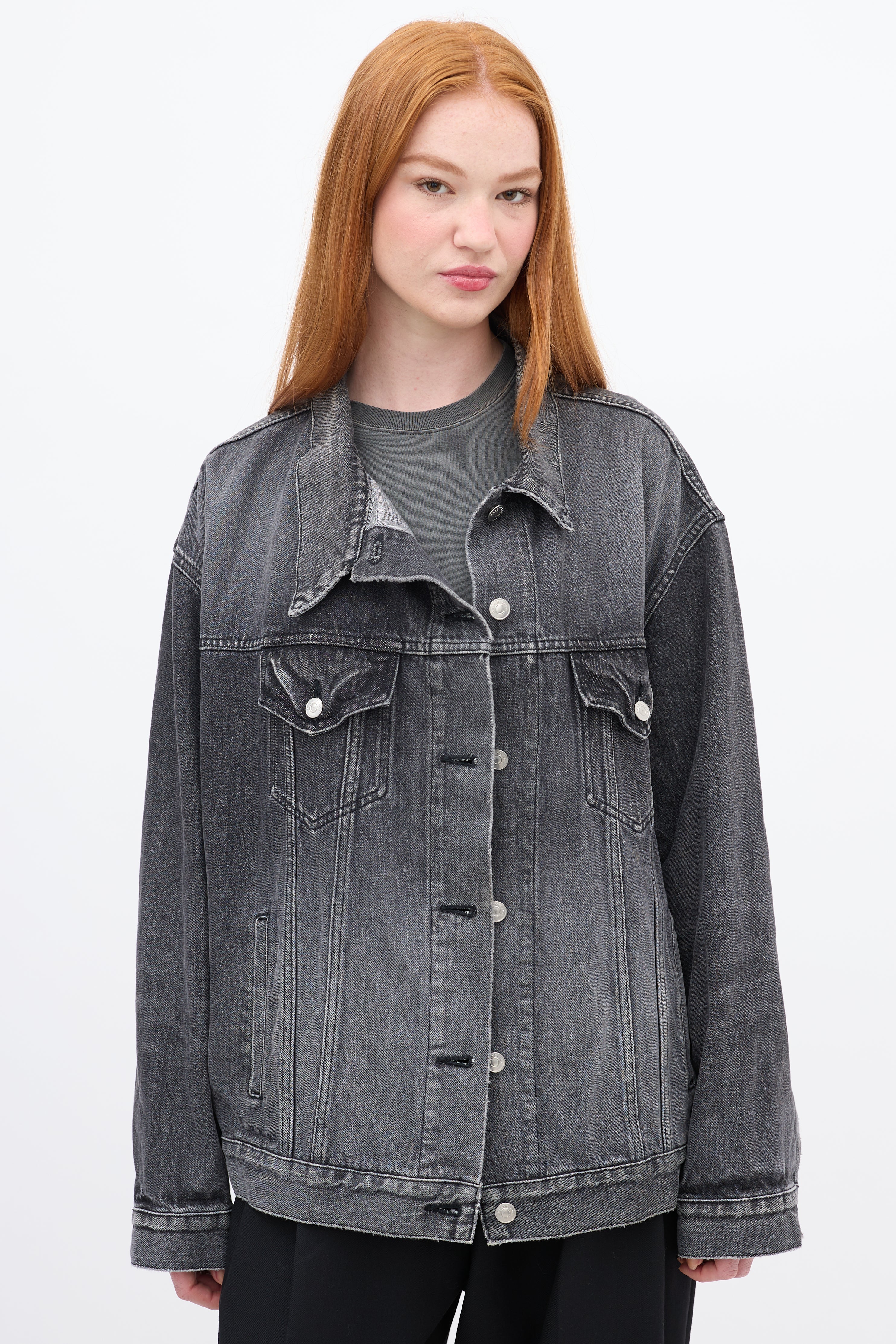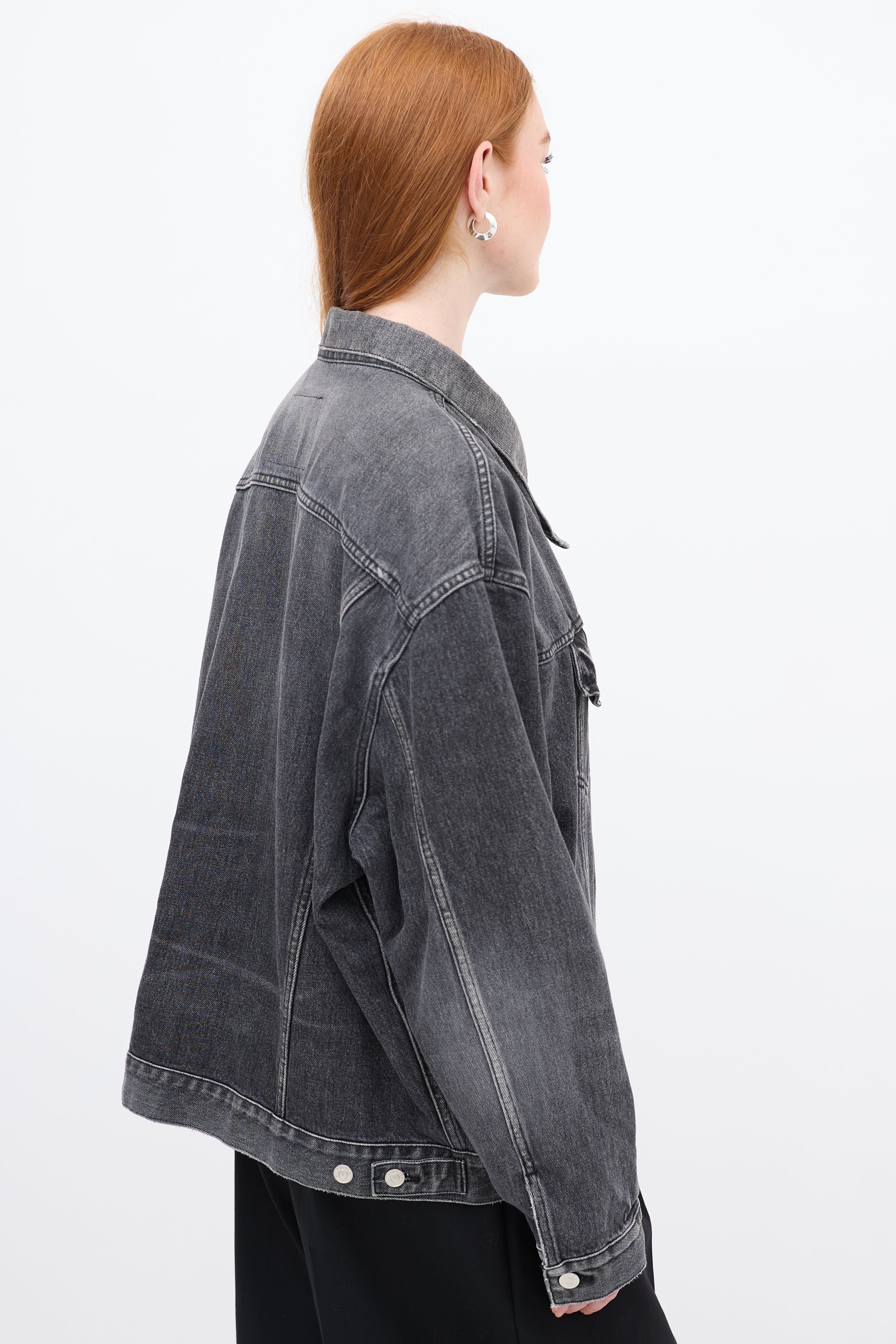 Pre-owned Balenciaga grey Pulled denim jacket featuring a collared neck, asymmetrical button up front, oversized fit, two buttoned flap pockets at chest, two welt pockets at front waist, adjusters at hem, one button at left shoulder for modular styling, long sleeves with buttoned cuffs, and light intentional distressing throughout.