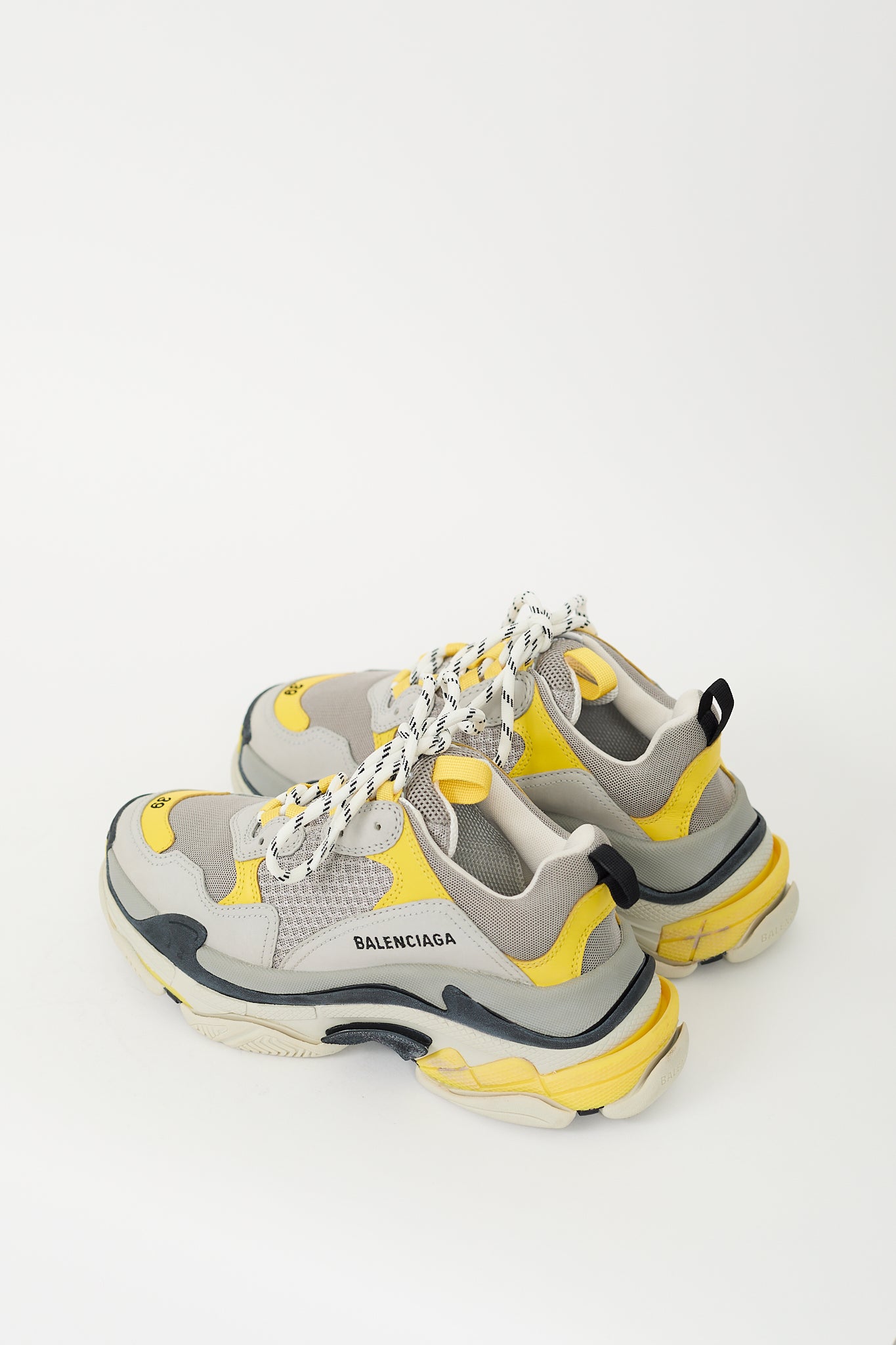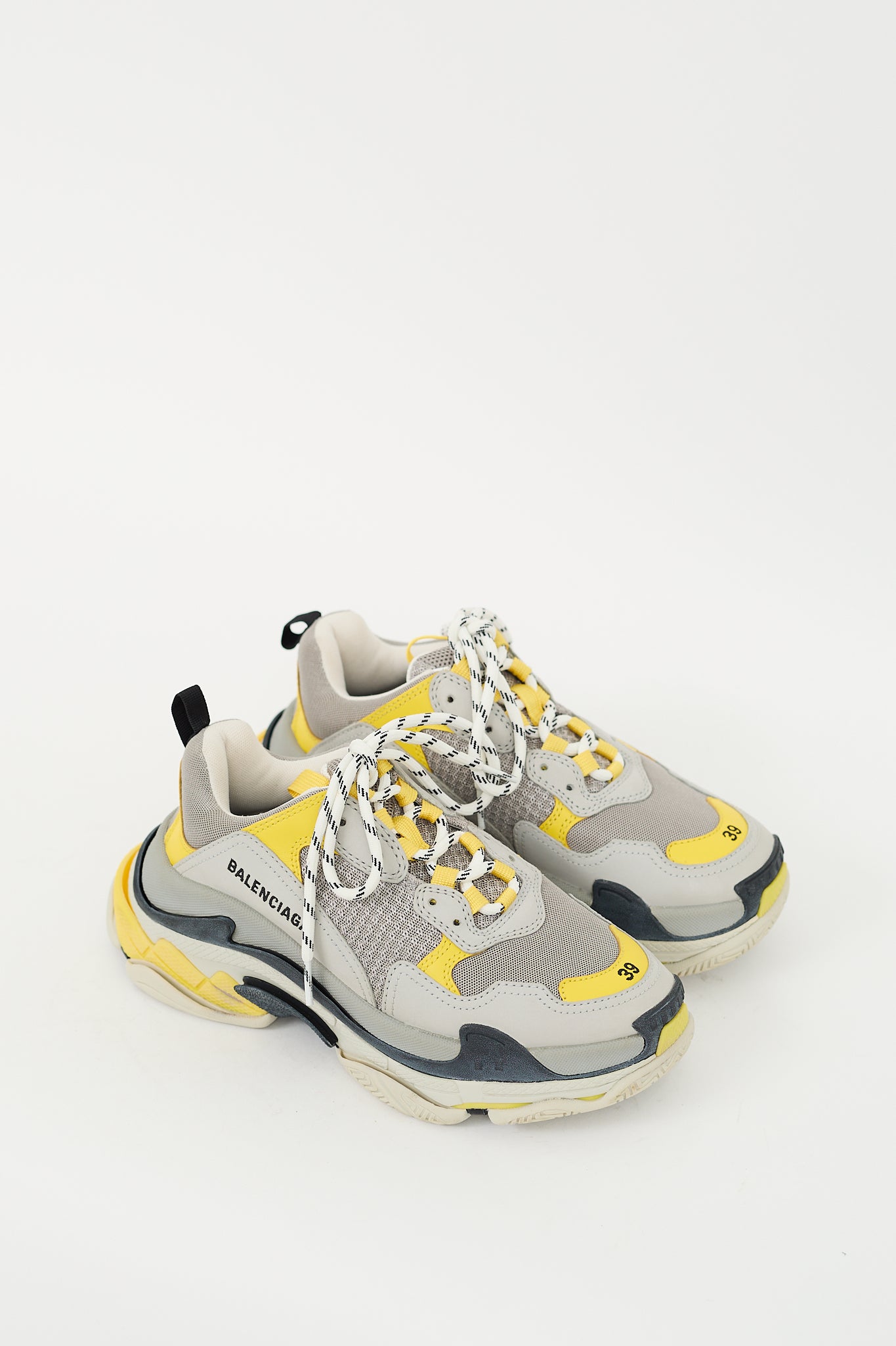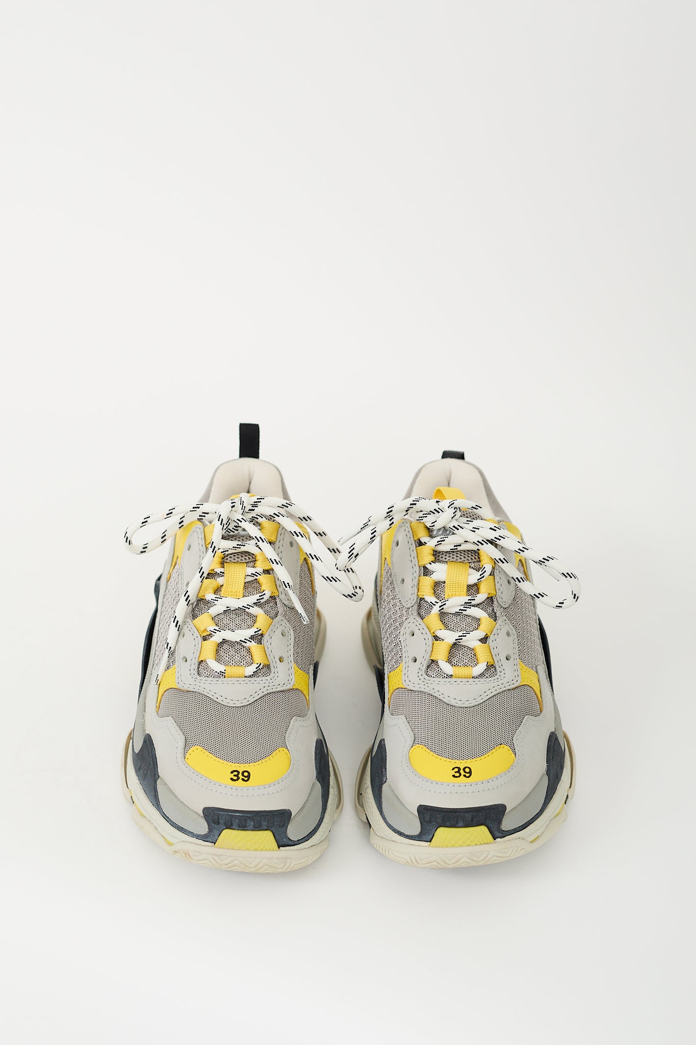 Pre-owned Balenciaga grey and yellow Triple S sneakers featuring rounded toe, mesh upper, leather panelling throughout, lace up vamp, rubberized logo at tongue, pull tab at tongue and counter, embroidered logo at outer side, embroidered "39" at toe, and chunky rubber sole with debossed logo at heel.