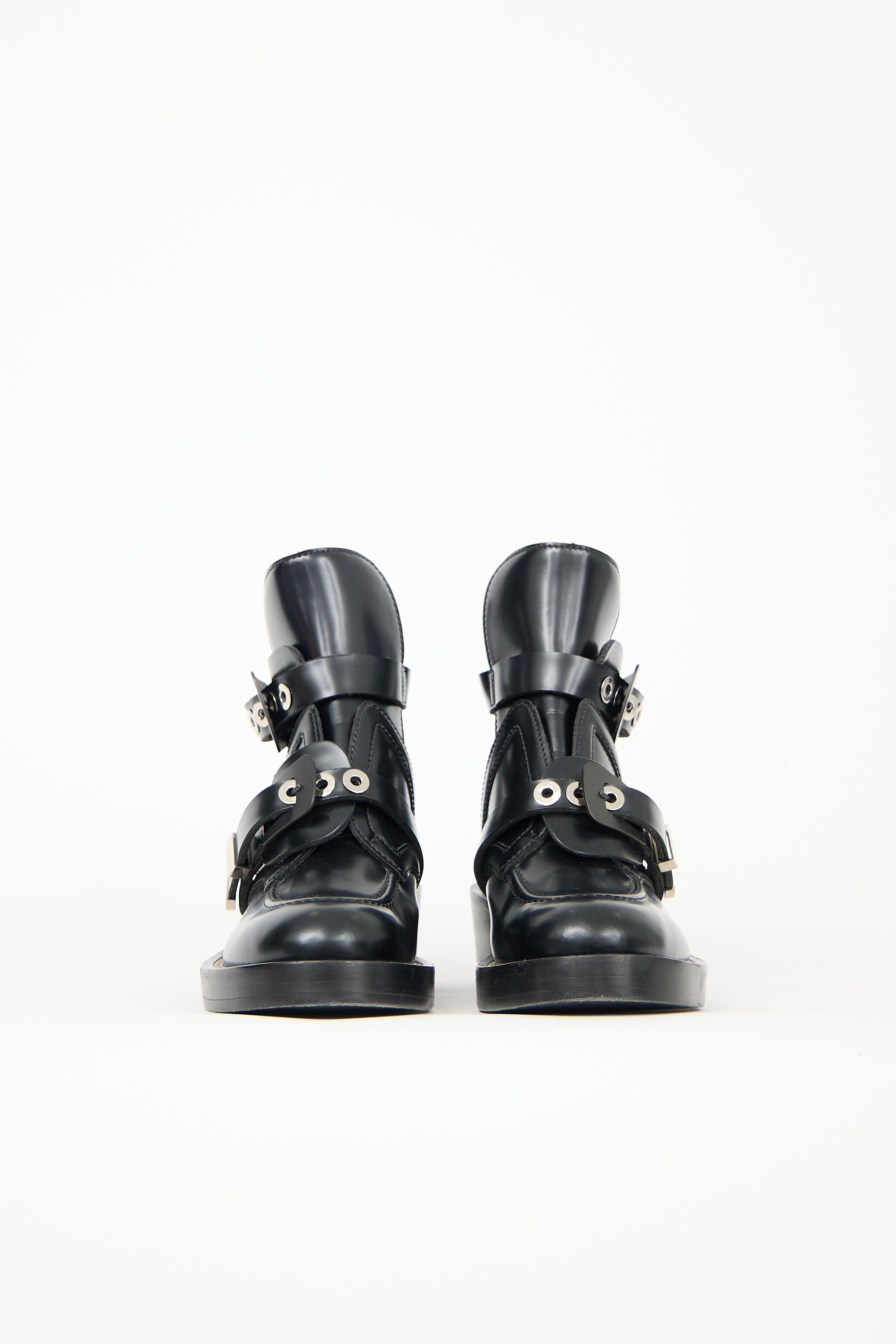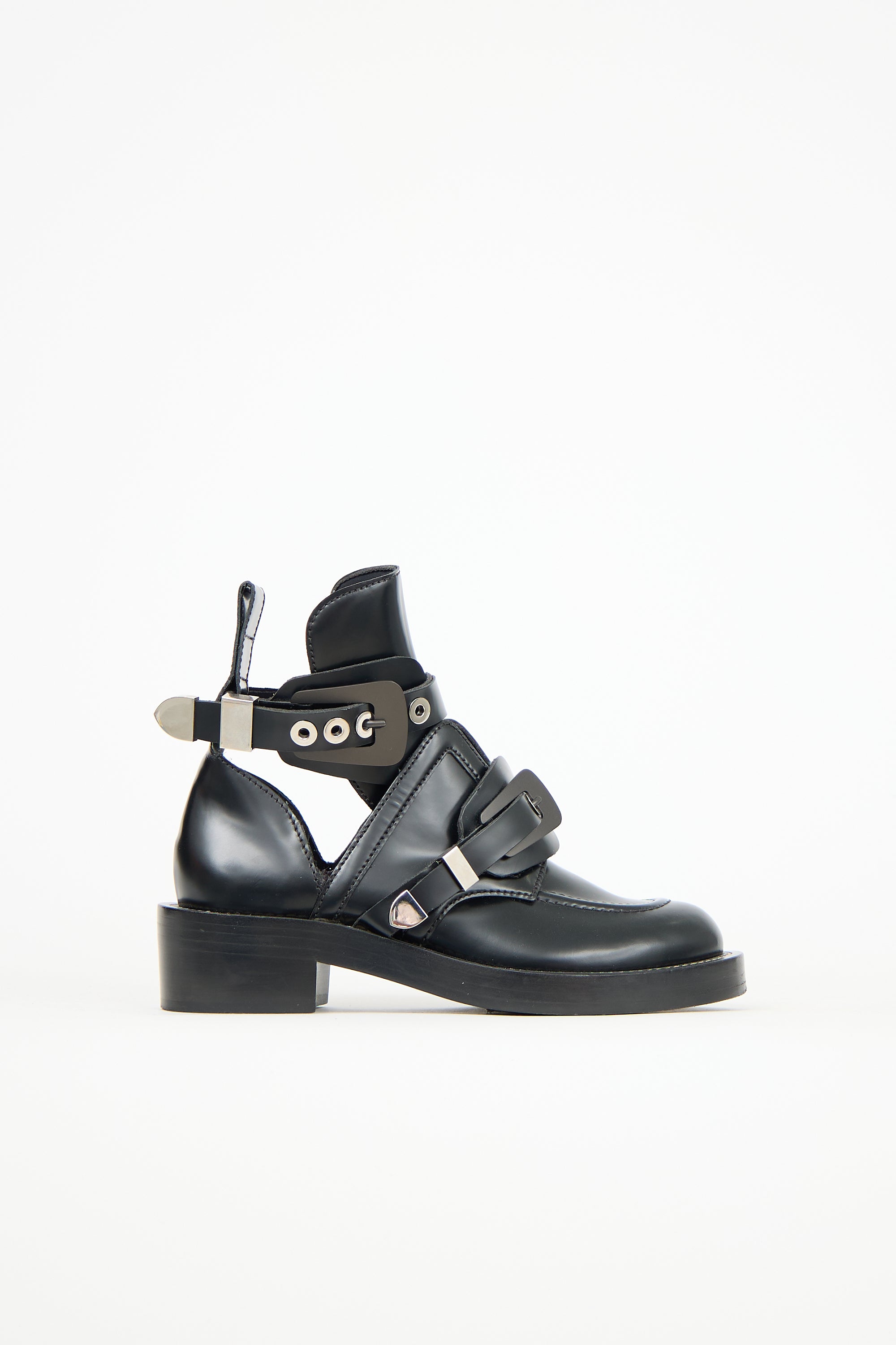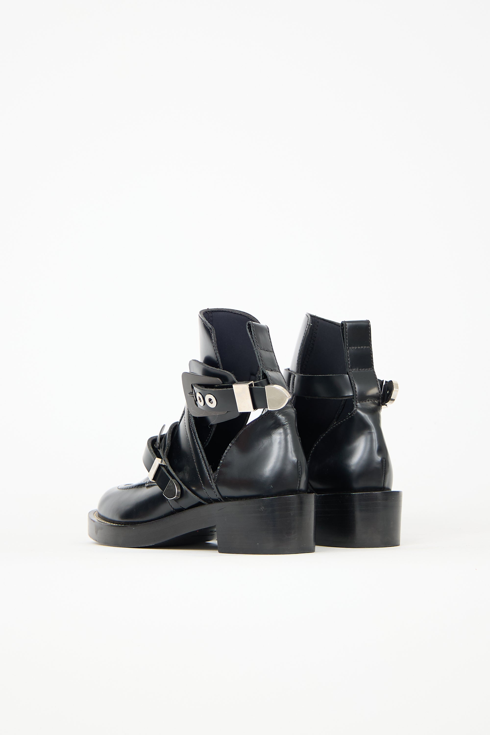 Pre-owned Balenciaga black leather Ceinture boots featuring rounded toe, cutout shaft, adjustable buckles at vamp and ankle, pull tab at back, and stacked block heel.