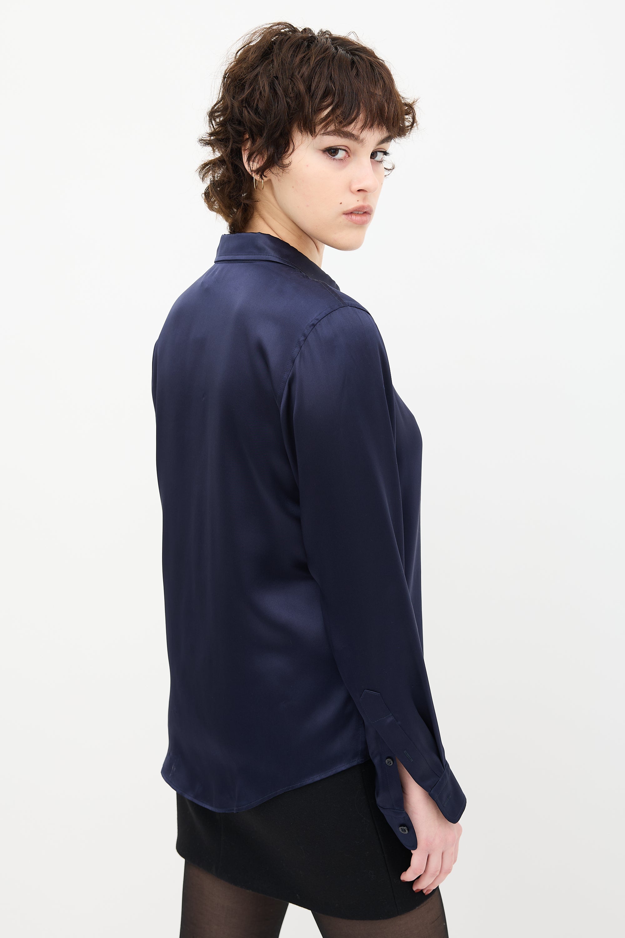 Pre-owned Balenciaga 2019 navy silk blouse featuring a straight collar, concealed button up front, and buttoned cuffs.