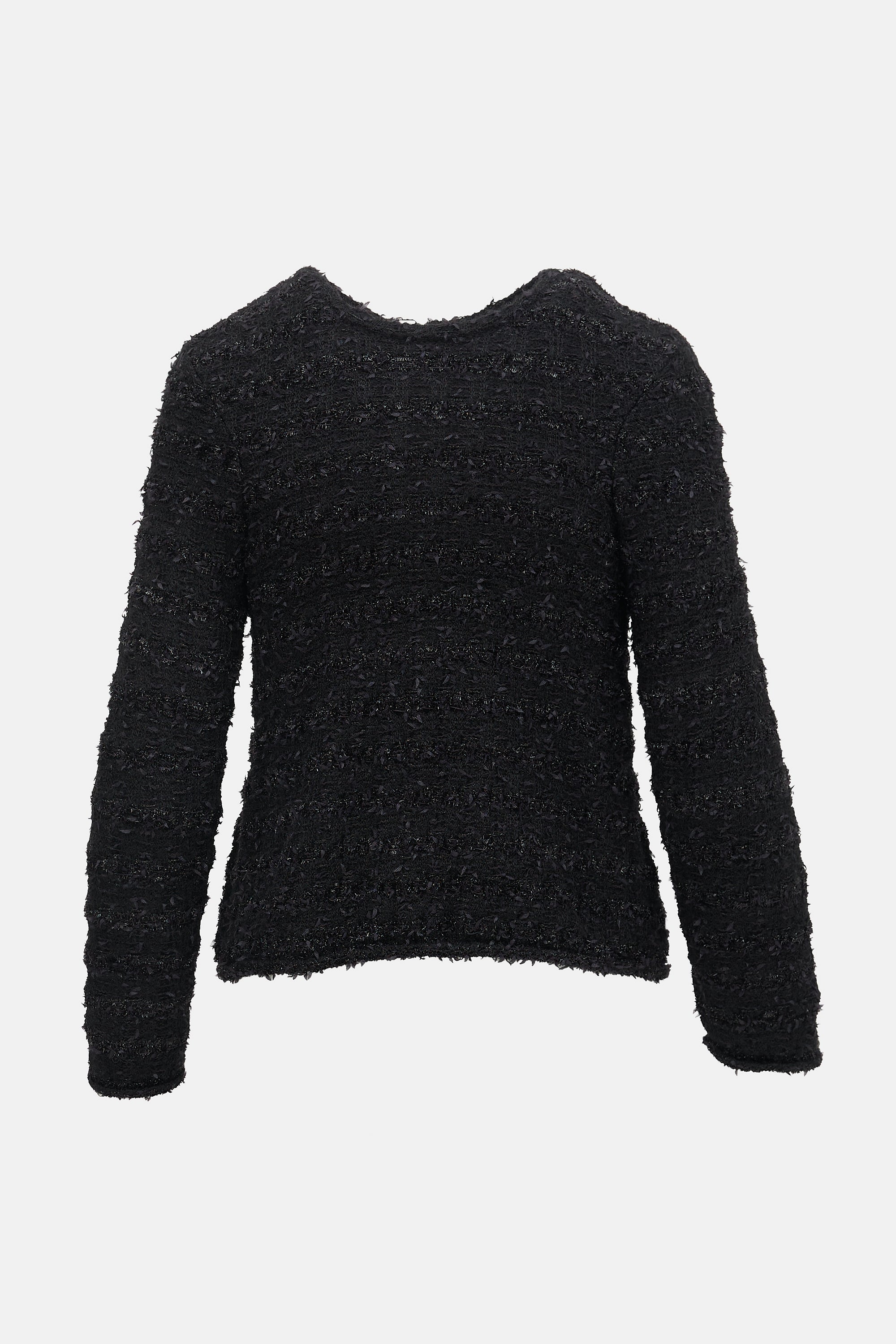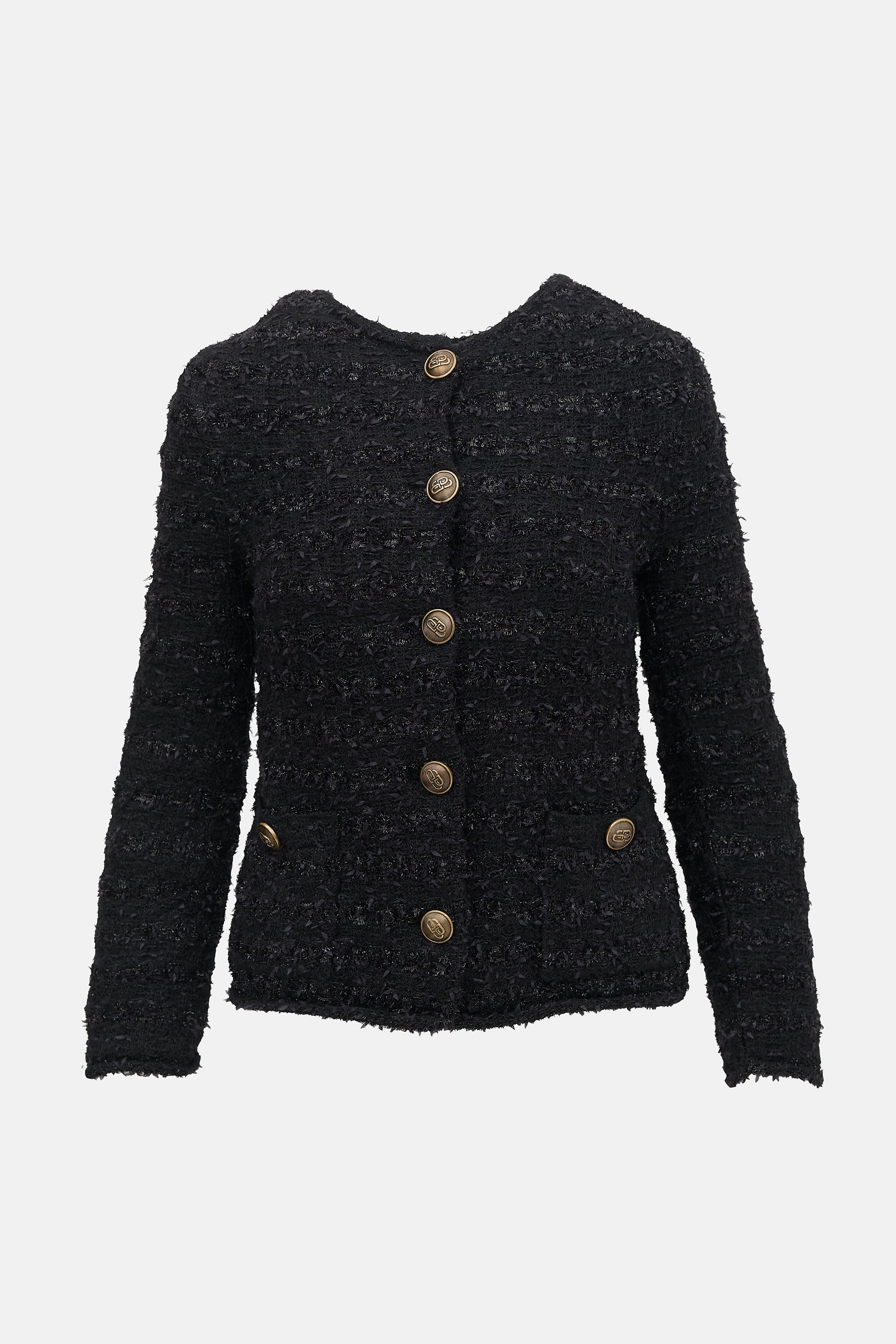 Pre-owned Balenciaga black sparkly tweed jacket featuring round neckline, gold tone buttons with BB motif, button up front, and two front patch pockets with button embellishment. Partially lined.
