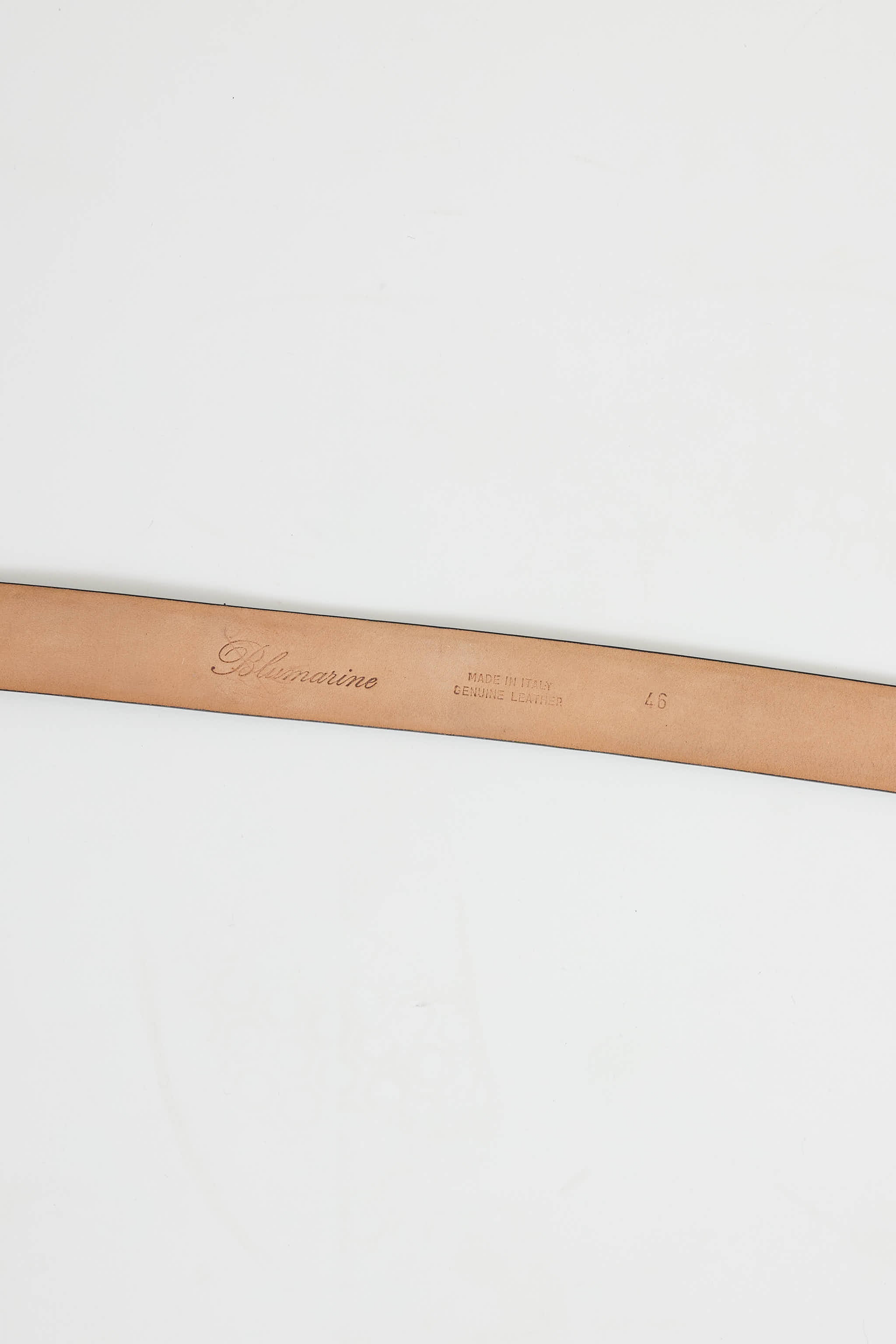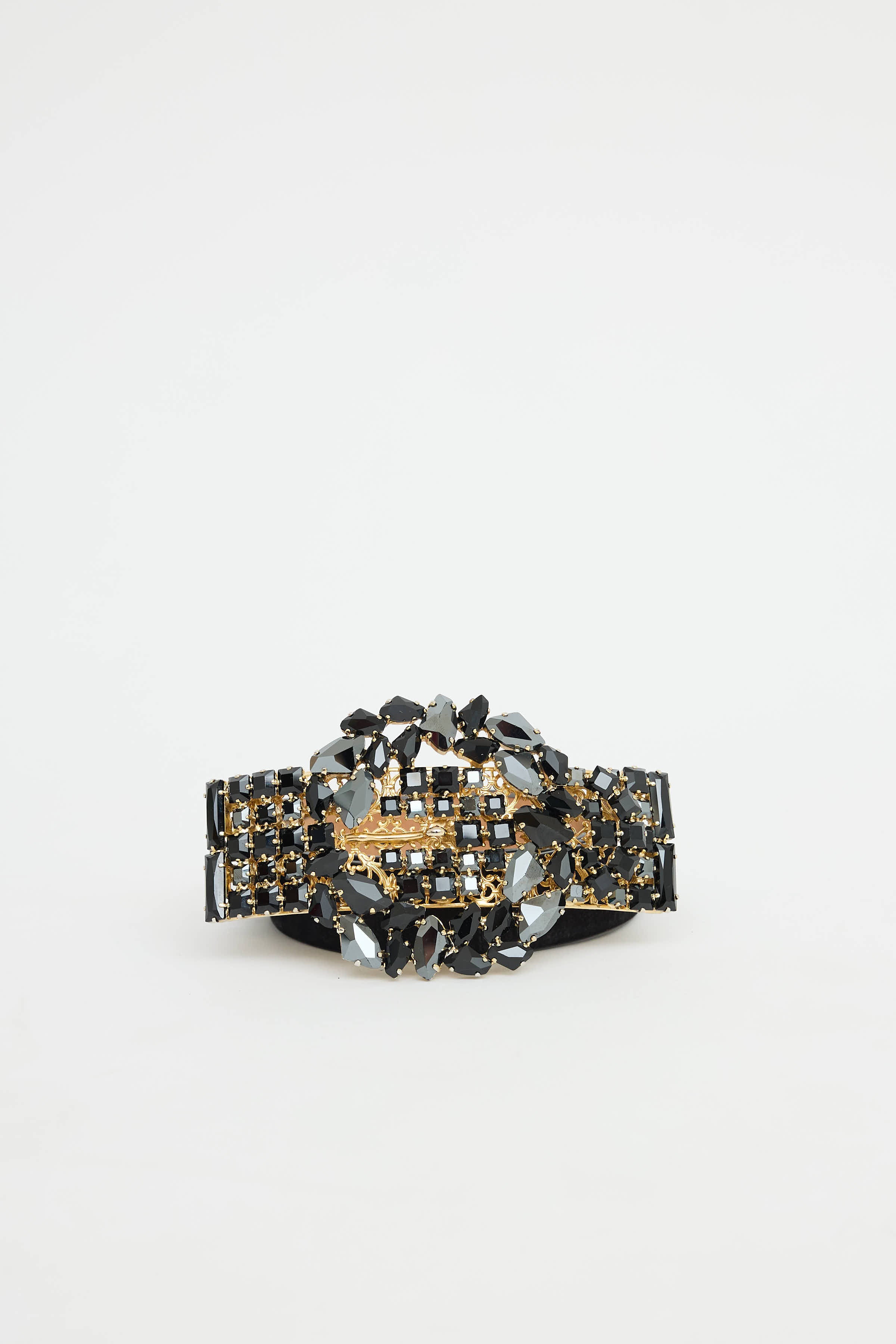 Pre-owned Blumarine black Crystal belt featuring suede strap, oversized gold tone buckle with black crystals, pin buckle closure and multiple sizing holes.