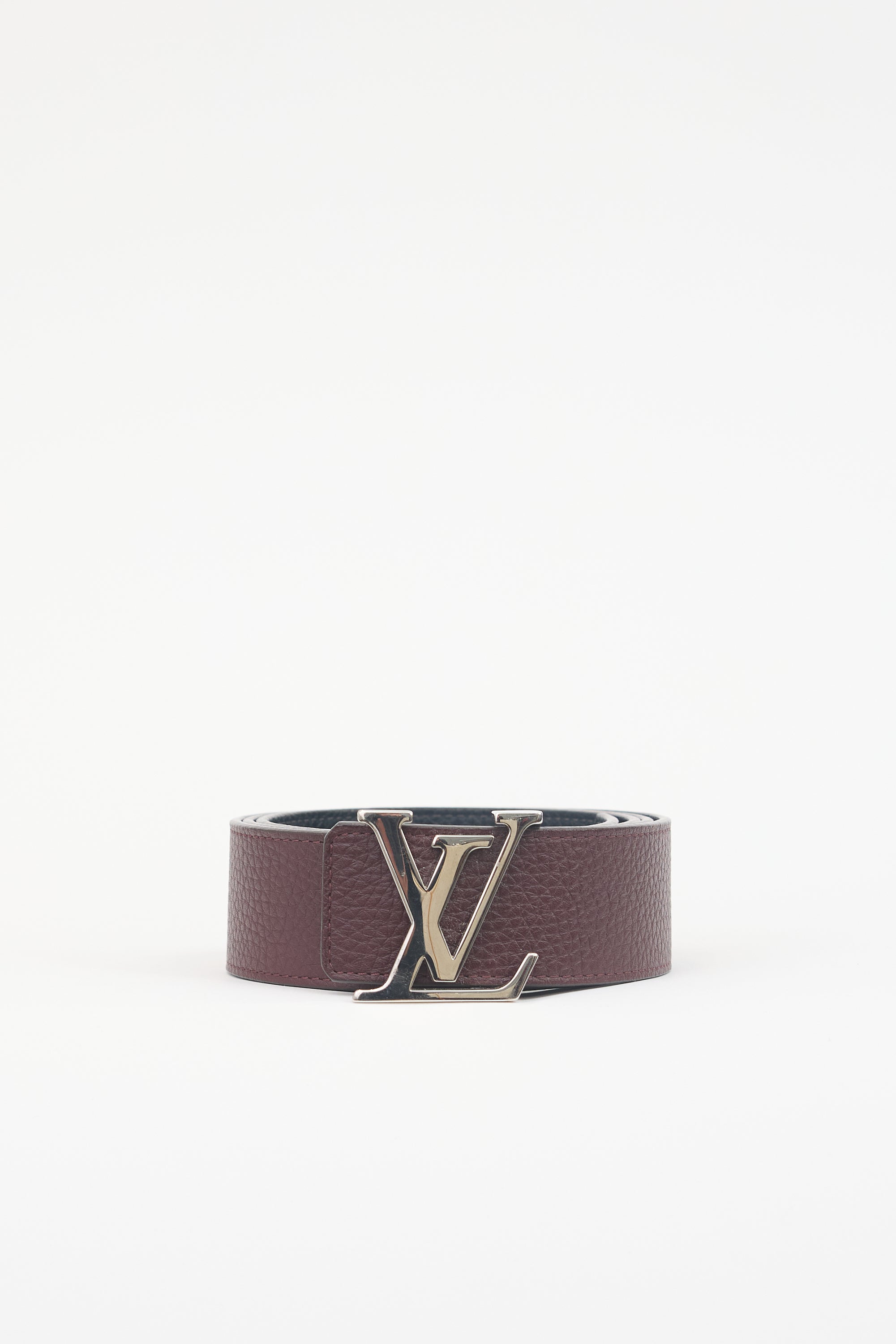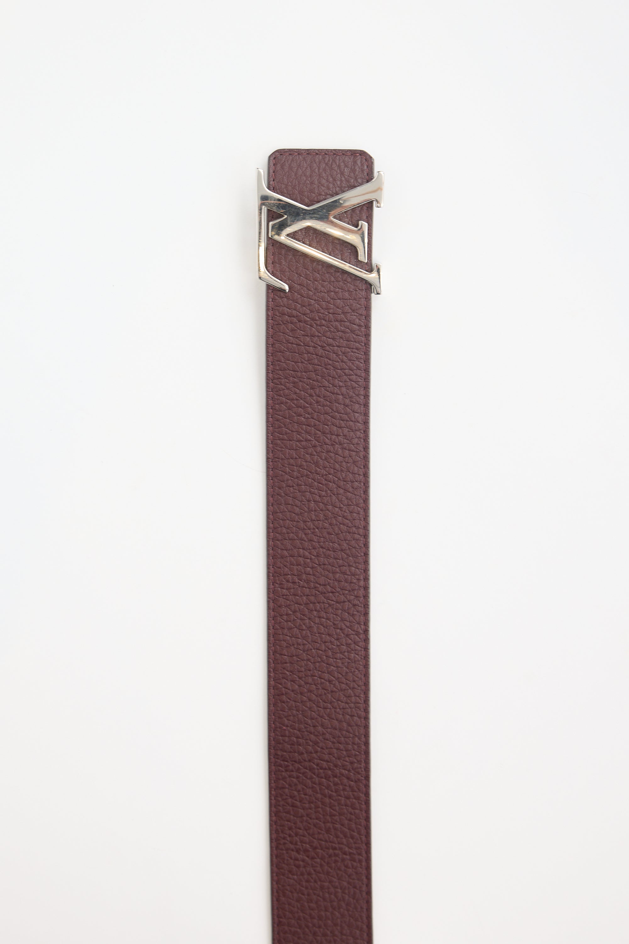 Pre-owned Louis Vuitton burgundy grained leather Initiales belt featuring silver tone LV buckle, push pin fastening, and black reverse.