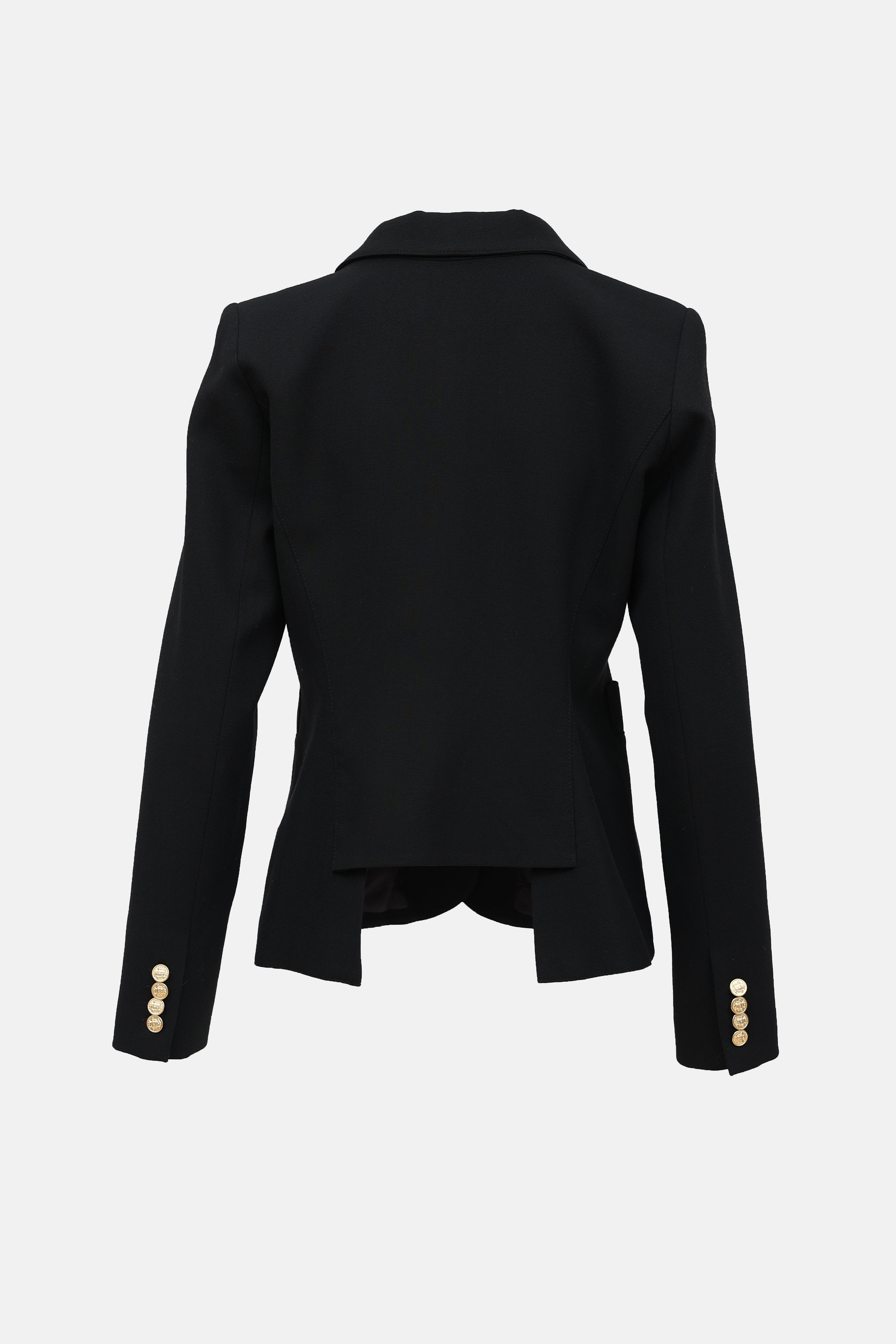 Pre-owned Smythe black Duchess blazer featuring a peak lapel, long sleeves with buttoned cuffs, one welt pocket at chest, three slip pockets at hip, and gold tone button closure. Lined.