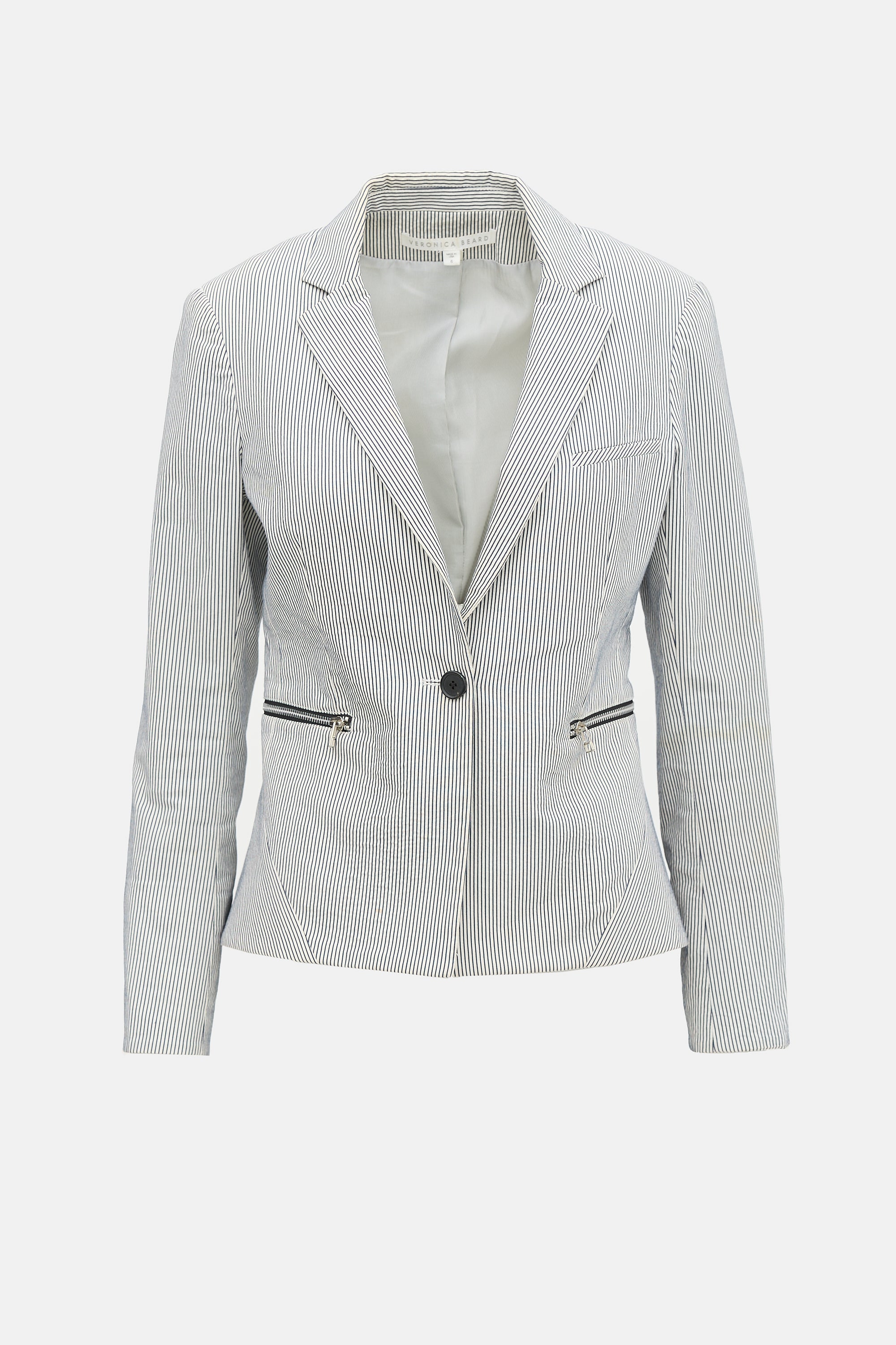 Pre-owned Veronica Beard white and navy Dickey blazer featuring a pinstripe pattern, notched collar, single button front, and zip pockets. Lined.