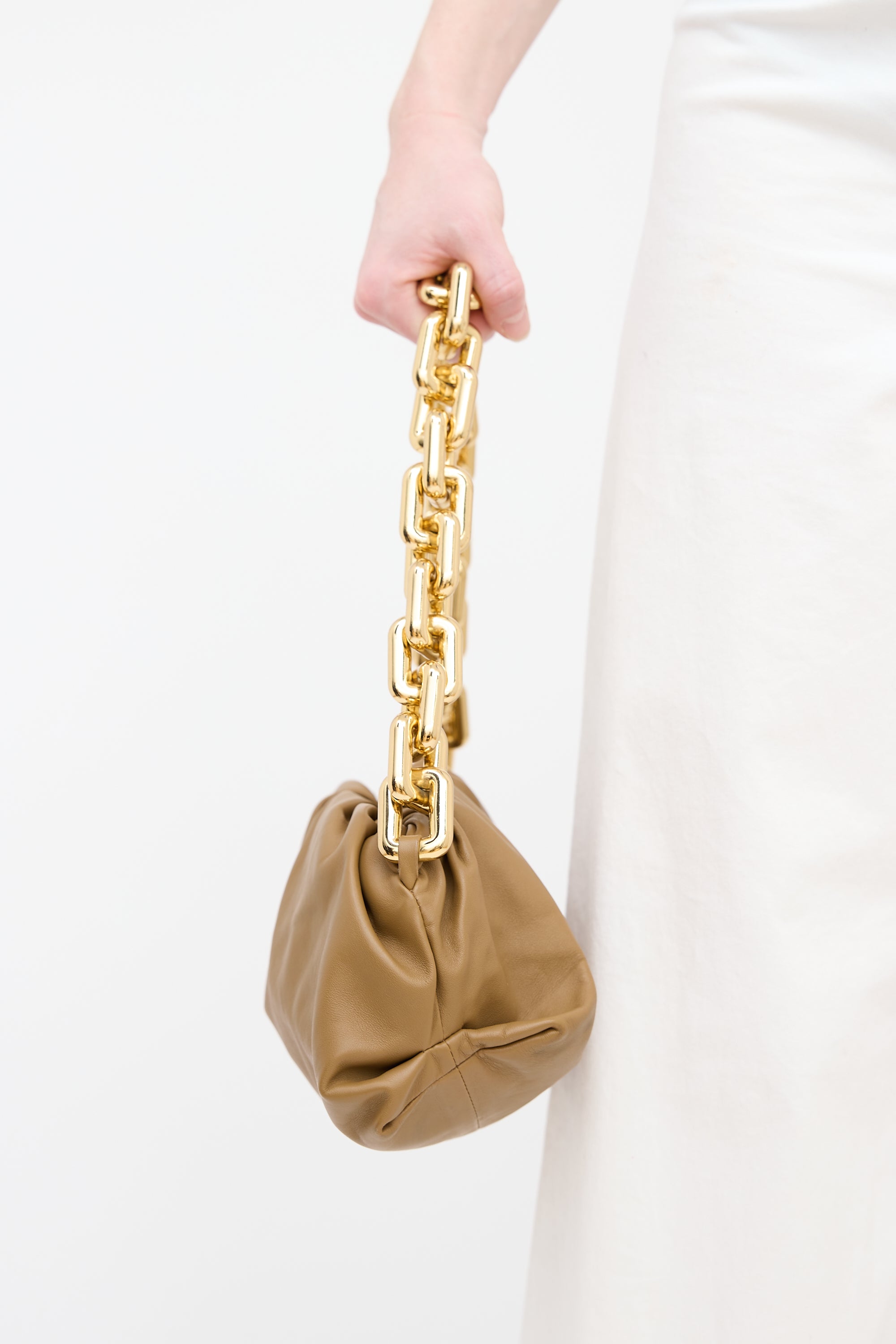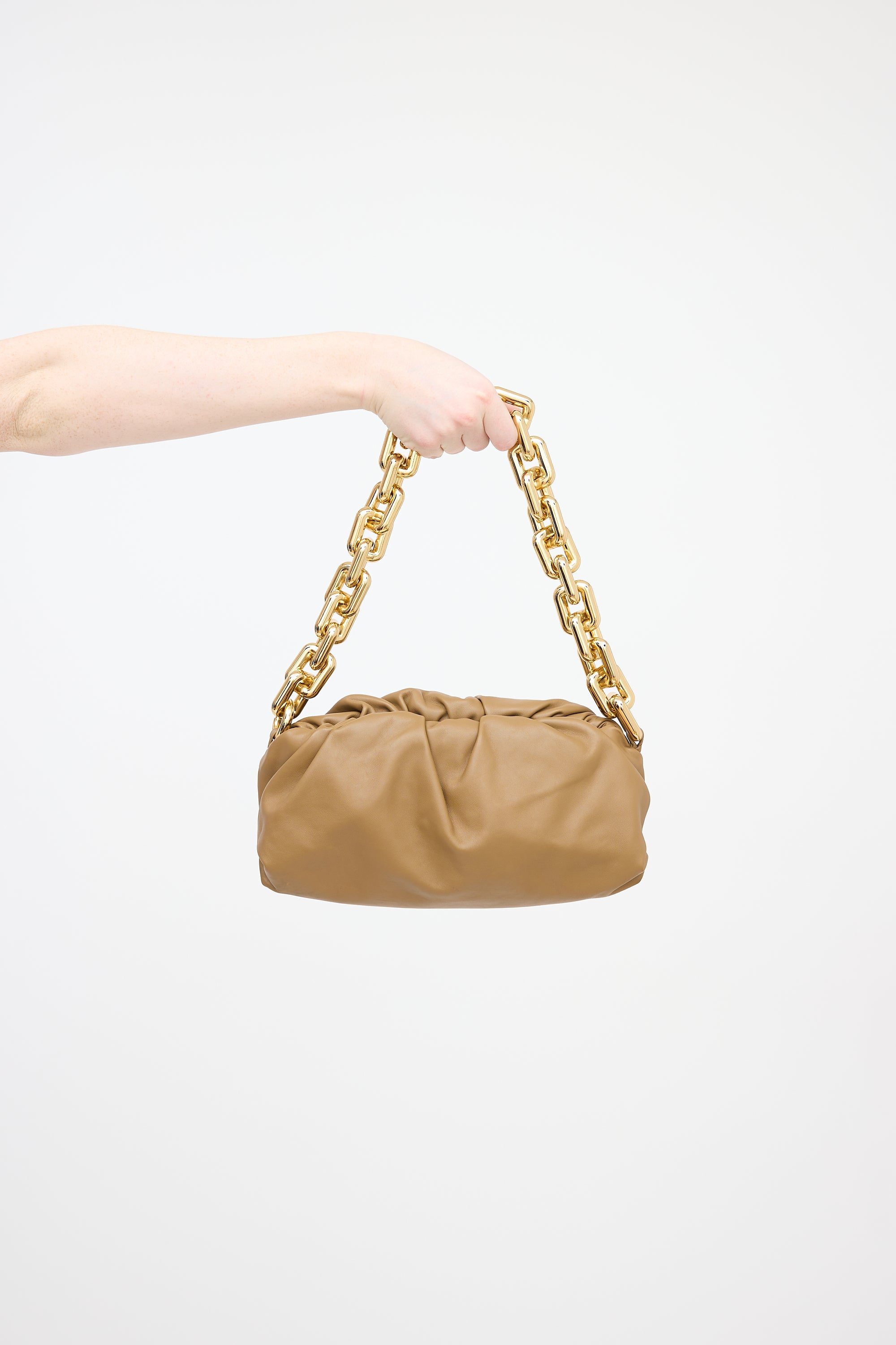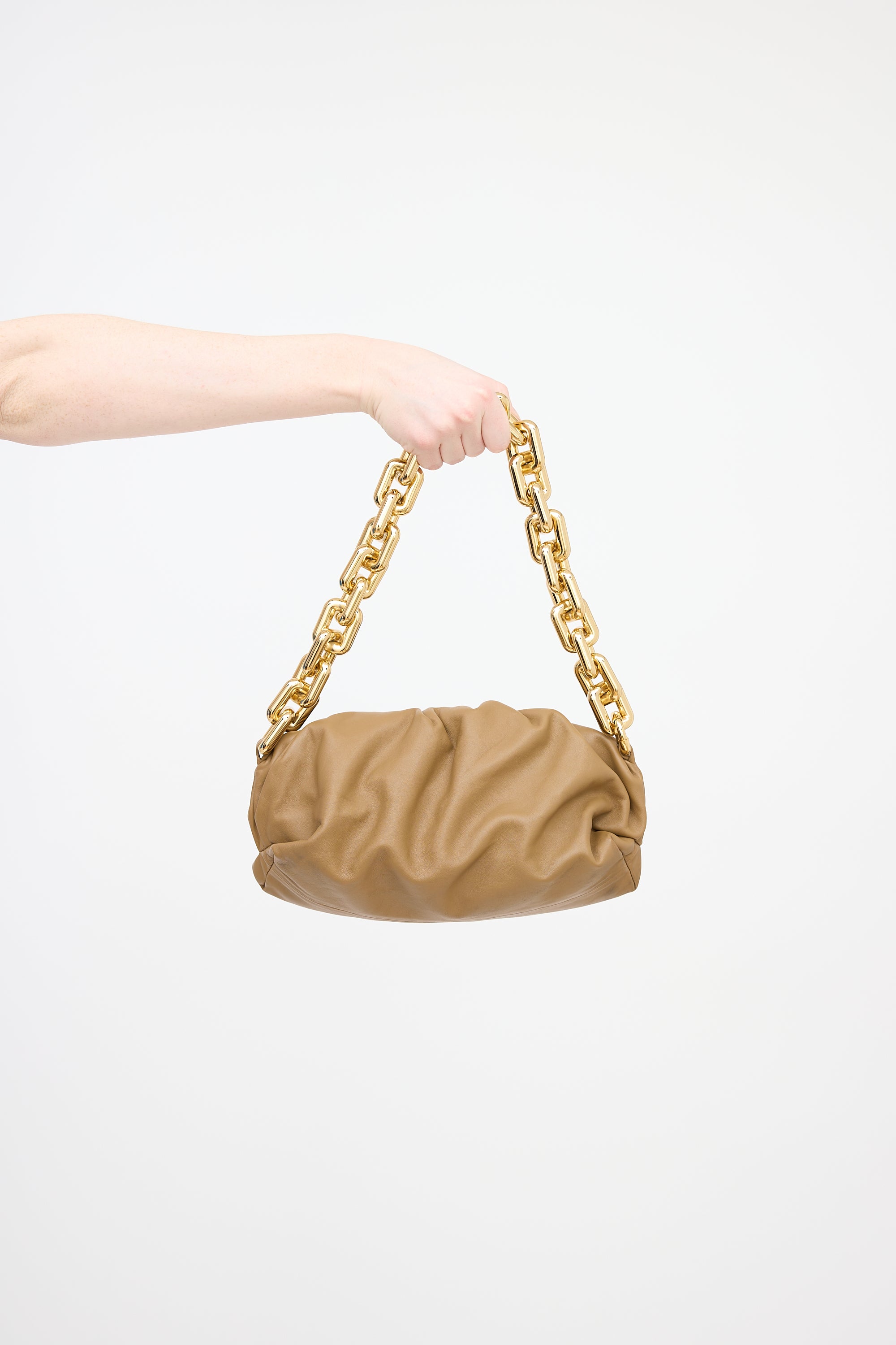 Pre-owned Bottega Veneta brown leather Chain Pouch featuring gold tone exaggerated chain strap with clasp closure, magnetic hinge closure, and one main compartment.
