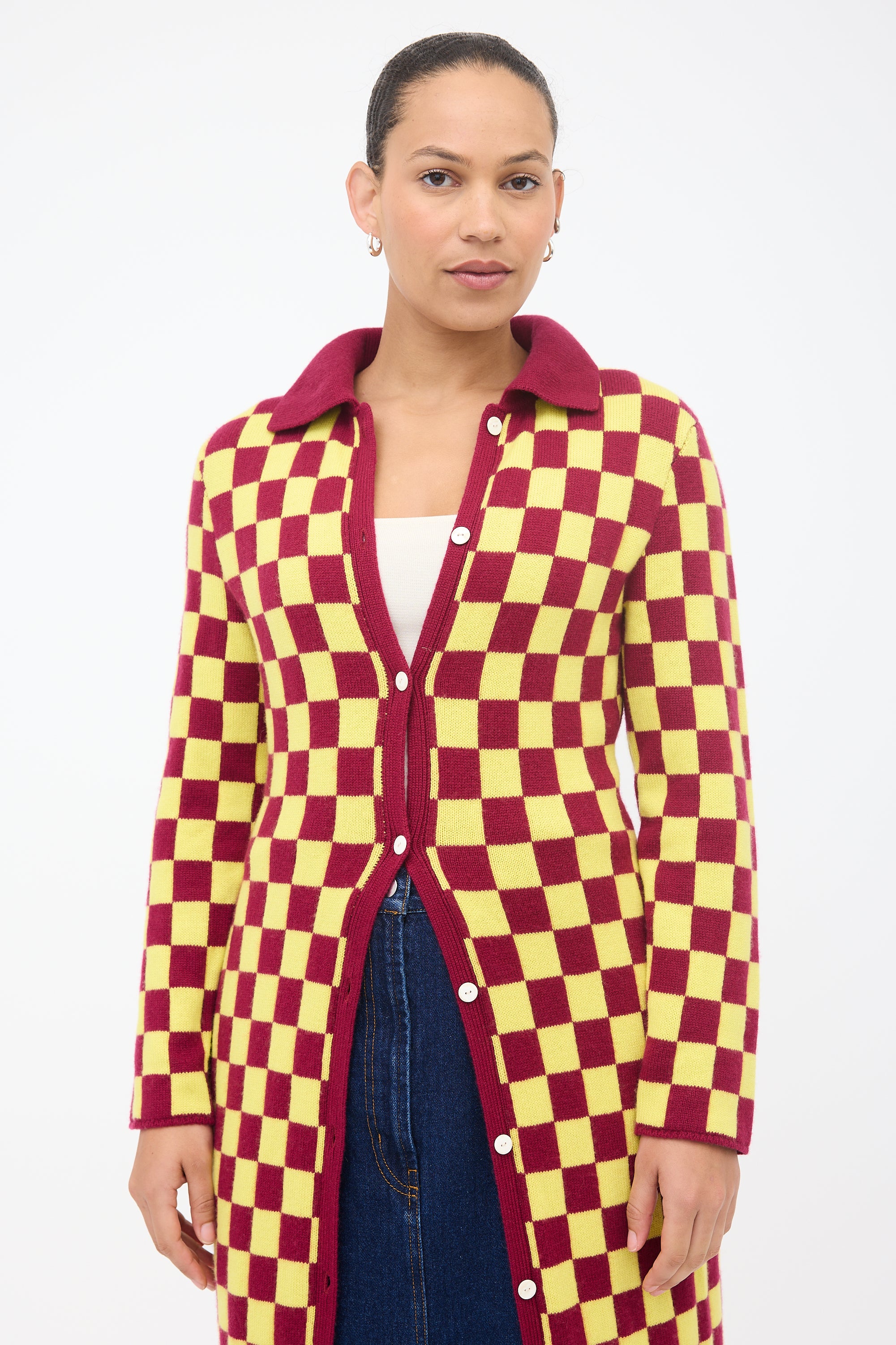 The Elder Statesman burgundy and yellow checkered wool sweater dress featuring a point collar, full button front, and fitted design.