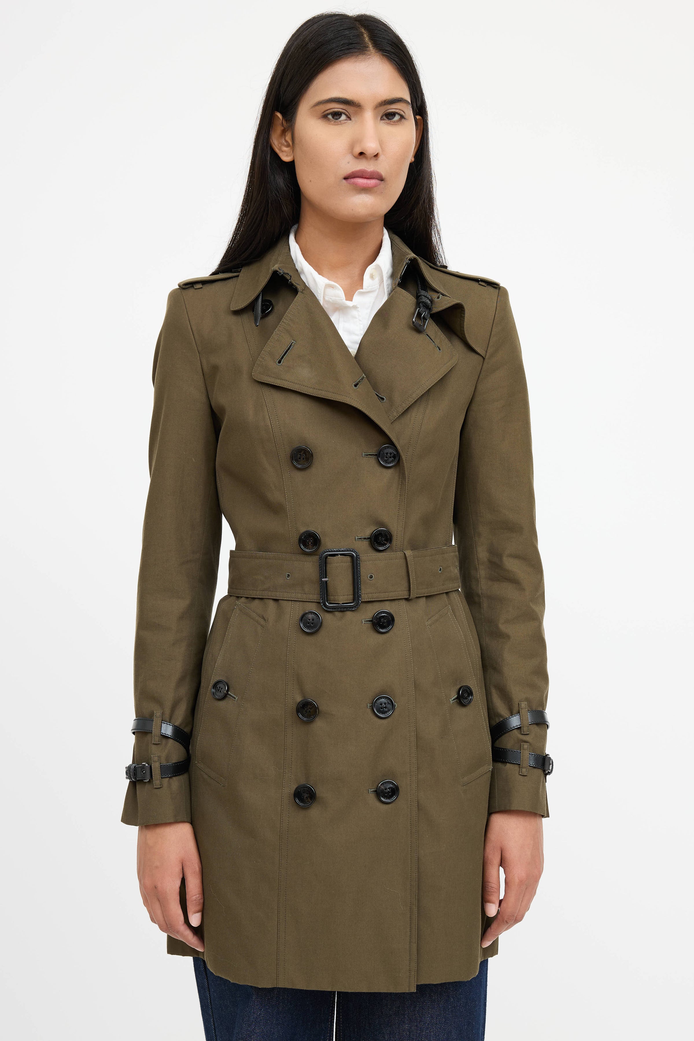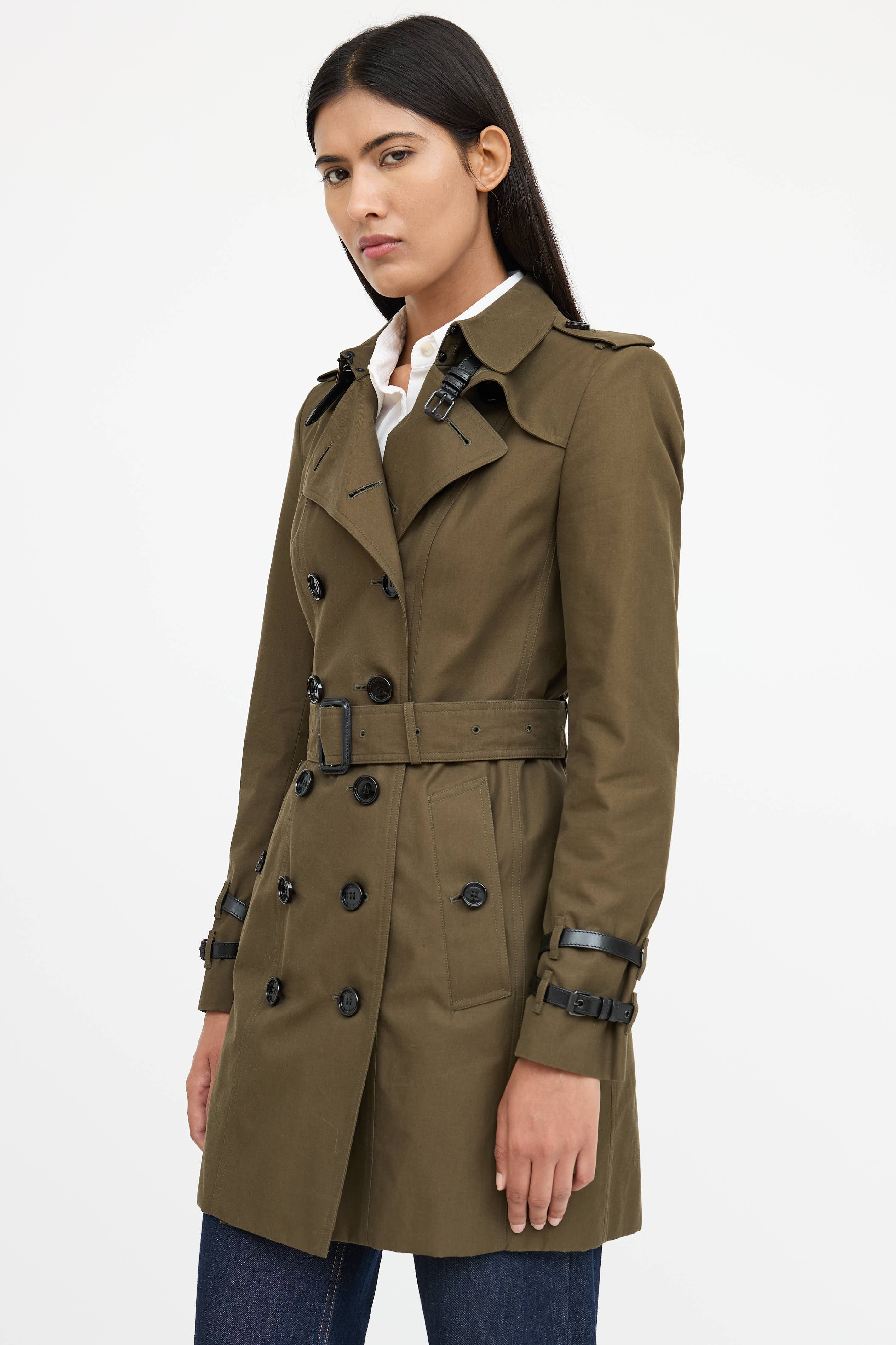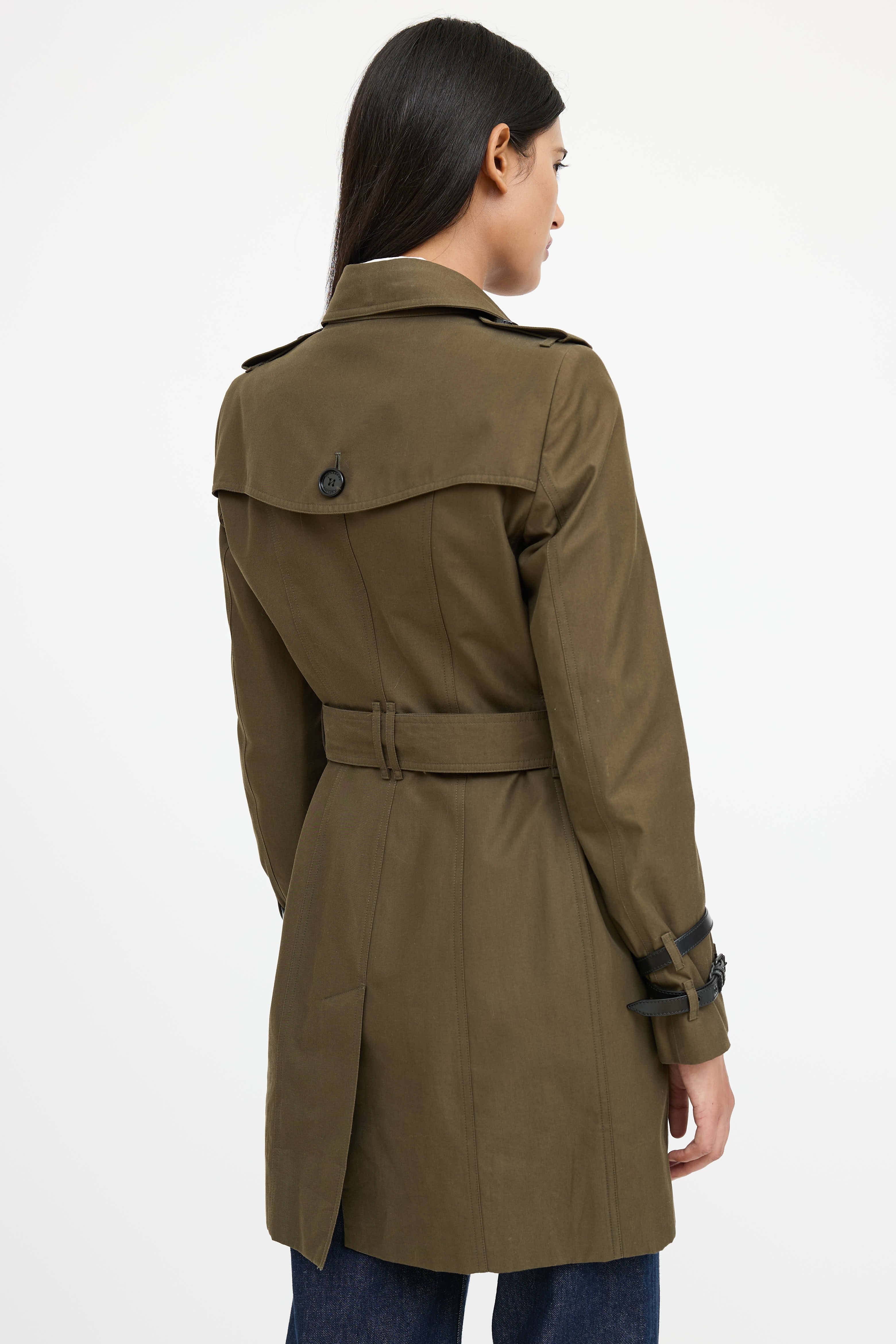 Pre-owned Burberry green trench coat featuring a pointed collar with leather buckle detail, shoulder epaulets, long sleeves with belted cuffs, two slit pockets at hip, adjustable belt at waist, and double breasted button closure. Lined.