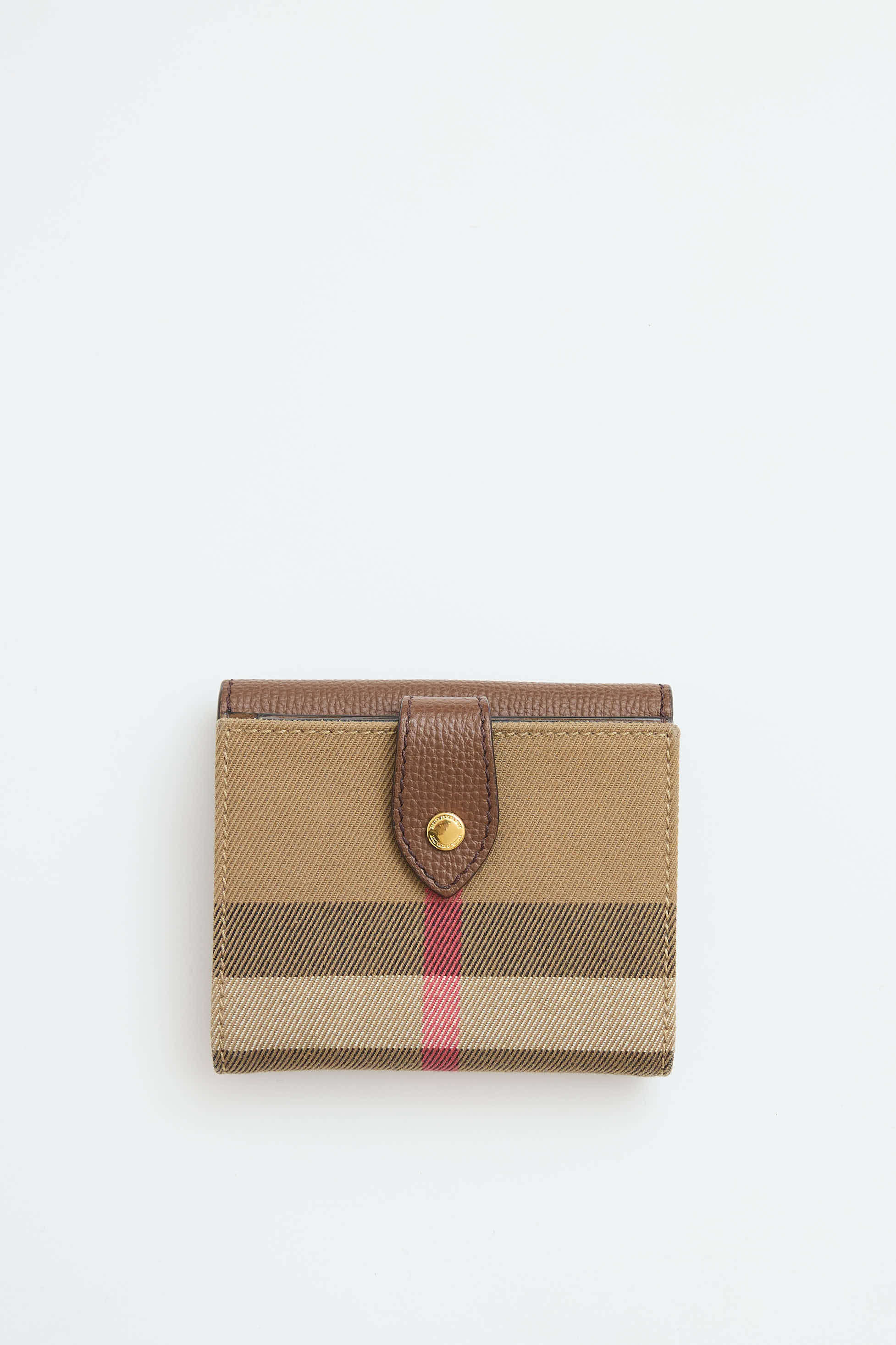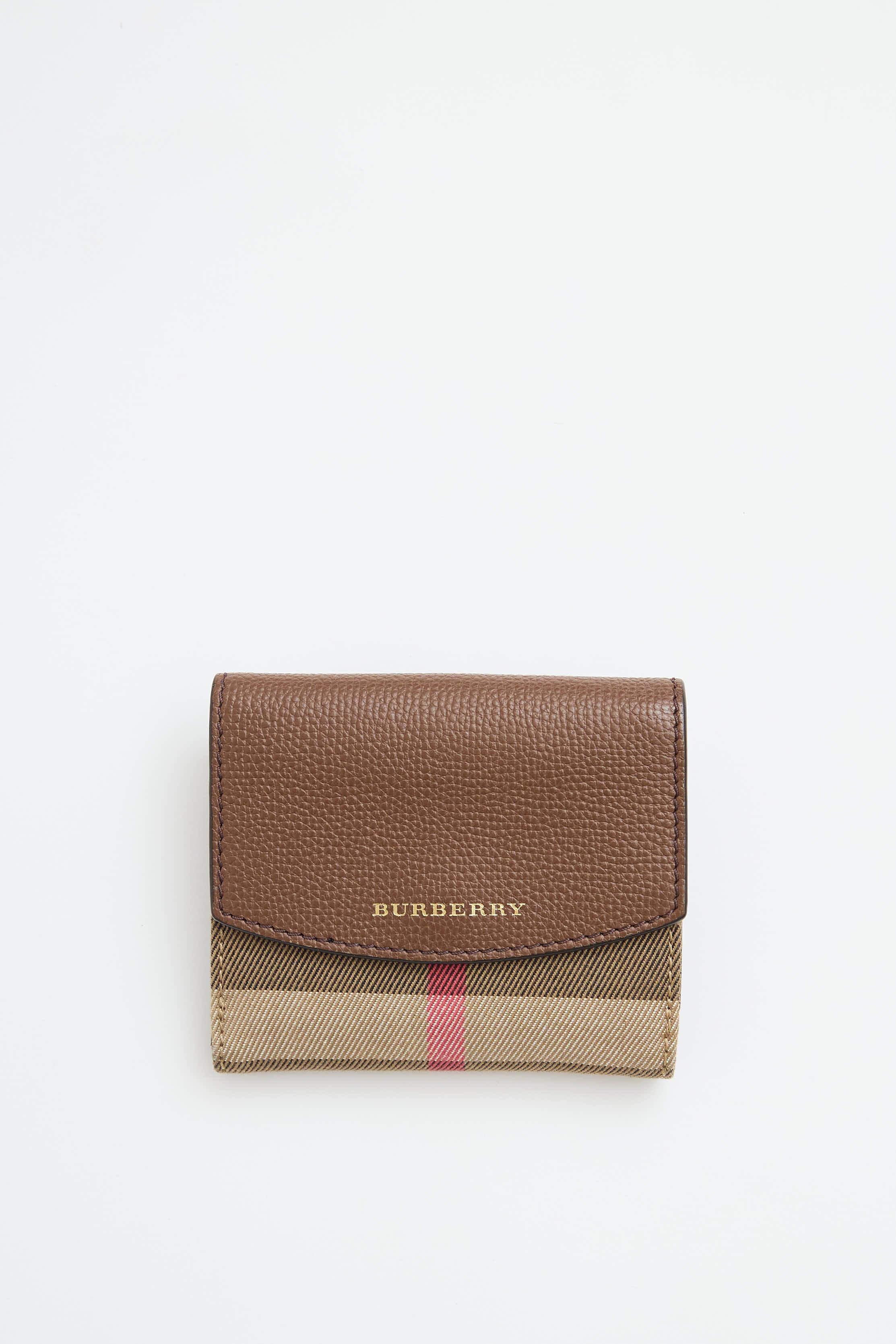 Pre-owned Burberry brown Luna wallet featuring House Check, gold printed logo at front, top flap with one main compartment, snap closure, one bill slot, and six card slots.