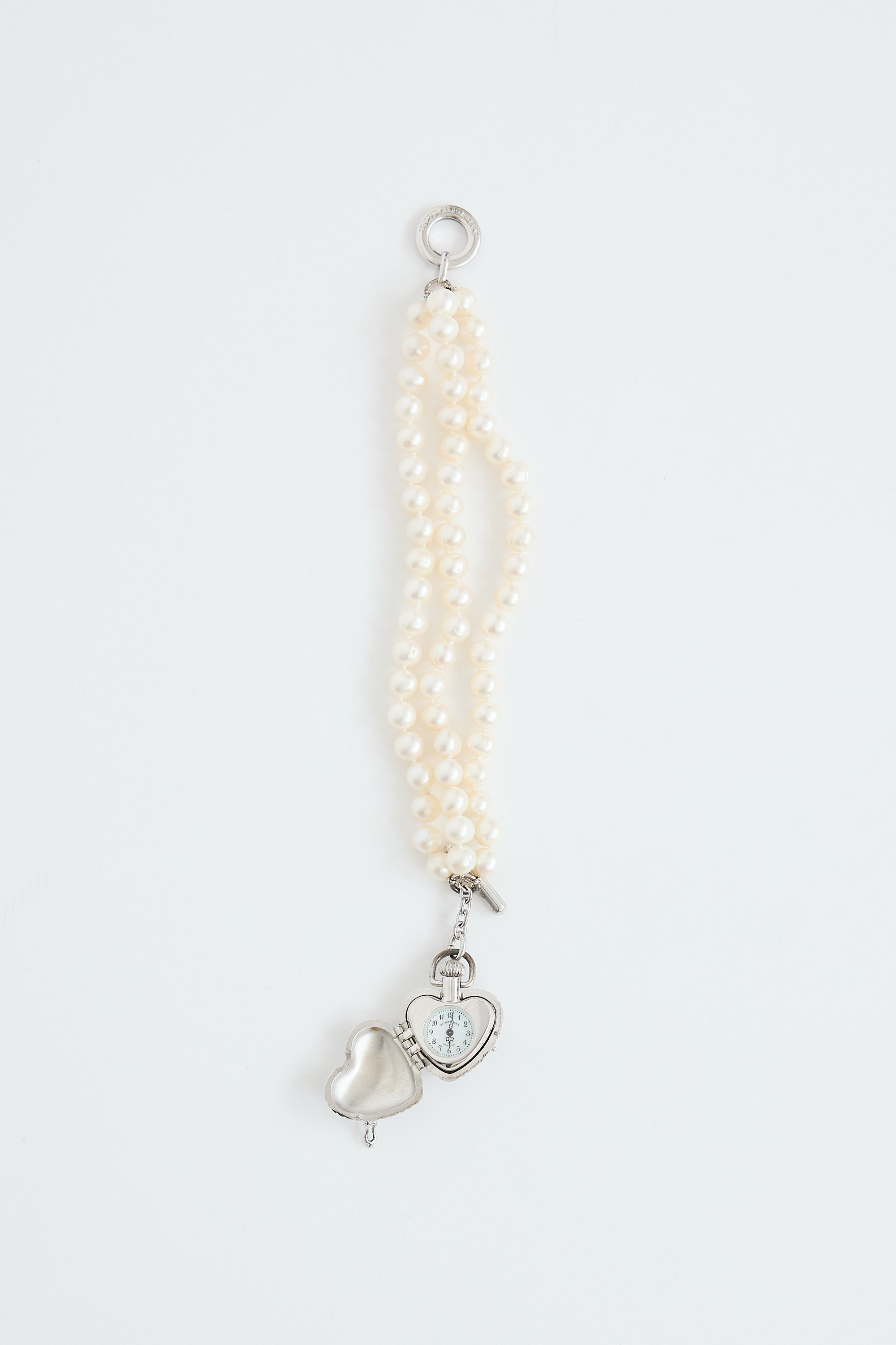 Pre-owned Burberry sterling silver watch featuring a silver heart locket pendant with debossed signature check pattern, three pearl strands, and toggle clasp with engraved logo.