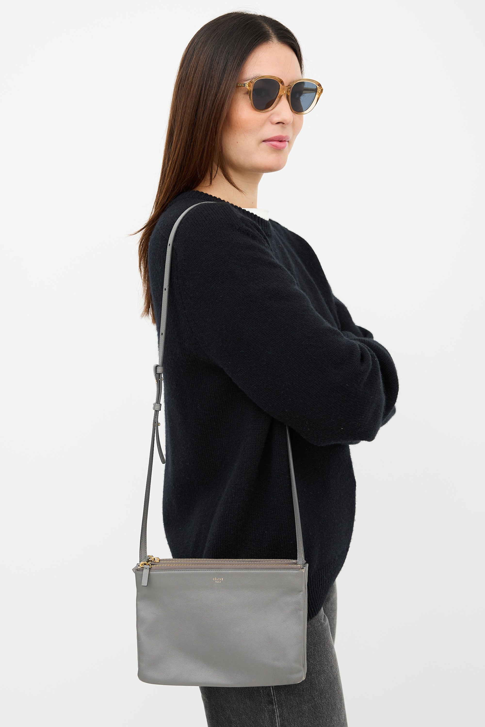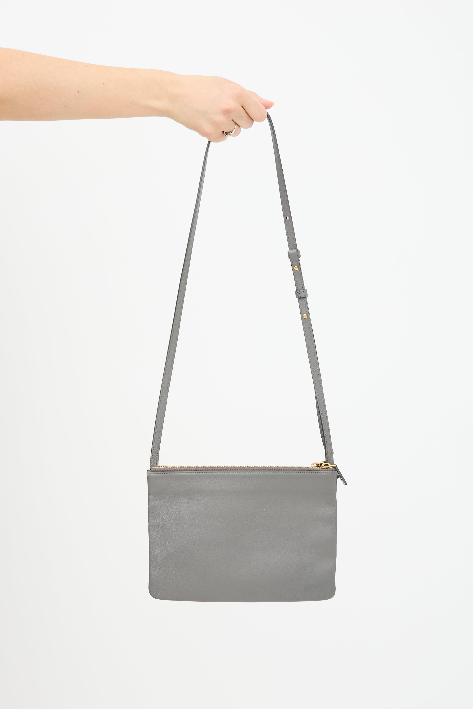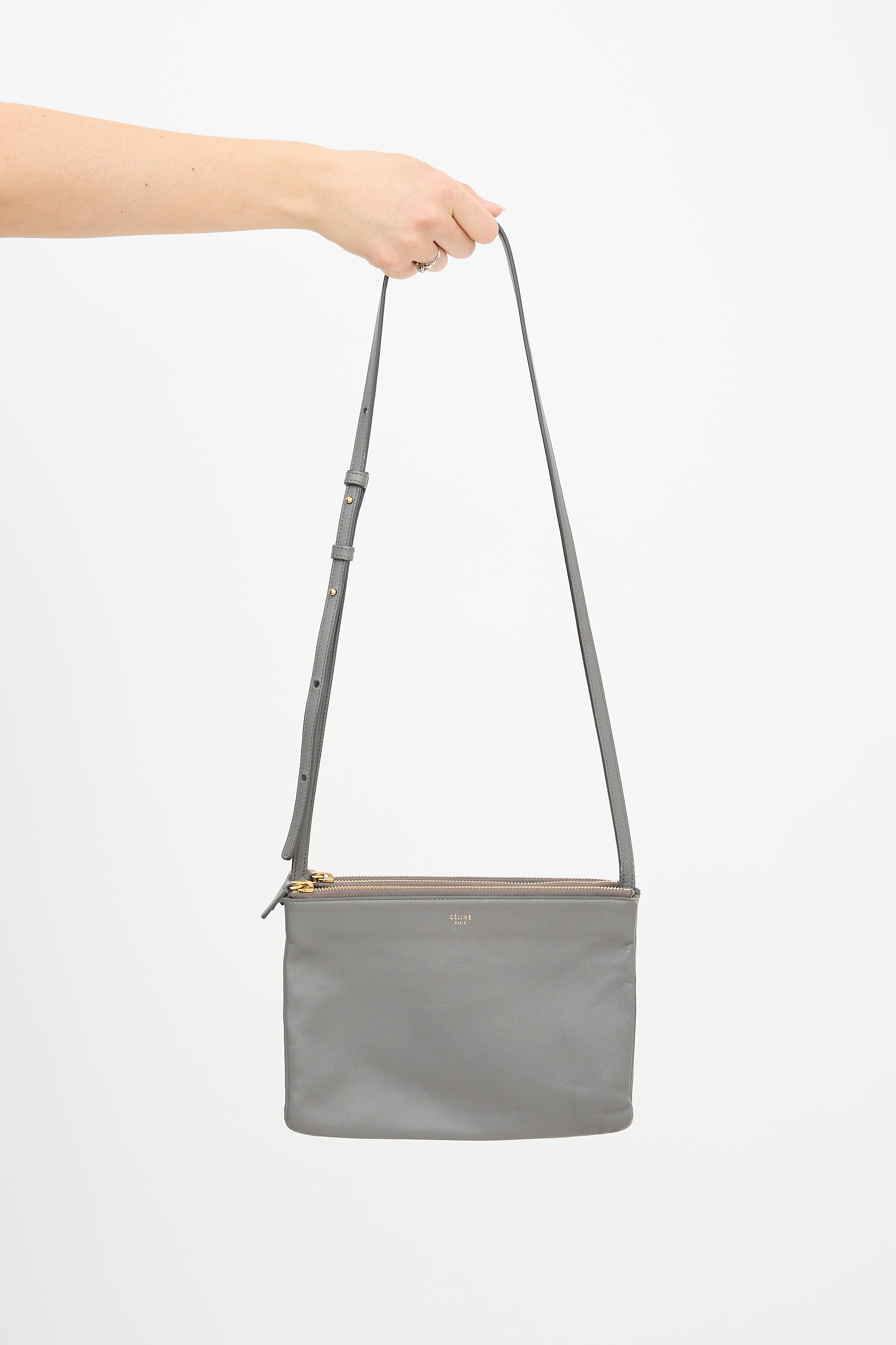 Pre-owned Celine 2016 grey leather Trio bag featuring front gold tone stamped logo, adjustable crossbody strap, three lined detachable compartments with snap fastenings, and top zip closures. Comes with original dust bag.