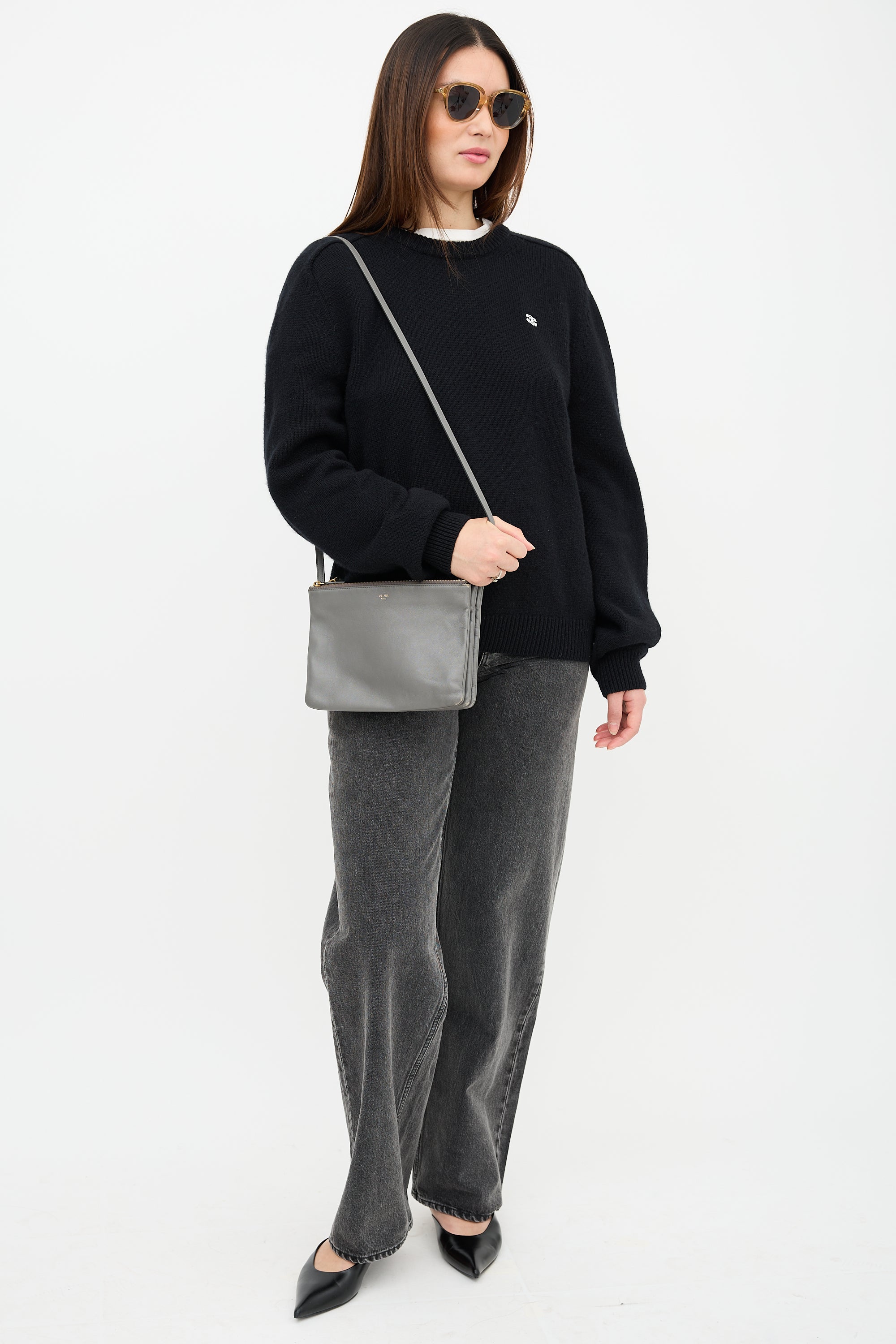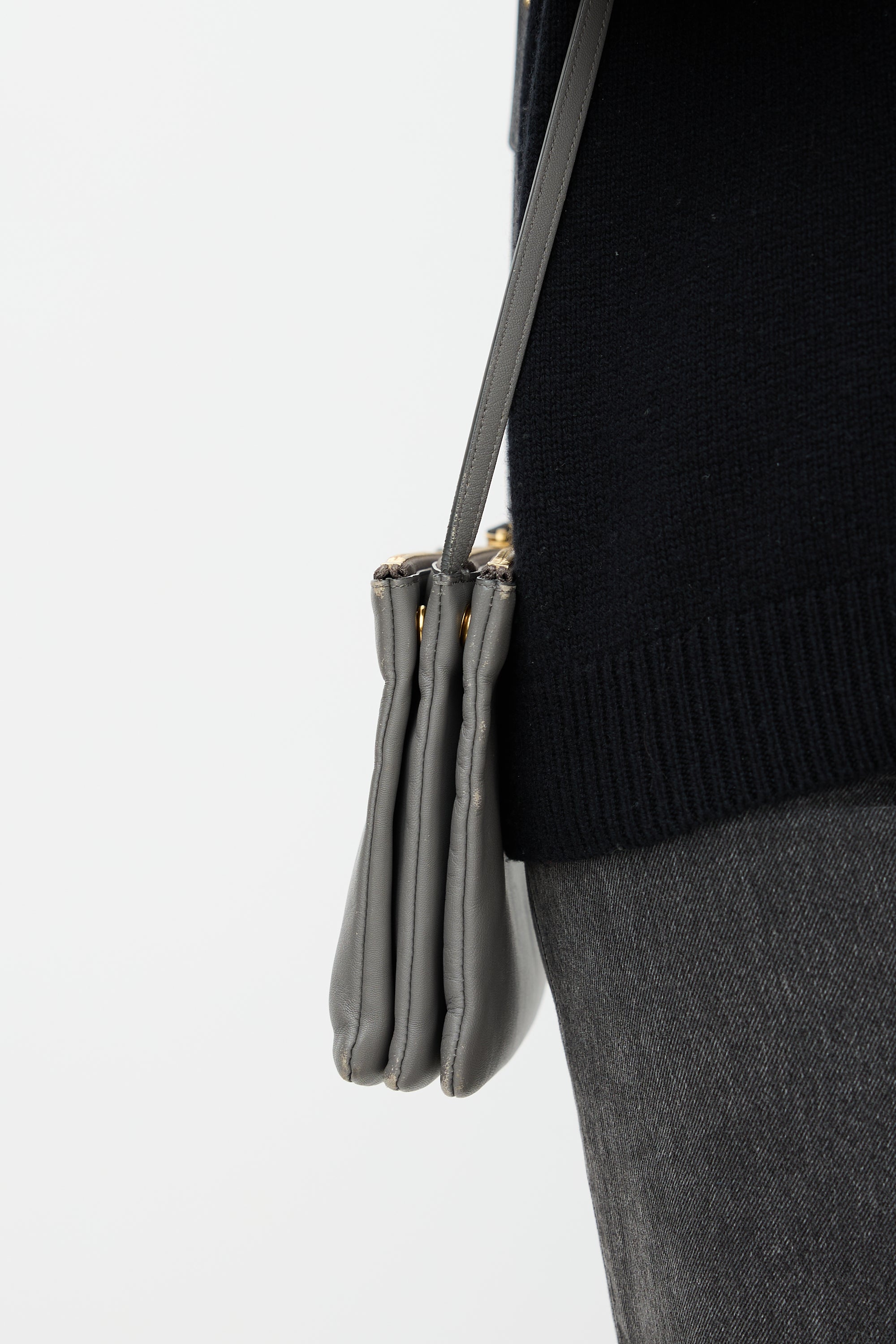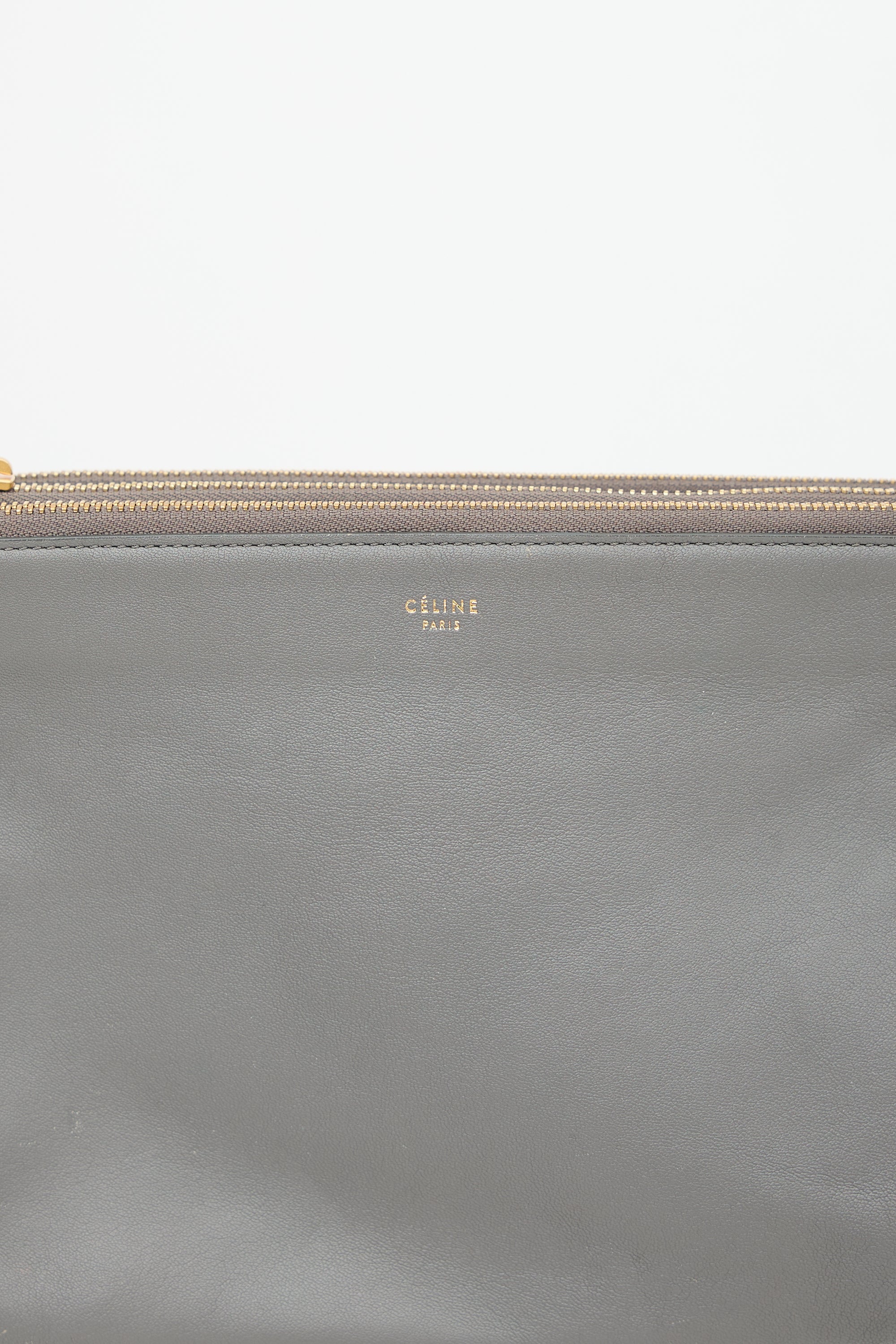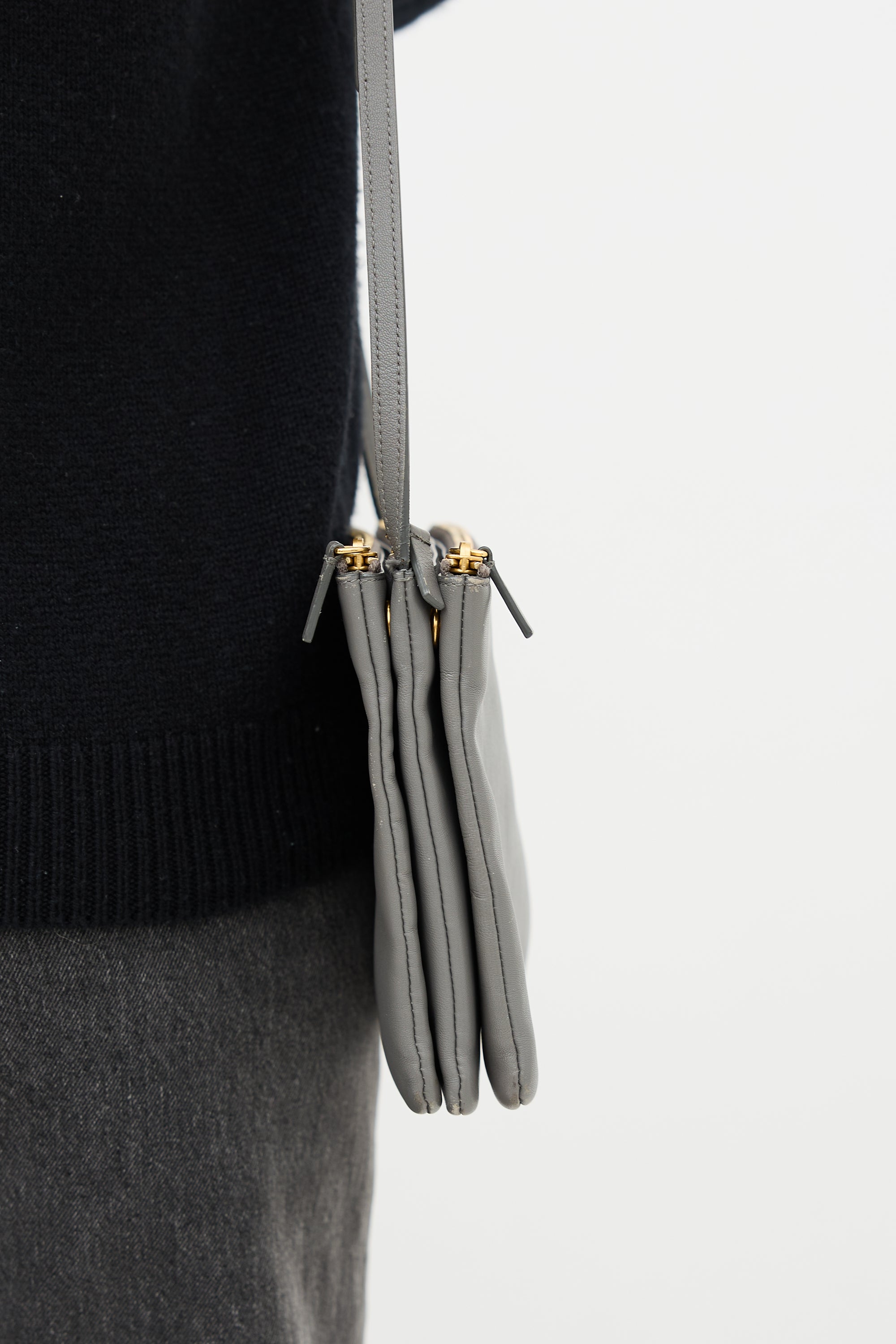 Pre-owned Celine 2016 grey leather Trio bag featuring front gold tone stamped logo, adjustable crossbody strap, three lined detachable compartments with snap fastenings, and top zip closures. Comes with original dust bag.