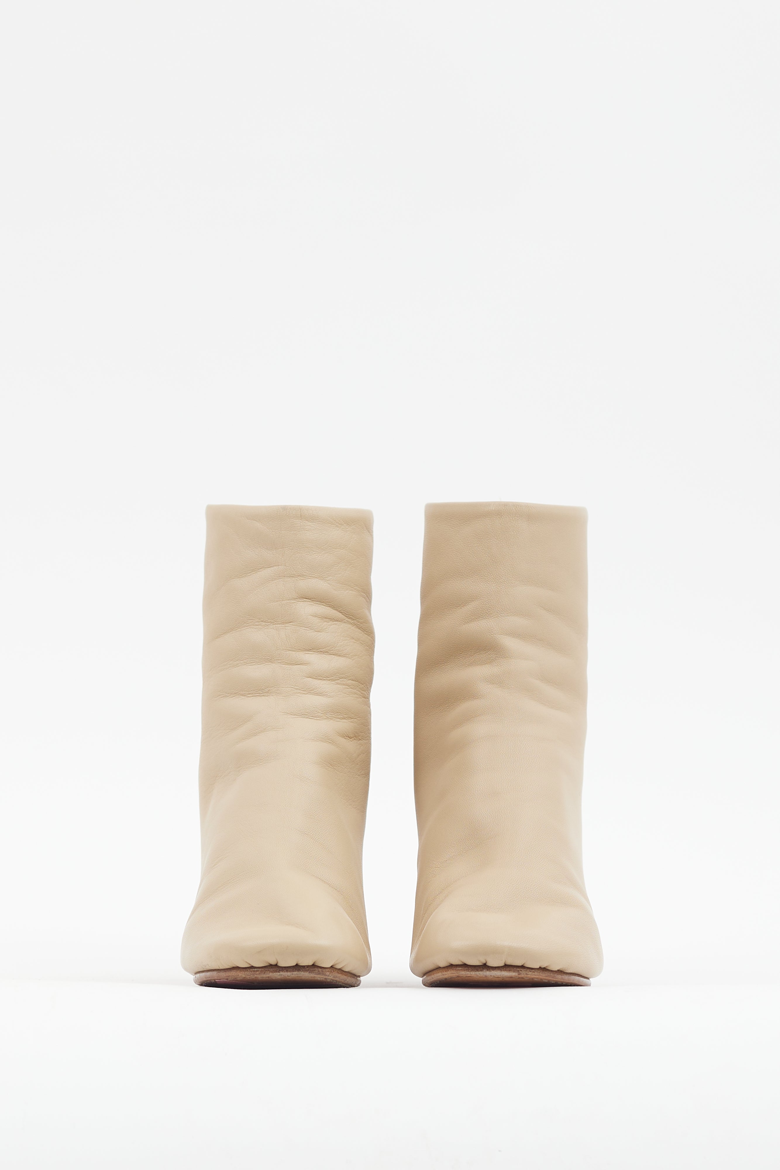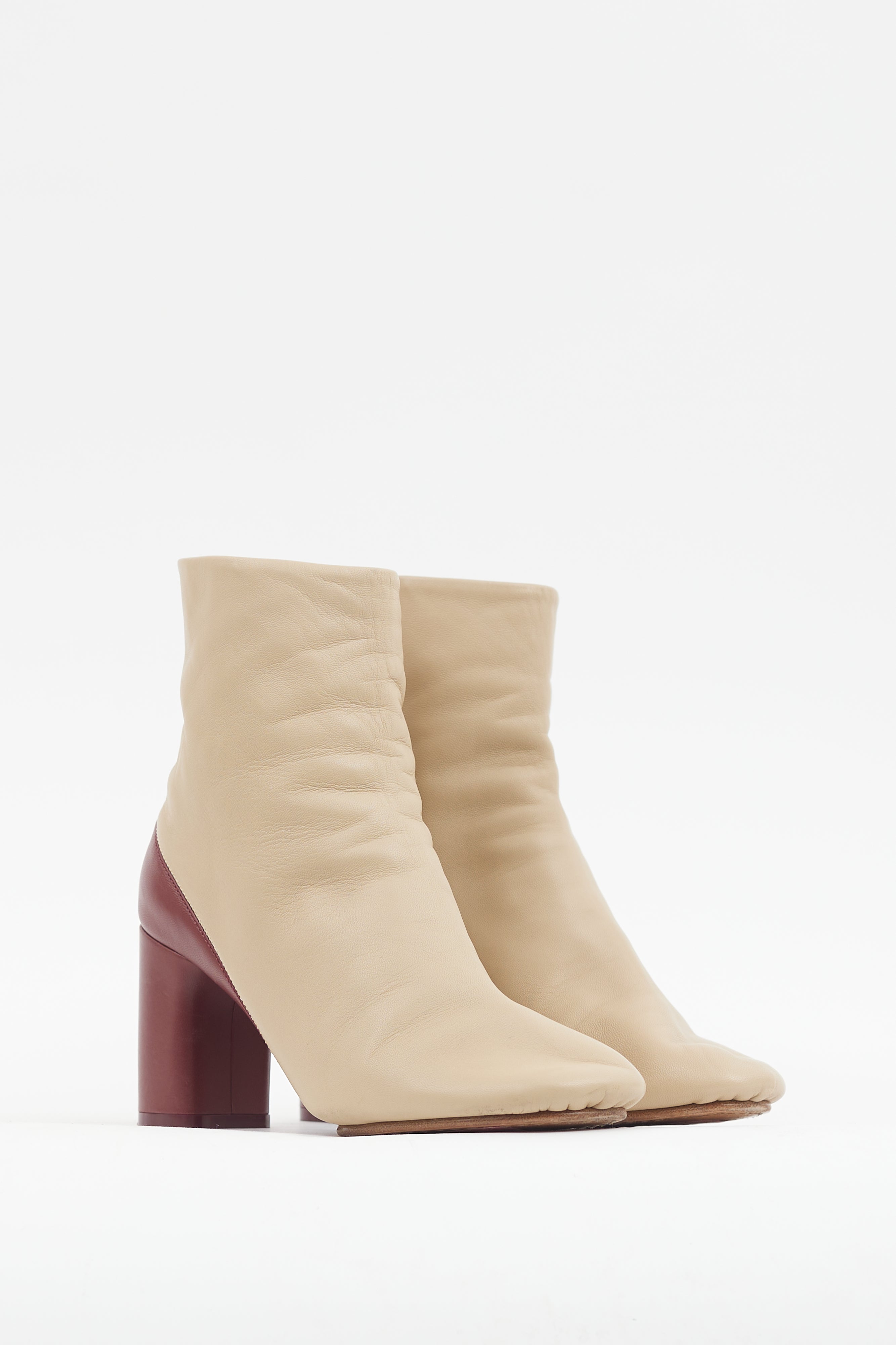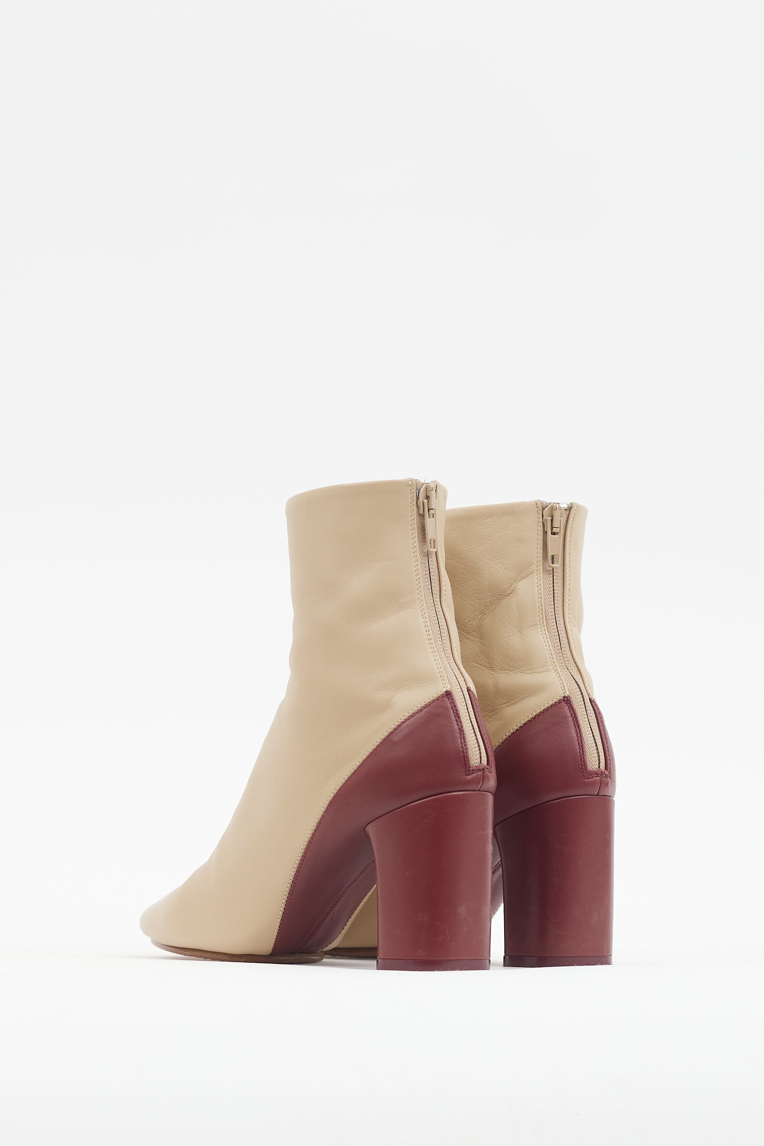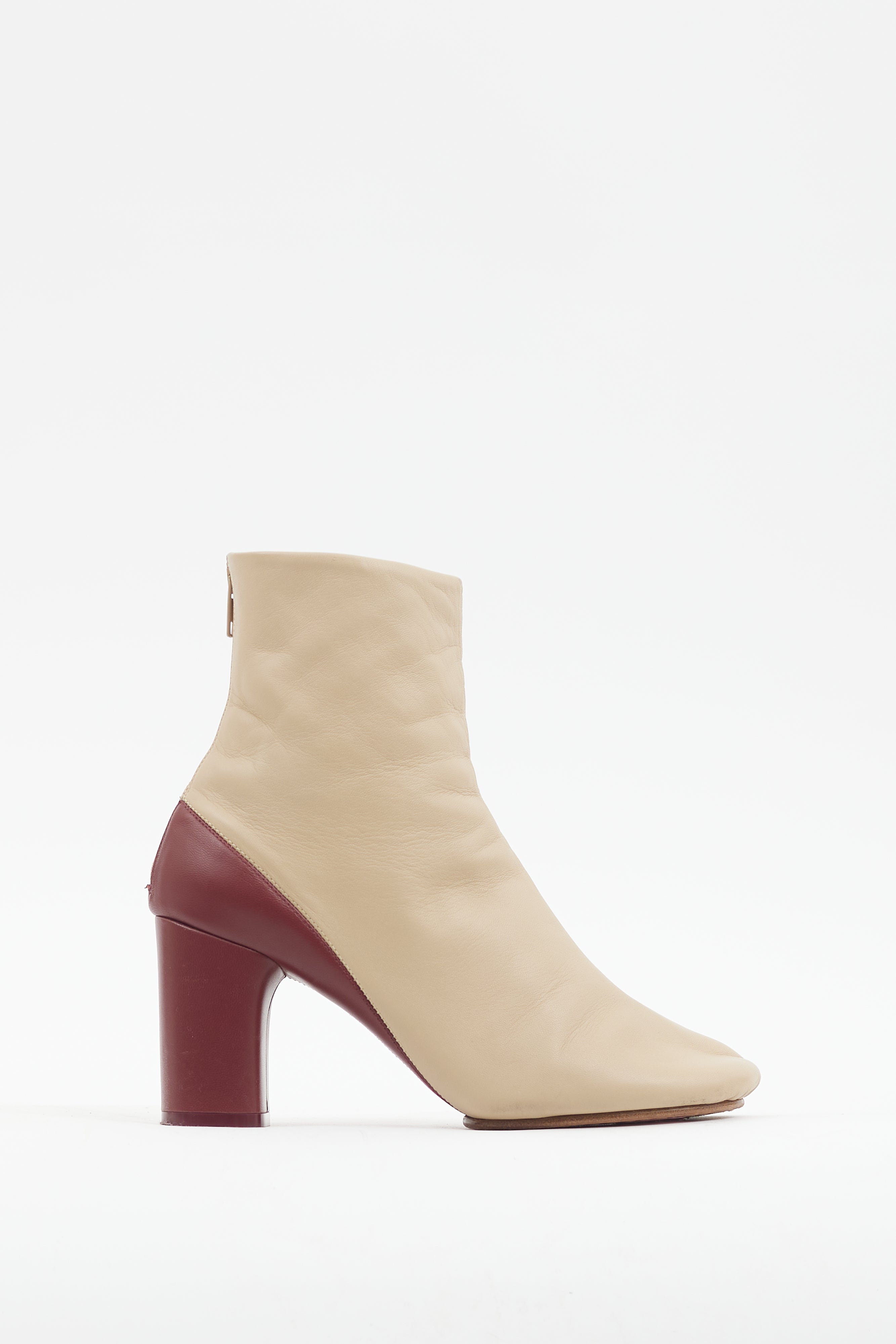 Pre-owned Celine beige and burgundy leather boots featuring a rounded toe, covered block heel, back zip closure, and tonal stitching at counter. Comes with original box and dust bags.