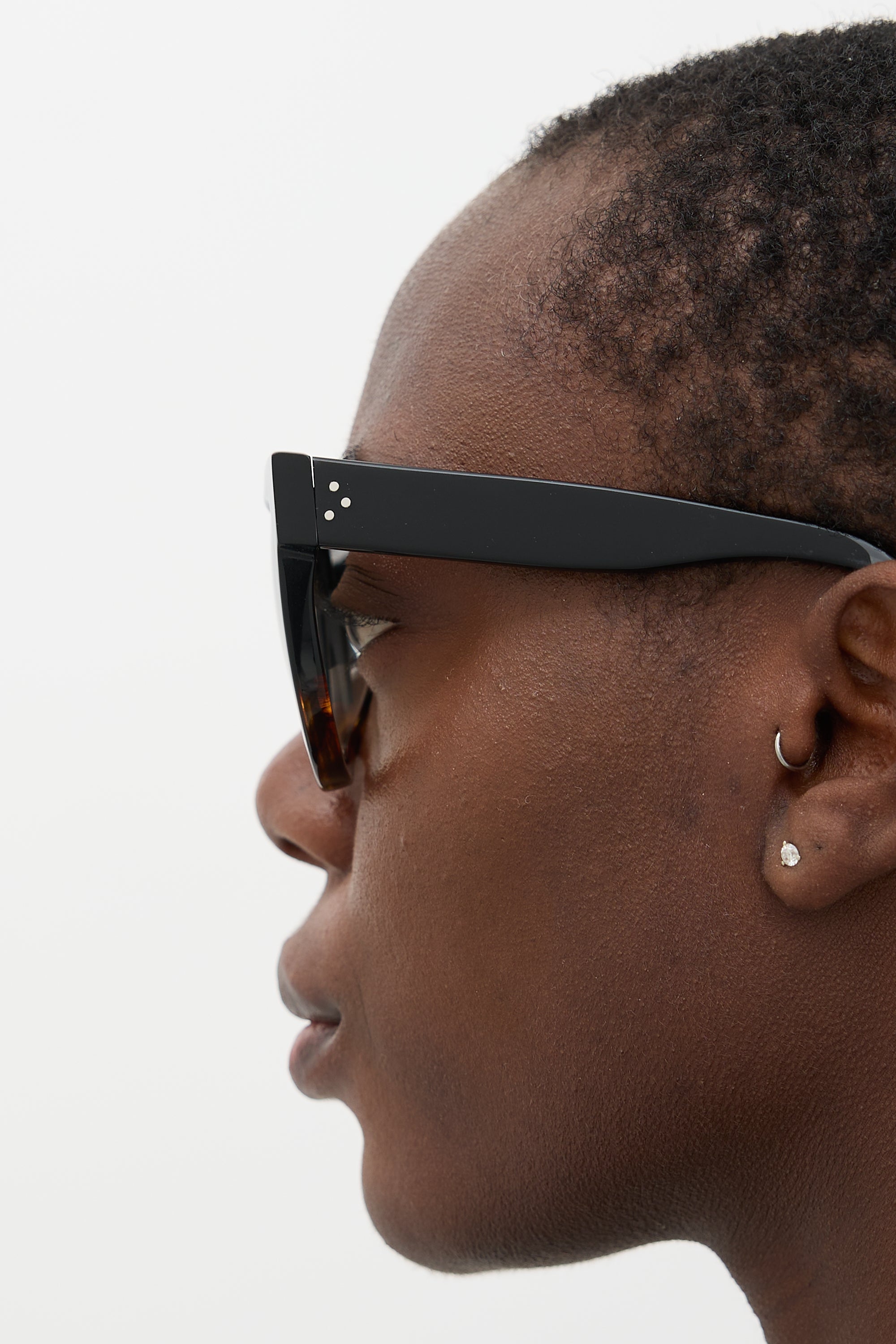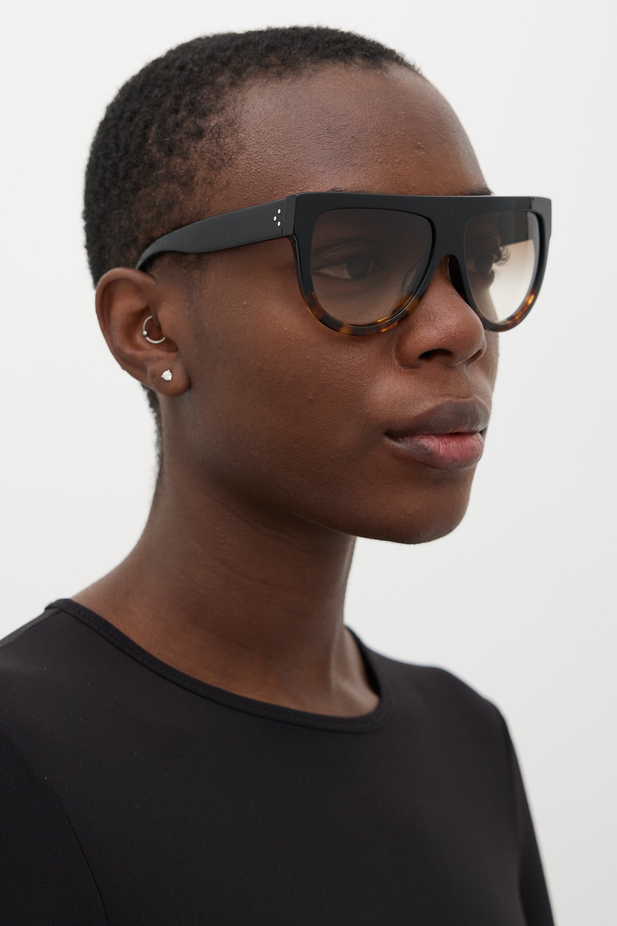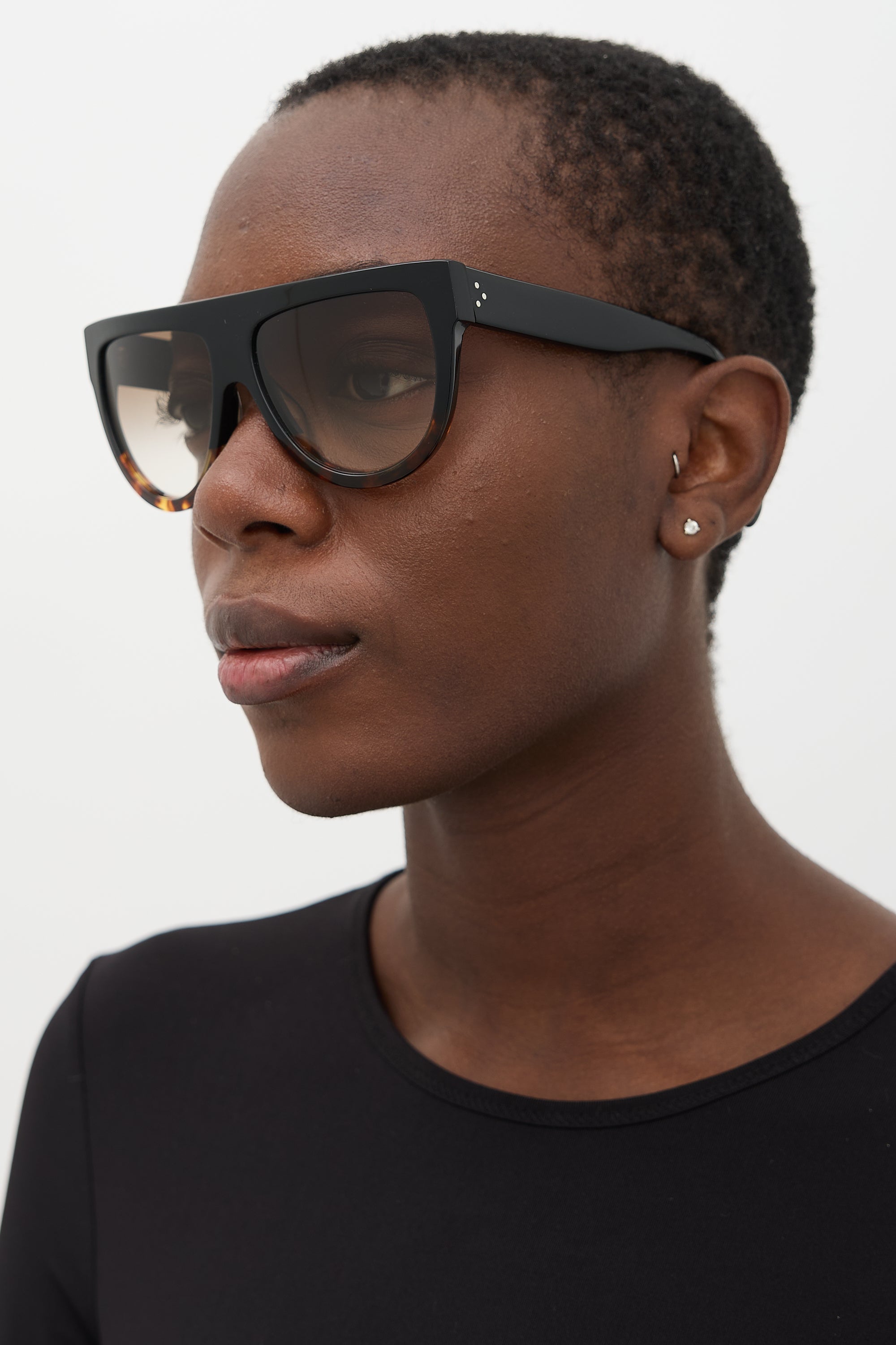 Pre-owned Celine 41026/S sunglasses featuring brown gradient tinted lenses, straight brow bar, black frame with brown tortoiseshell gradient, and signature silver tone three dots at temples. Comes with original case and wipe cloth.