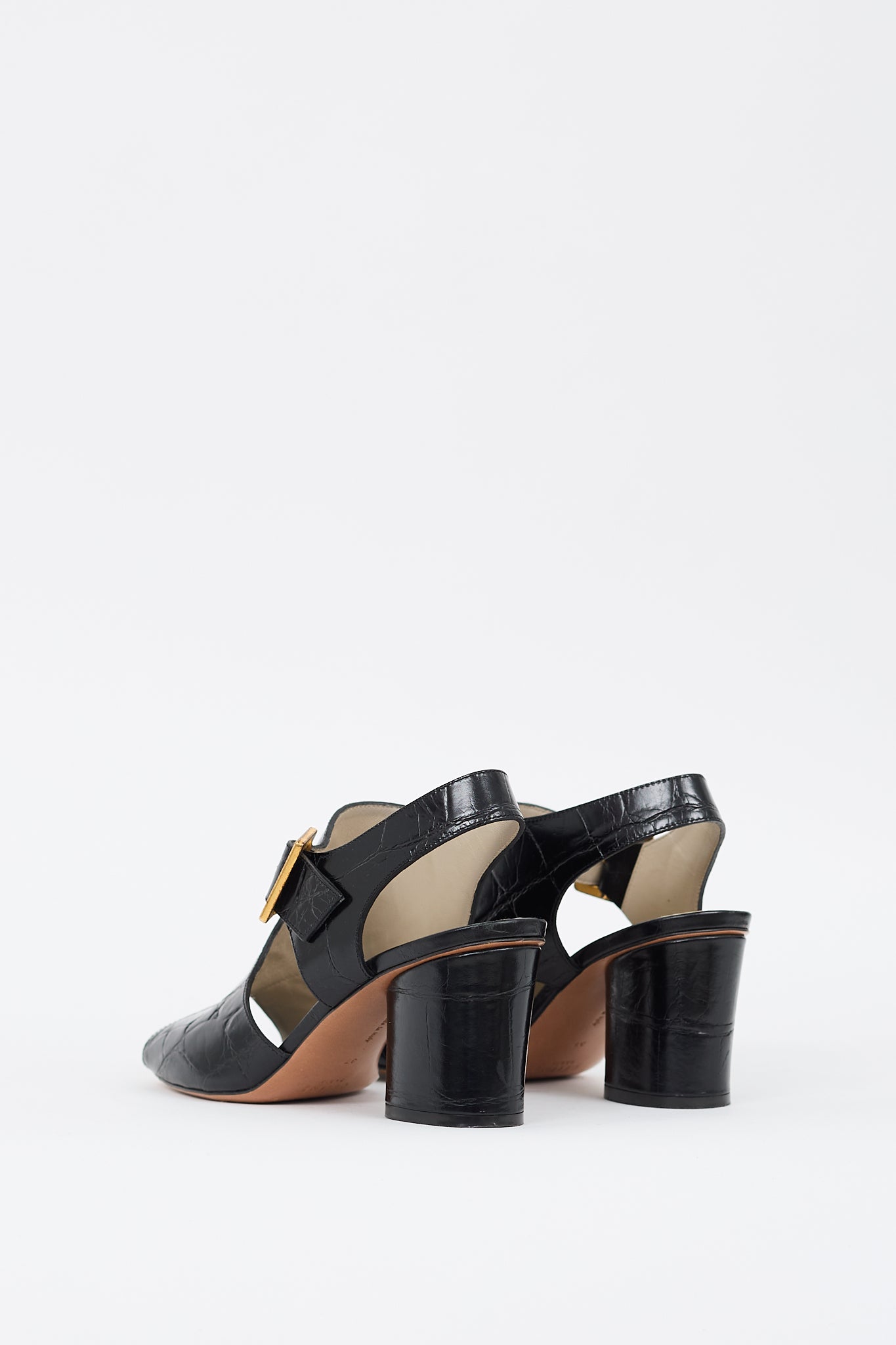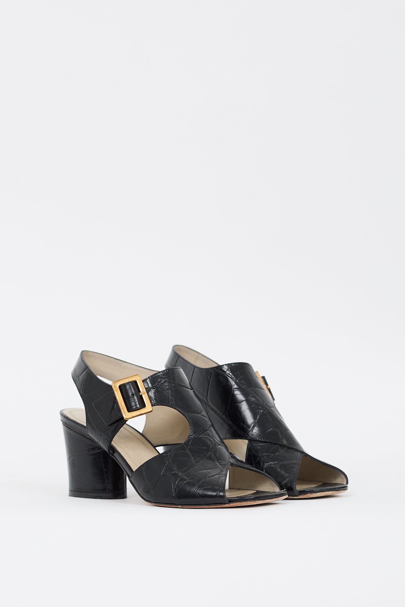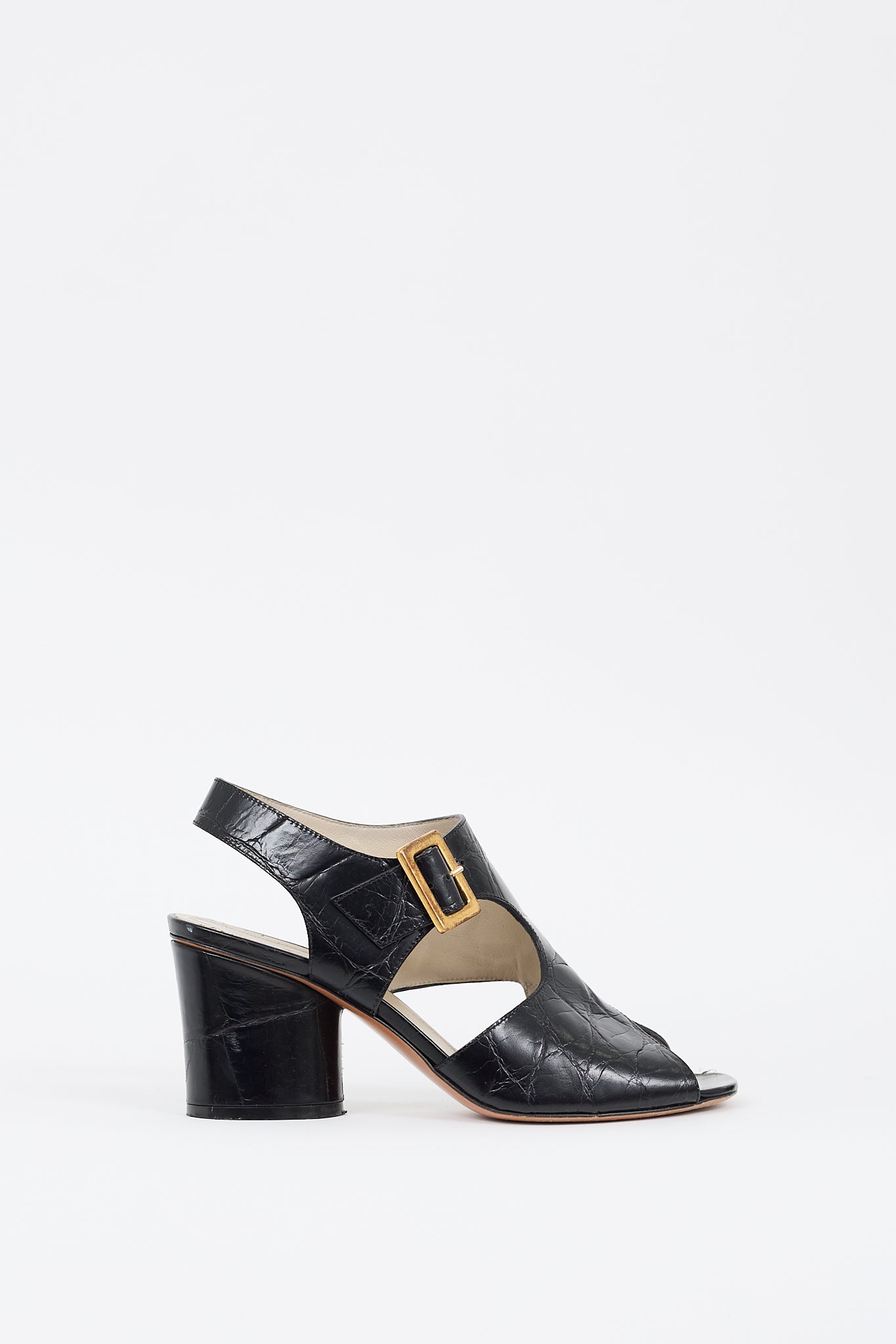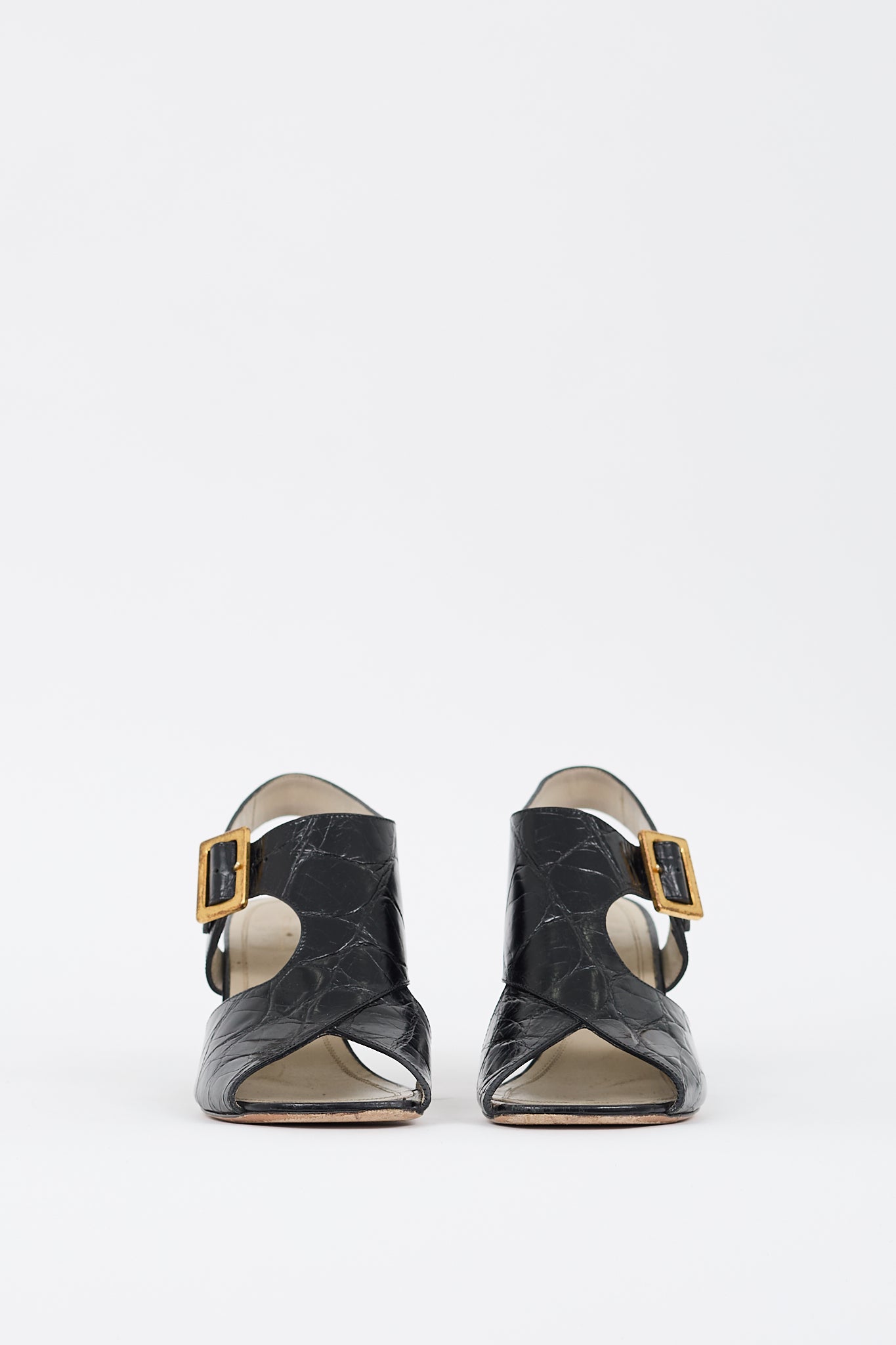 Pre-owned Celine black embossed buckle heeled sandals featuring open square toe, embossed croc effect throughout, criss cross strap at vamp, adjustable ankle strap with gold tone buckle closure, leather insole and oval block heel.