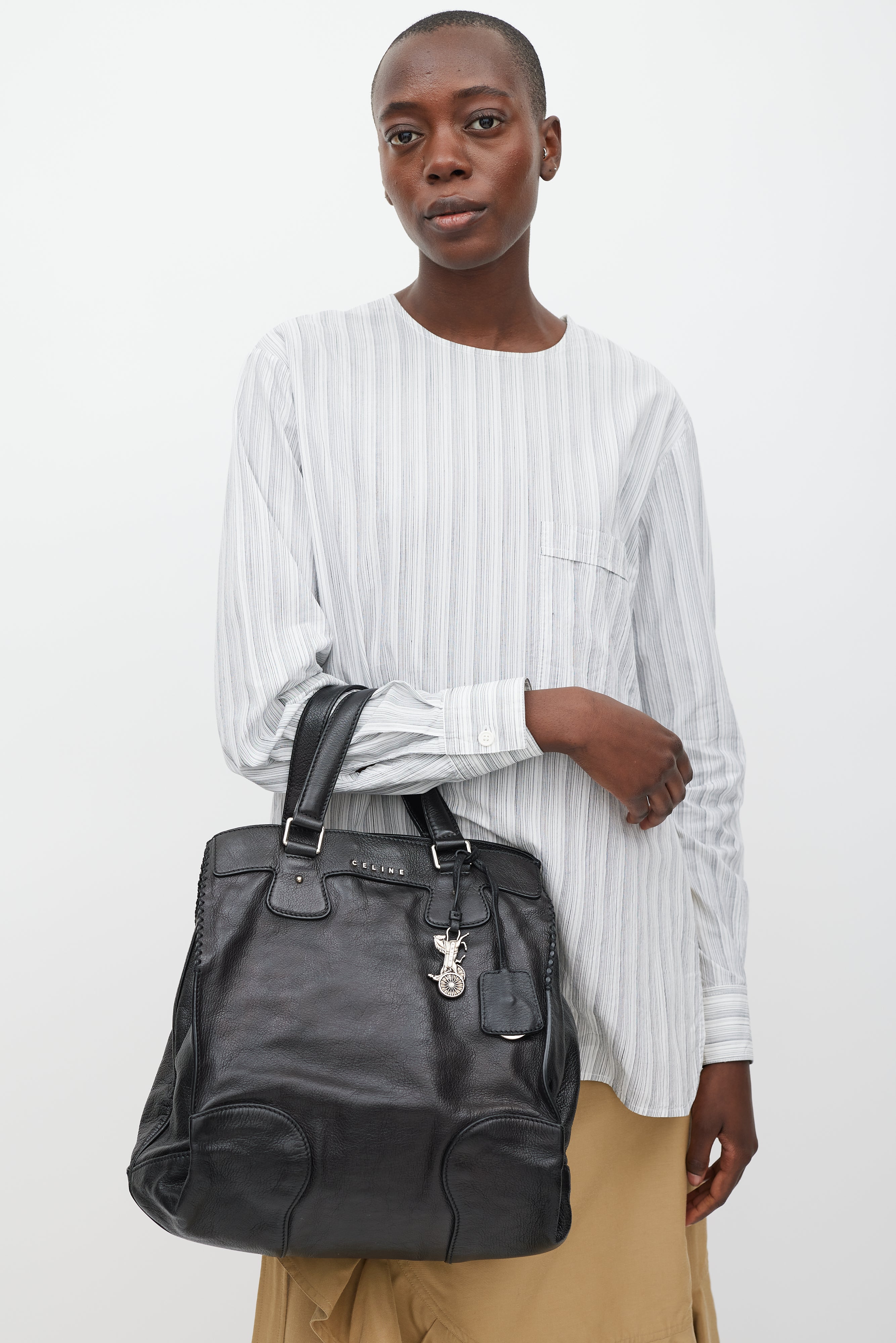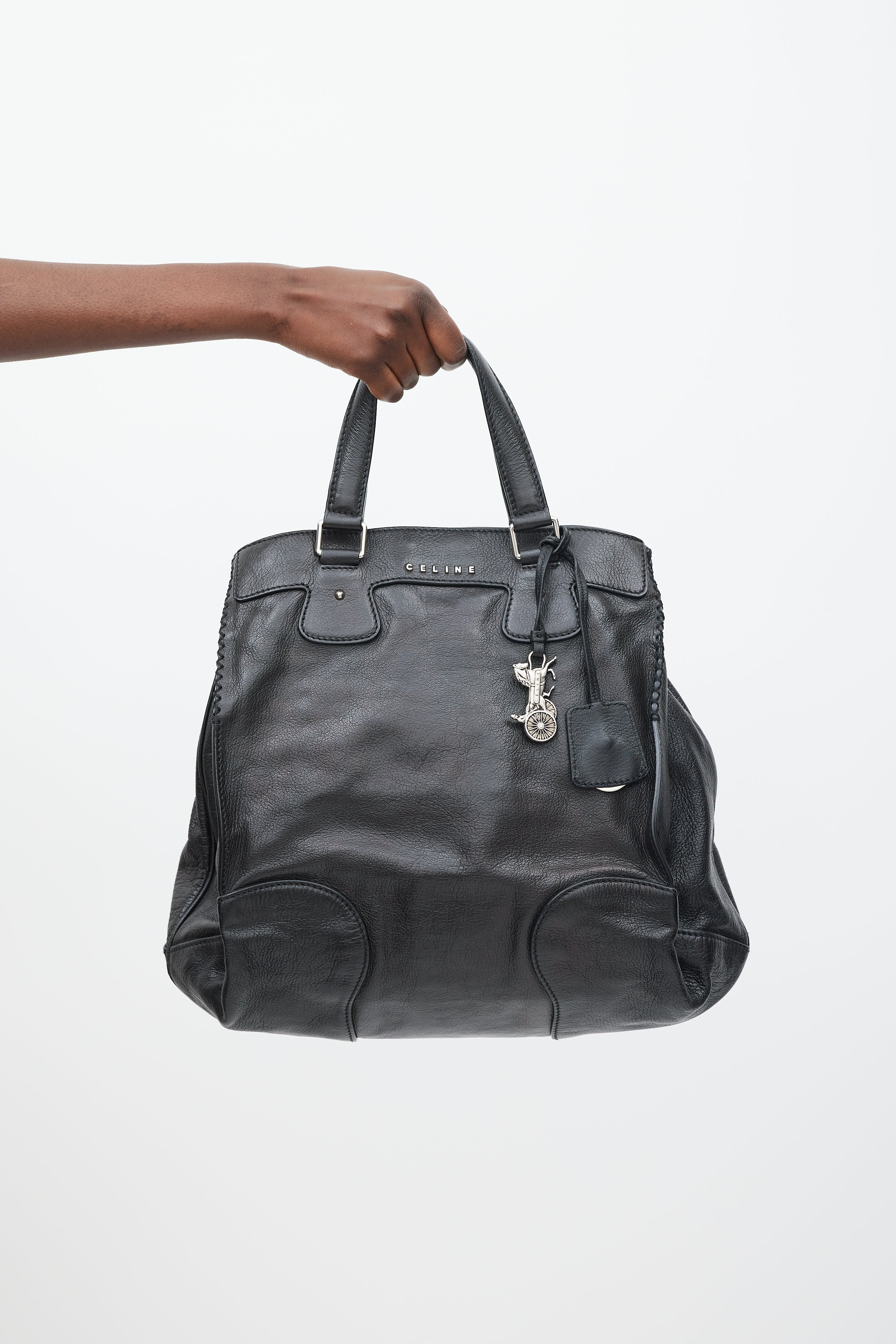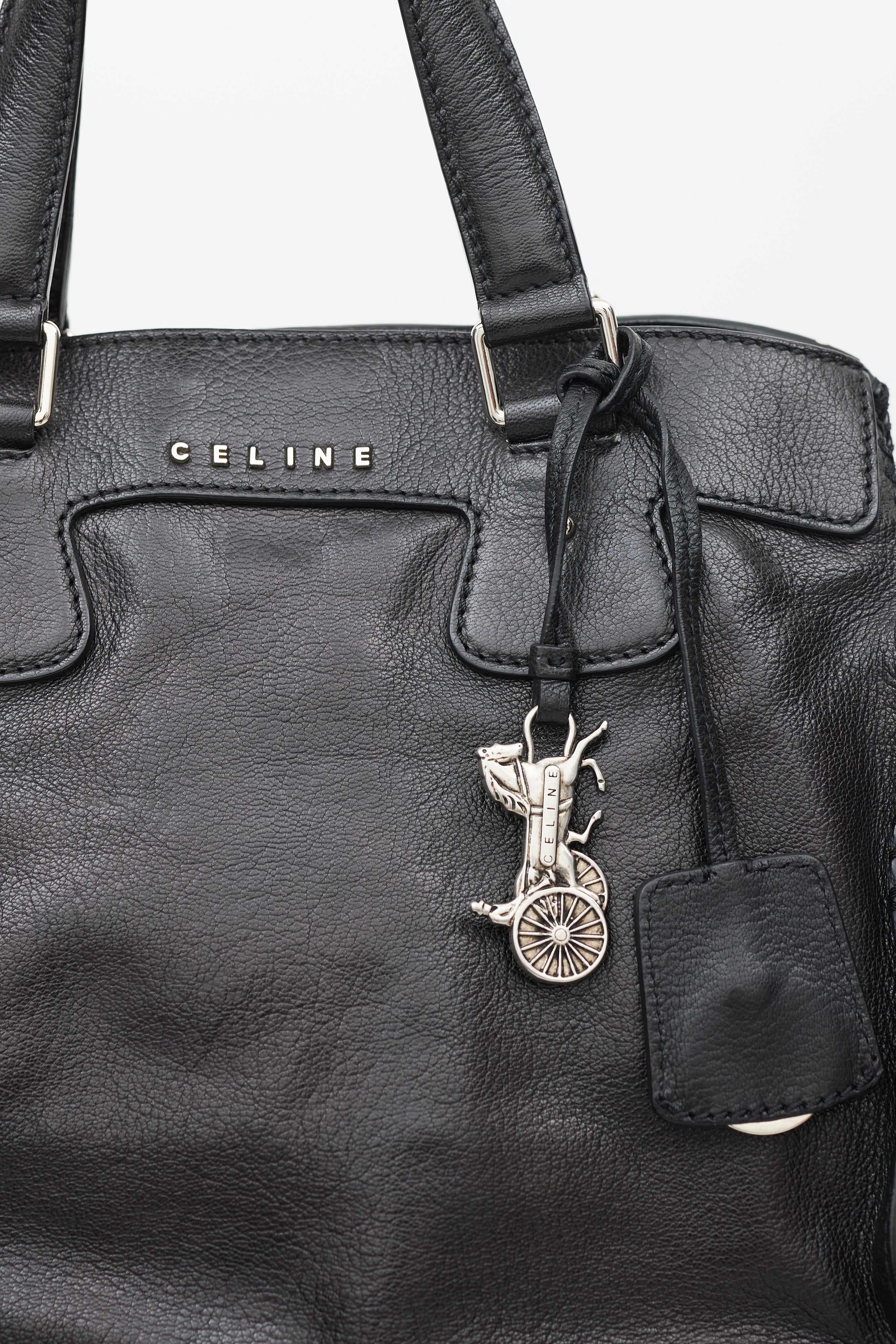 Pre-owned Celine black leather Orlov bag featuring panelled construction, tonal stitching, silver tone hardware, front hardware logo, dual flat top handles, metal horse and carriage charm on strap, clochette charm on strap, magnetic top closure, and three lined main compartment with one zip pocket and two slip pockets.