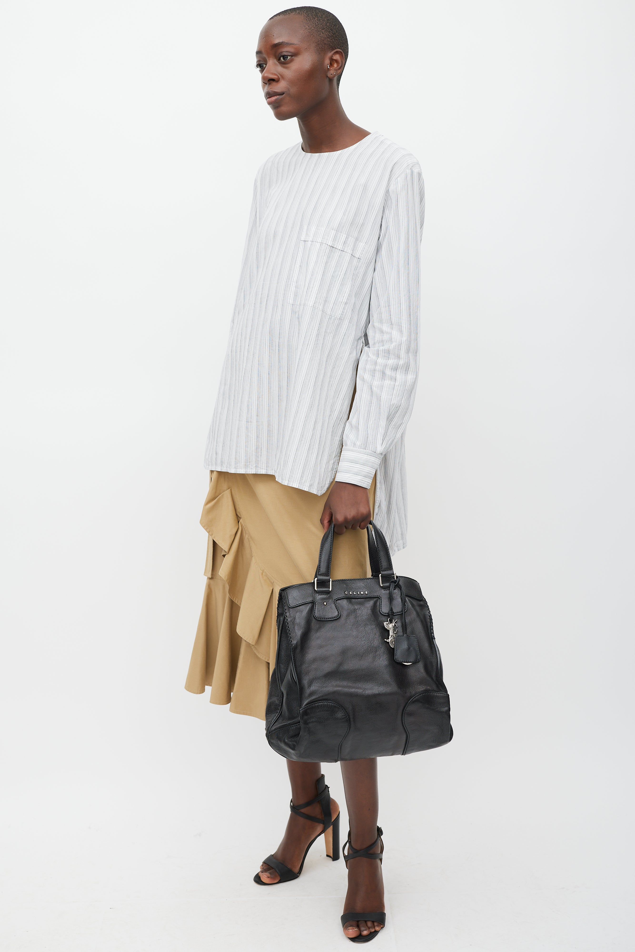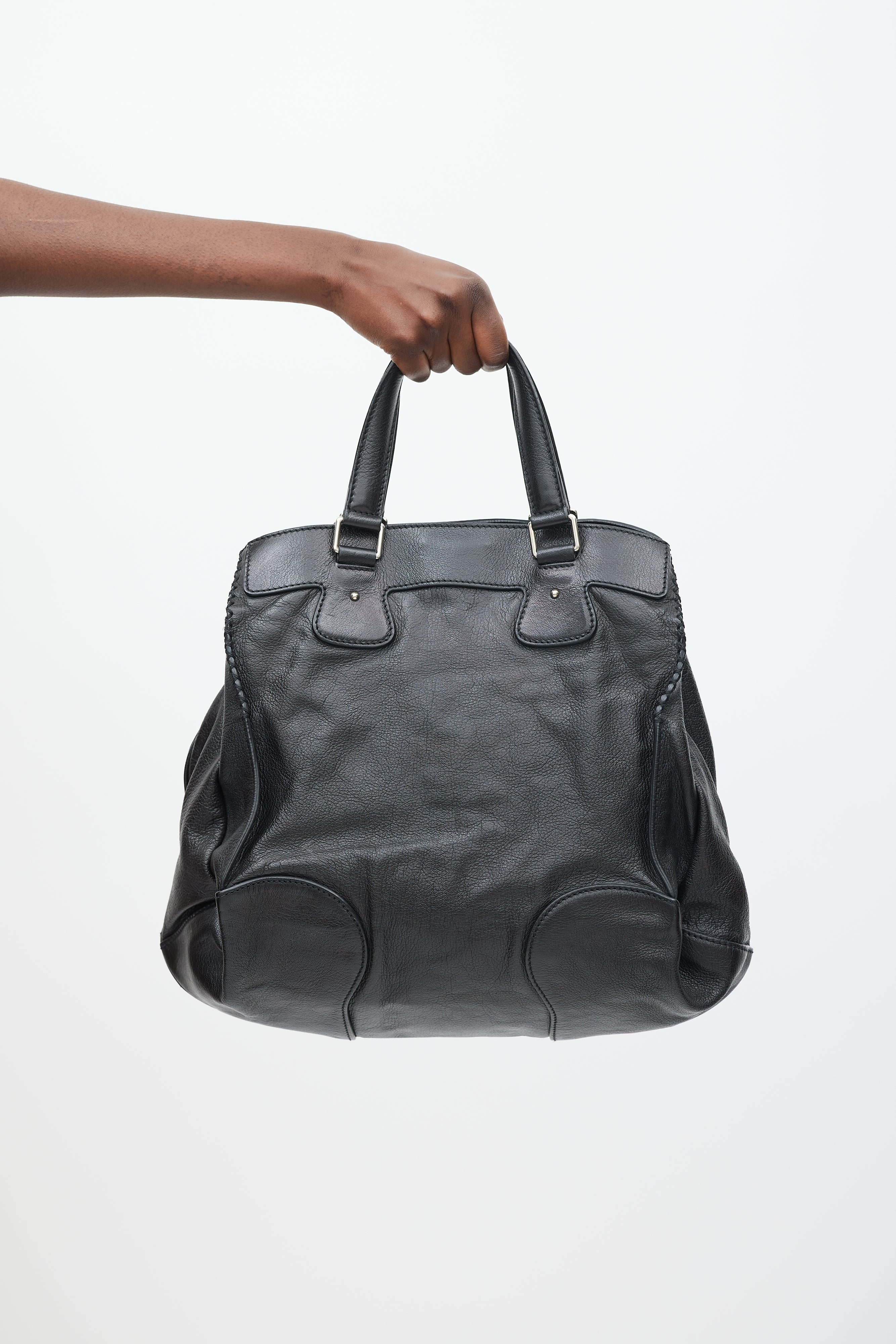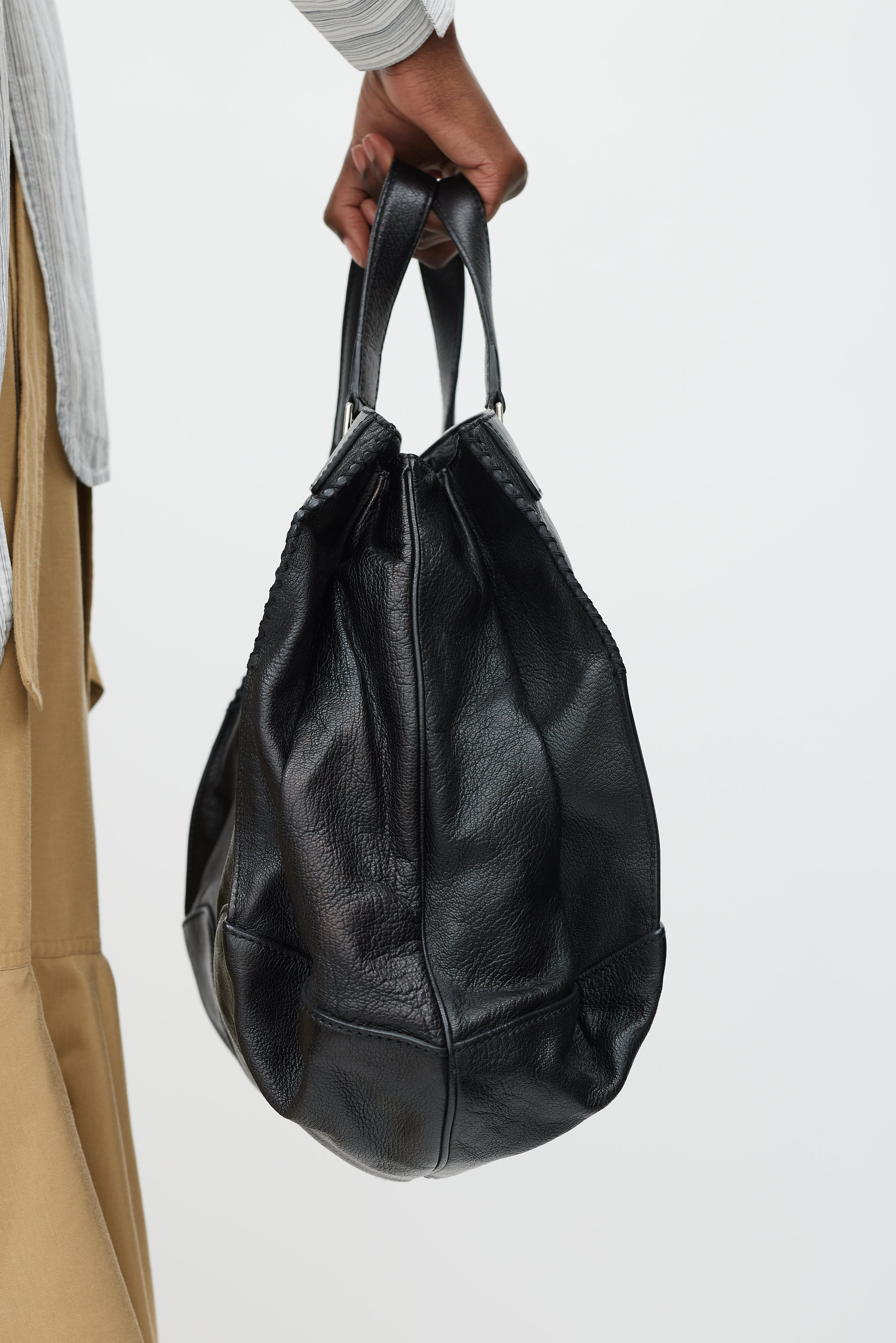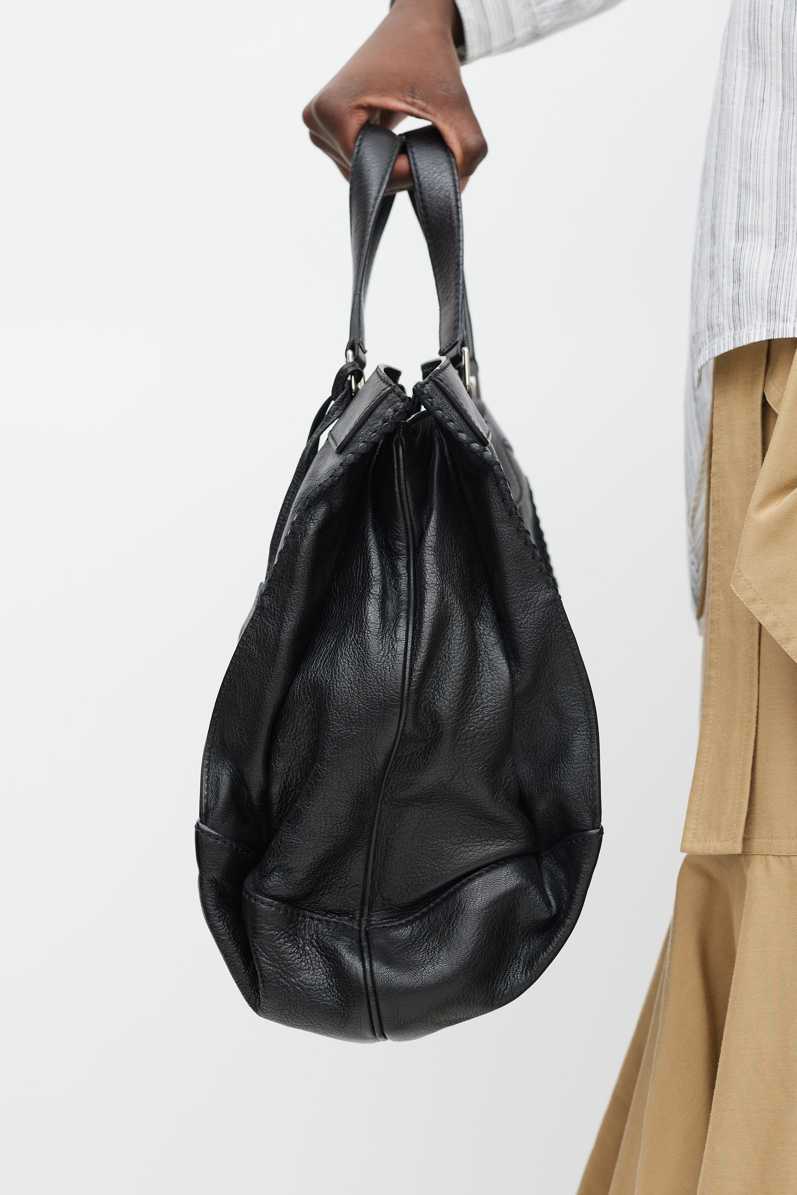 Pre-owned Celine black leather Orlov bag featuring panelled construction, tonal stitching, silver tone hardware, front hardware logo, dual flat top handles, metal horse and carriage charm on strap, clochette charm on strap, magnetic top closure, and three lined main compartment with one zip pocket and two slip pockets.