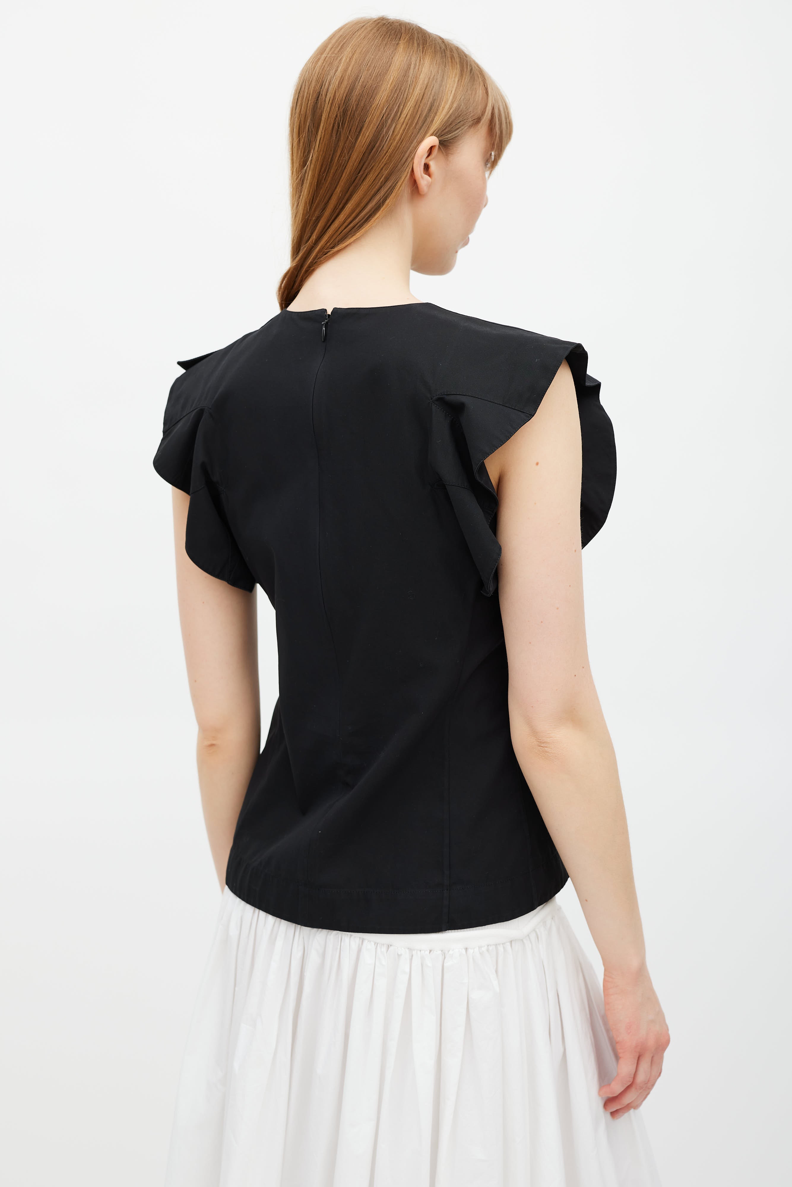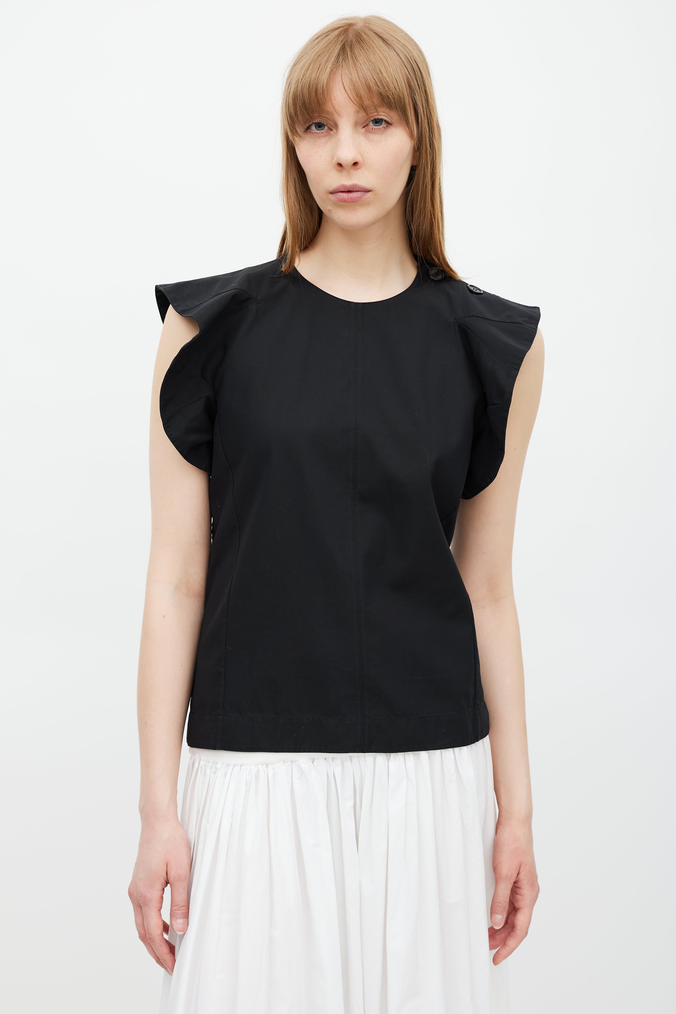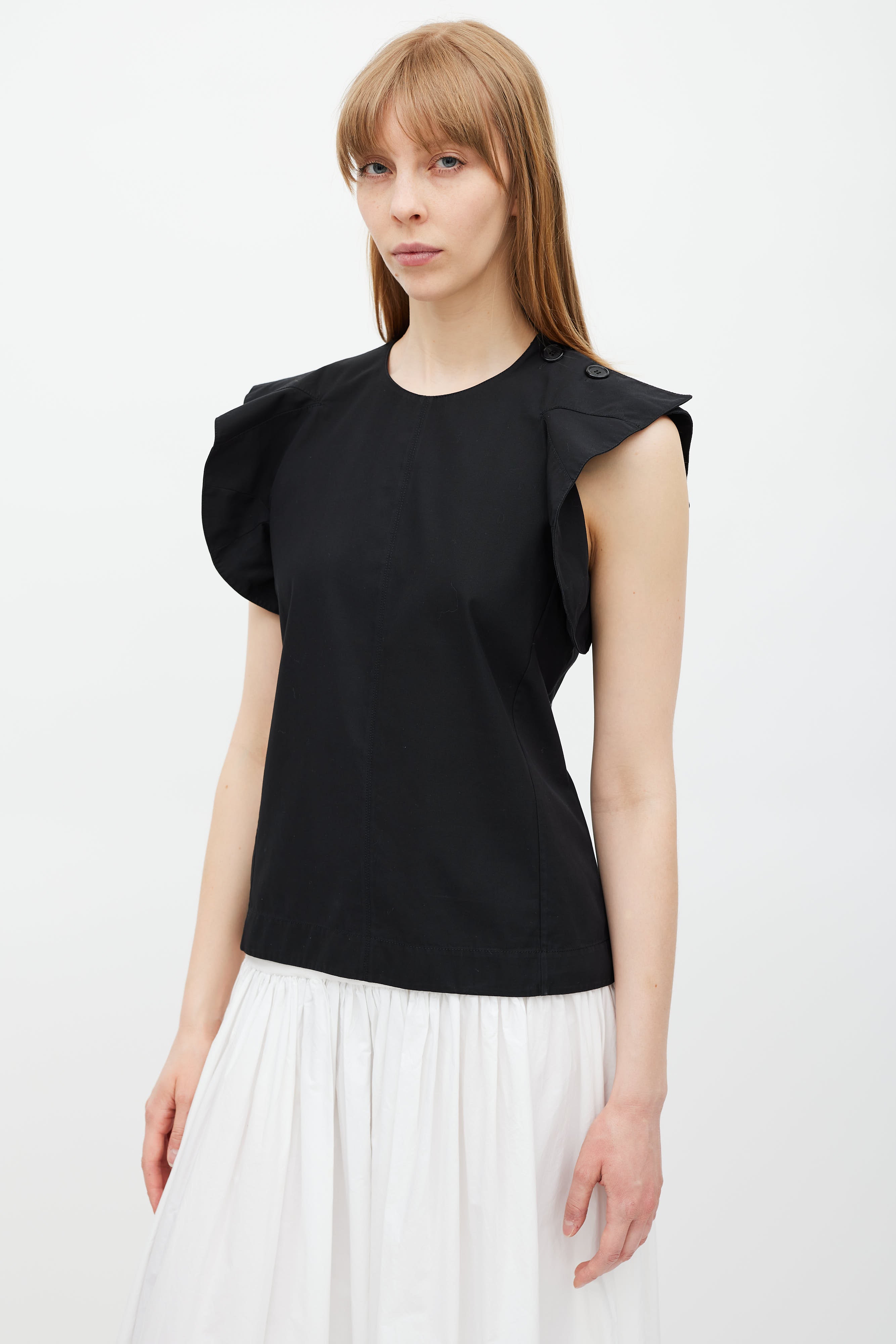 Pre-owned Celine black top featuring a round neckline, cap sleeves with ruffled trim, button detail at shoulder, and zip at back with hook and eye closure. Phoebe Philo era design.