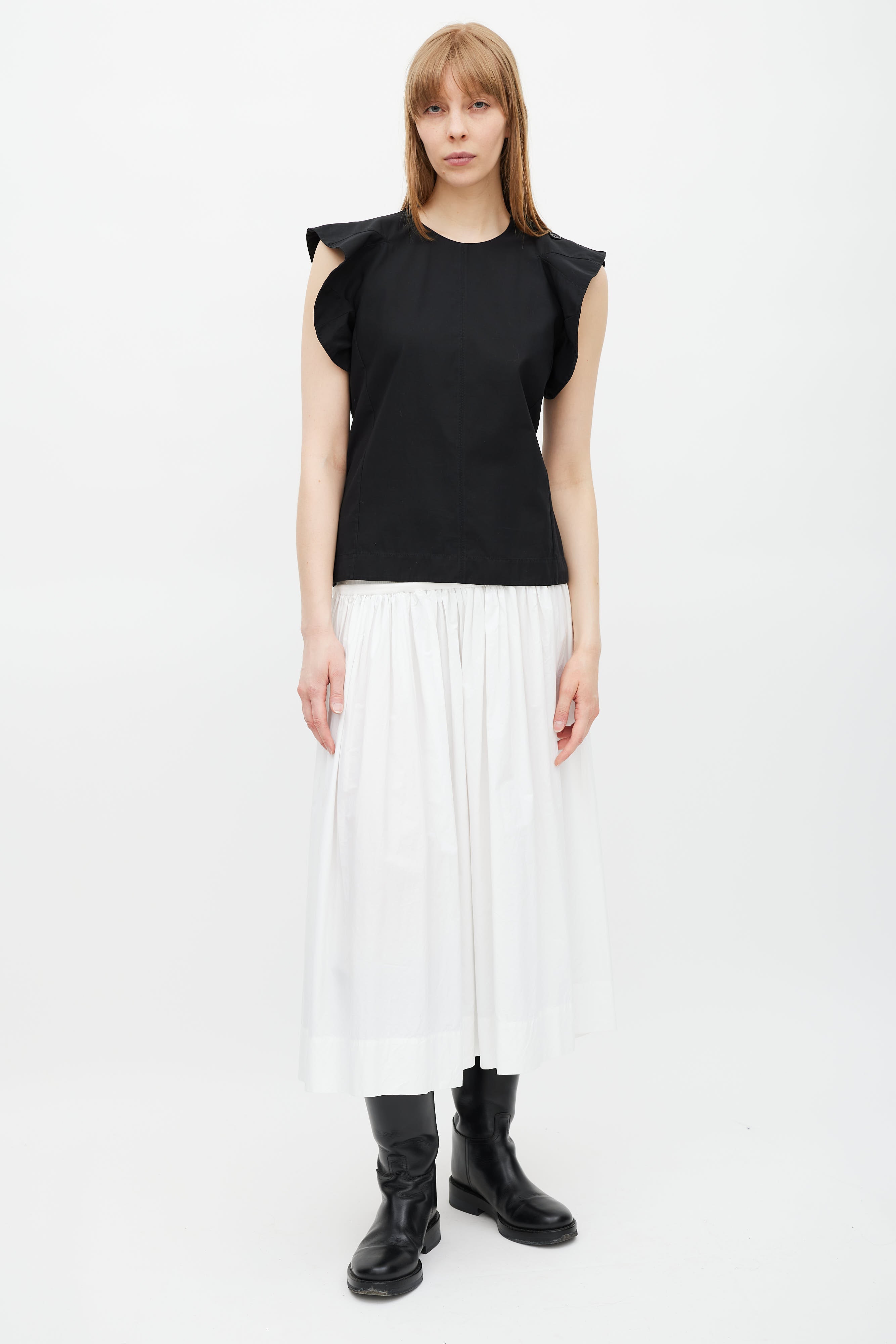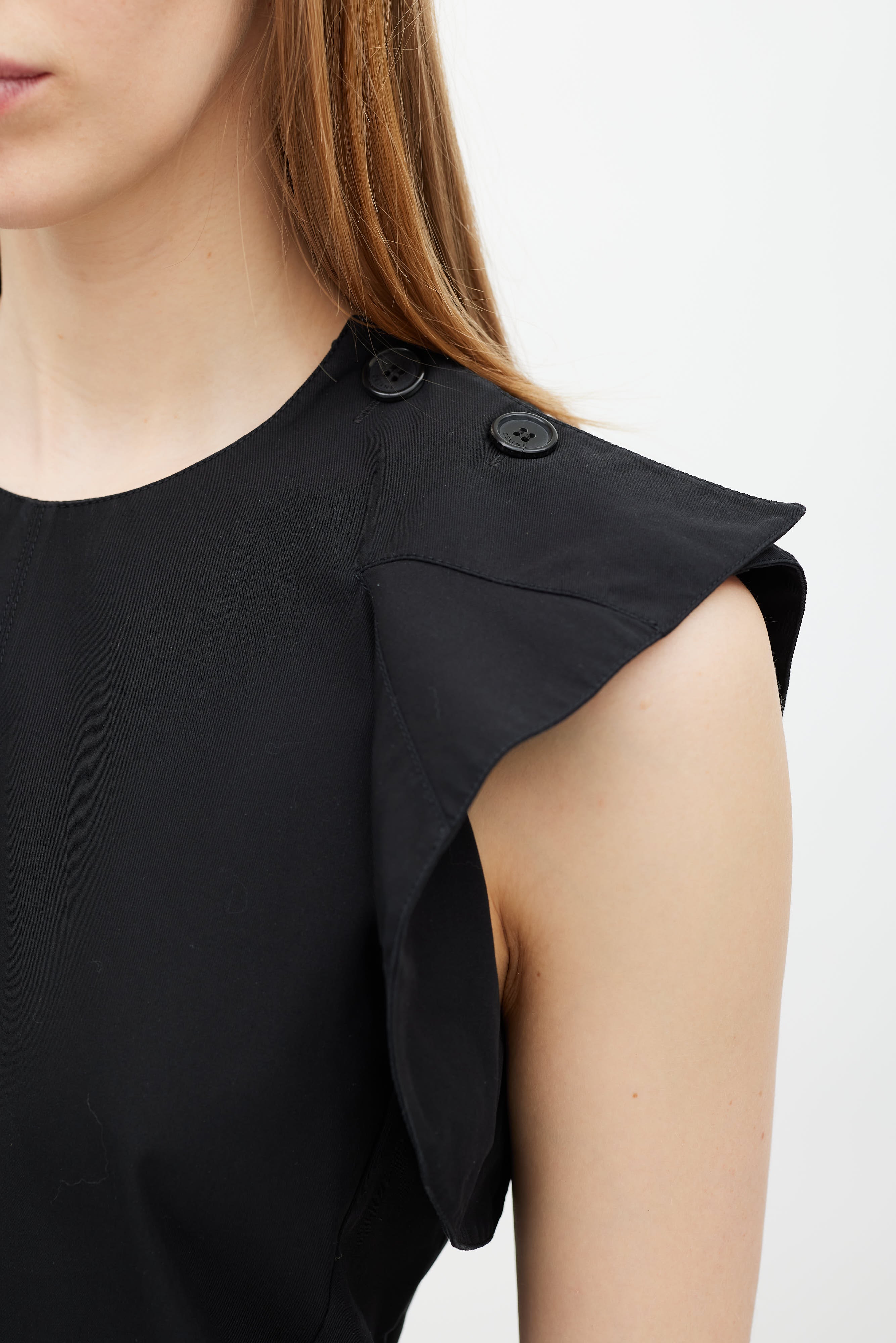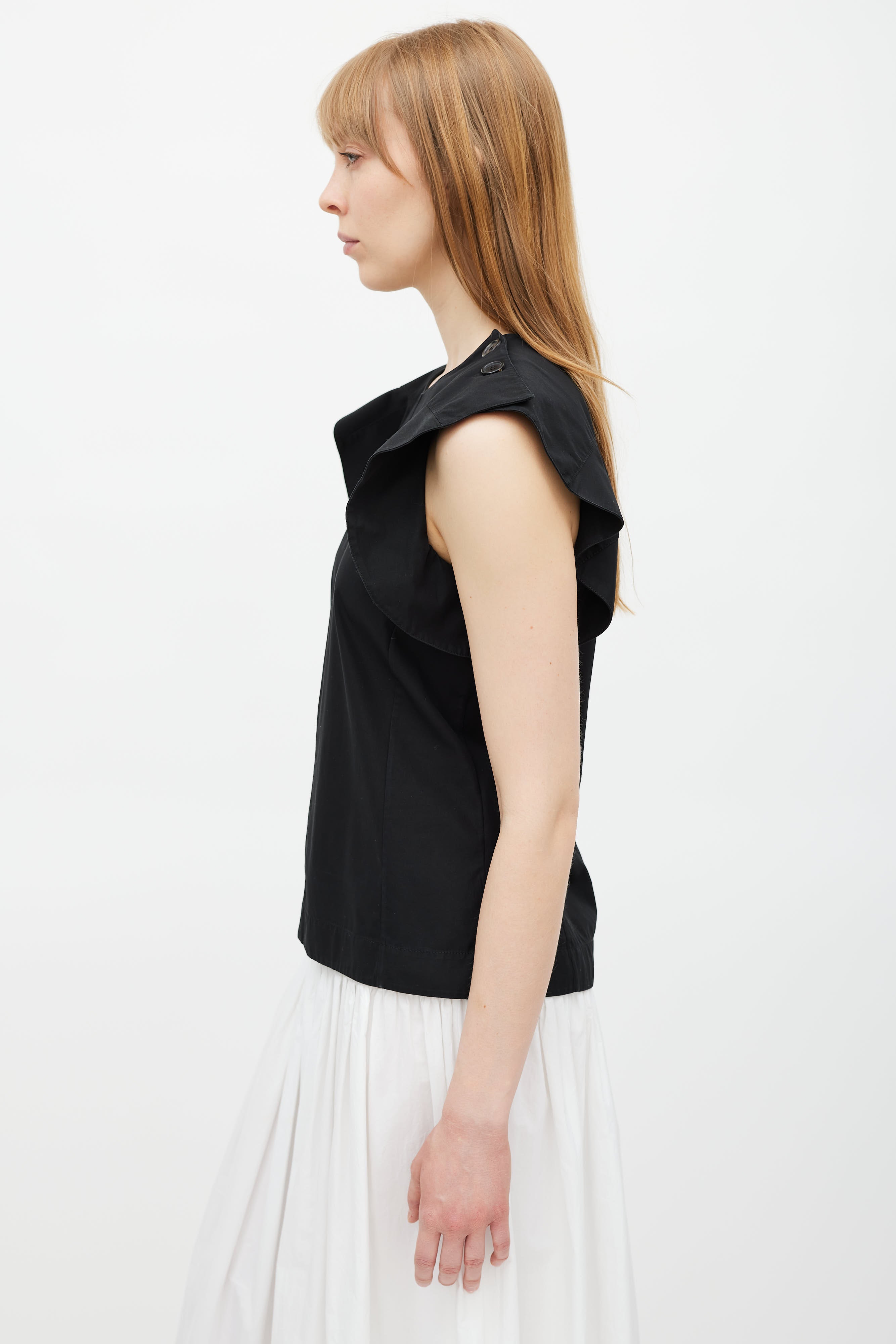 Pre-owned Celine black top featuring a round neckline, cap sleeves with ruffled trim, button detail at shoulder, and zip at back with hook and eye closure. Phoebe Philo era design.