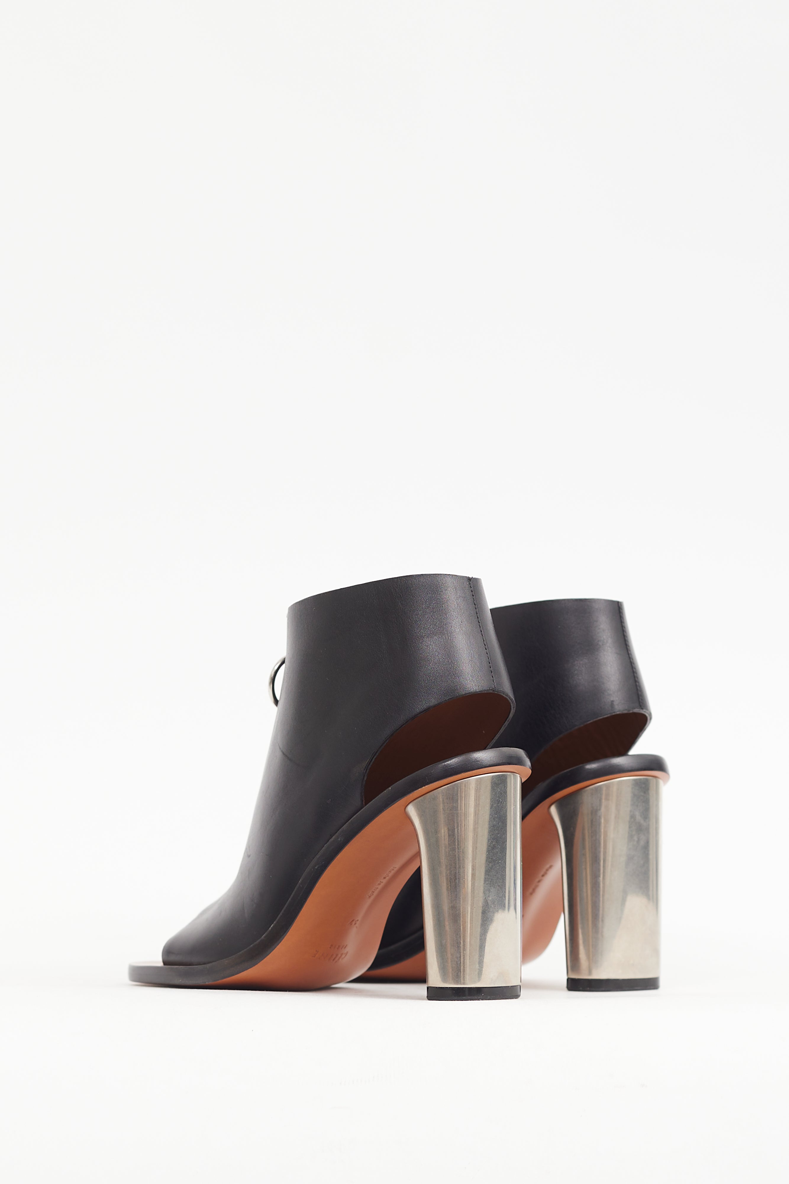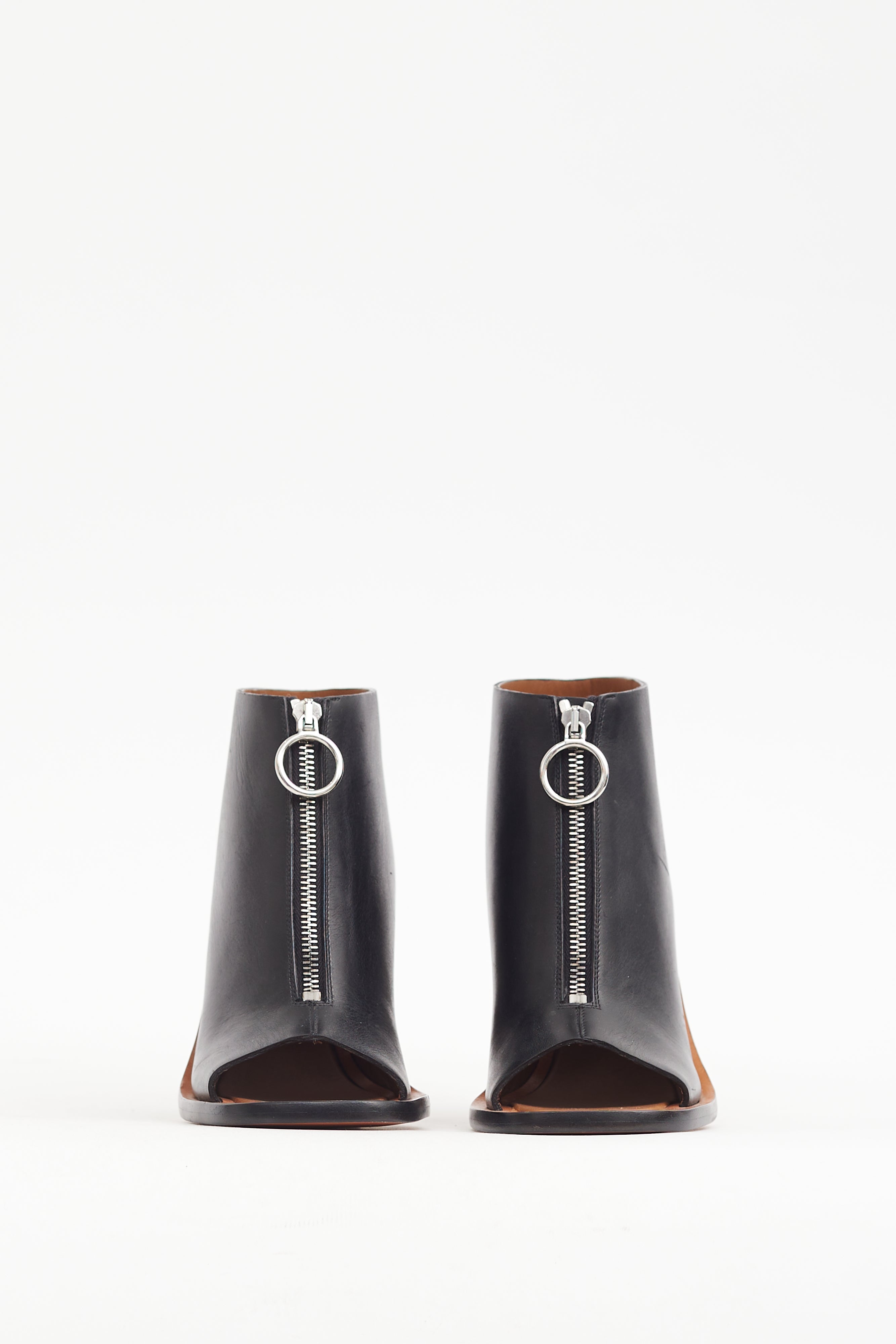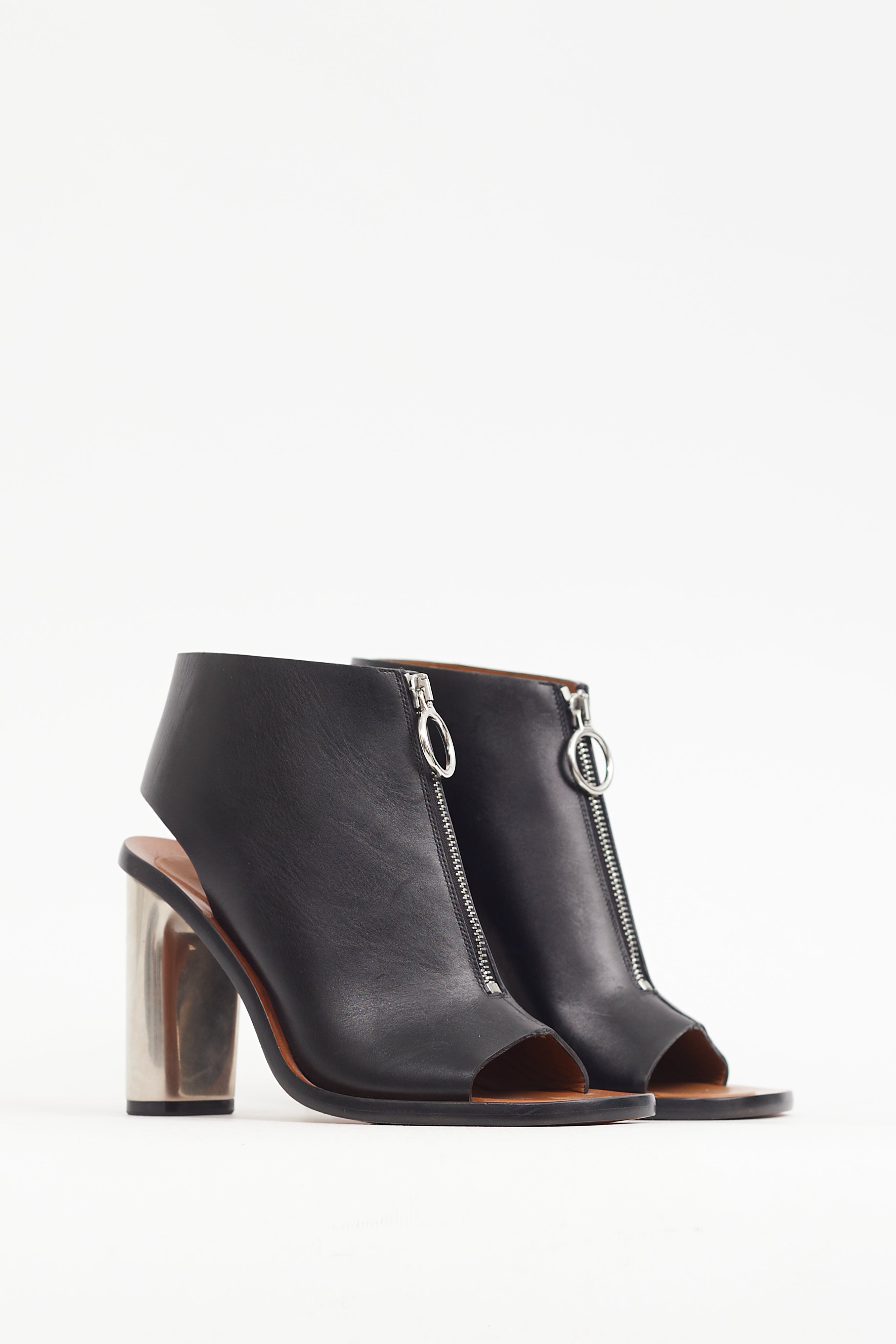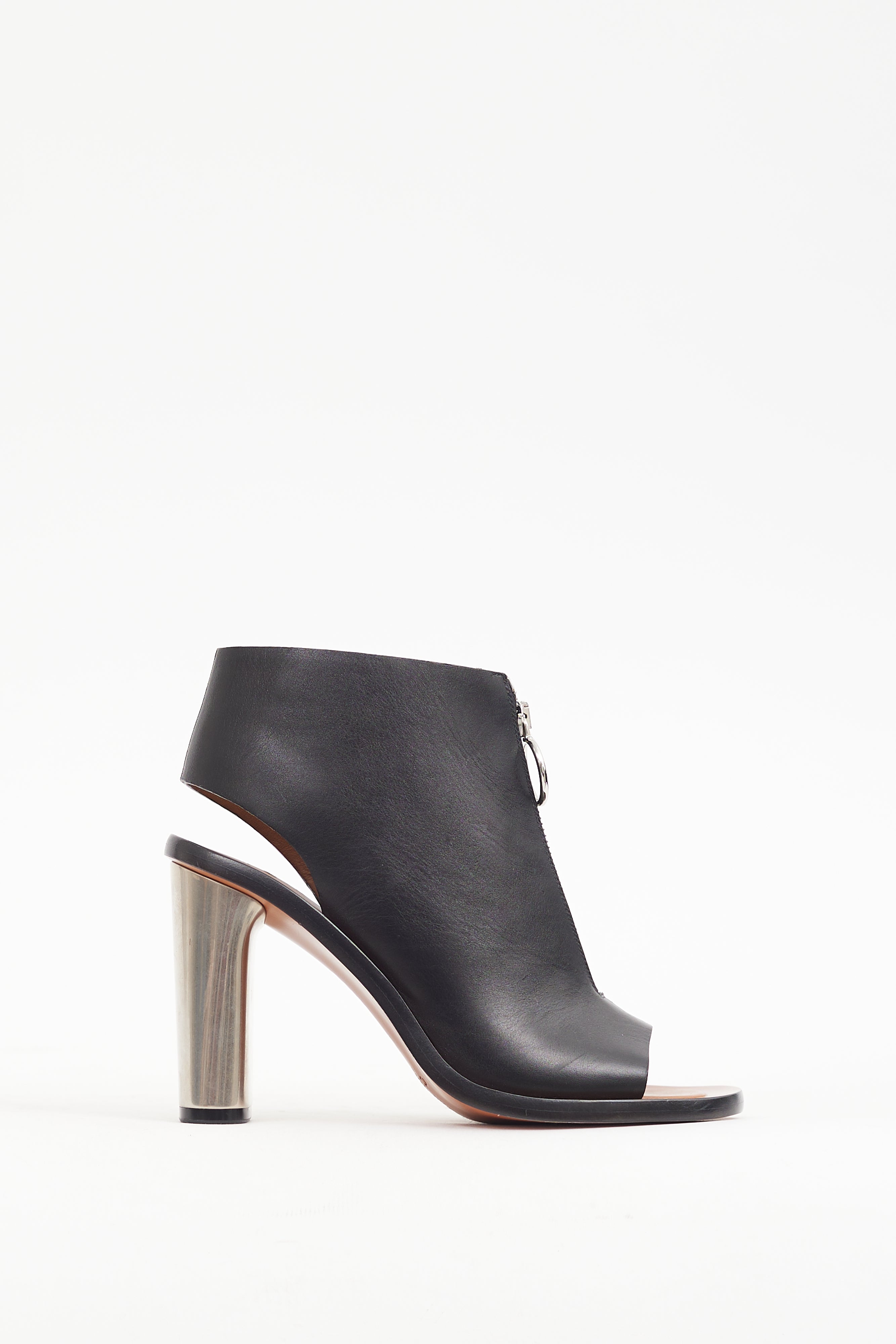 Pre-owned Celine black boots featuring an open squared toe, leather uppers, silver tone front zip closure with ring pull tab, cutout at heel, and brushed silver tone block heel.