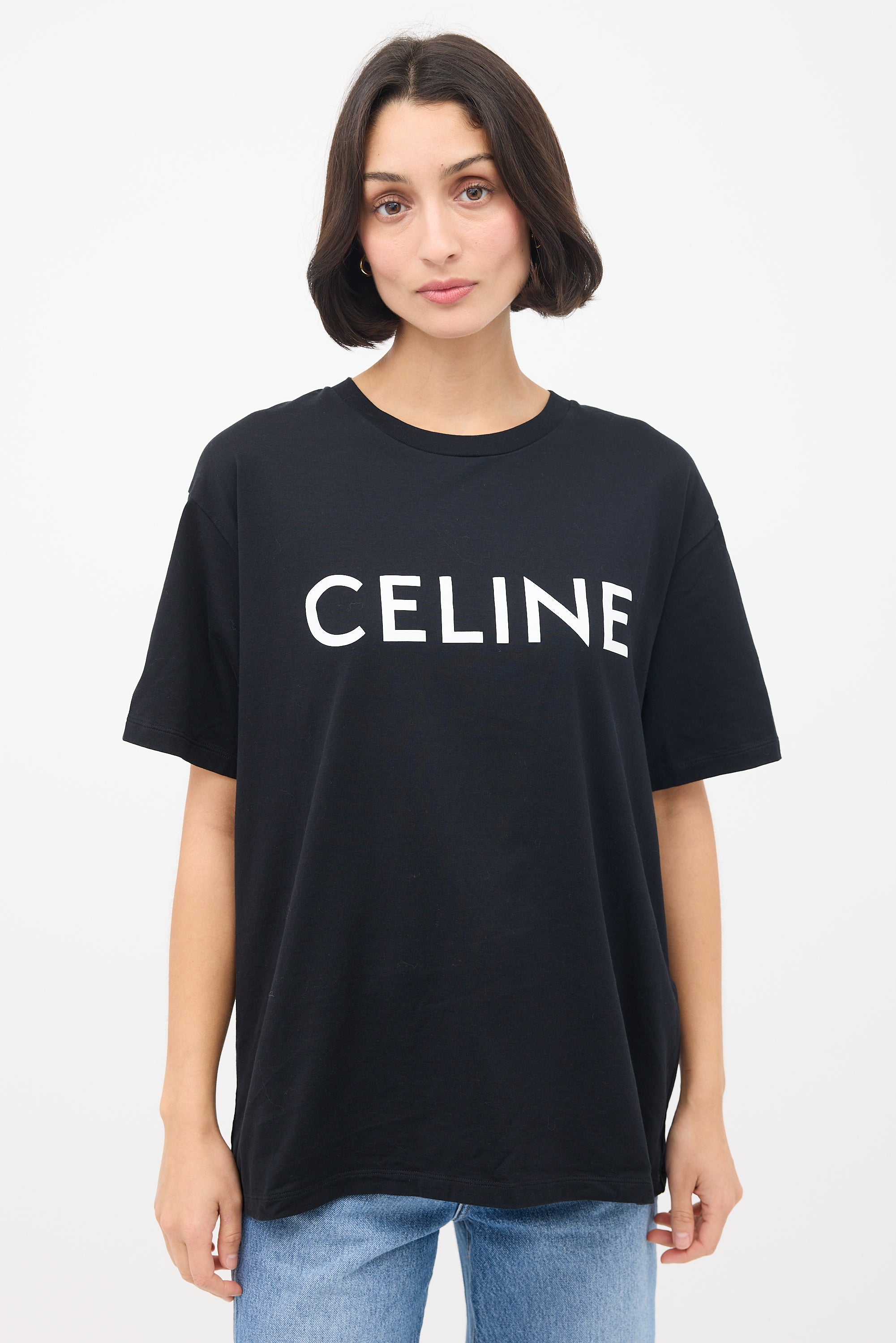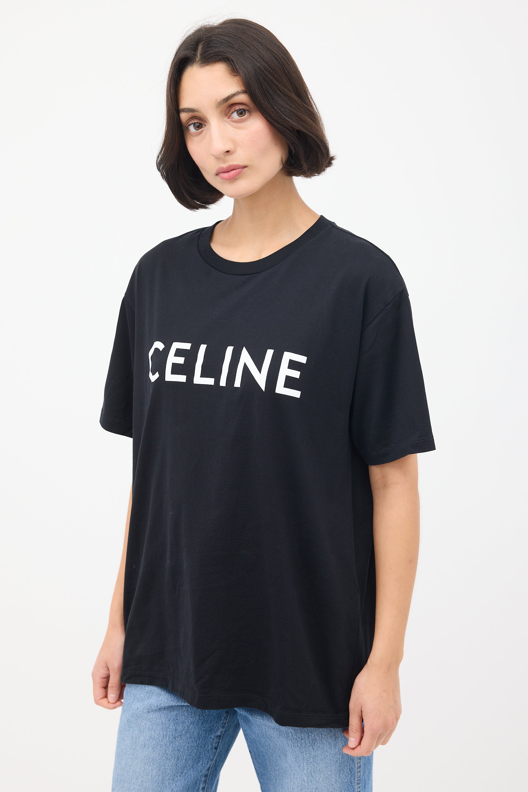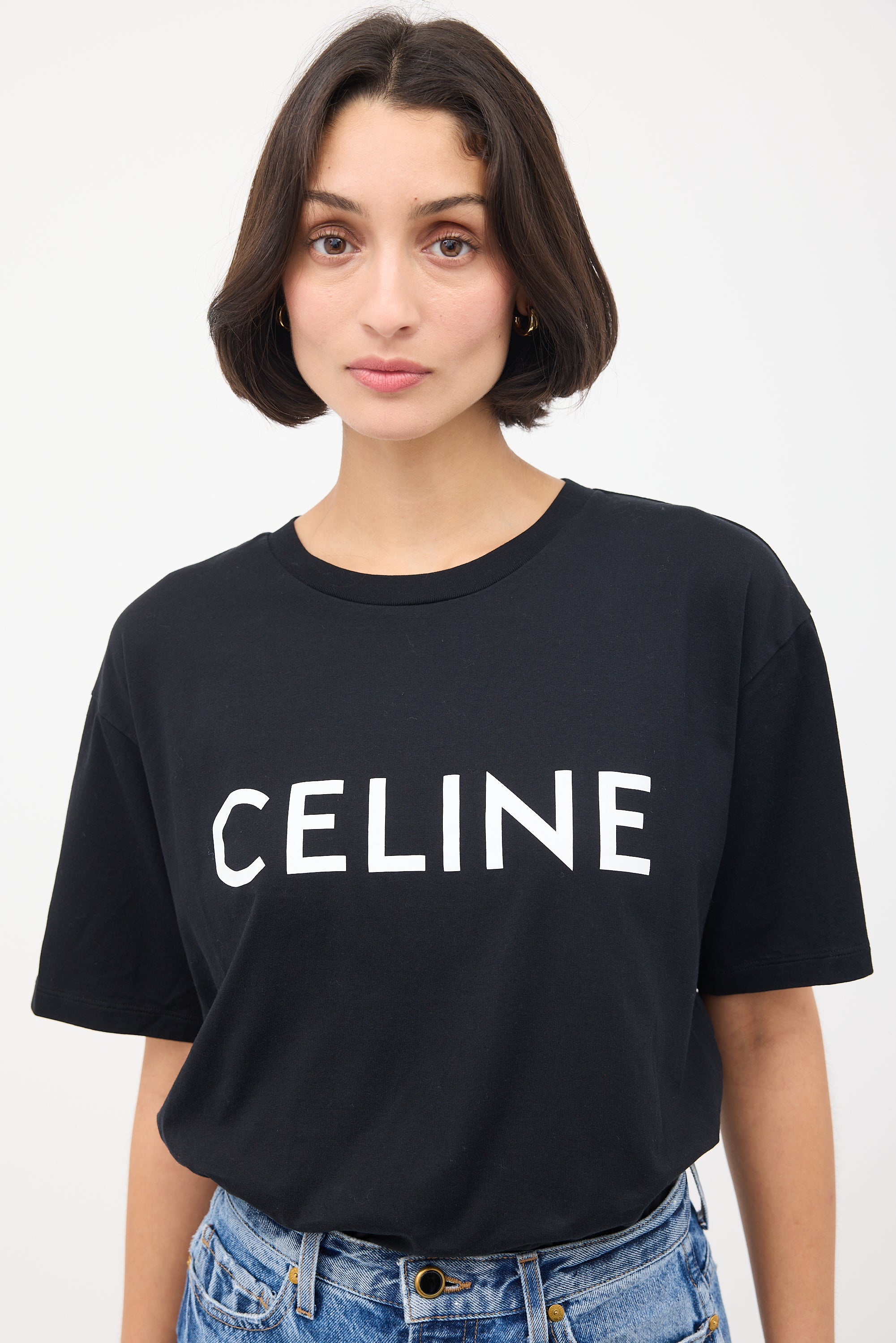 Pre-owned Celine black T-shirt featuring a round neckline, white print logo across chest, even hem, and short sleeves.
