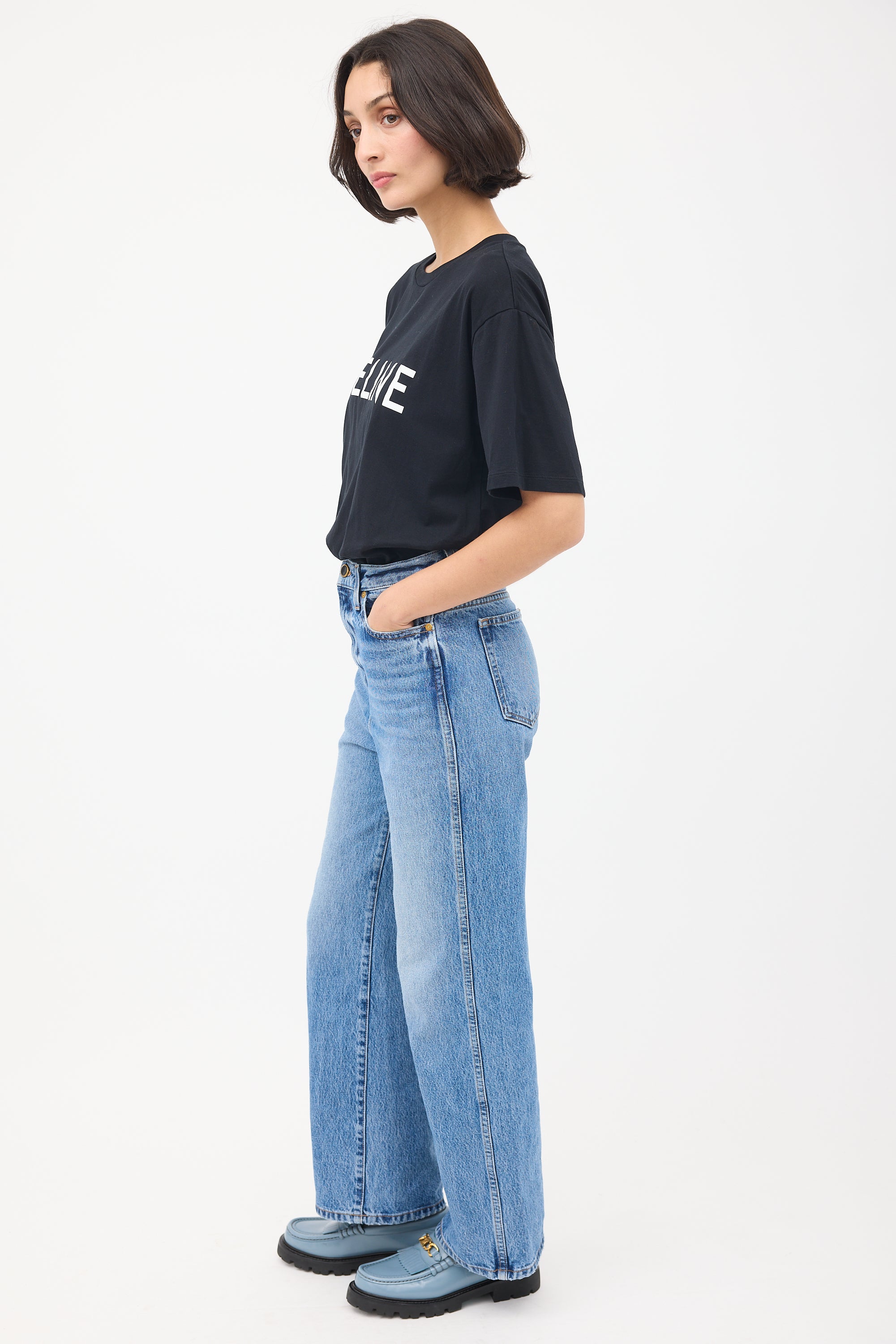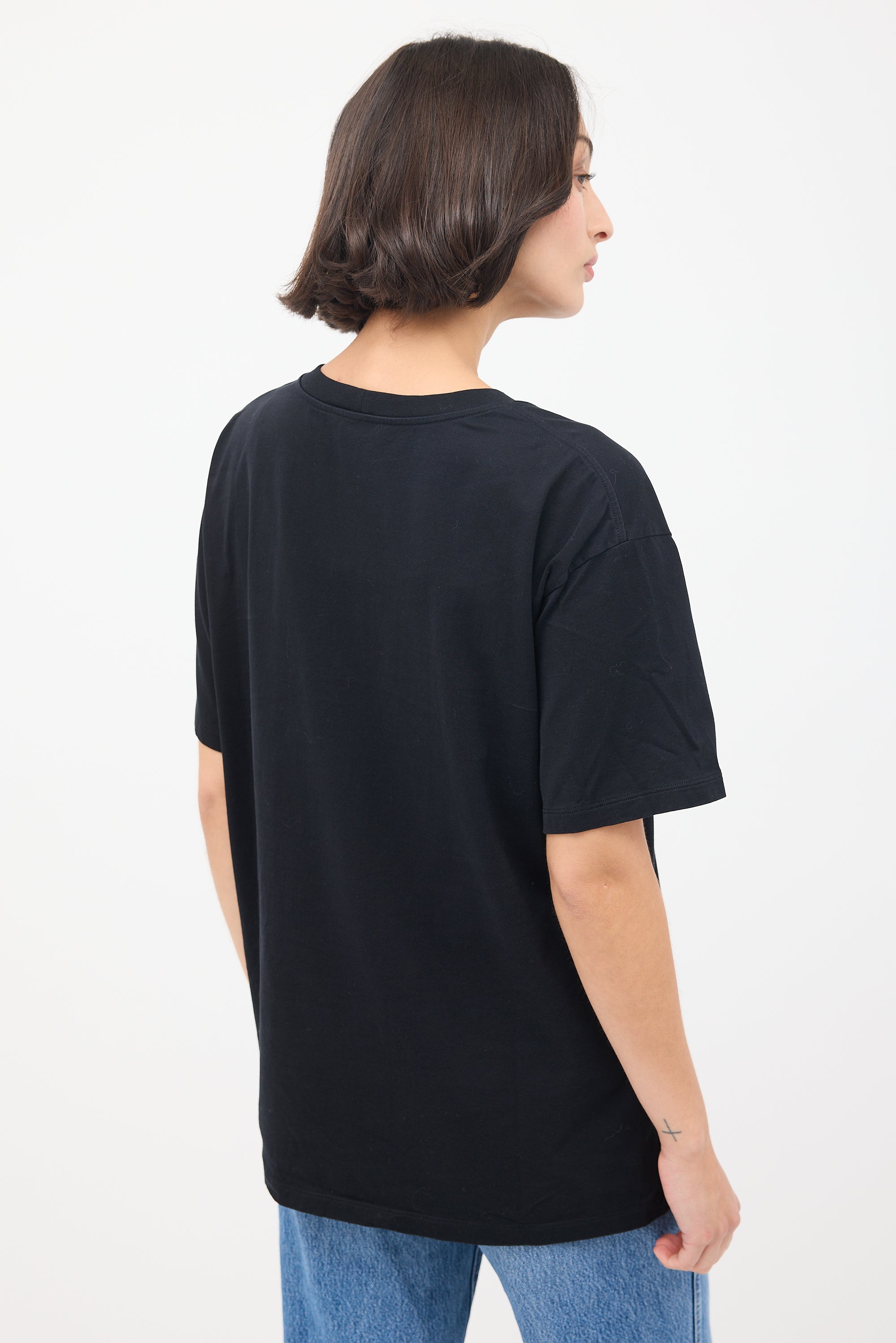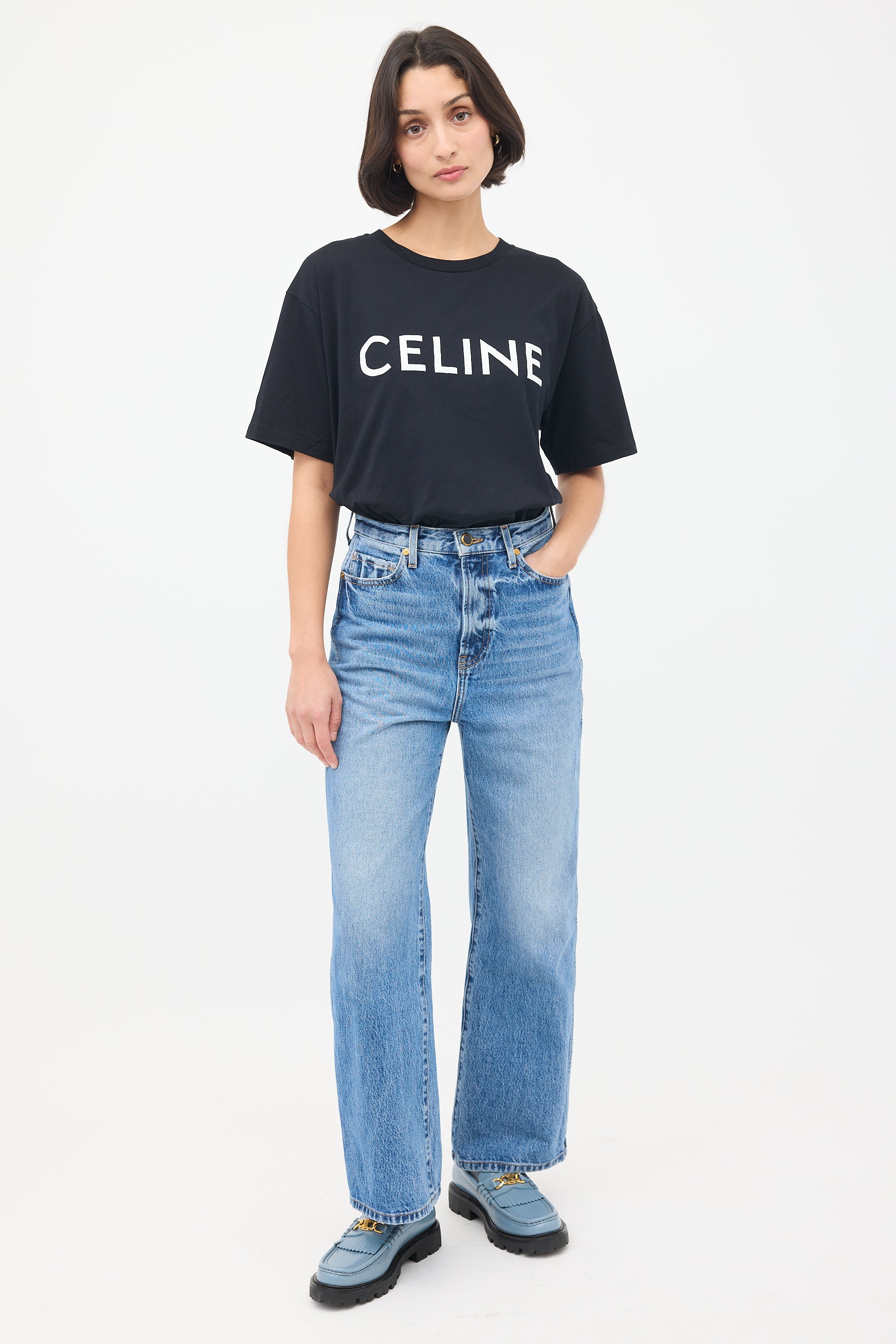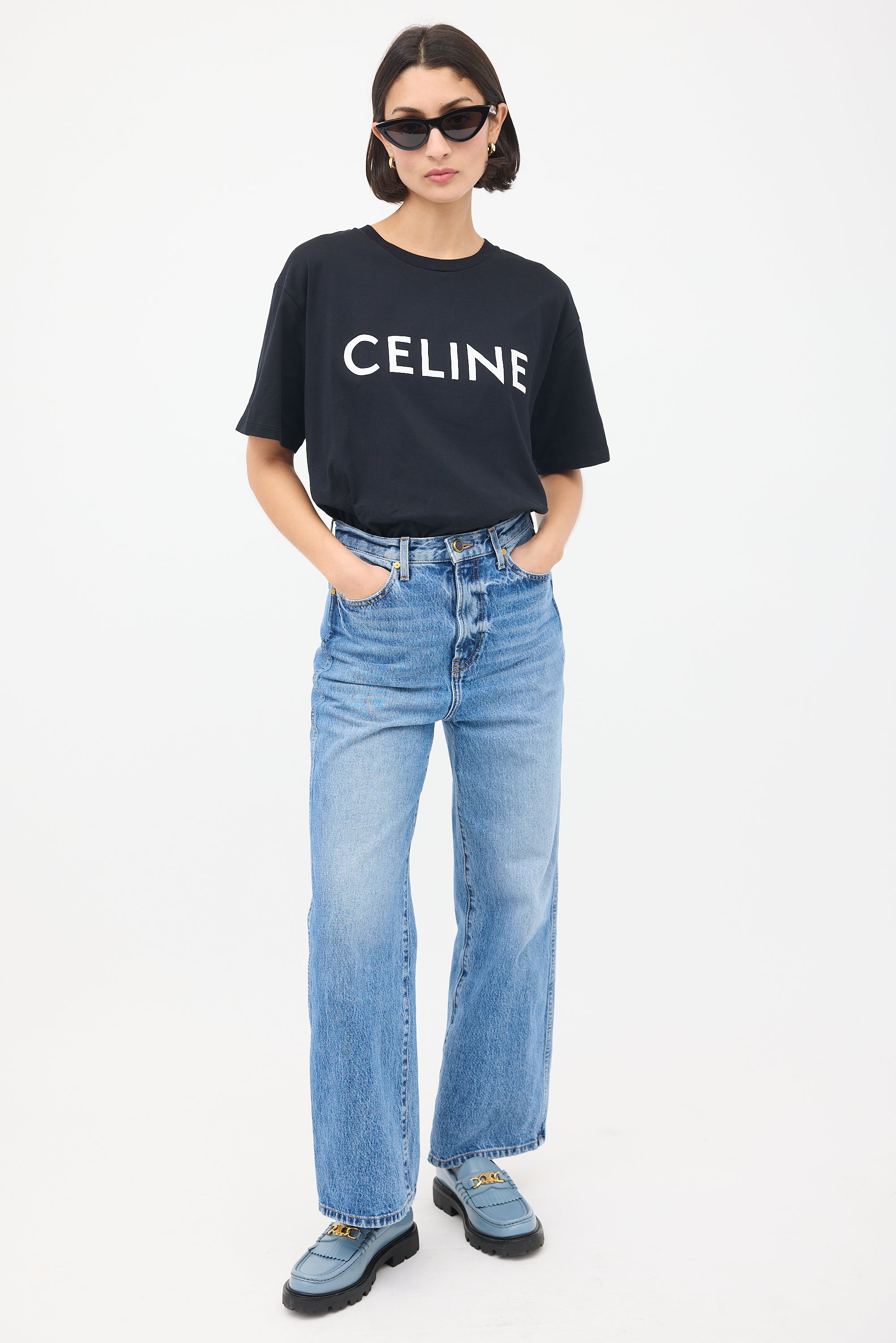 Pre-owned Celine black T-shirt featuring a round neckline, white print logo across chest, even hem, and short sleeves.