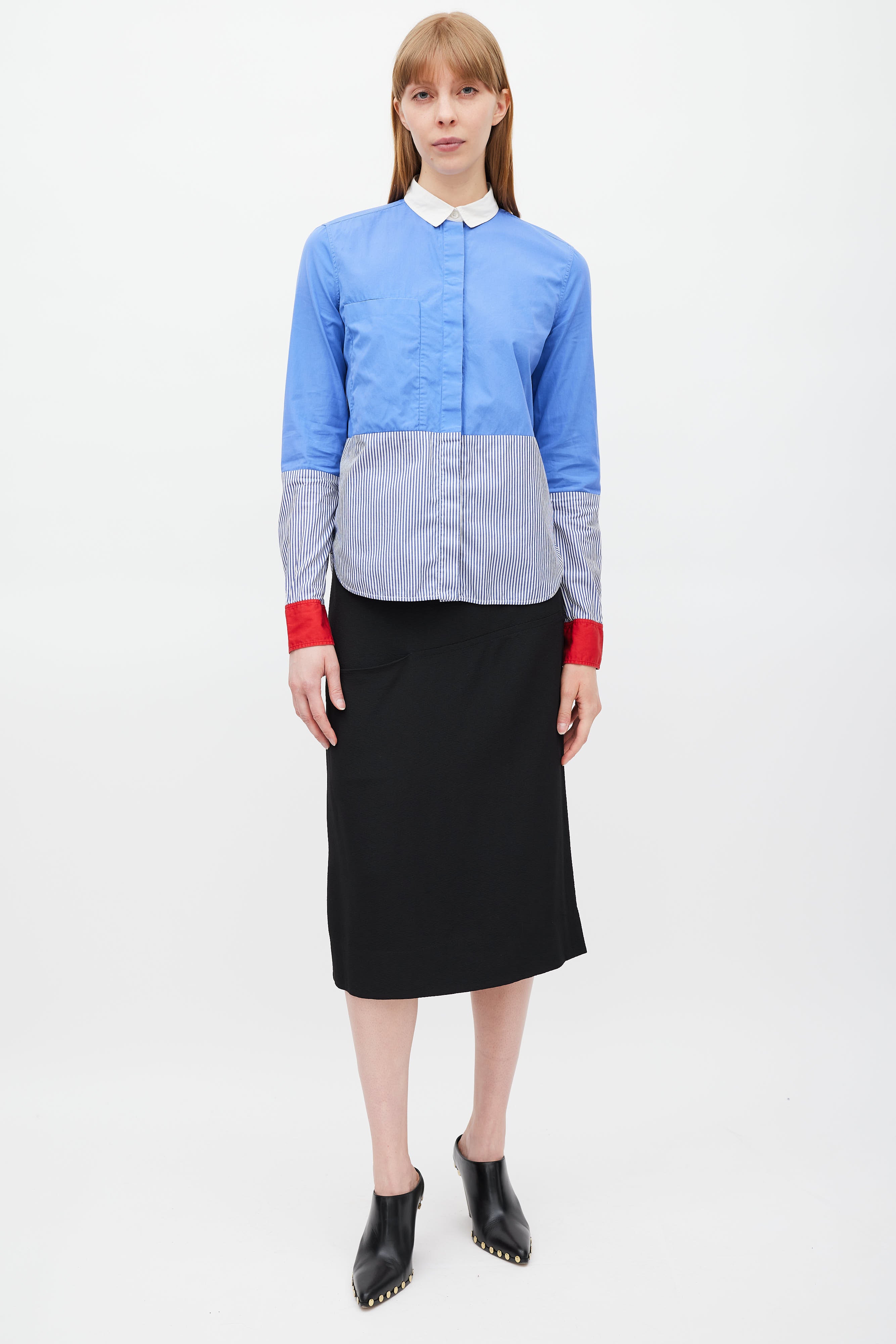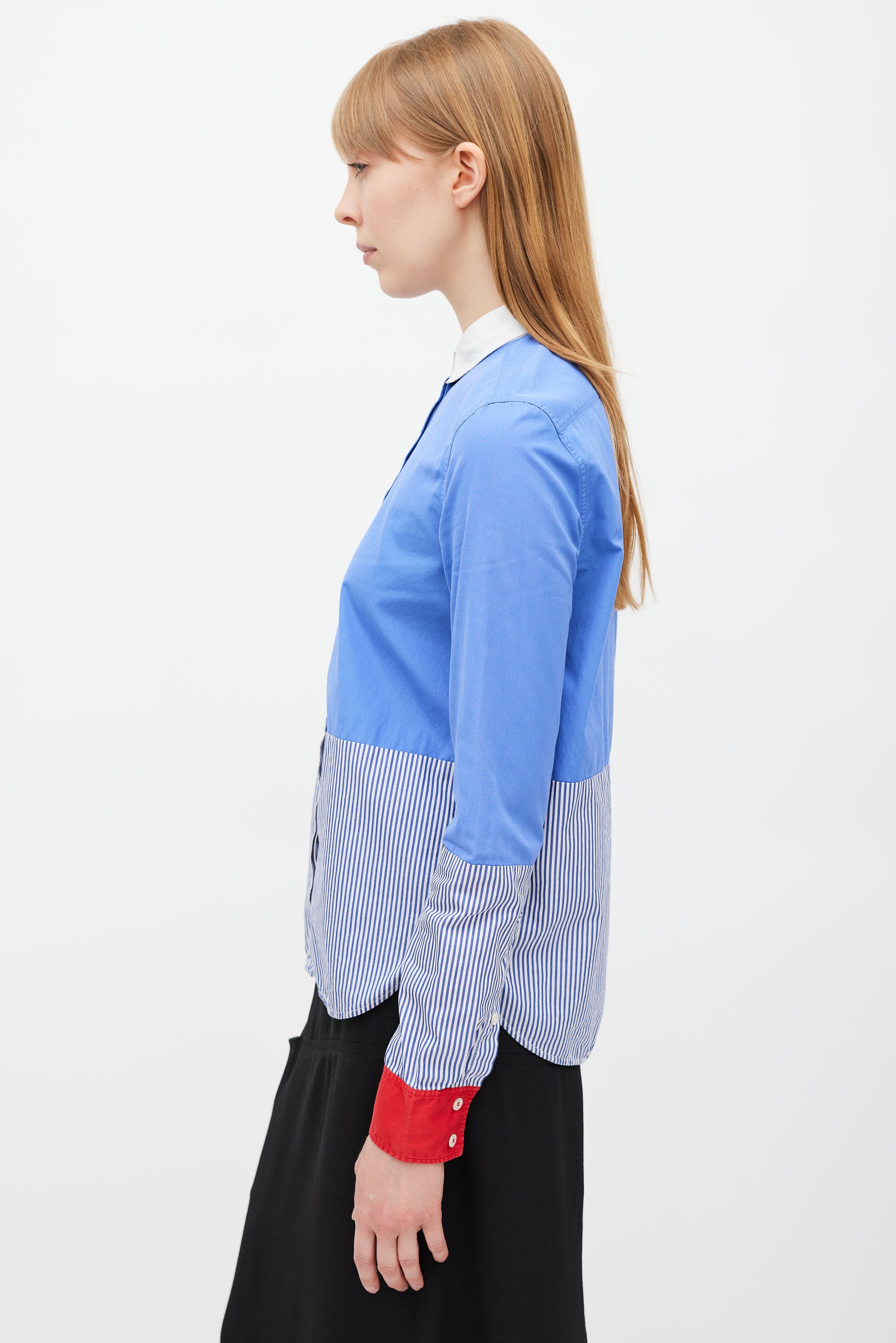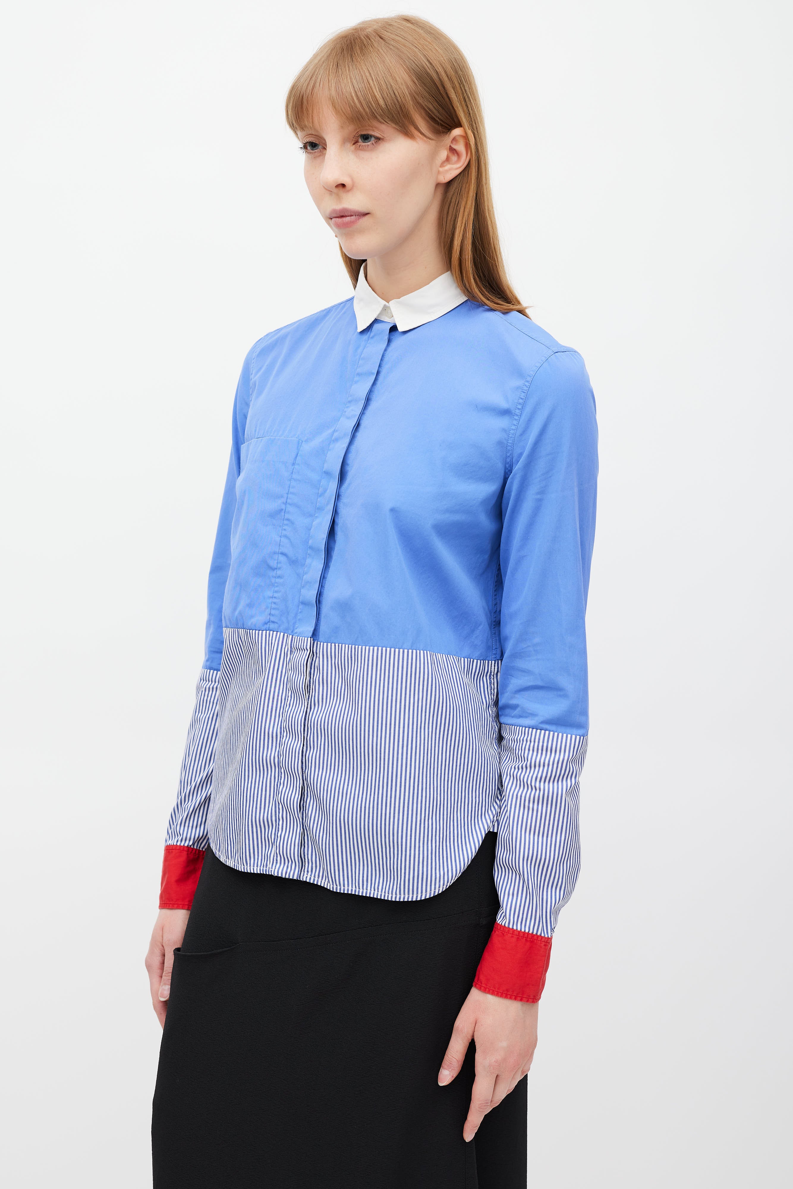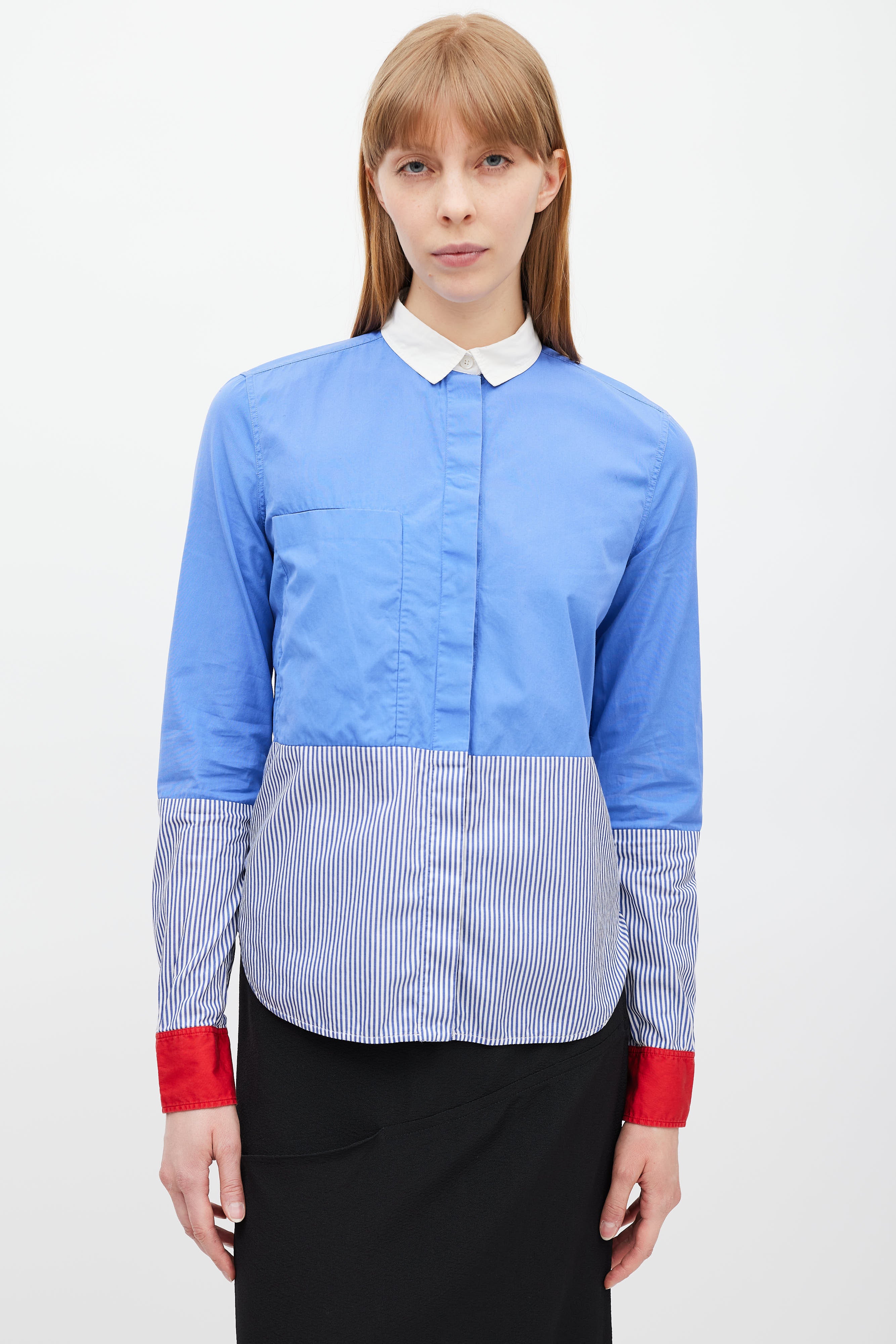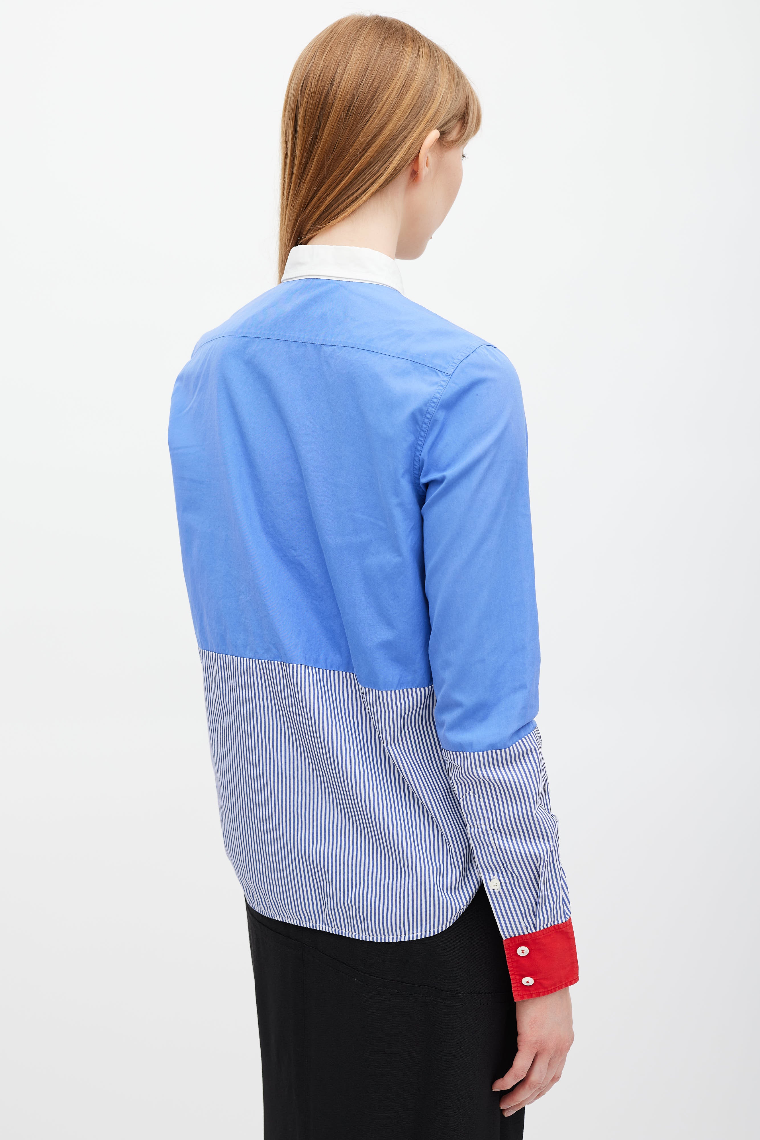 Pre-owned Celine blue shirt featuring a striped pattern throughout, pointed collar, multicolour panelled detailing, one patch pocket at chest, and button up closure.
