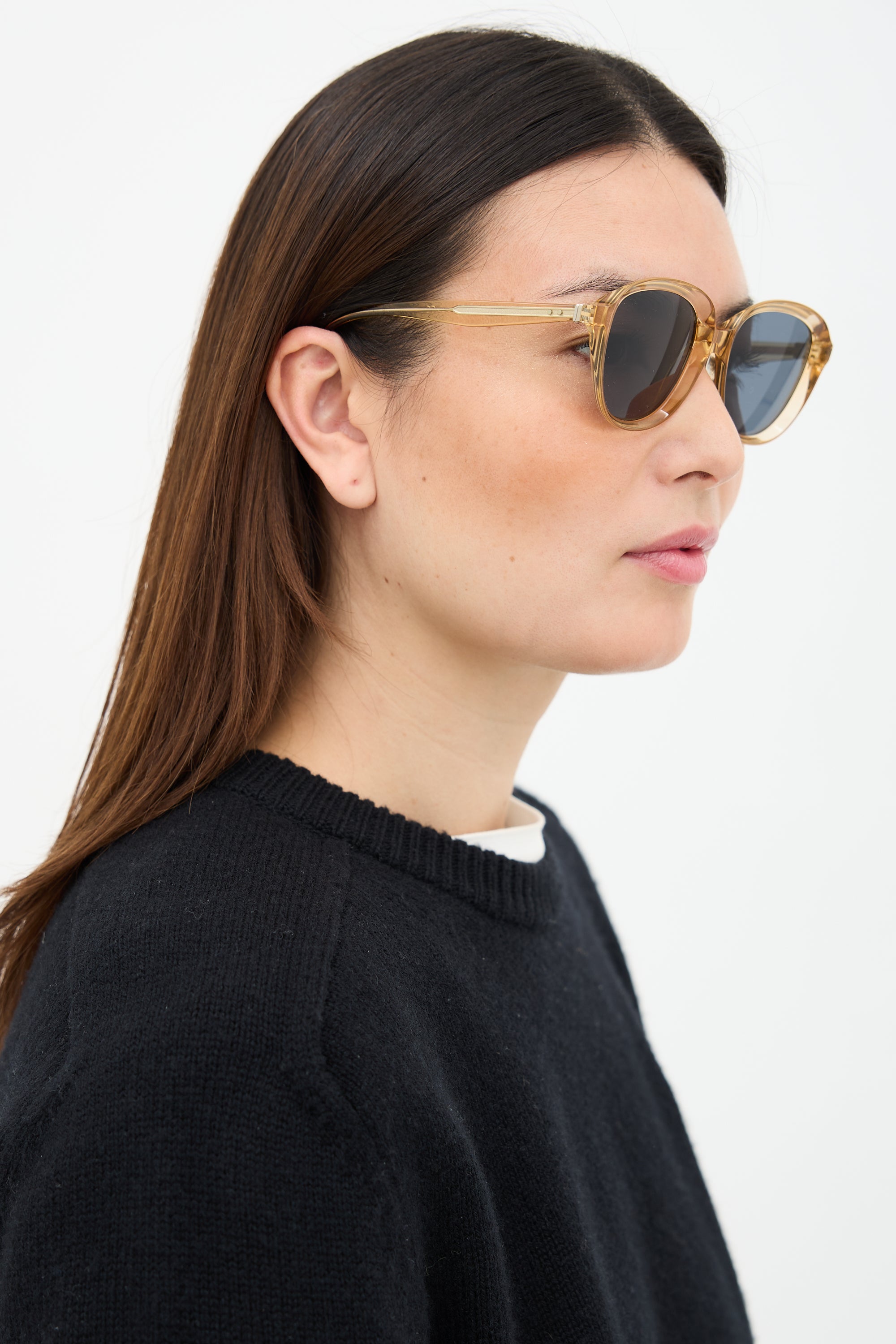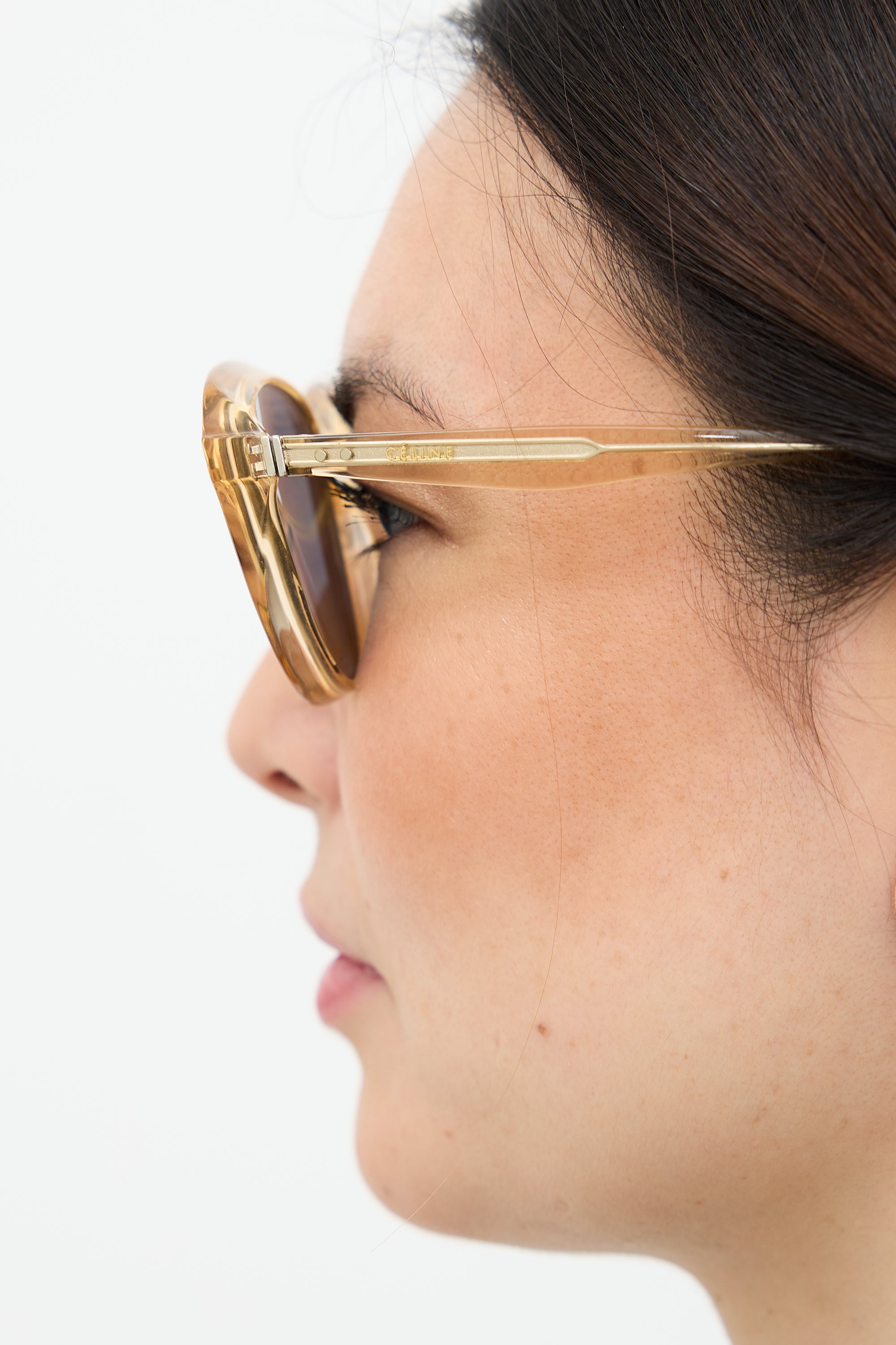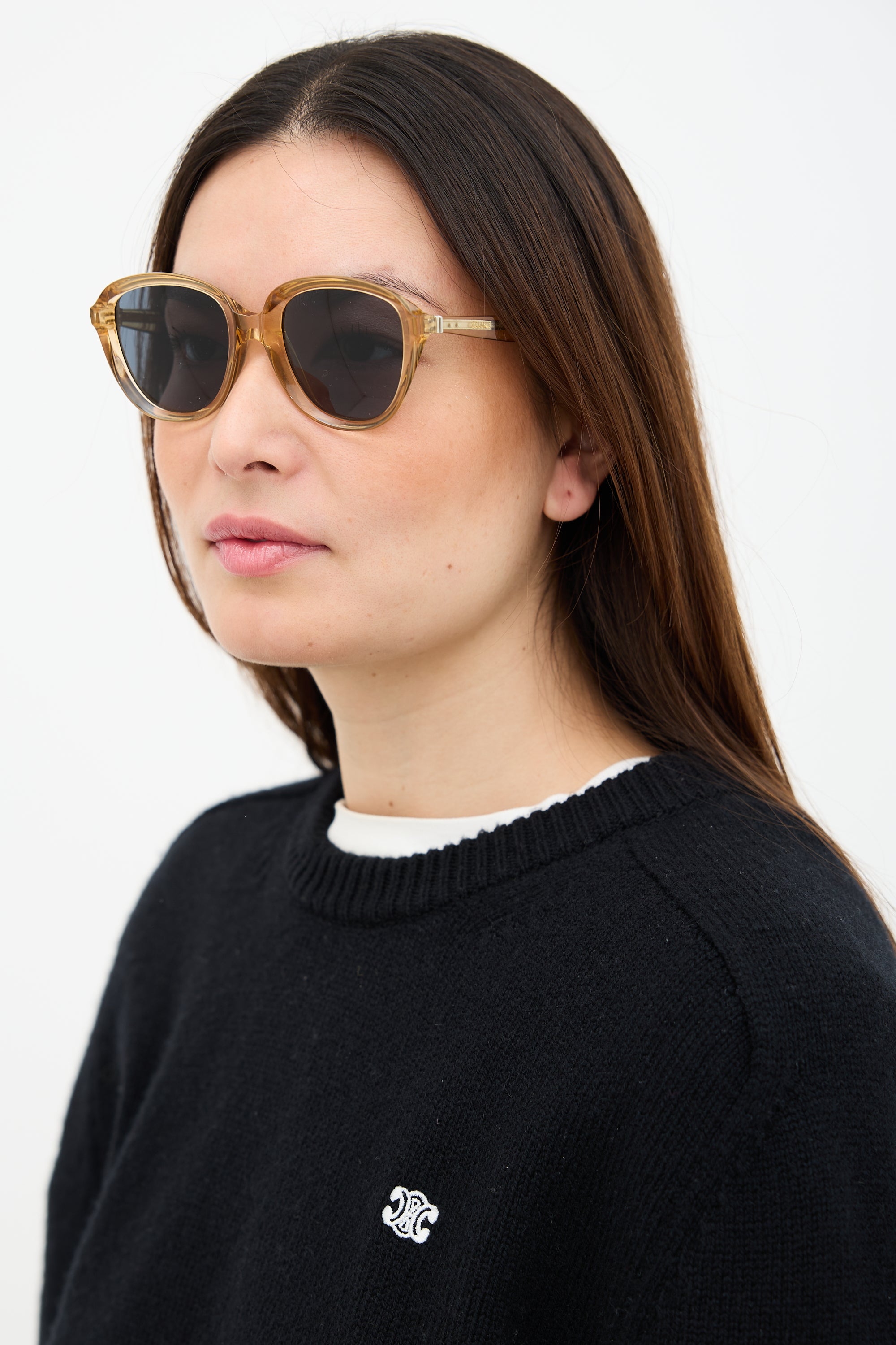 Pre-owned Celine CL41448 sunglasses featuring grey tinted lenses, yellow translucent rounded frame, and inset gold tone logo at left temple. Comes with original sleeve.