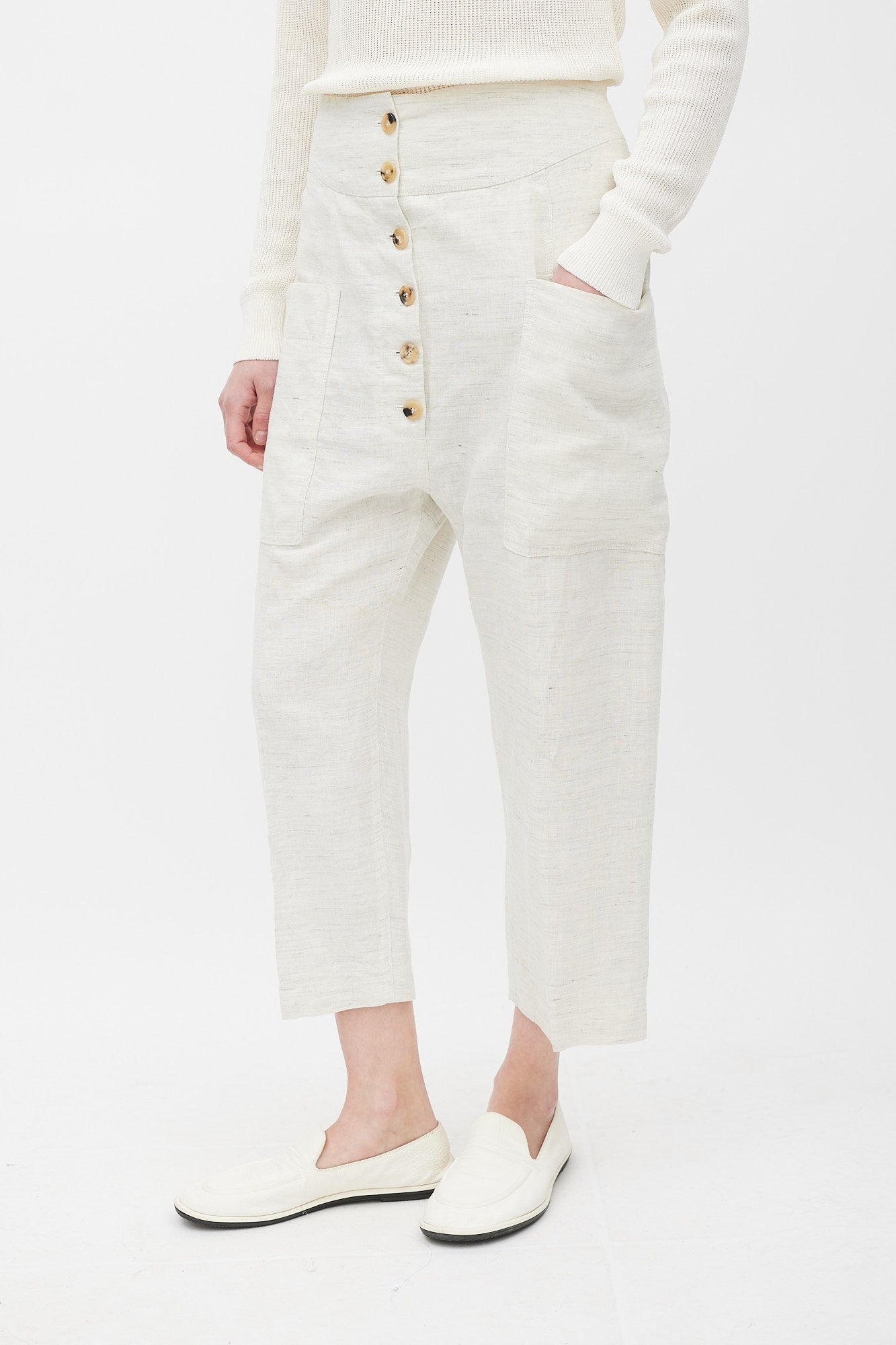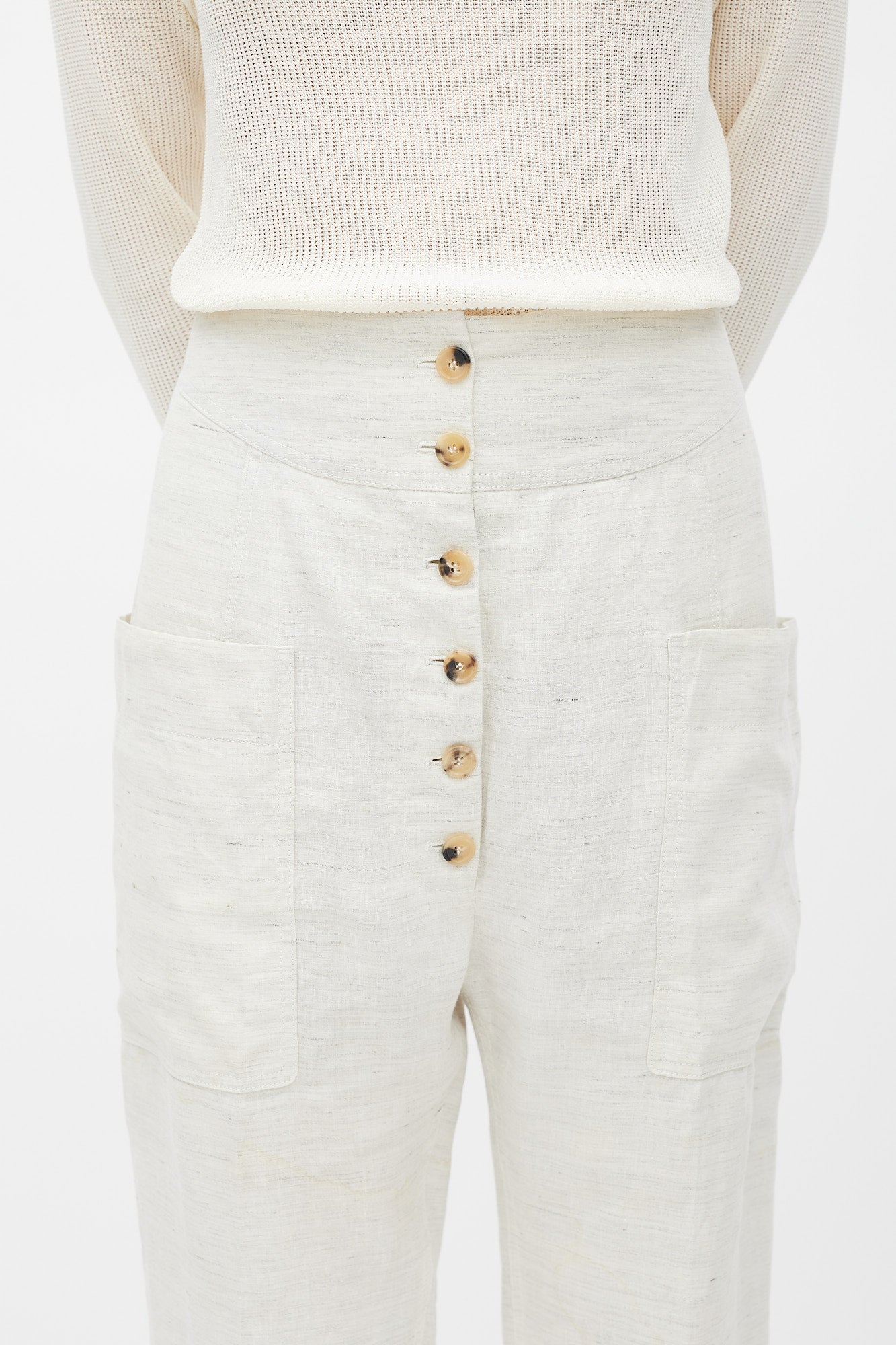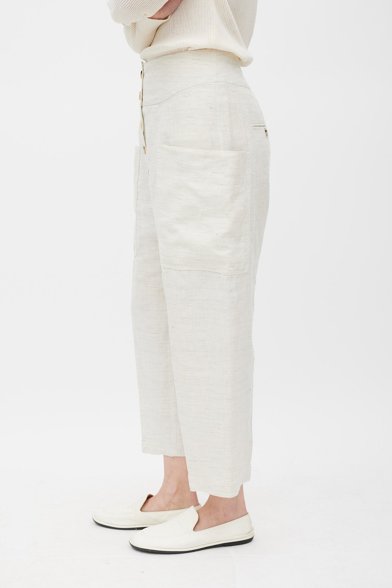 Pre-owned Celine grey linen trousers featuring two patch pockets at hip, two welt pockets at back, cropped leg, and button up closure. Phoebe Philo era design.