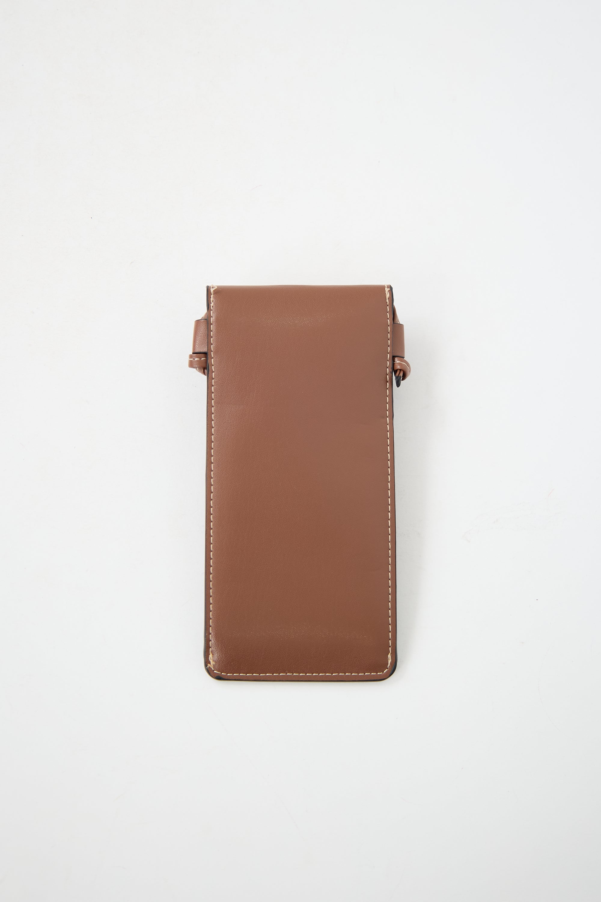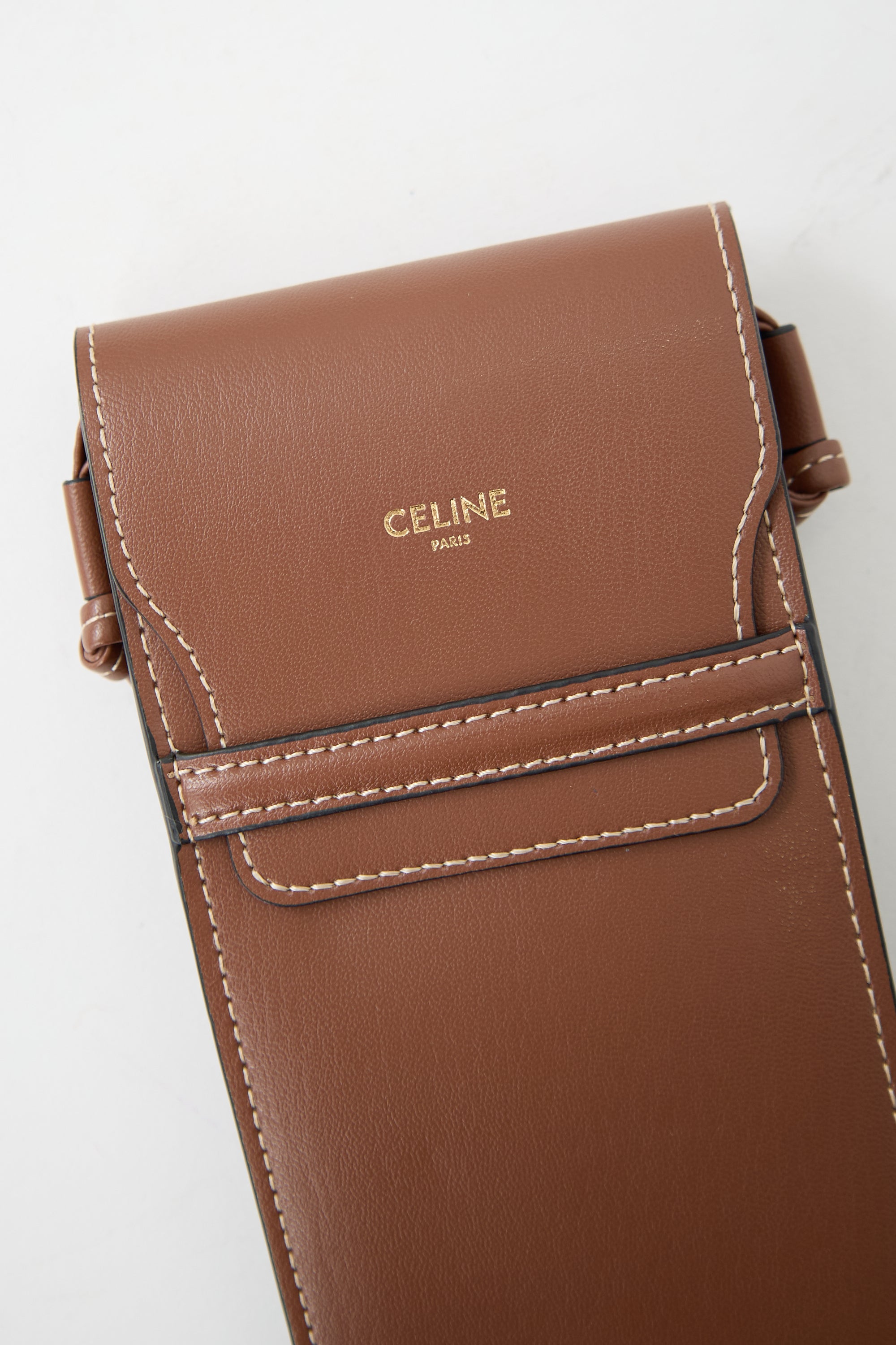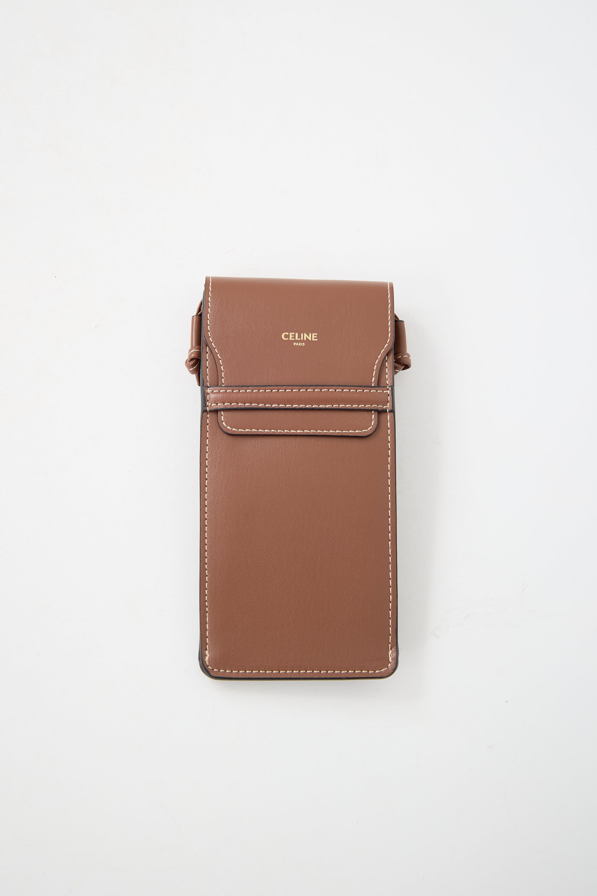 Pre-owned Celine brown leather pouch featuring contrast stitching, front stamped gold logo, flap closure, leather crossbody strap, and suede interior.