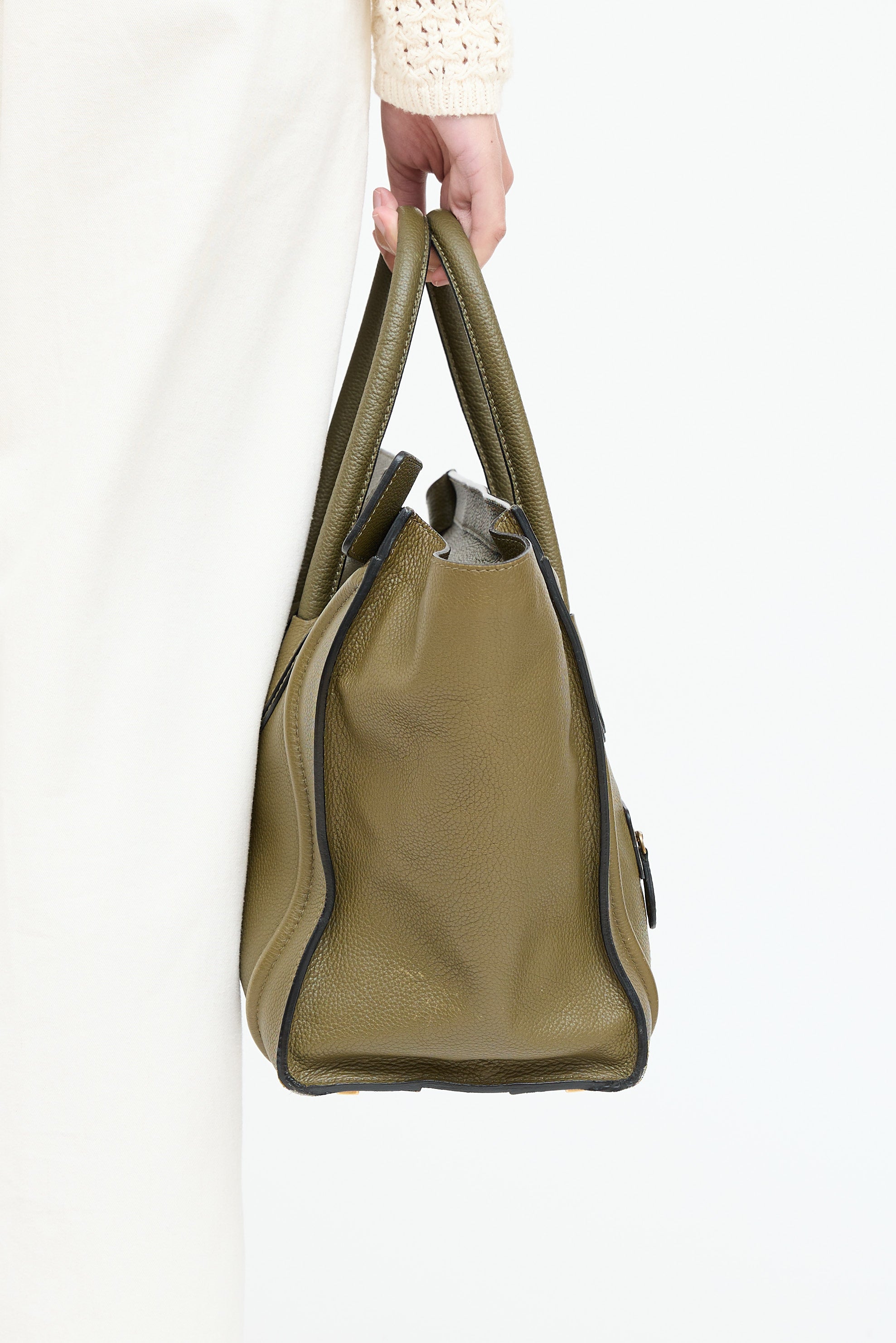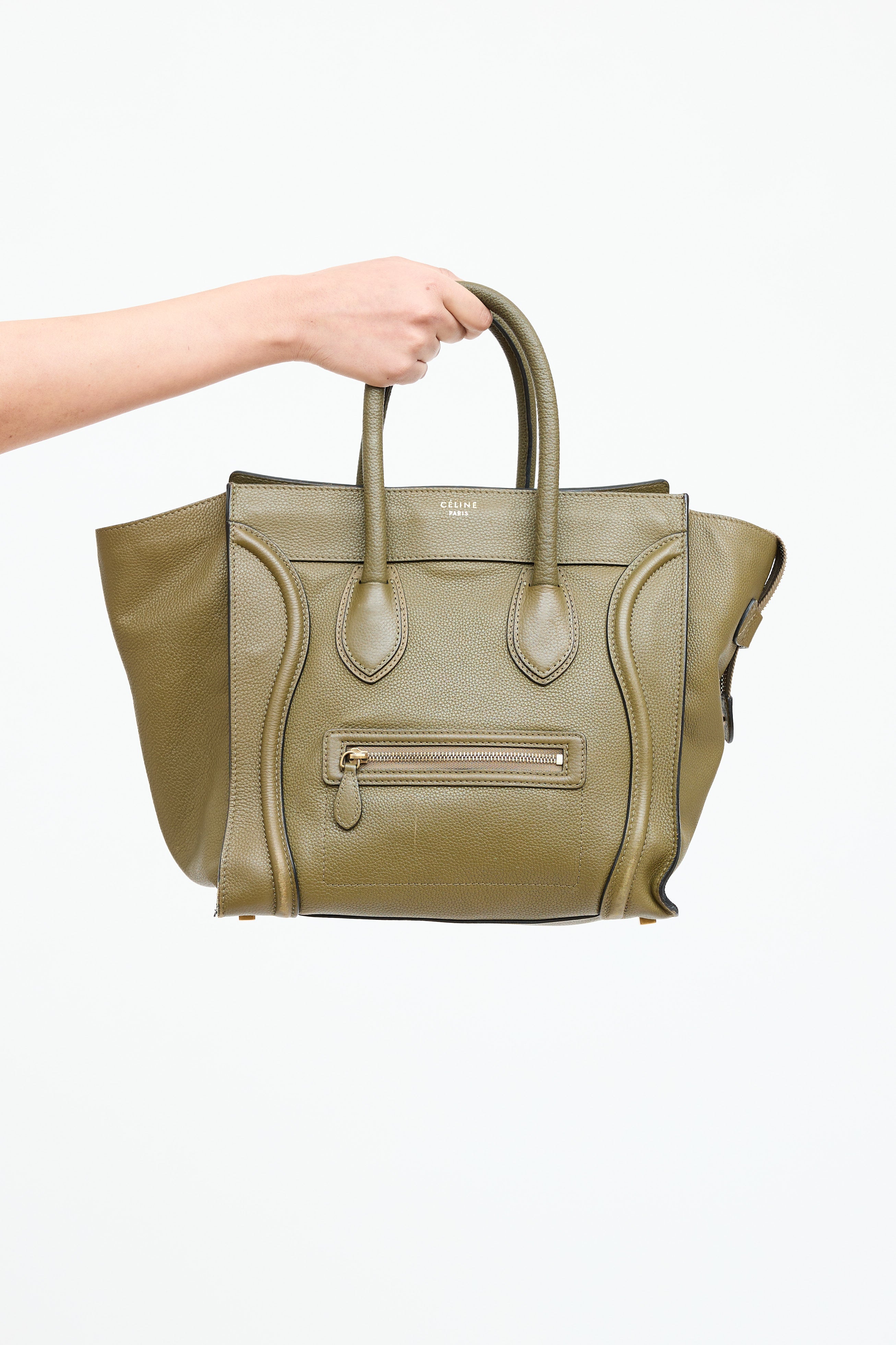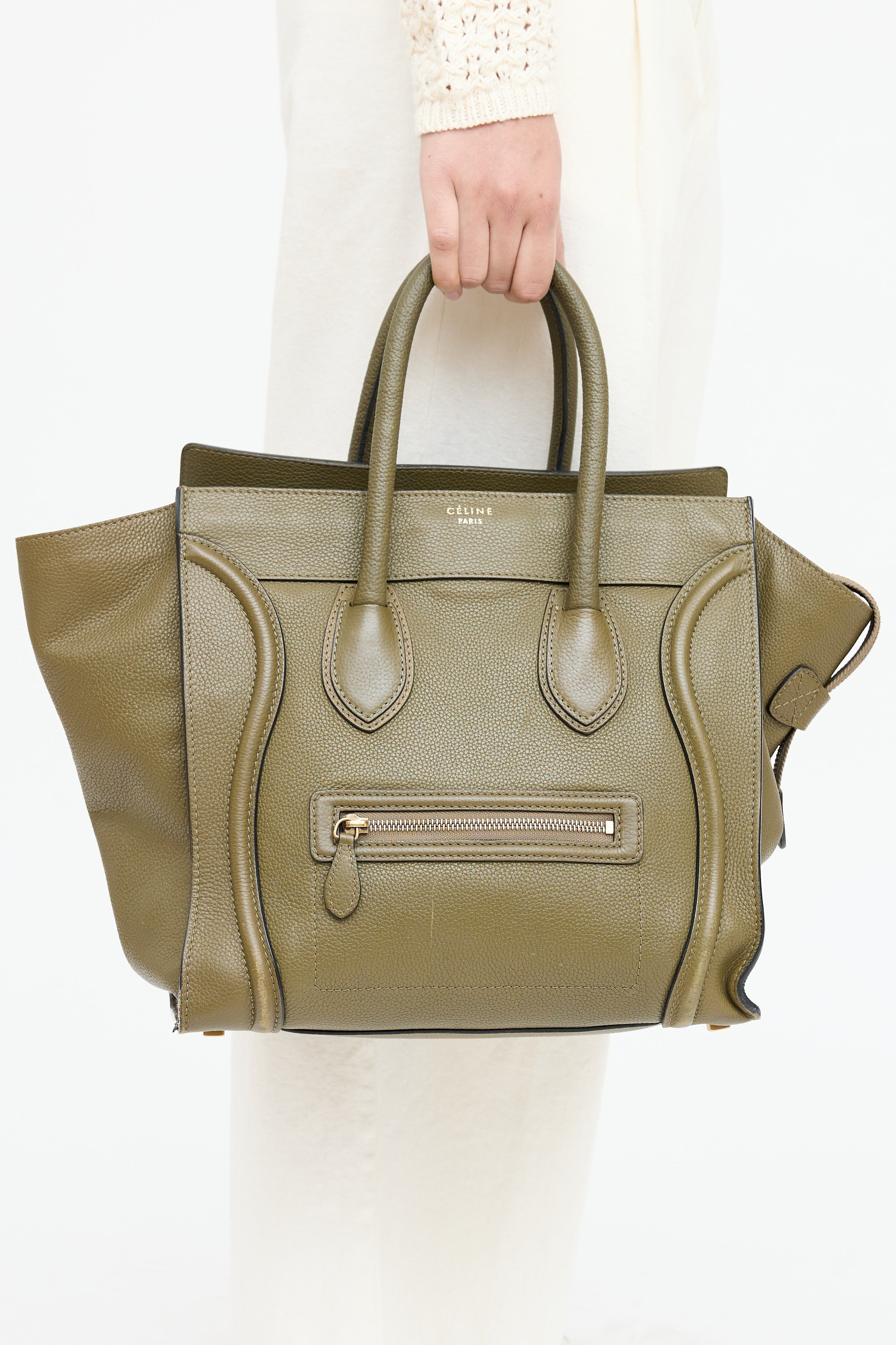 Pre-owned Celine green grained calfskin leather featuring tonal rolled leather handles, zip closure pocket at face, collapsible side gussets, top zip closure, gold-tone hardware and stamped logo at front, square metal feet and one main compartment with tonal interior lining with two slip pockets and zip closure pocket.