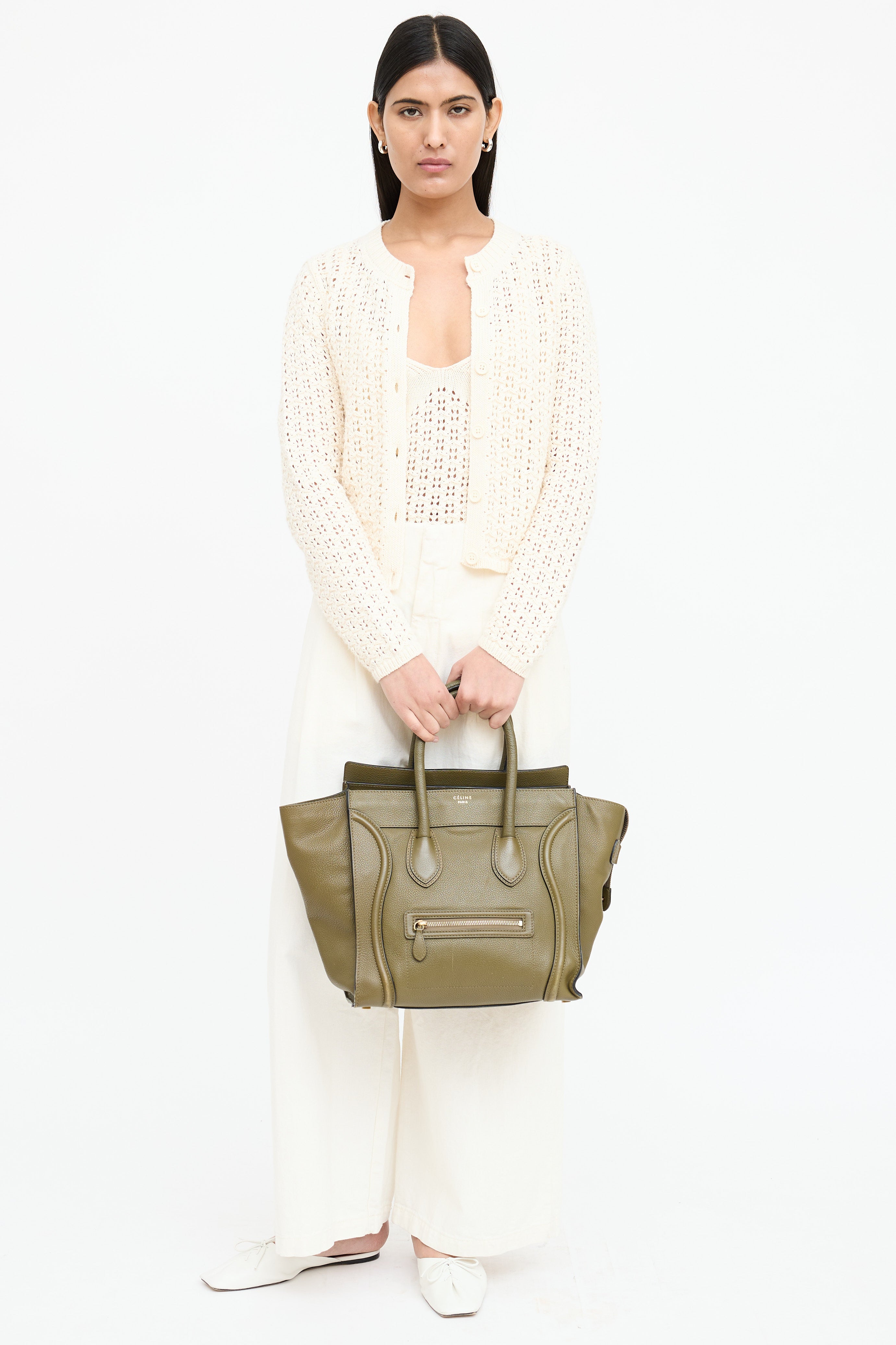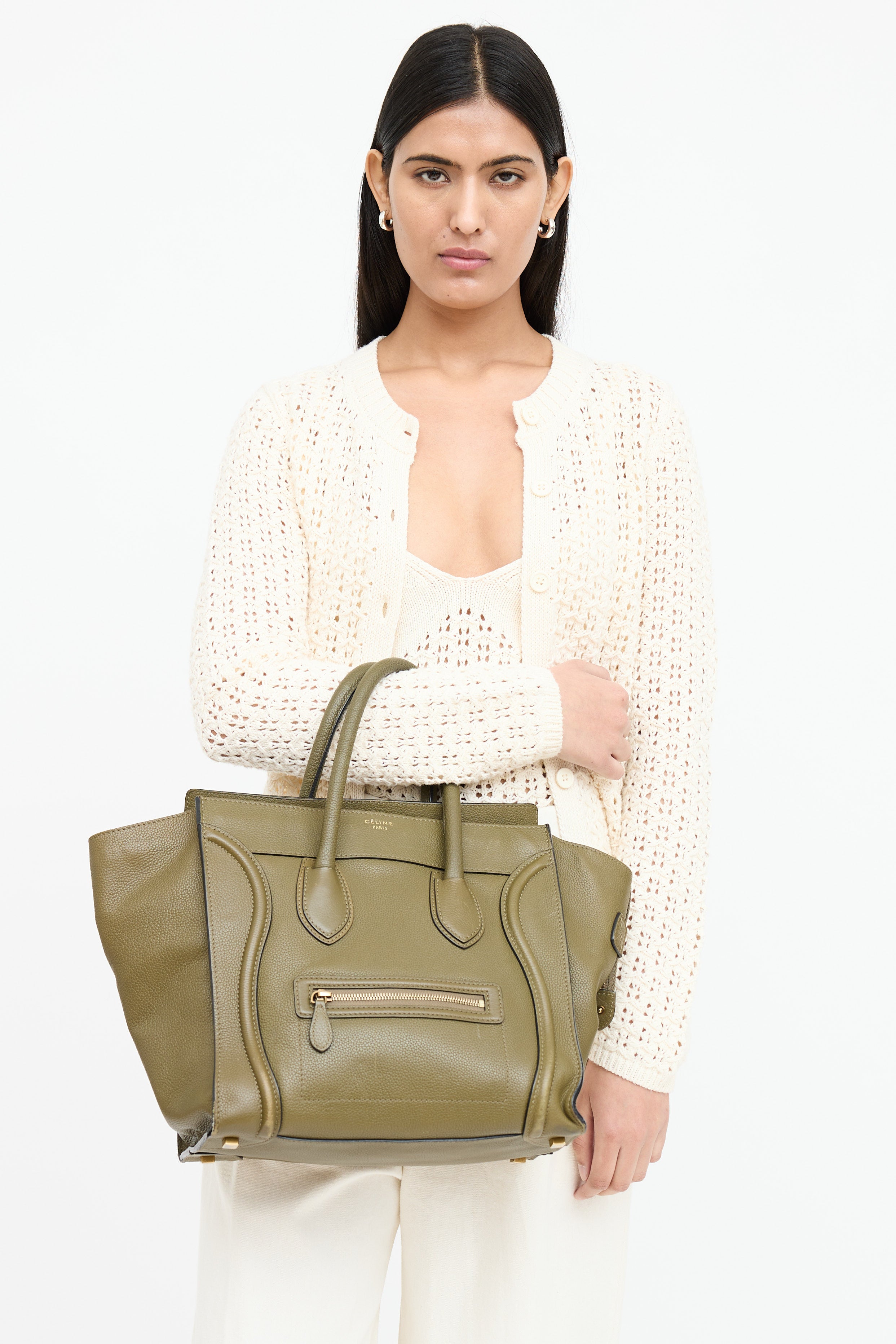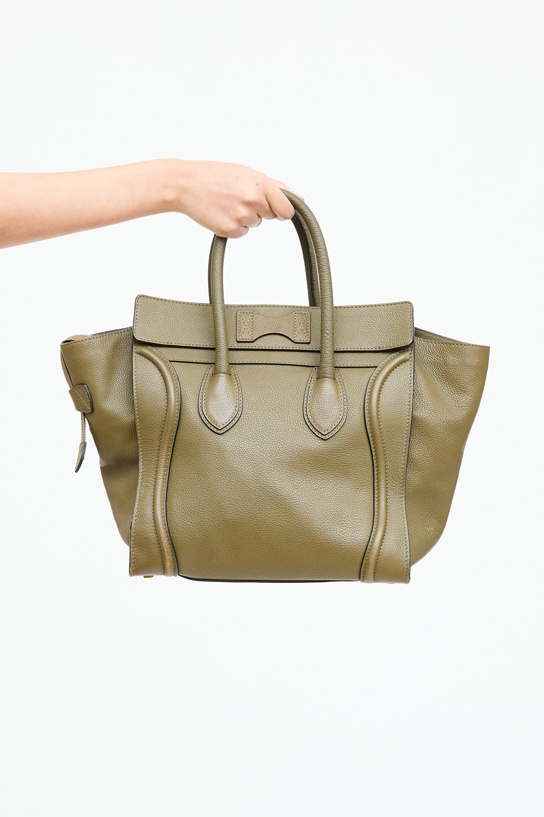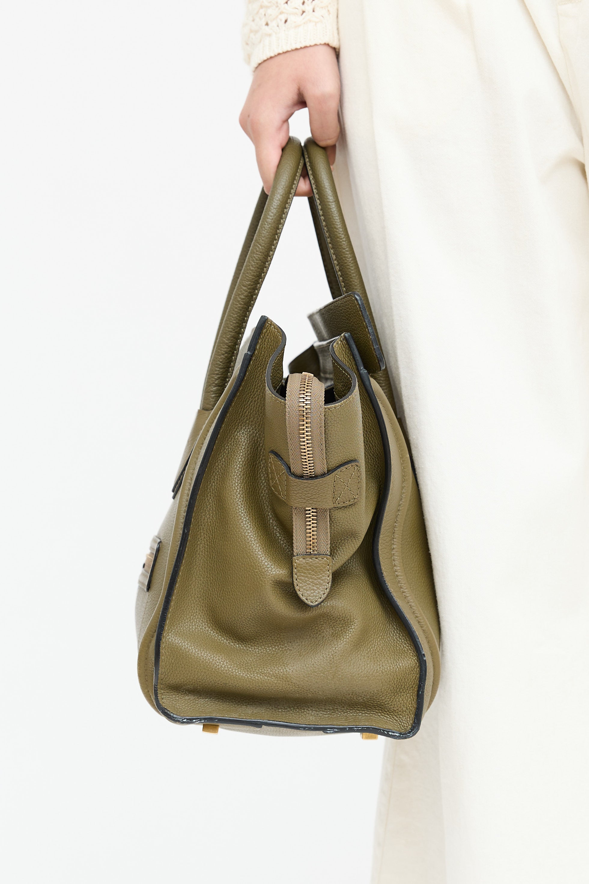 Pre-owned Celine green grained calfskin leather featuring tonal rolled leather handles, zip closure pocket at face, collapsible side gussets, top zip closure, gold-tone hardware and stamped logo at front, square metal feet and one main compartment with tonal interior lining with two slip pockets and zip closure pocket.