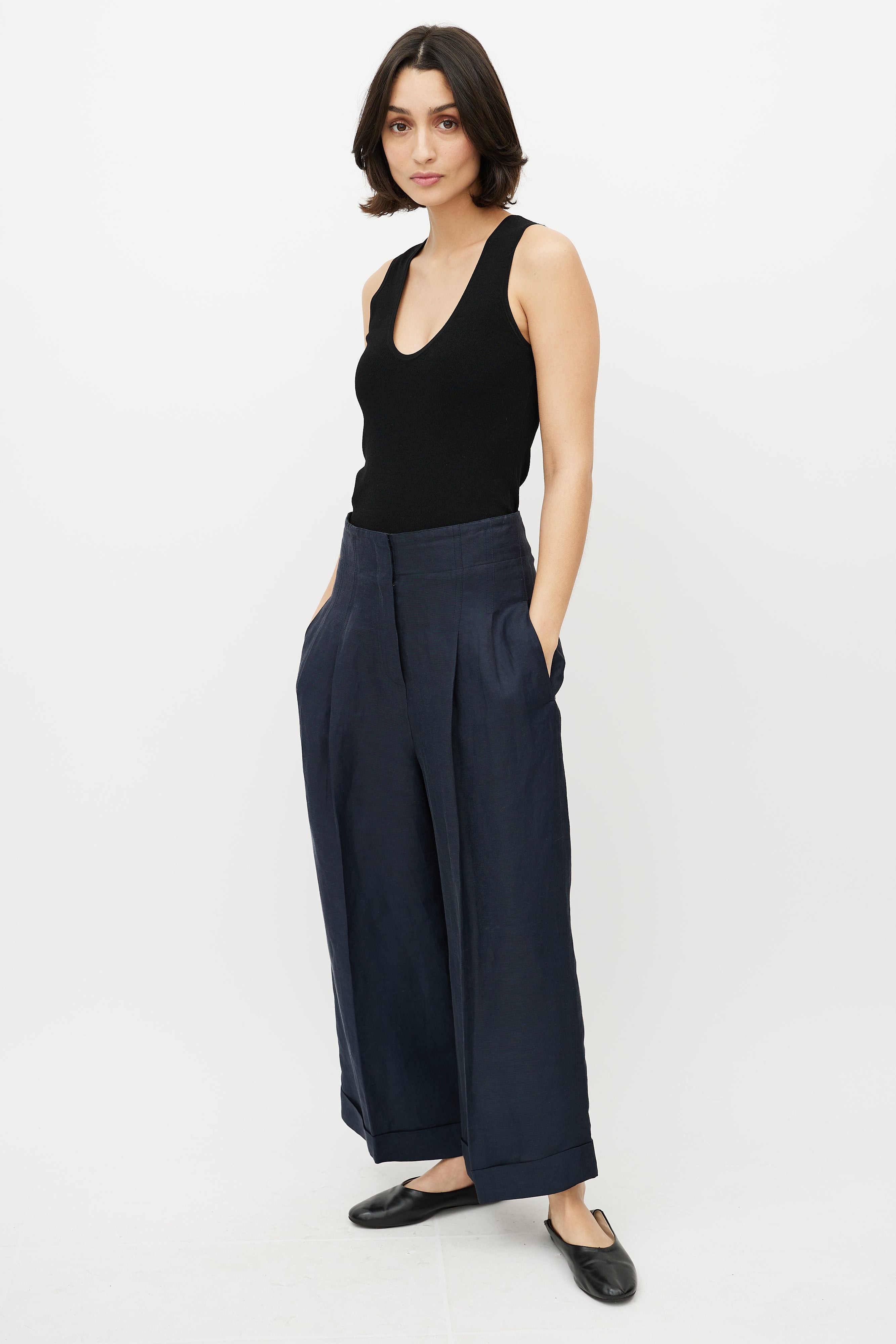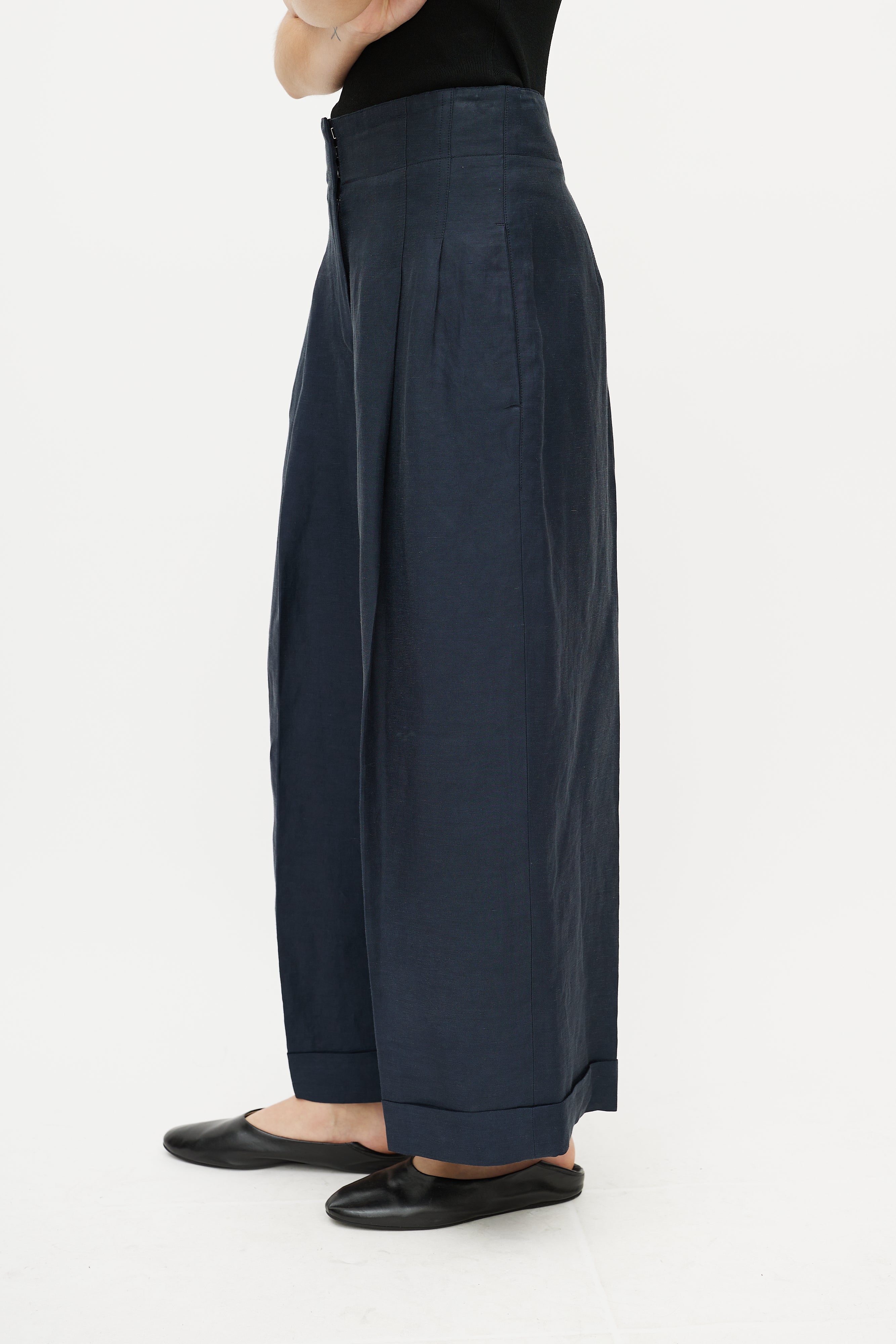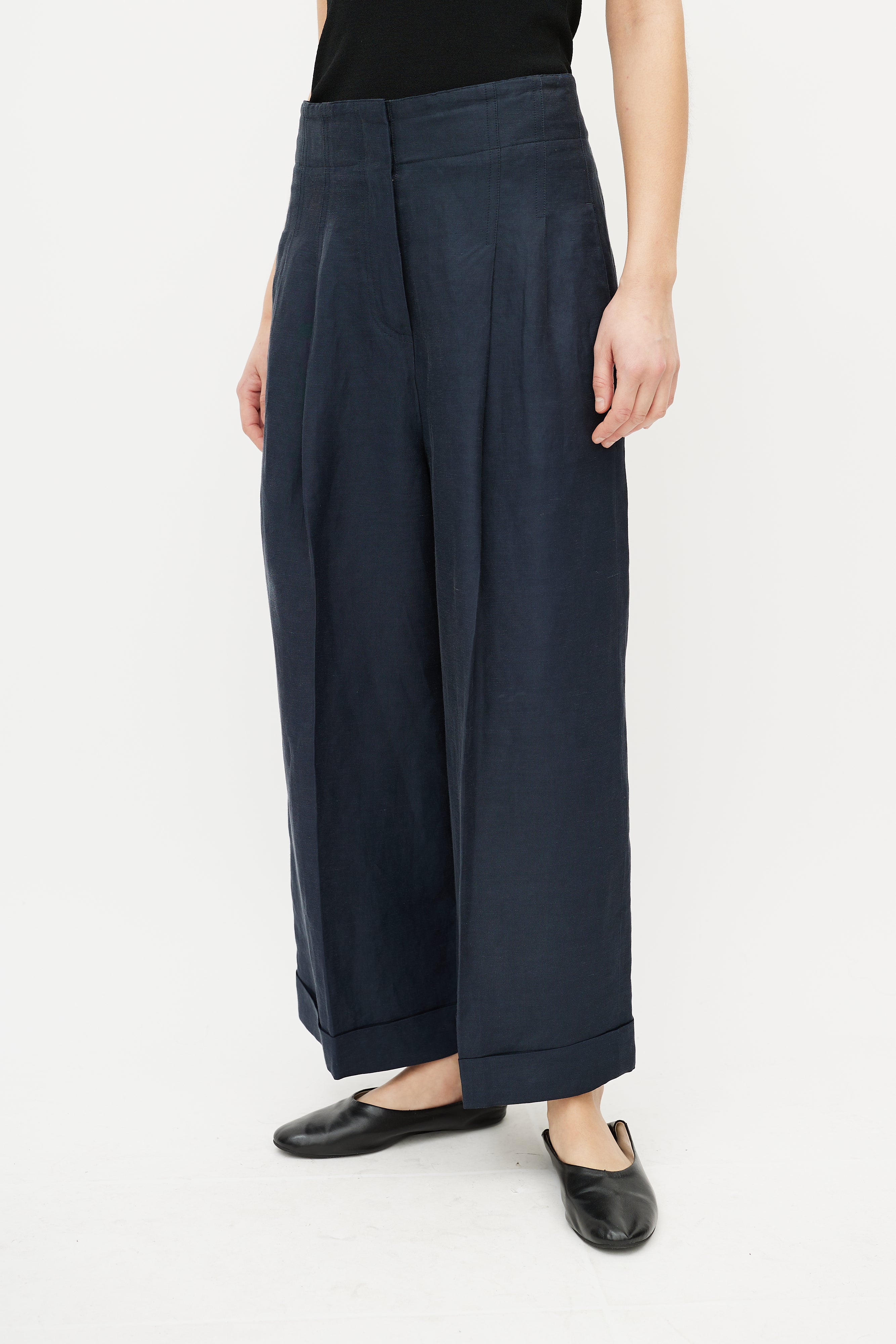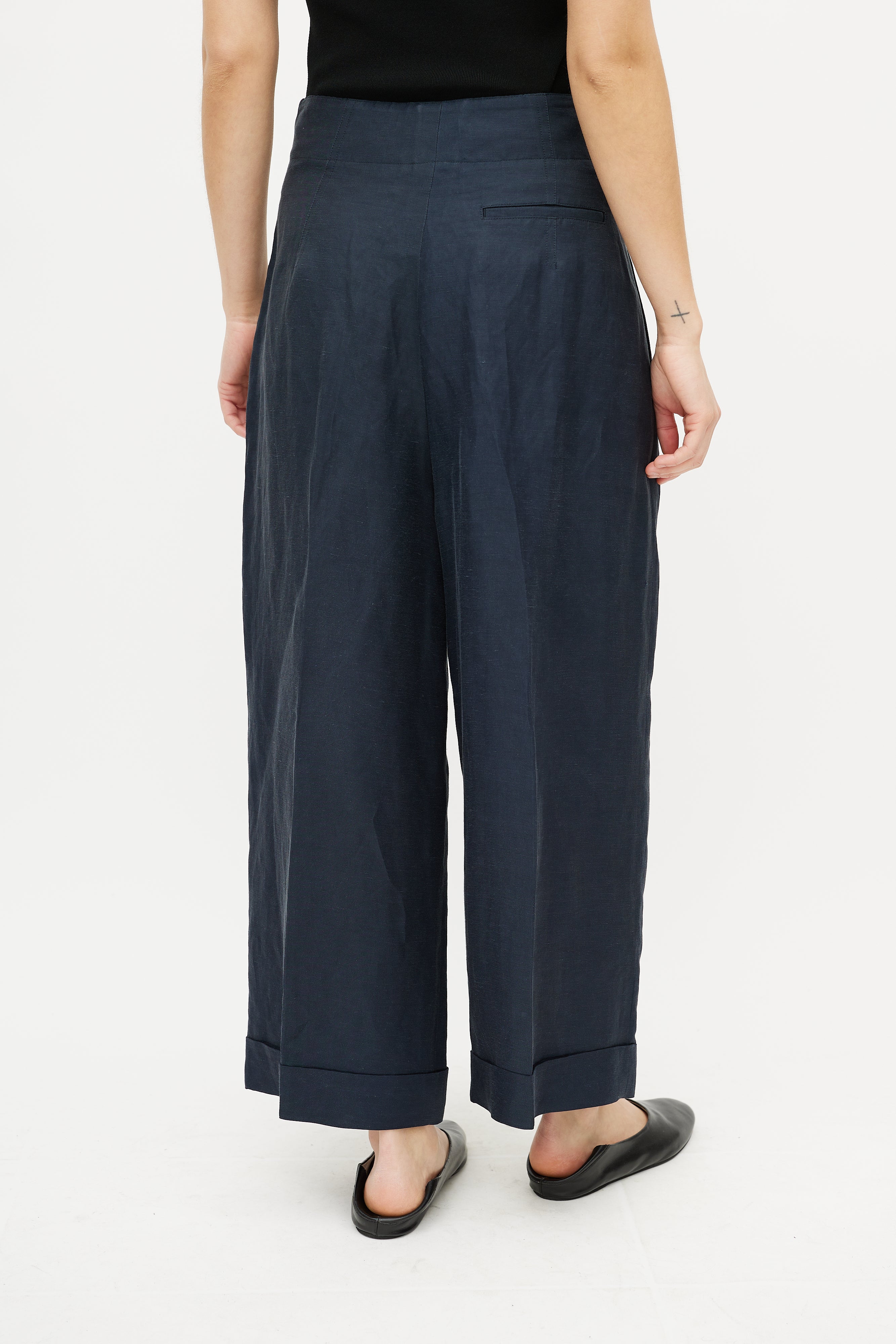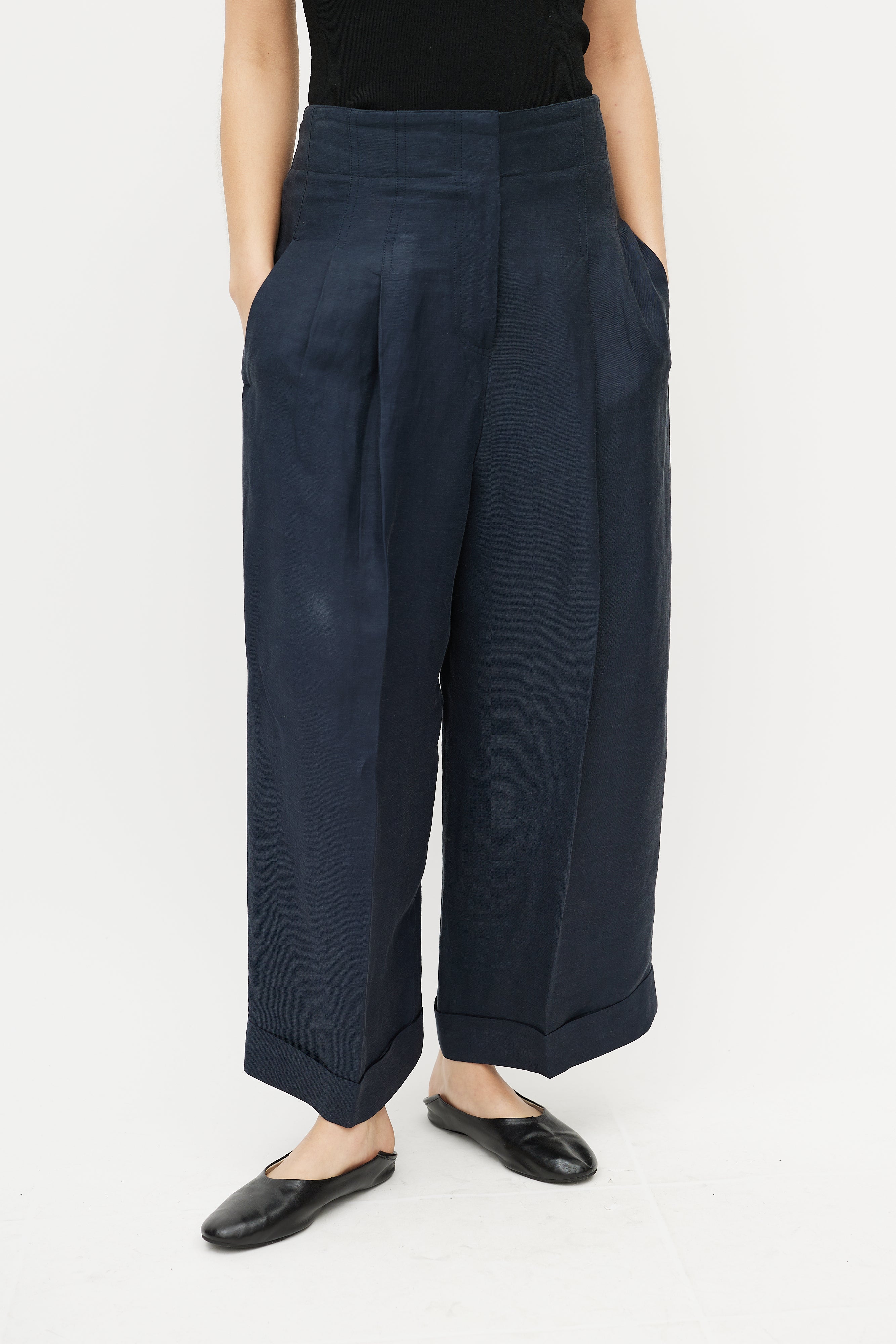 Pre-owned Celine navy blue linen trousers featuring wide legs, high waisted, two hip pockets, one welt pocket at back, zip fly, and cuffed hem.