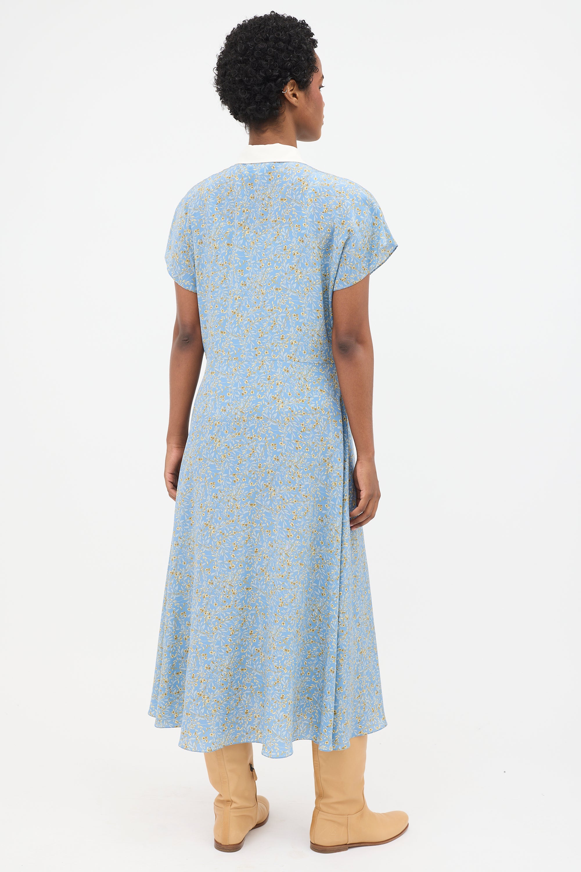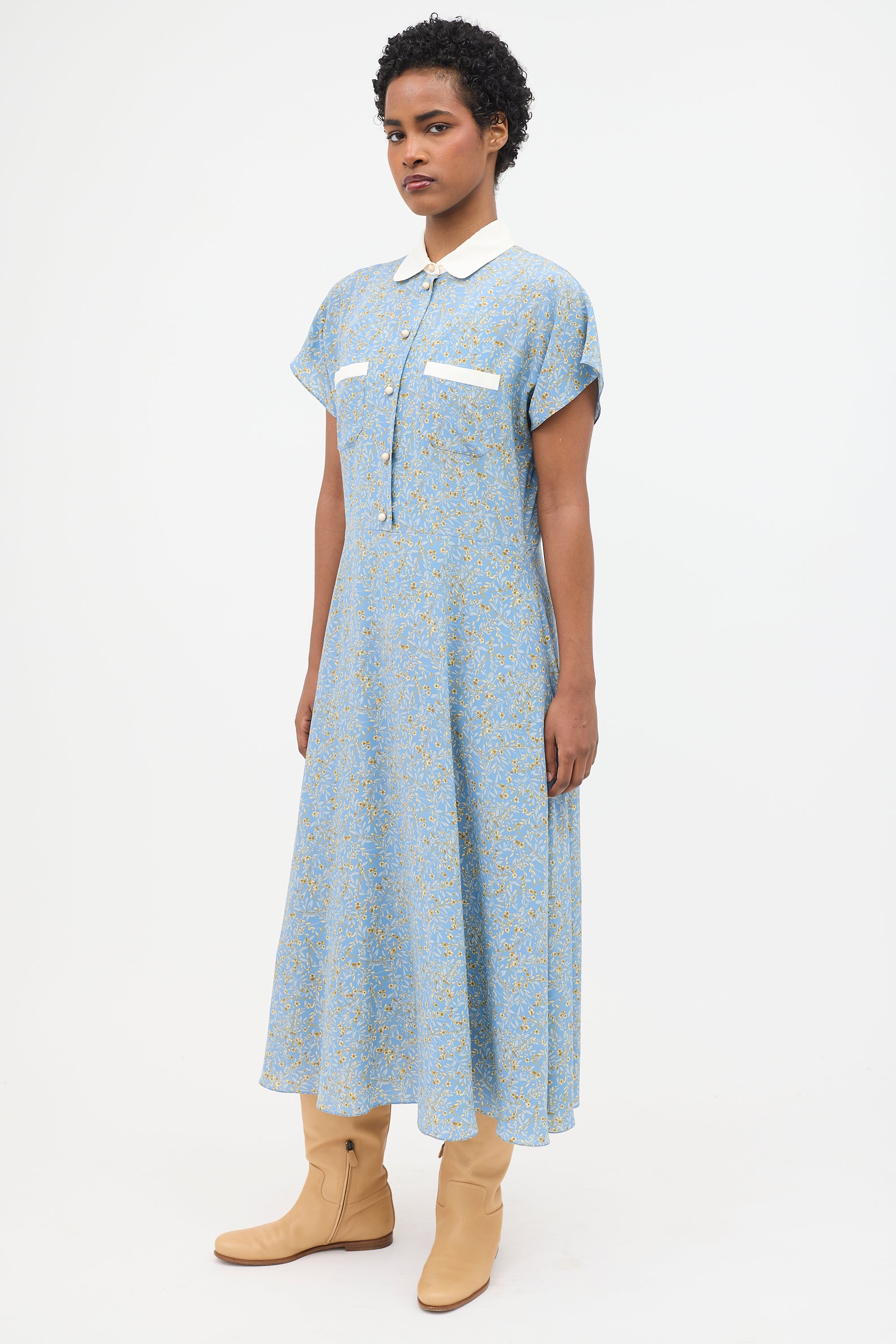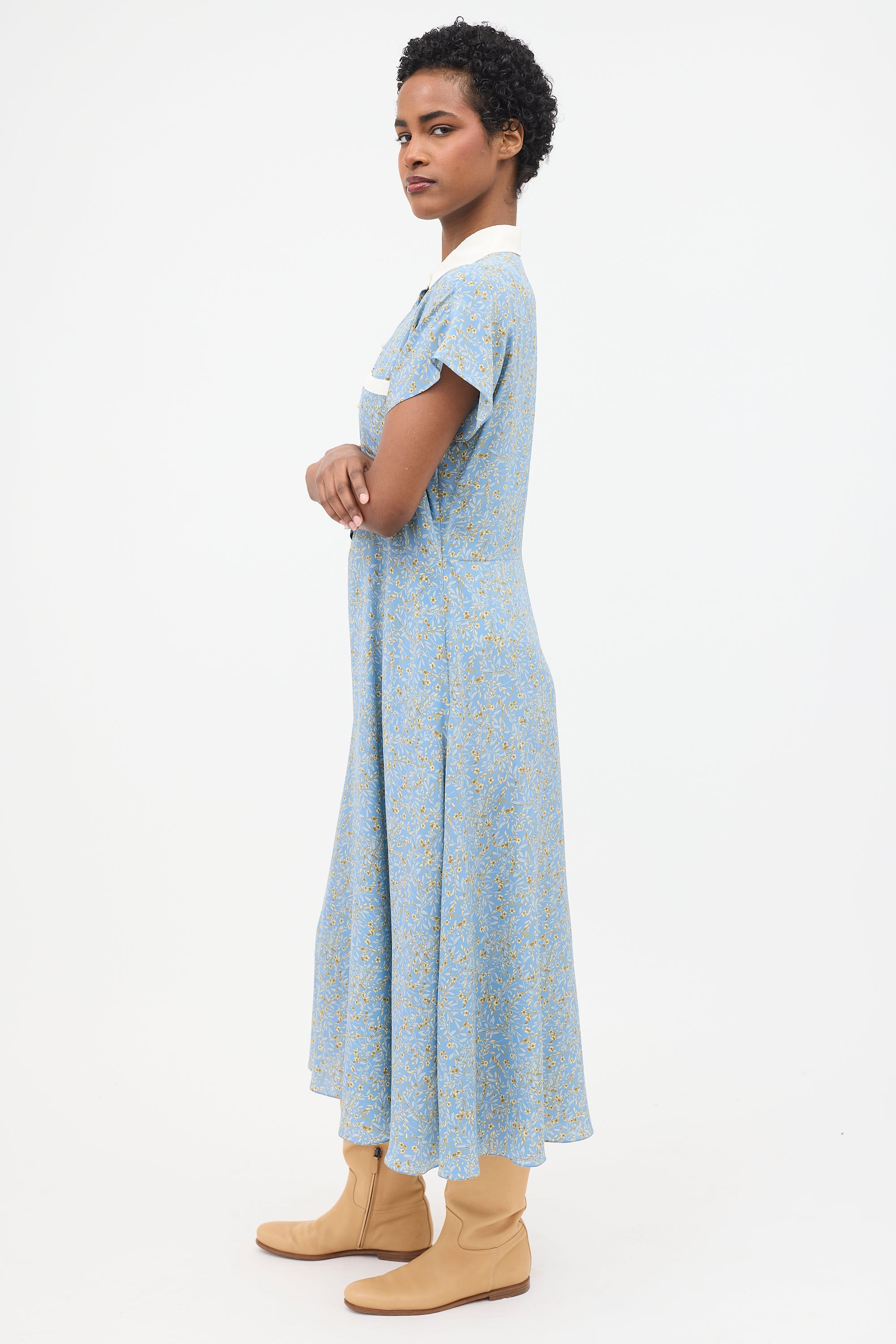 Pre-owned Celine blue silk crepe midi dress featuring floral print, rounded collar, Triomphe logo buttons along chest, two front patch pockets, in seam pockets, flutter sleeves, and concealed side zip.