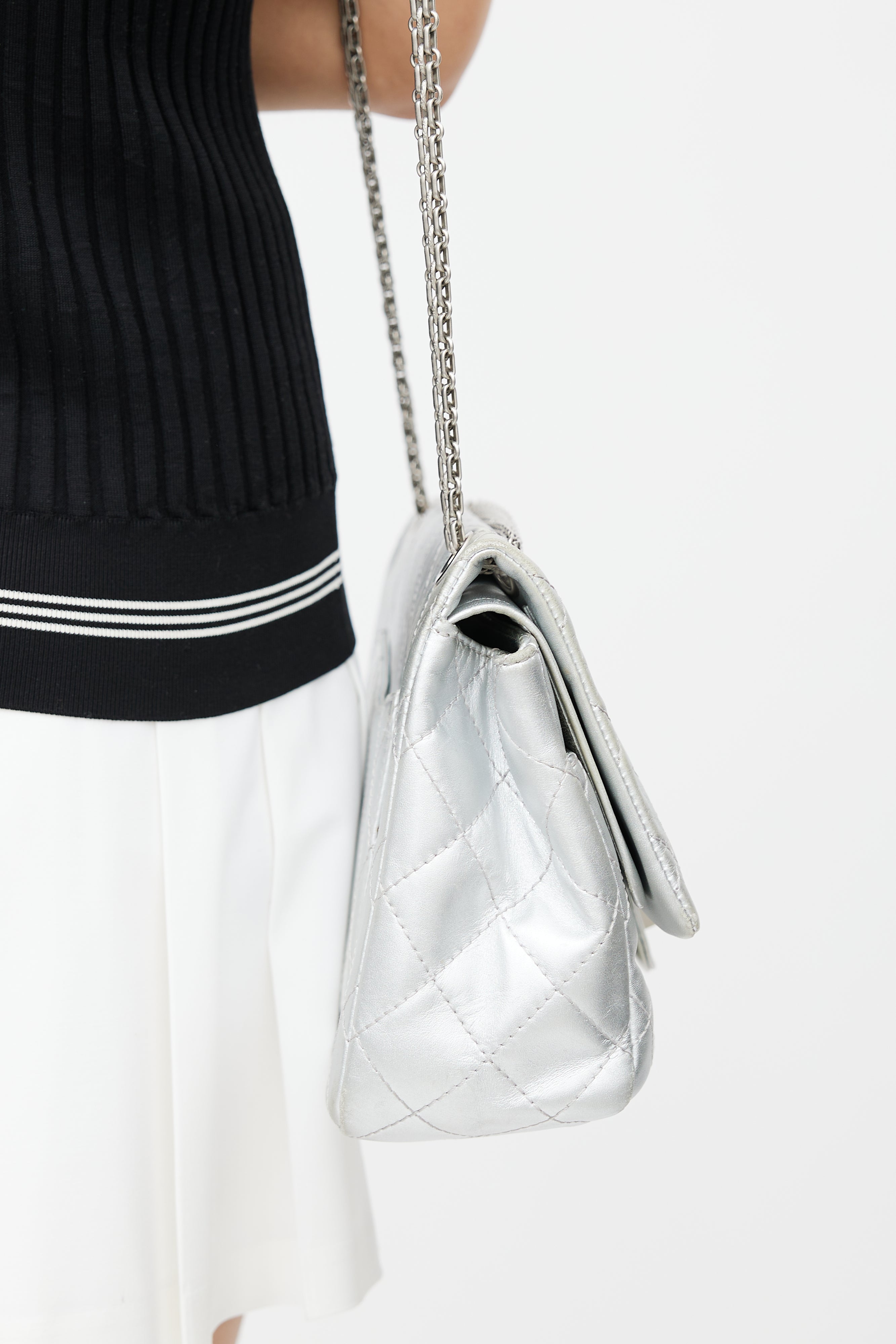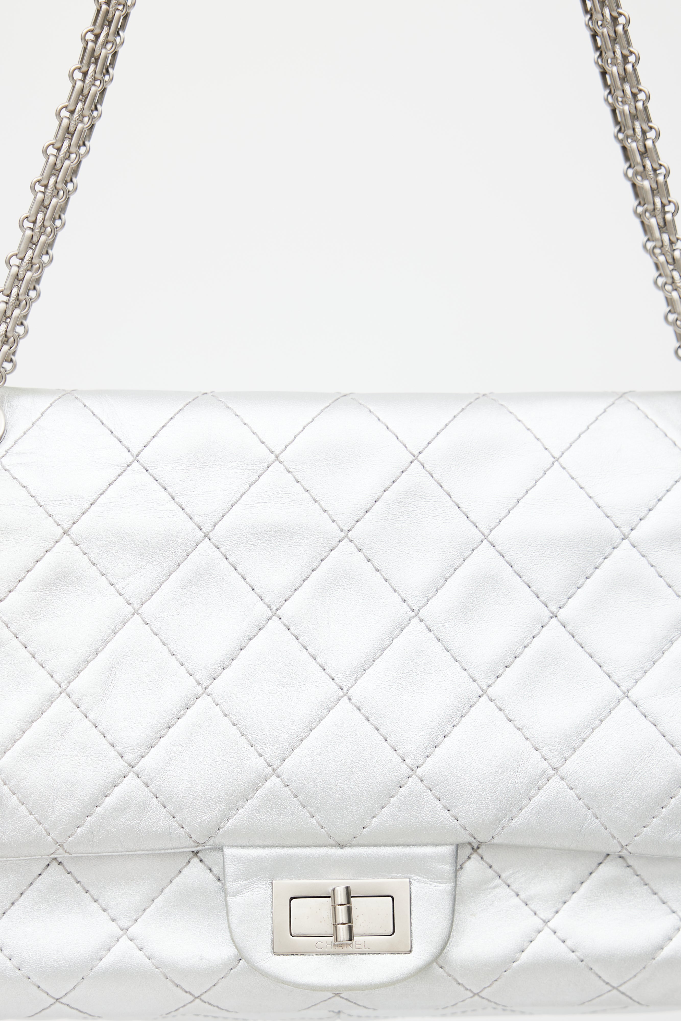 Pre-owned 2018 Chanel silver 2.55 Reissue 227 Flap shoulder bag featuring aged quilted lambskin leather, silver tone hardware, adjustable chain strap, Mademoiselle turn lock closure, slip pocket at back, double top flaps with zip and two slip pockets, embroidered CC logo under second flap, tonal lining, and two interior slot pockets. Comes with original dust bag.