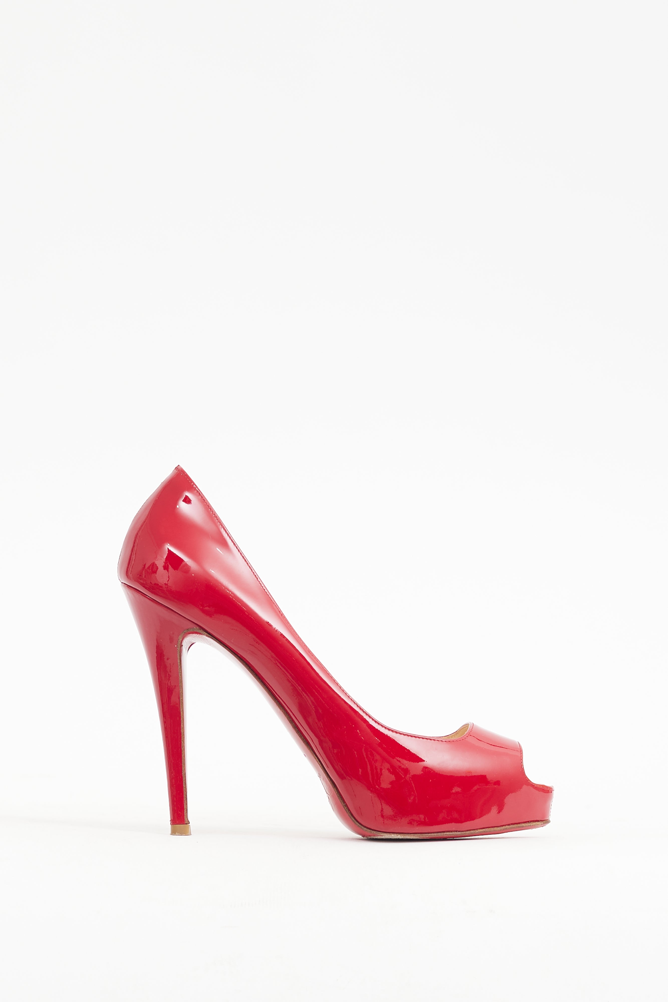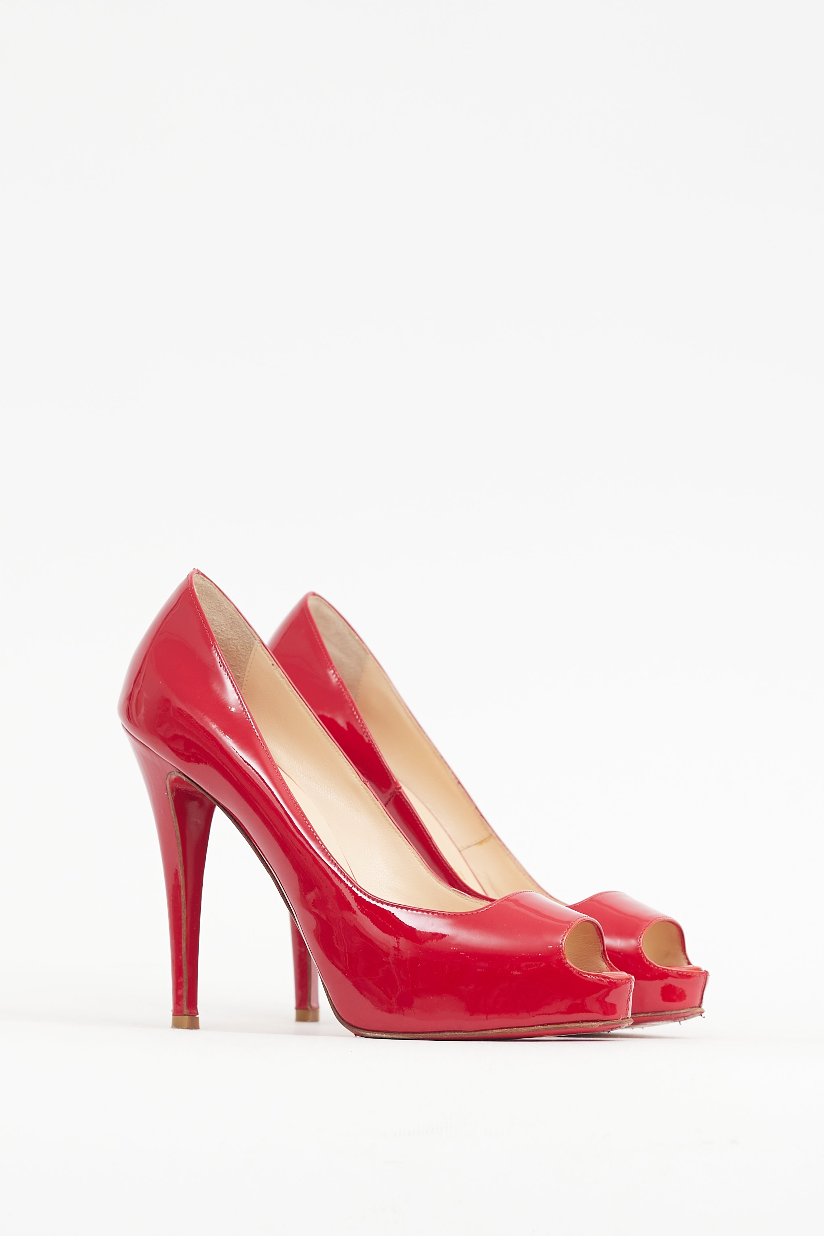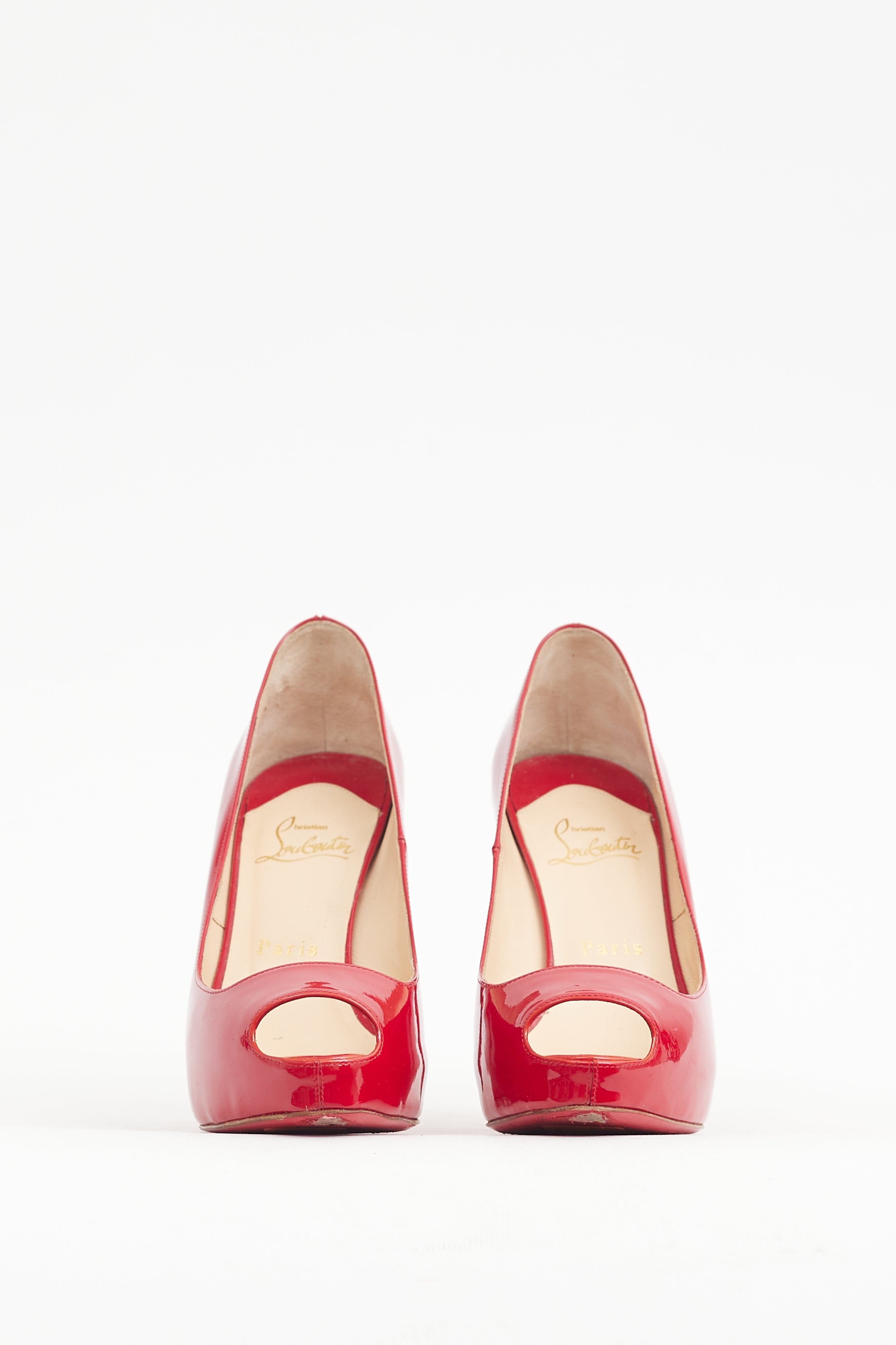 Pre-owned Christian Louboutin red Very Prive heels featuring an open almond toe, patent leather upper, short concealed platform, signature red lacquered outsole, and a covered stiletto heel. Comes with original dust bag.