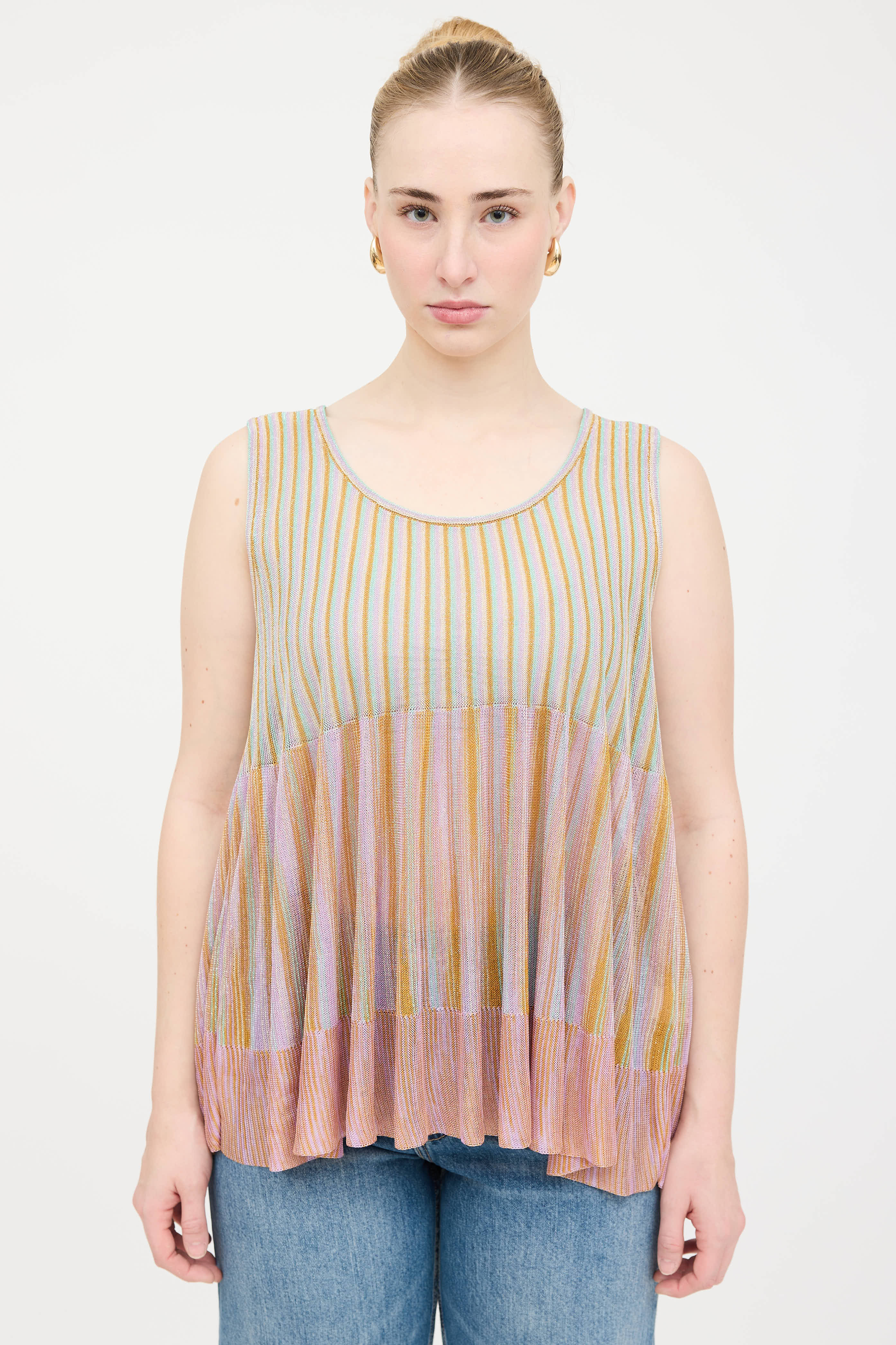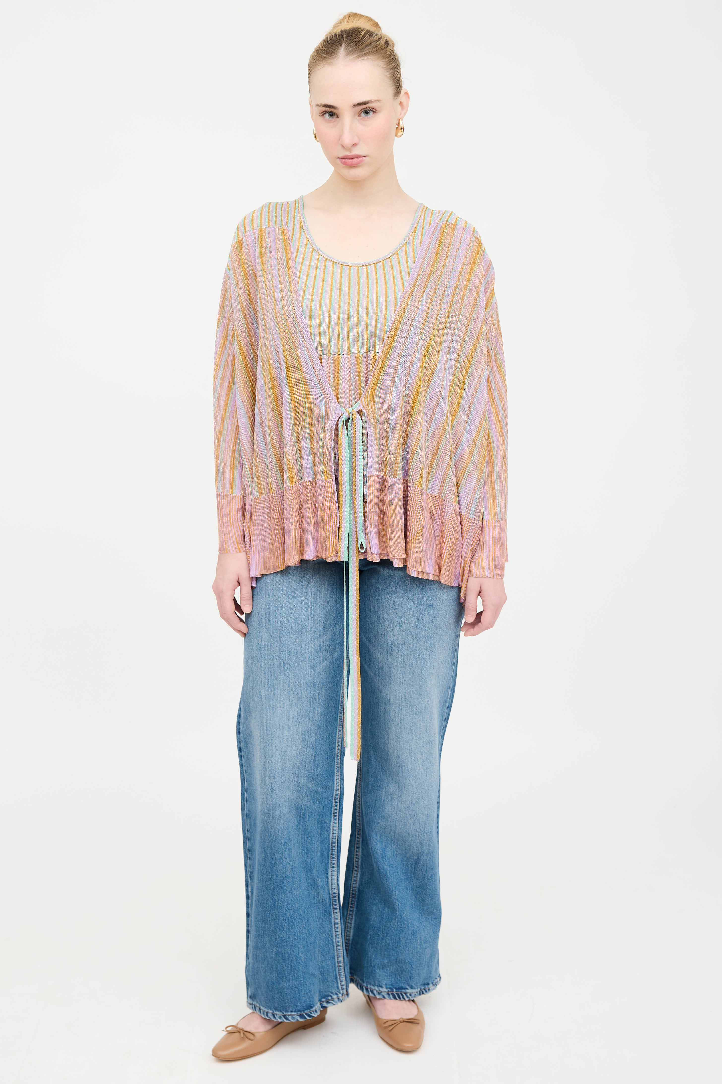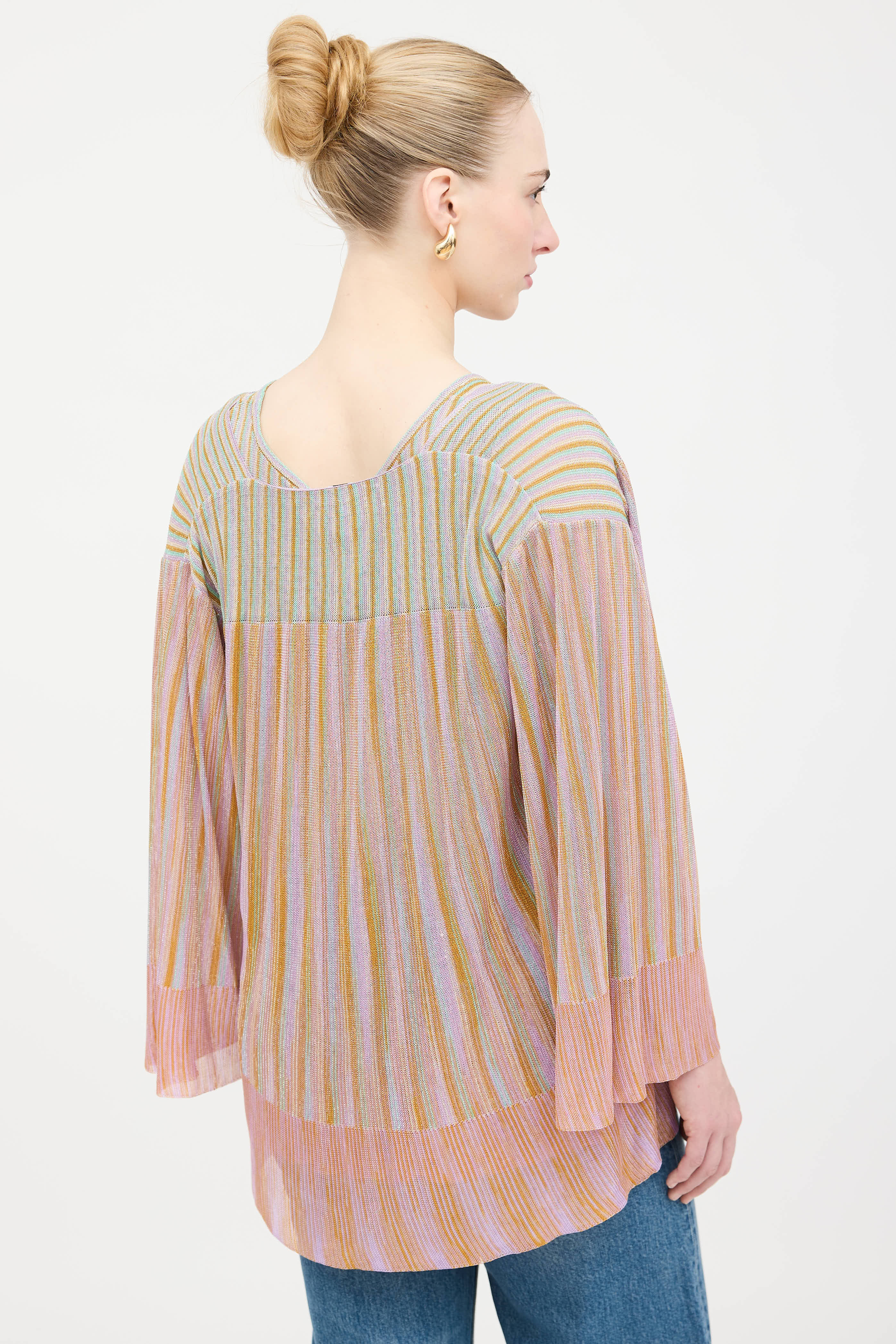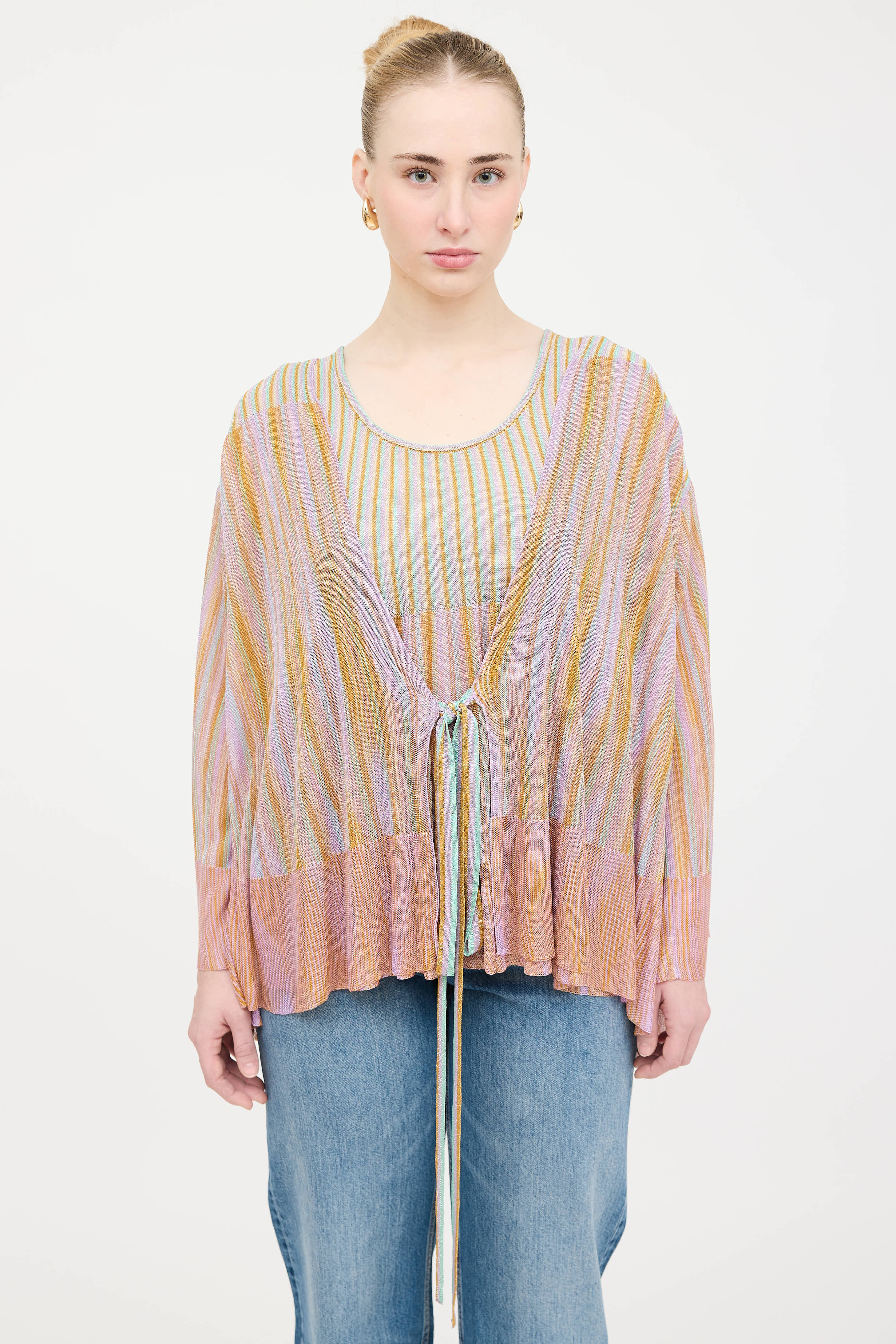 Pre-owned Missoni purple and multicolor striped co-ord set featuring a sleeveless top with scoop neckline, and metallic thread throughout. Matching cardigan featuring open tie front, flared sleeves, and metallic threading throughout.