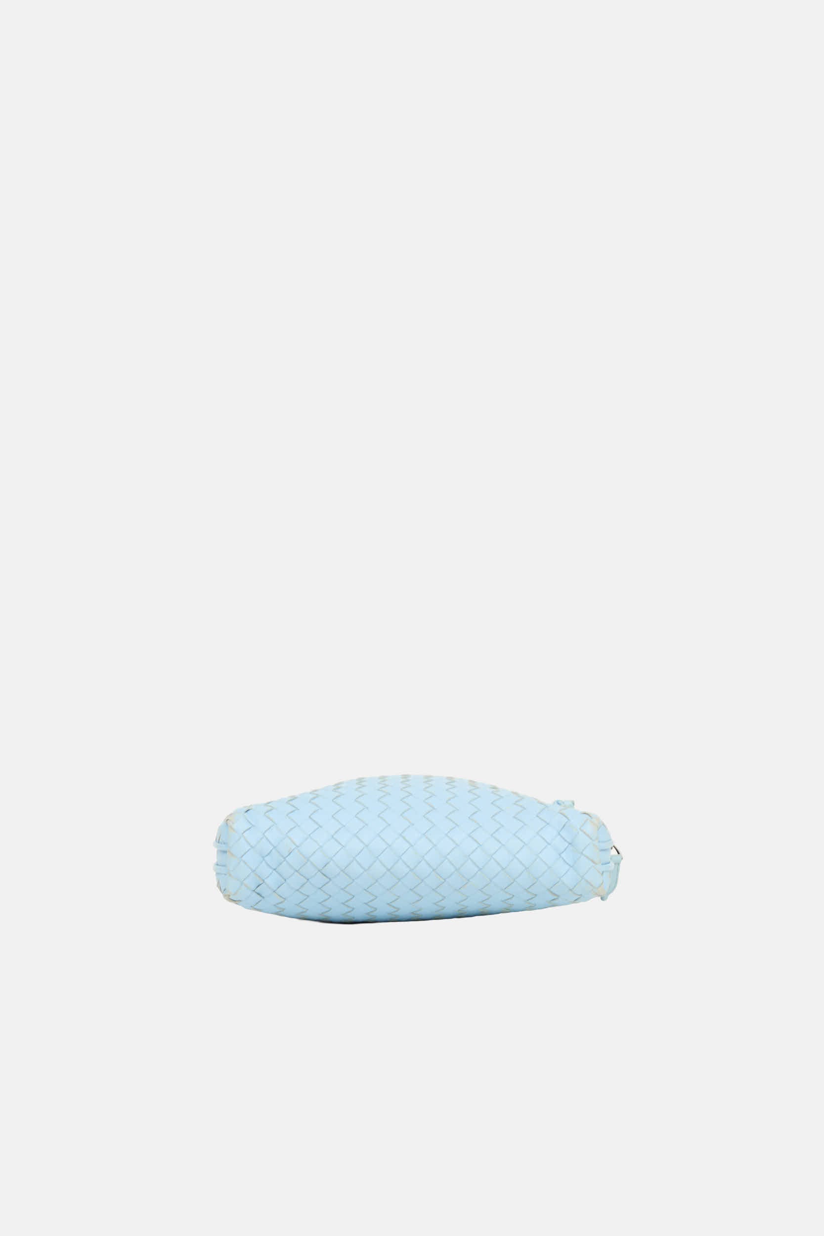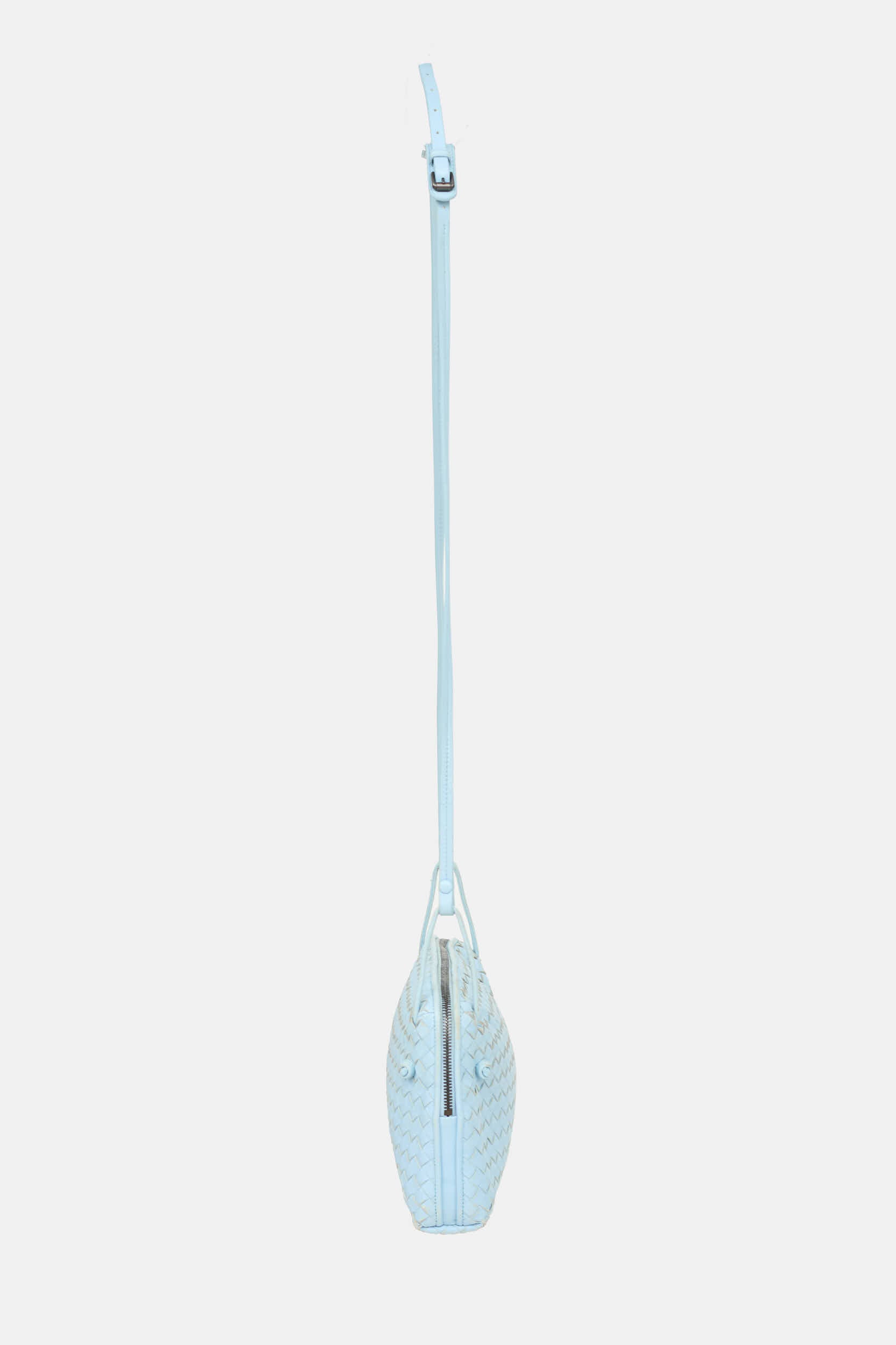 Pre-owned Bottega Veneta blue Nodini crossbody bag featuring Intrecciato woven leather body, single adjustable shoulder strap, top zip closure, and one suede lined main compartment with one zip pocket and one slip pockets.
