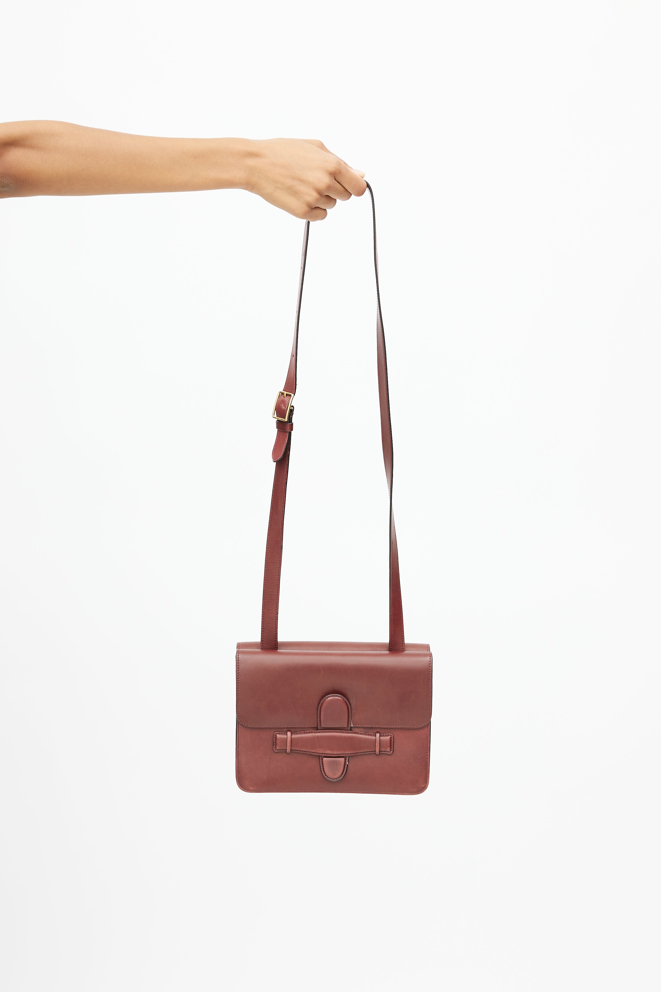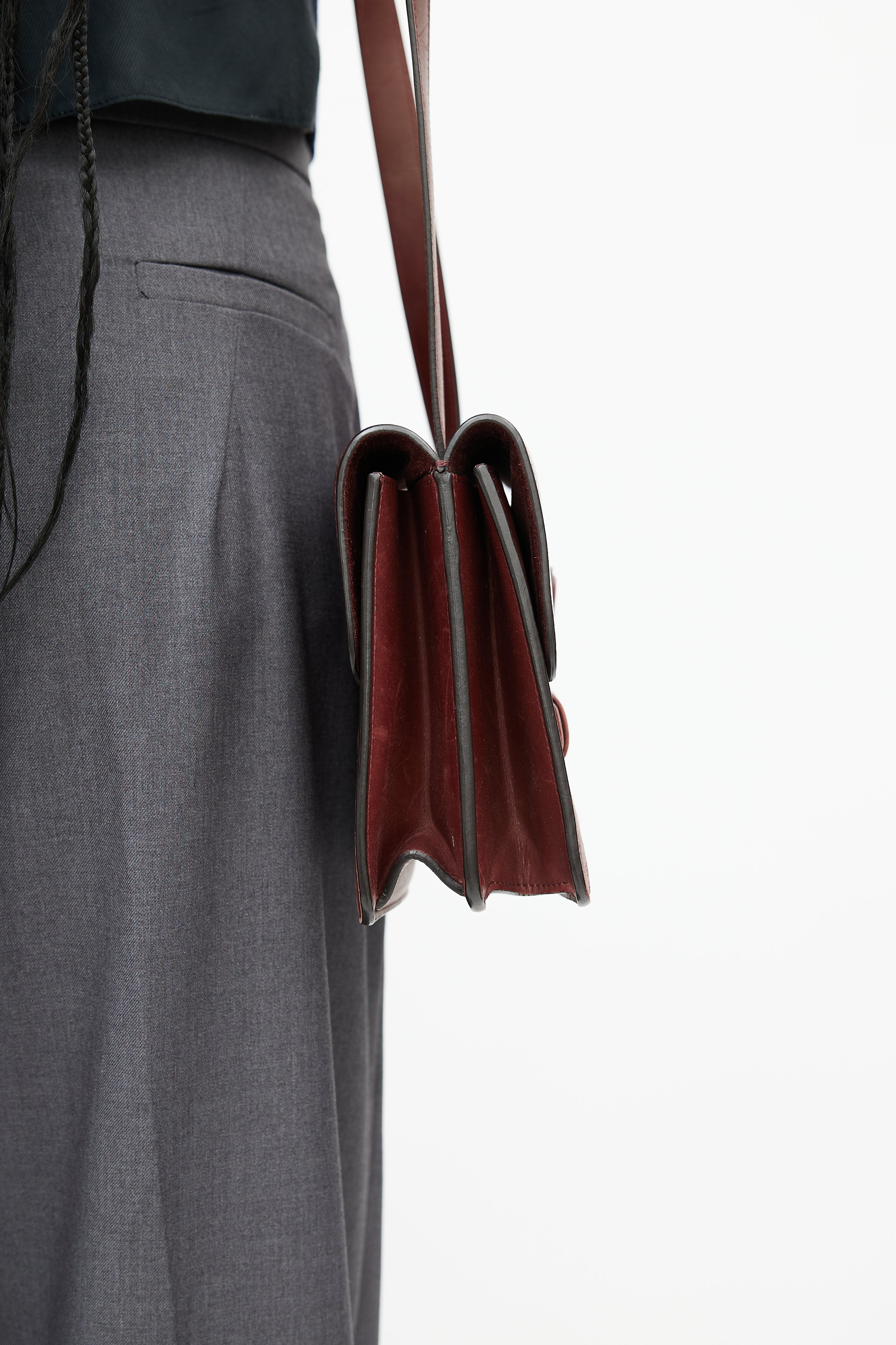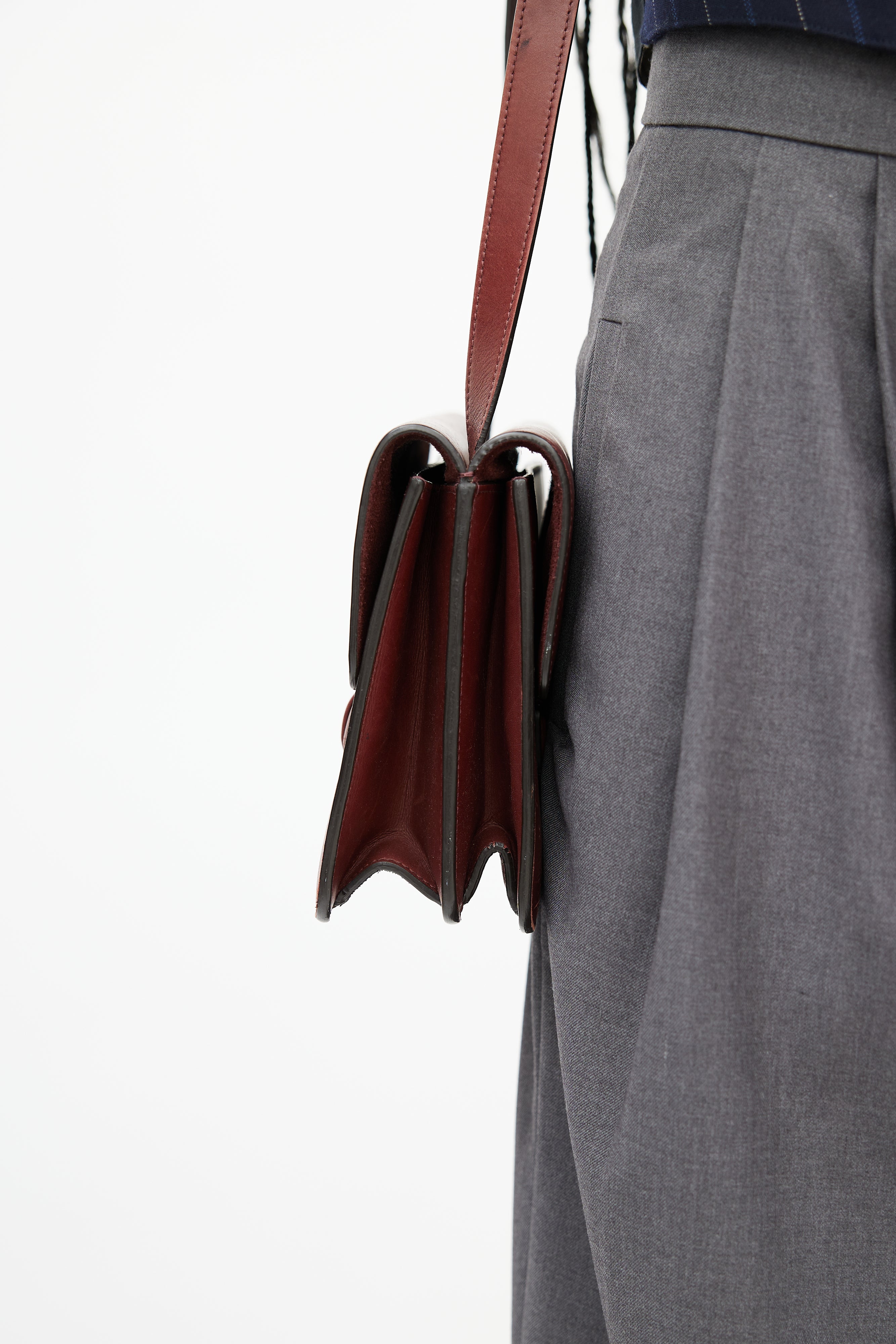 Pre-owned Celine brown leather bag featuring two top flaps, adjustable shoulder strap, two main compartments with two slip pockets and one zip pocket, and latch closures. Comes with original dust bag.