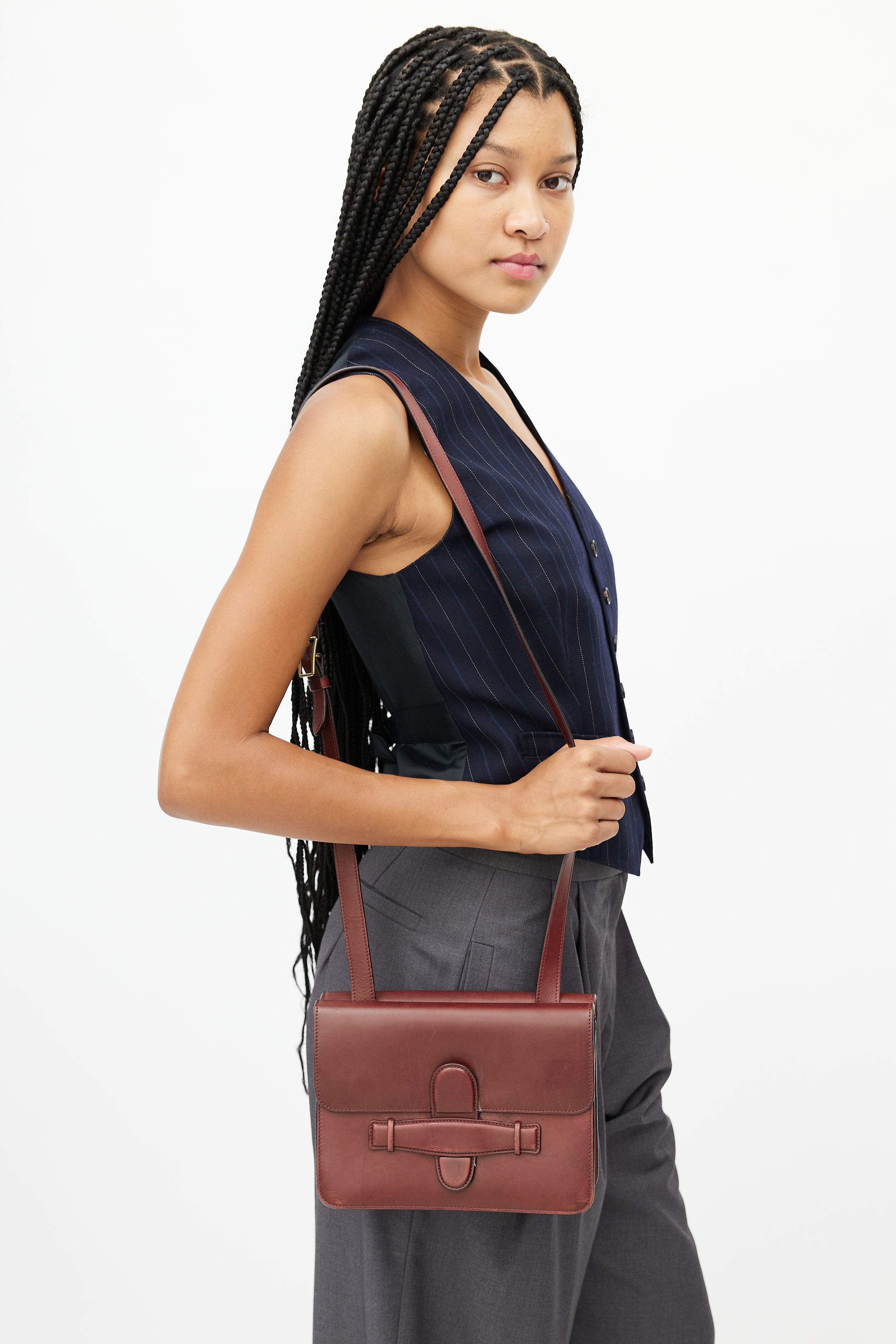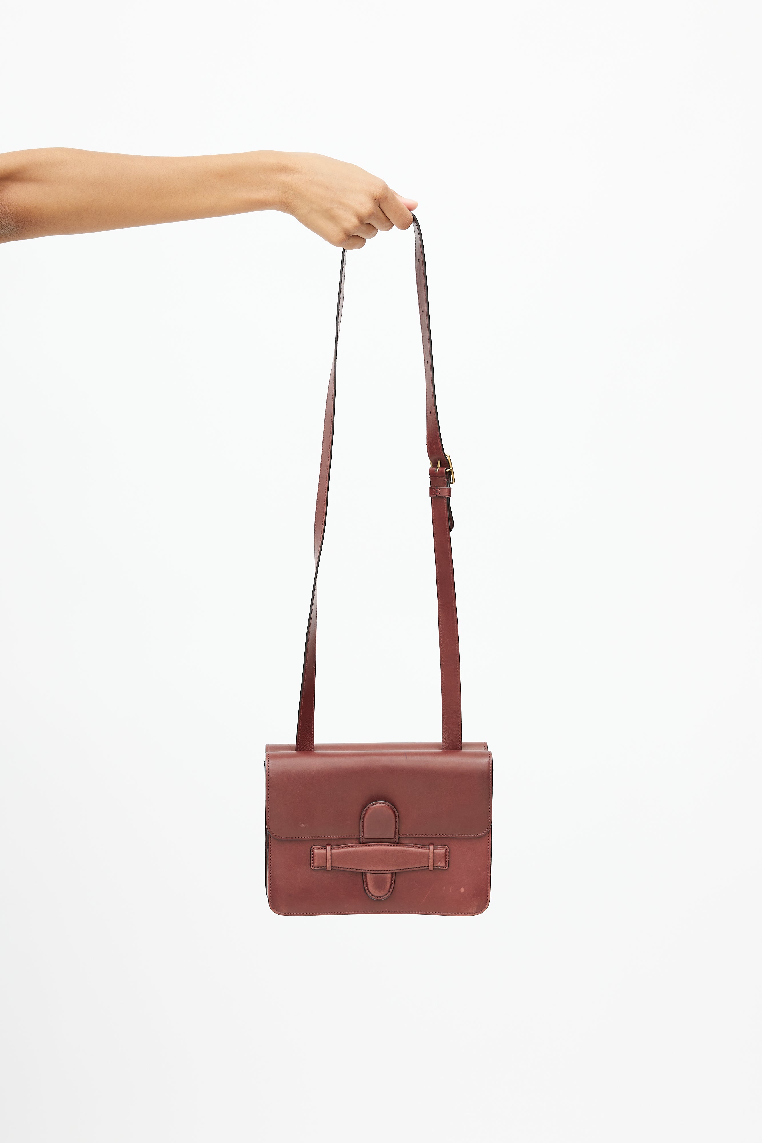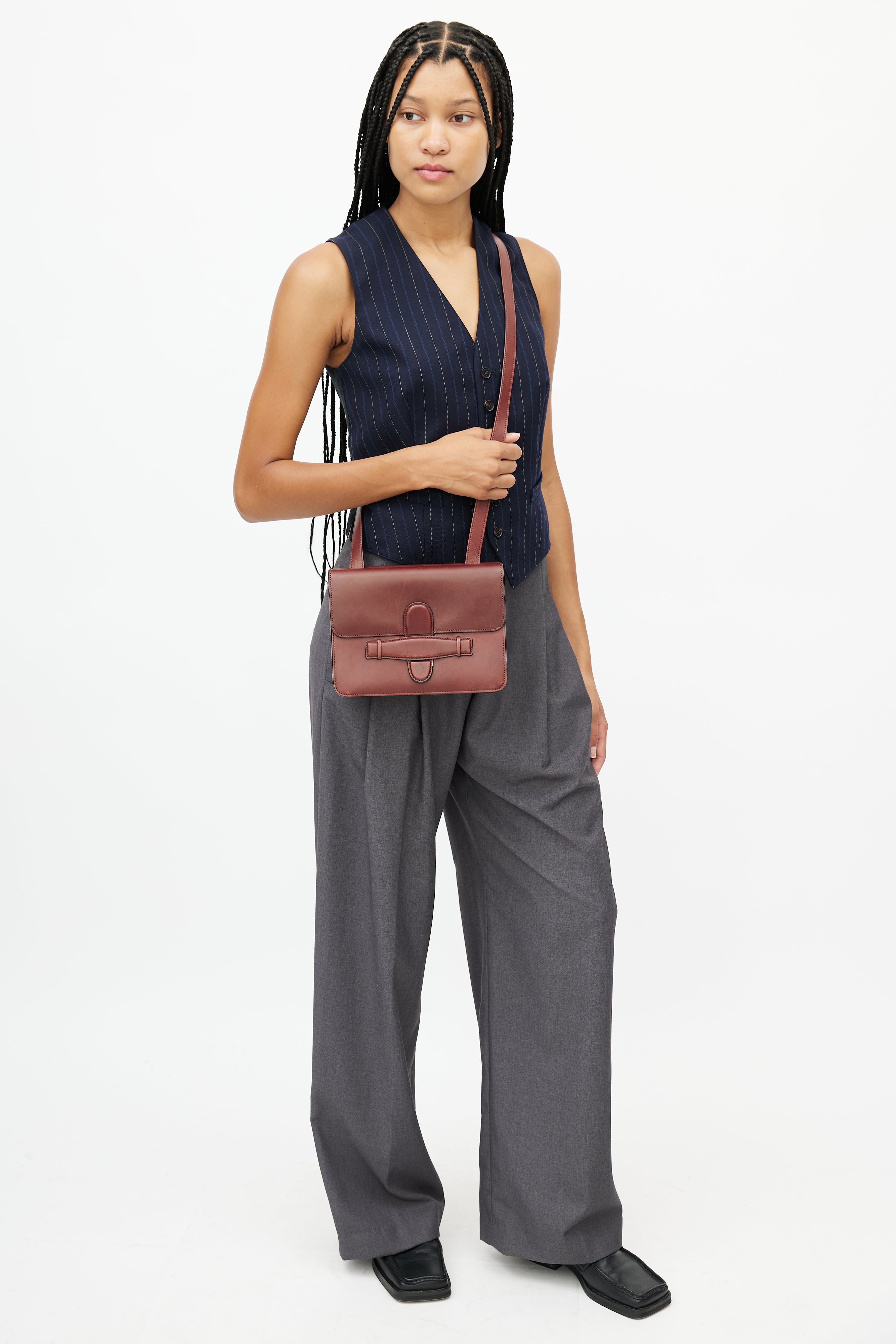 Pre-owned Celine brown leather bag featuring two top flaps, adjustable shoulder strap, two main compartments with two slip pockets and one zip pocket, and latch closures. Comes with original dust bag.