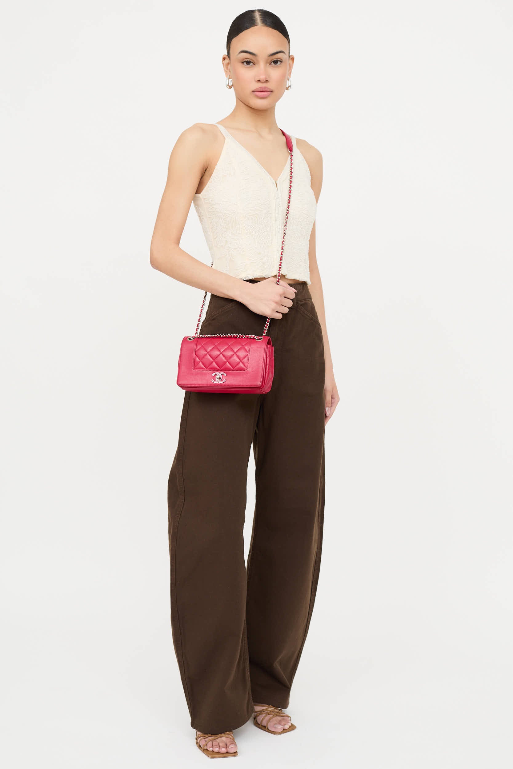Pre-owned Chanel series 23 small Raspberry Mademoiselle flap bag featuring quilted upper, braided leather and chain crossbody strap, silver tone hardware, top flap with CC turnlock closure, stitched CC logo at interior, interior slip pocket, one main compartment, and one zip pocket. From the 2017 collection by Karl Lagerfeld.