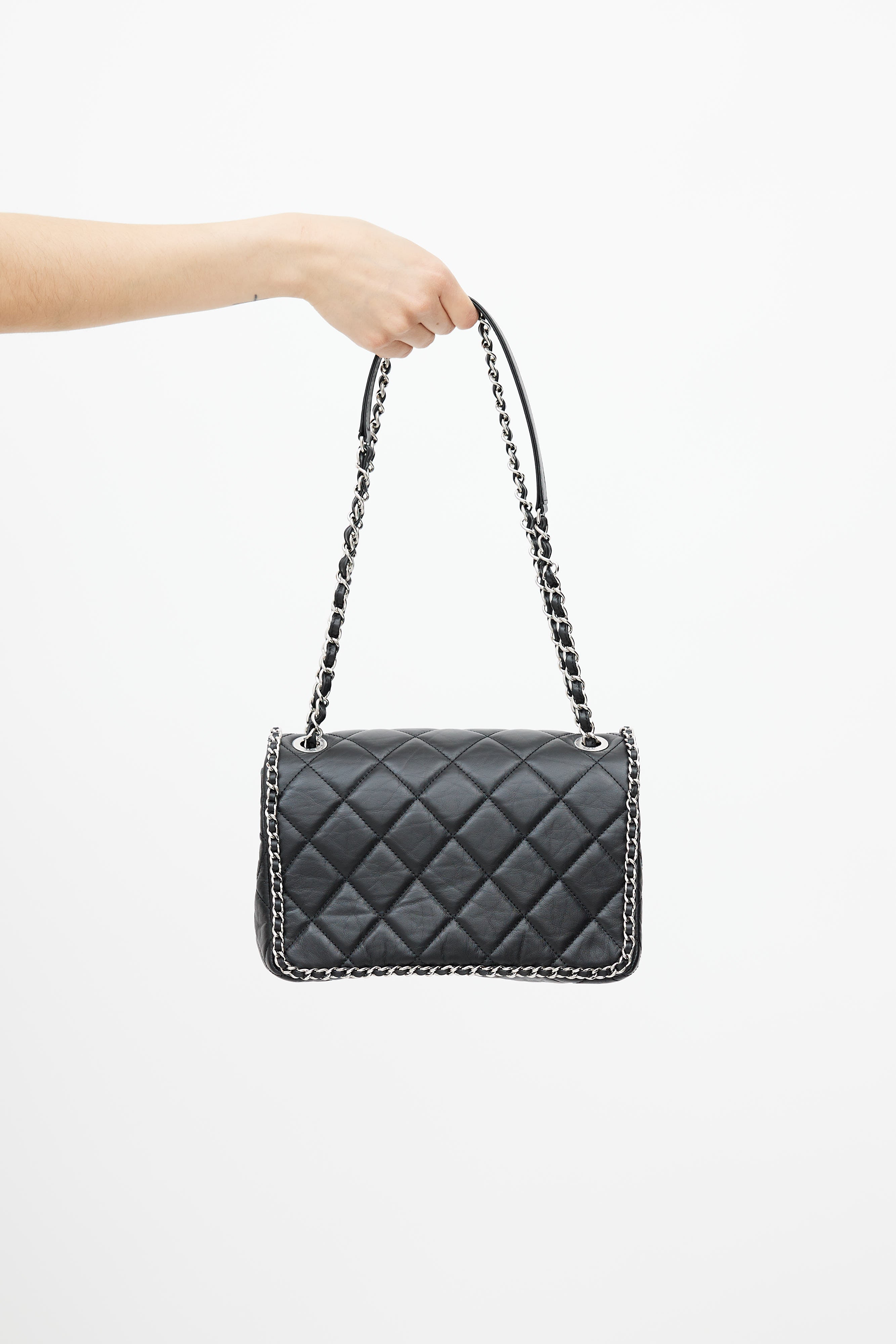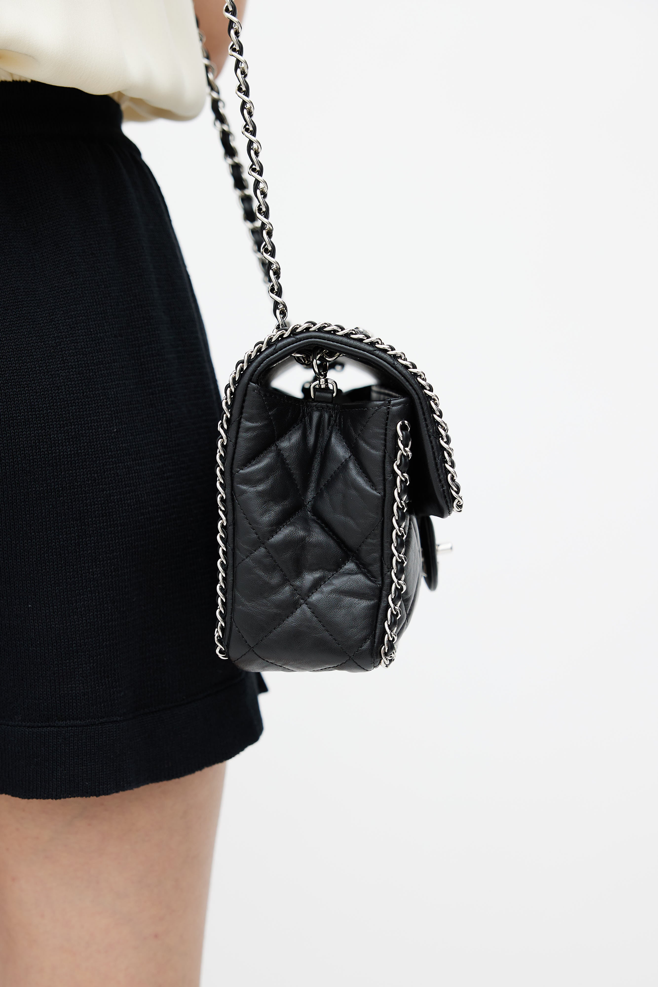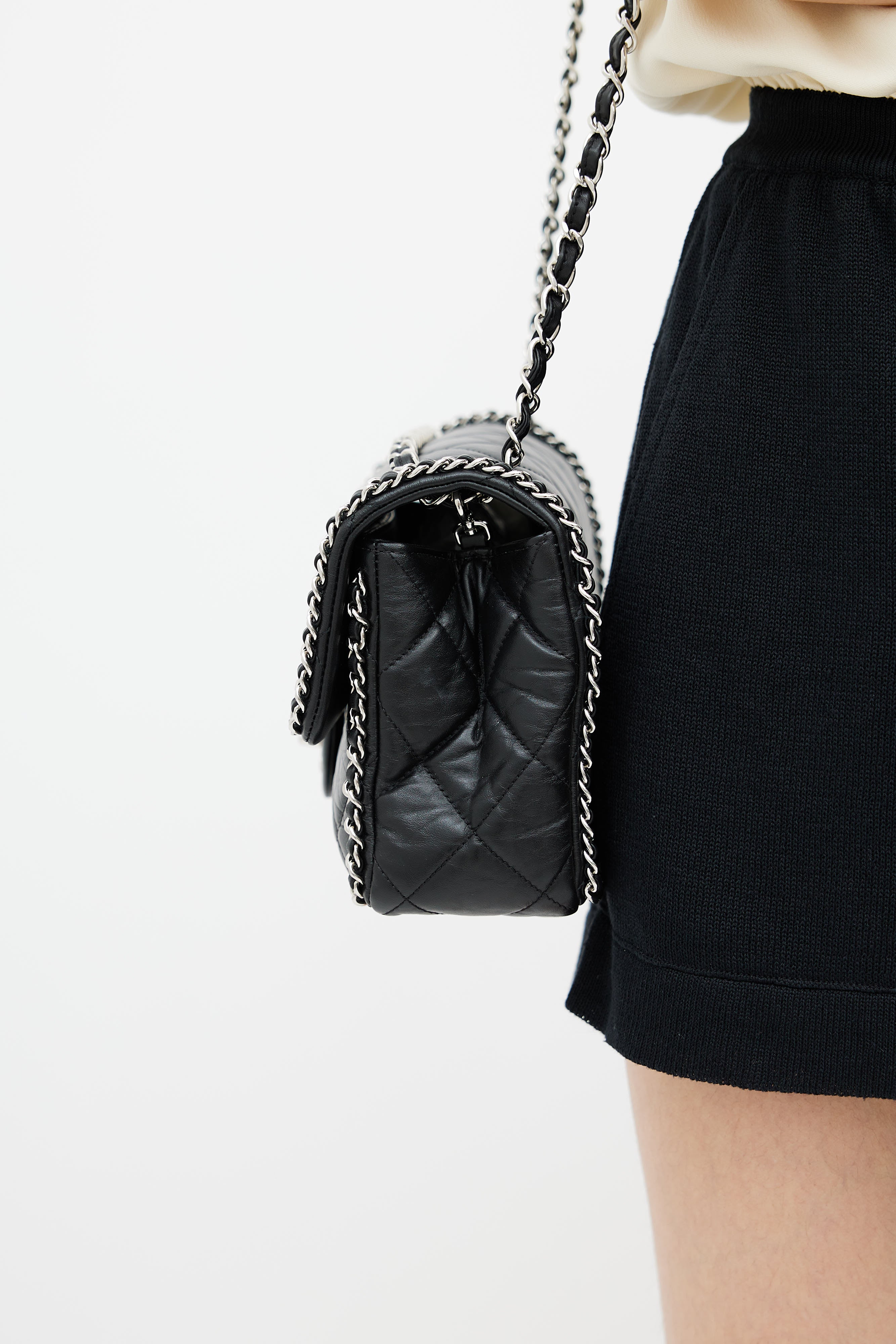 Pre-owned 2019 Chanel black Chain Around crossbody bag featuring aged black quilted leather, silver tone hardware, CC logo at front, turn lock closure, chain trim, adjustable chain shoulder straps, lined main compartment, and interior zip pocket. Comes with original dust bag and brand authentication card.