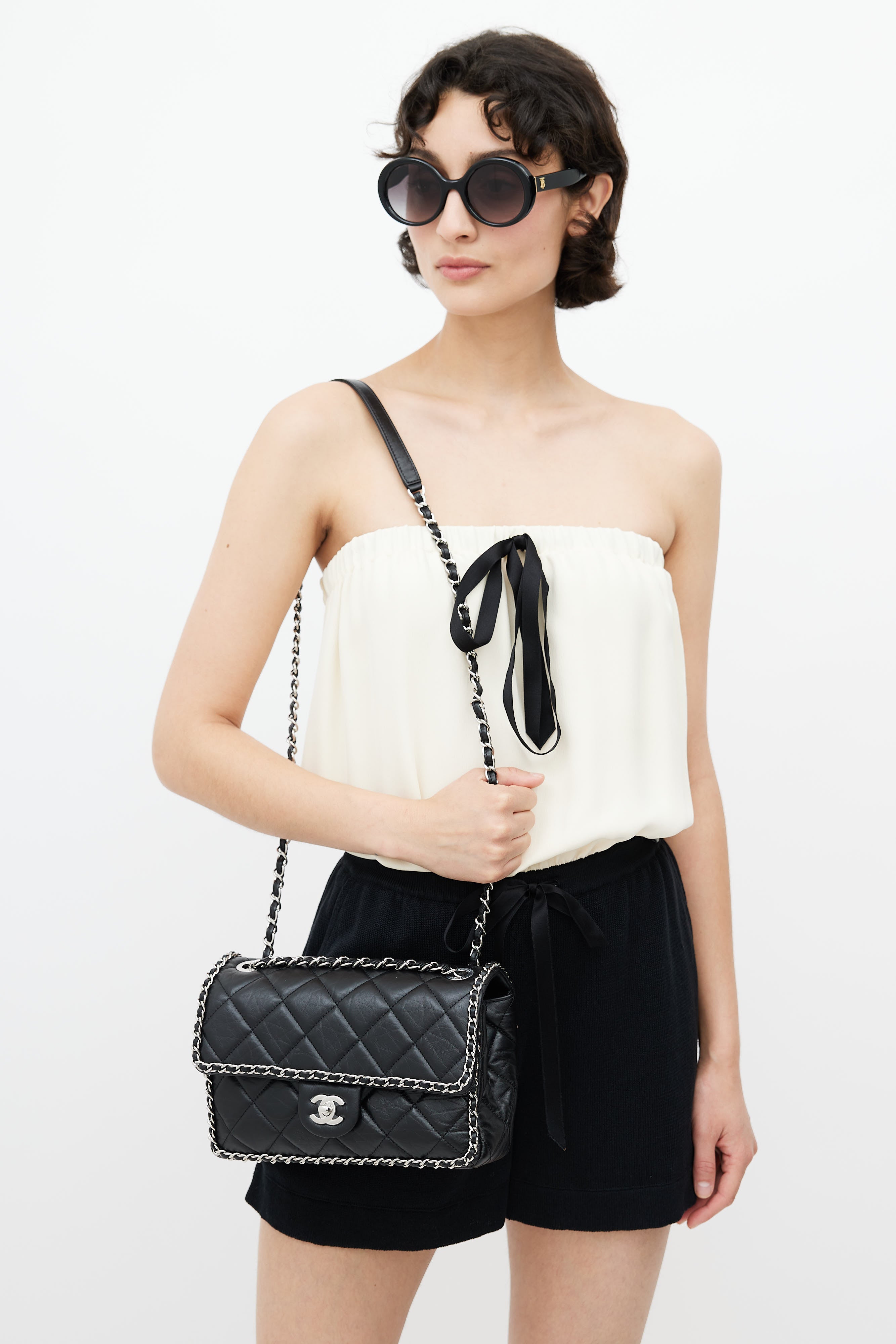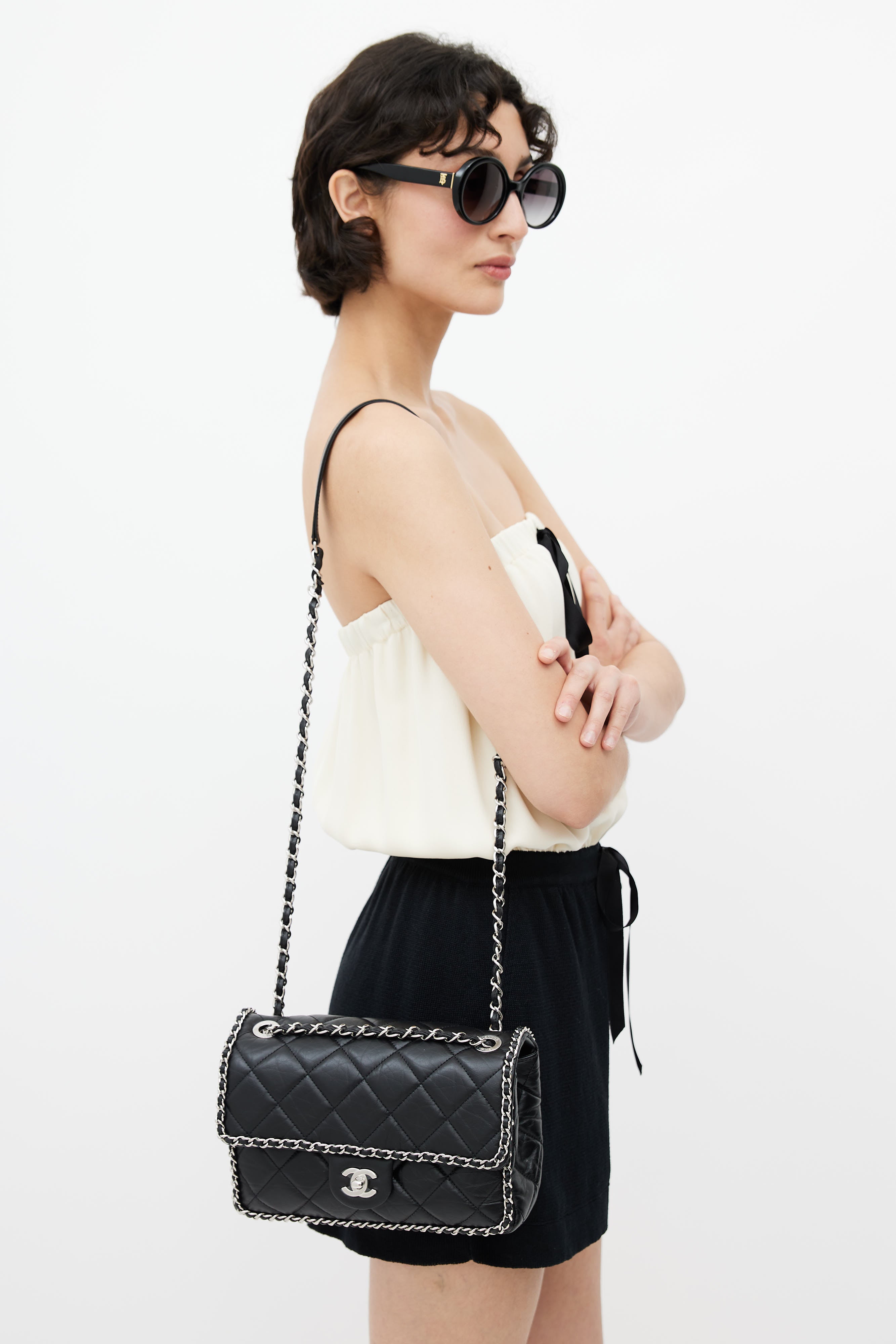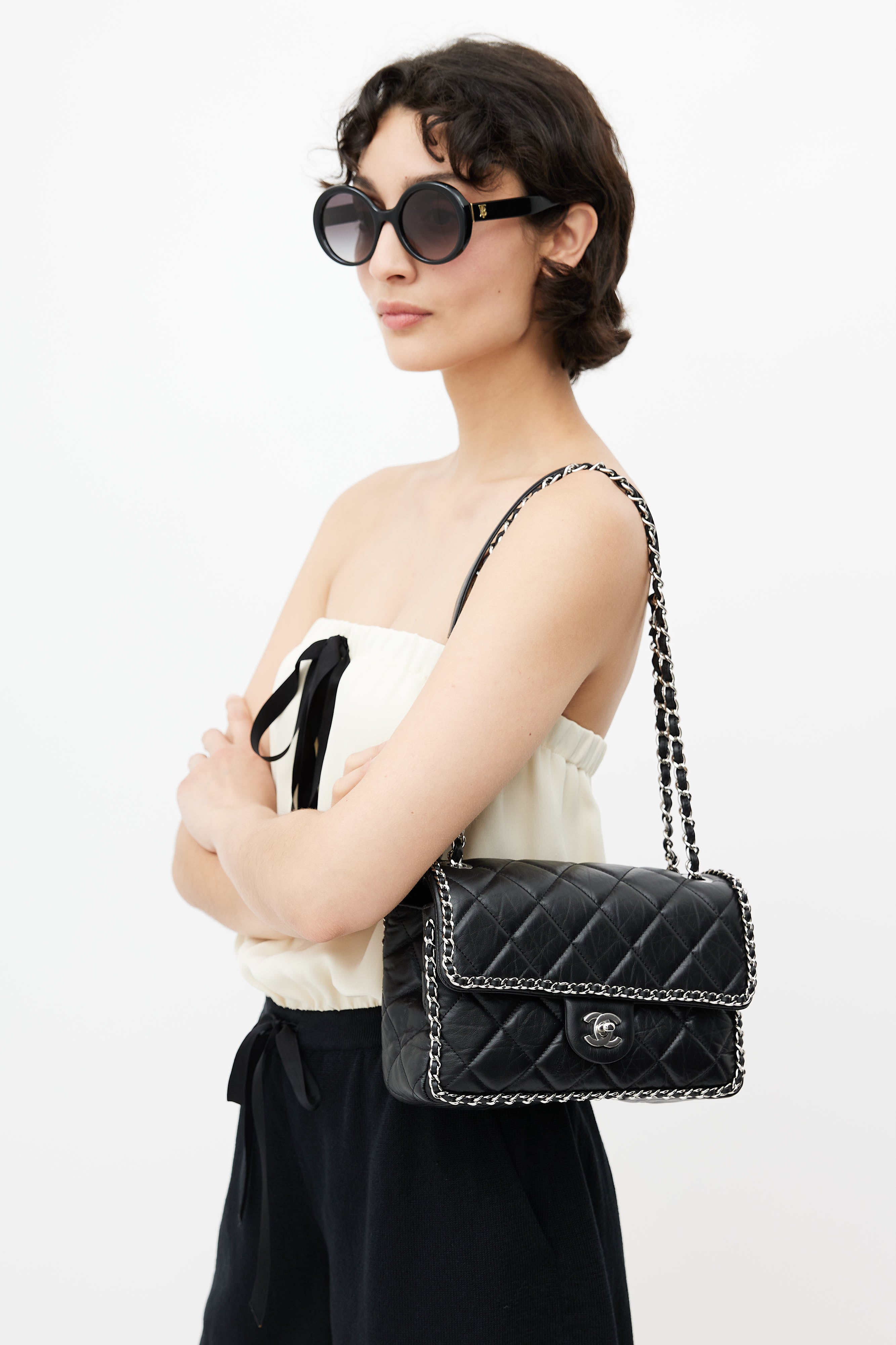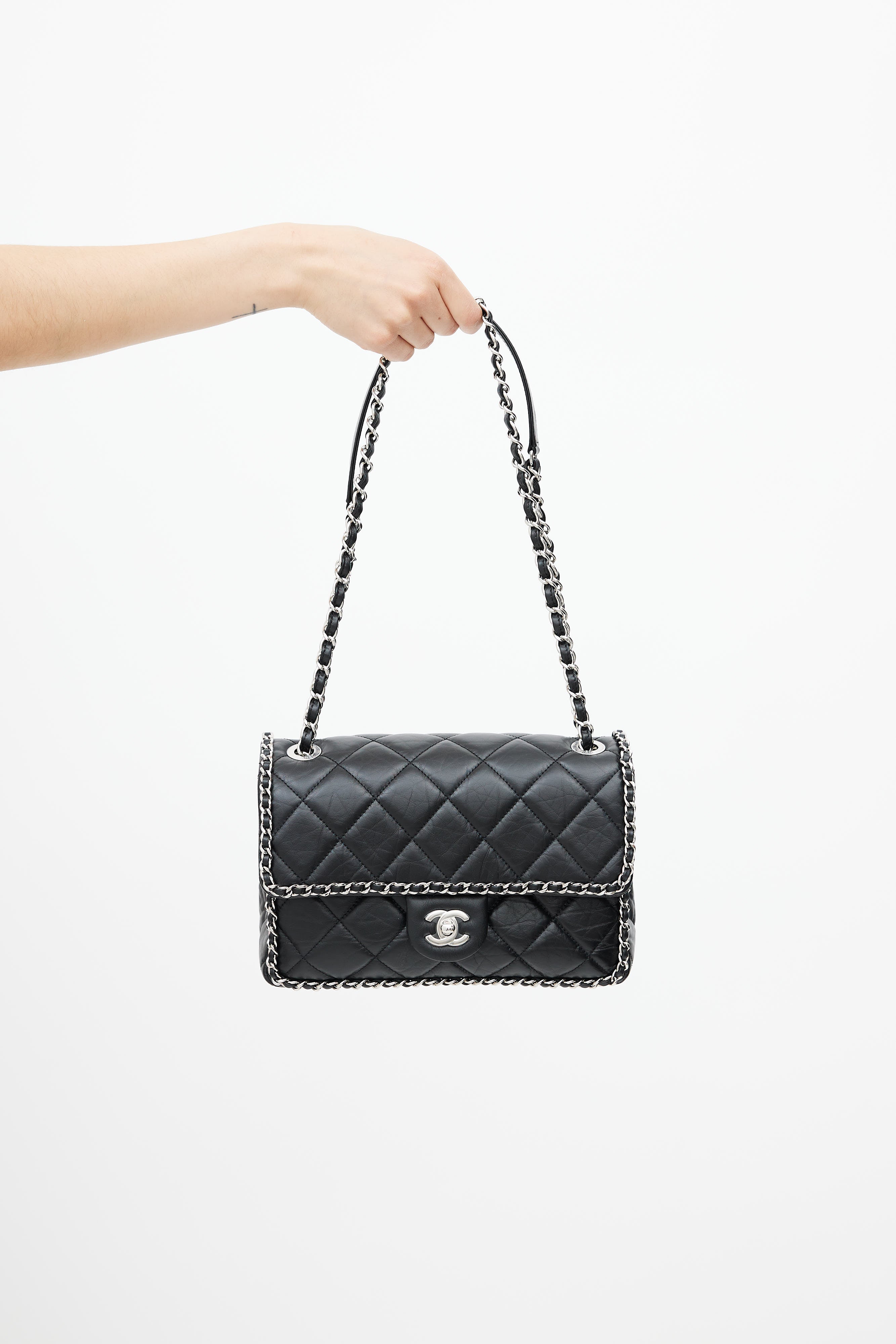 Pre-owned 2019 Chanel black Chain Around crossbody bag featuring aged black quilted leather, silver tone hardware, CC logo at front, turn lock closure, chain trim, adjustable chain shoulder straps, lined main compartment, and interior zip pocket. Comes with original dust bag and brand authentication card.