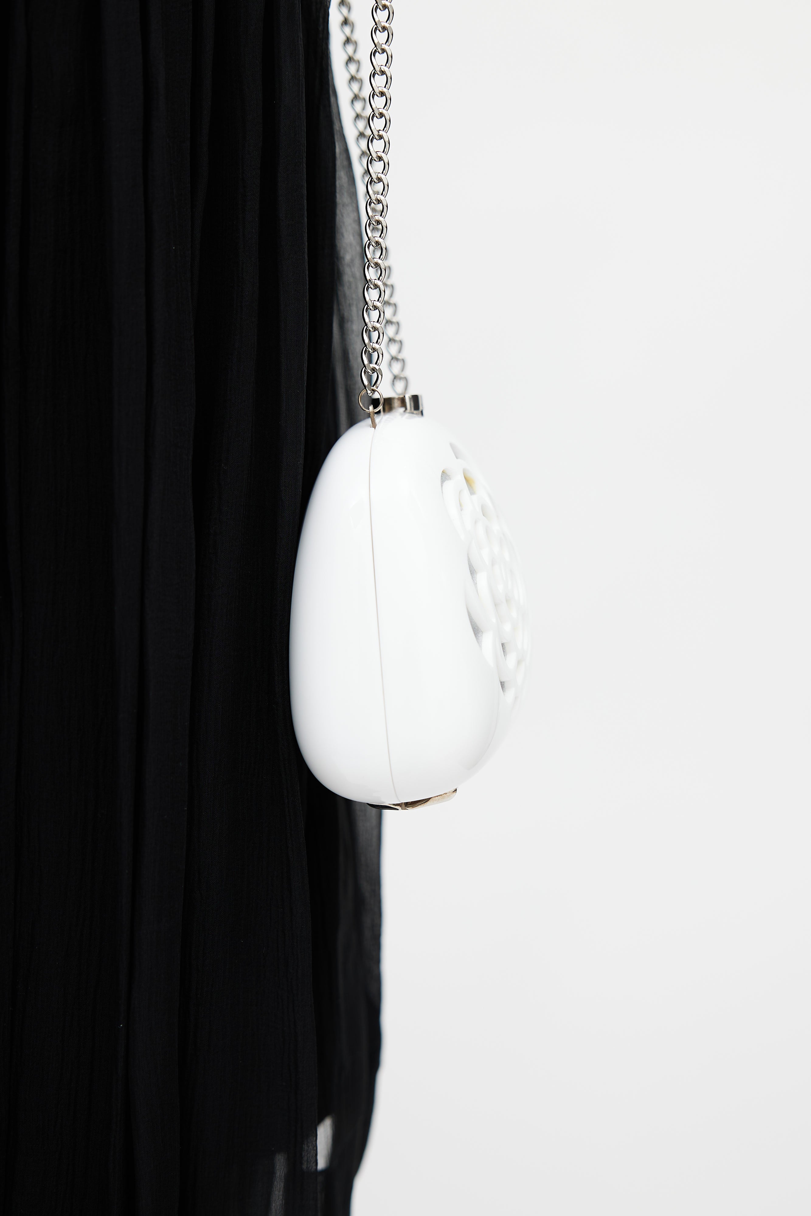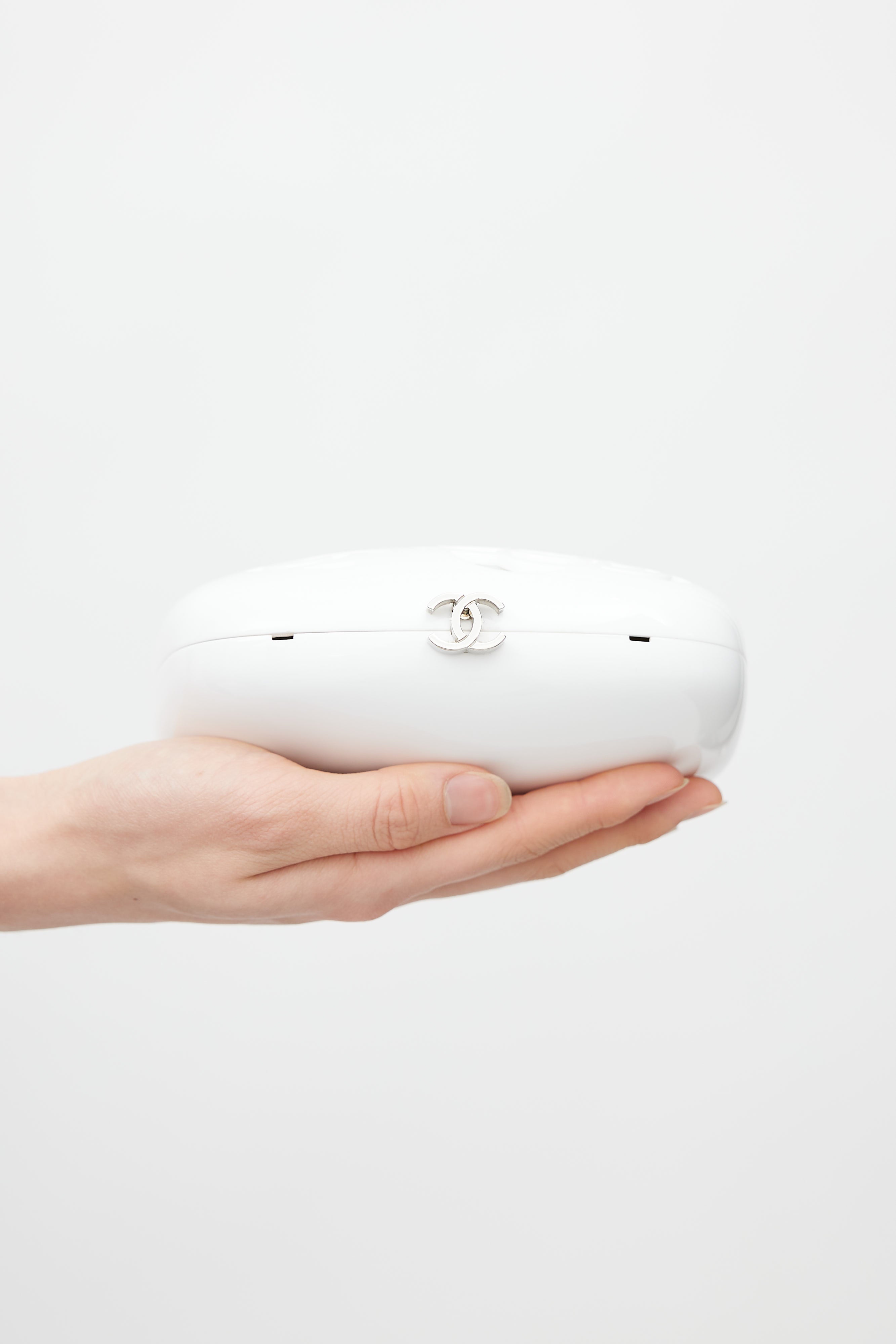 Pre-owned Spring 2007 Chanel white Camellia Minaudière crossbody bag featuring white enamel Camellia cut out at face, silver tone hardware, CC push lock closure at top, metal feet, chain shoulder strap, and lined main compartment. Comes with brand authentication card, original dust bag and box.