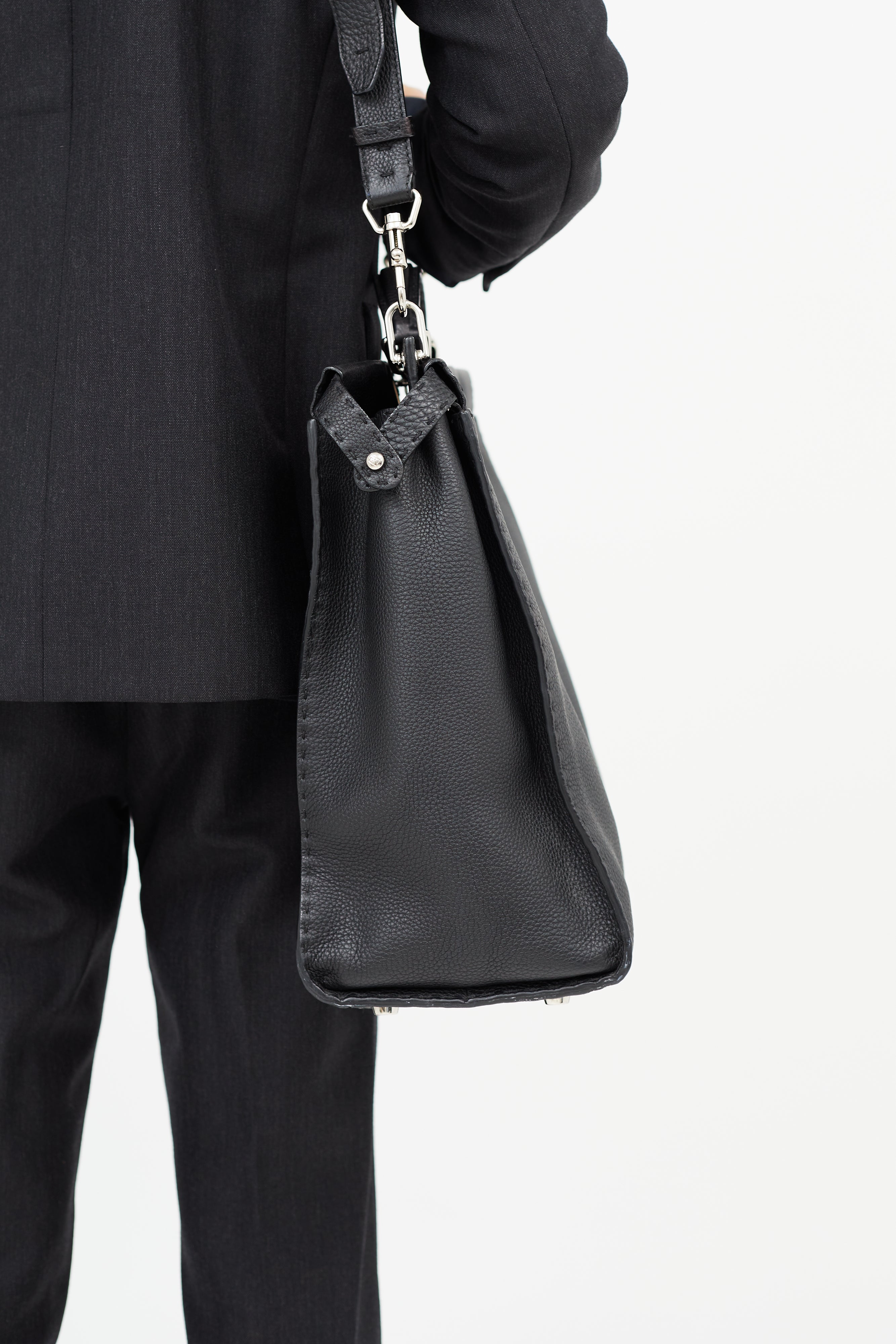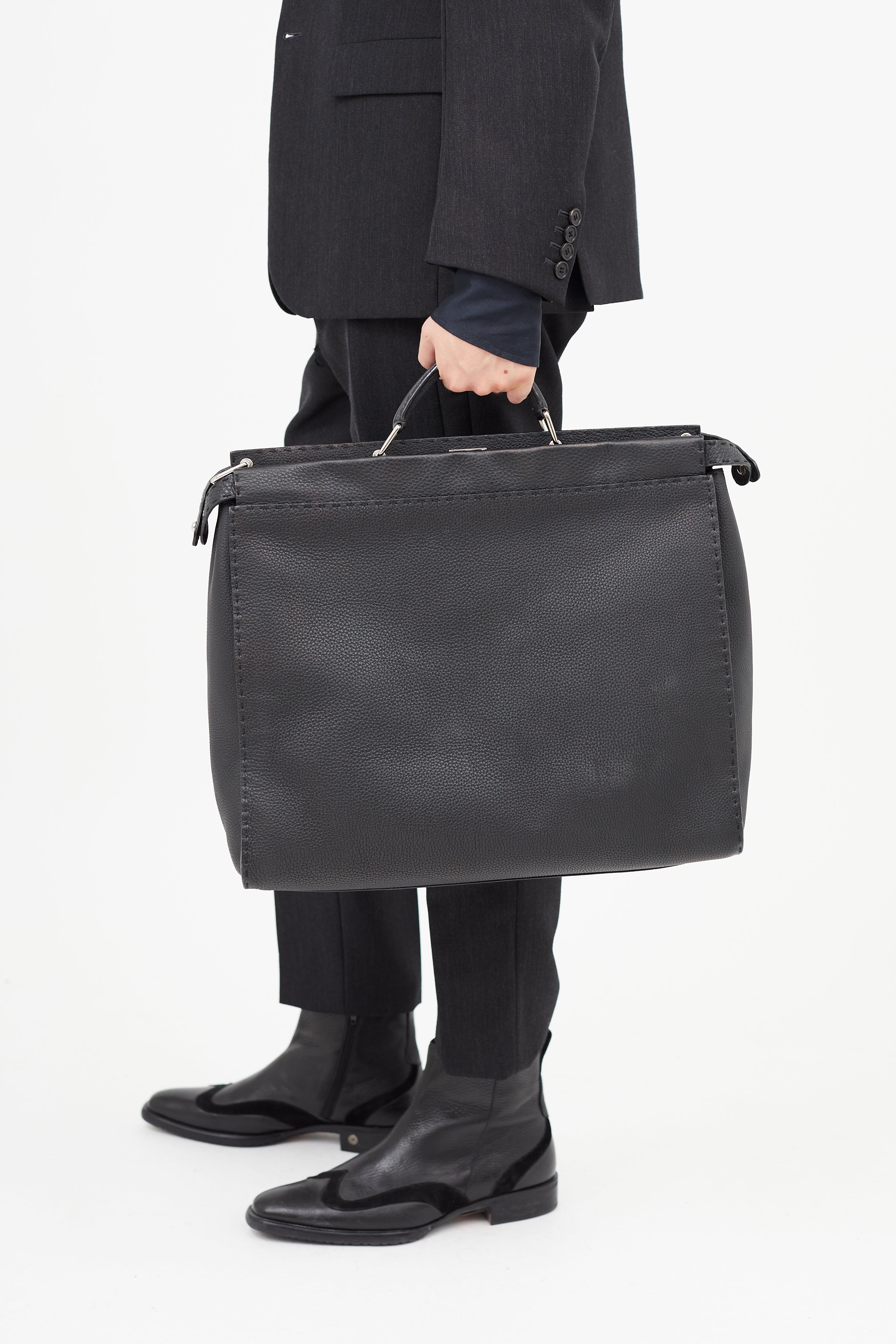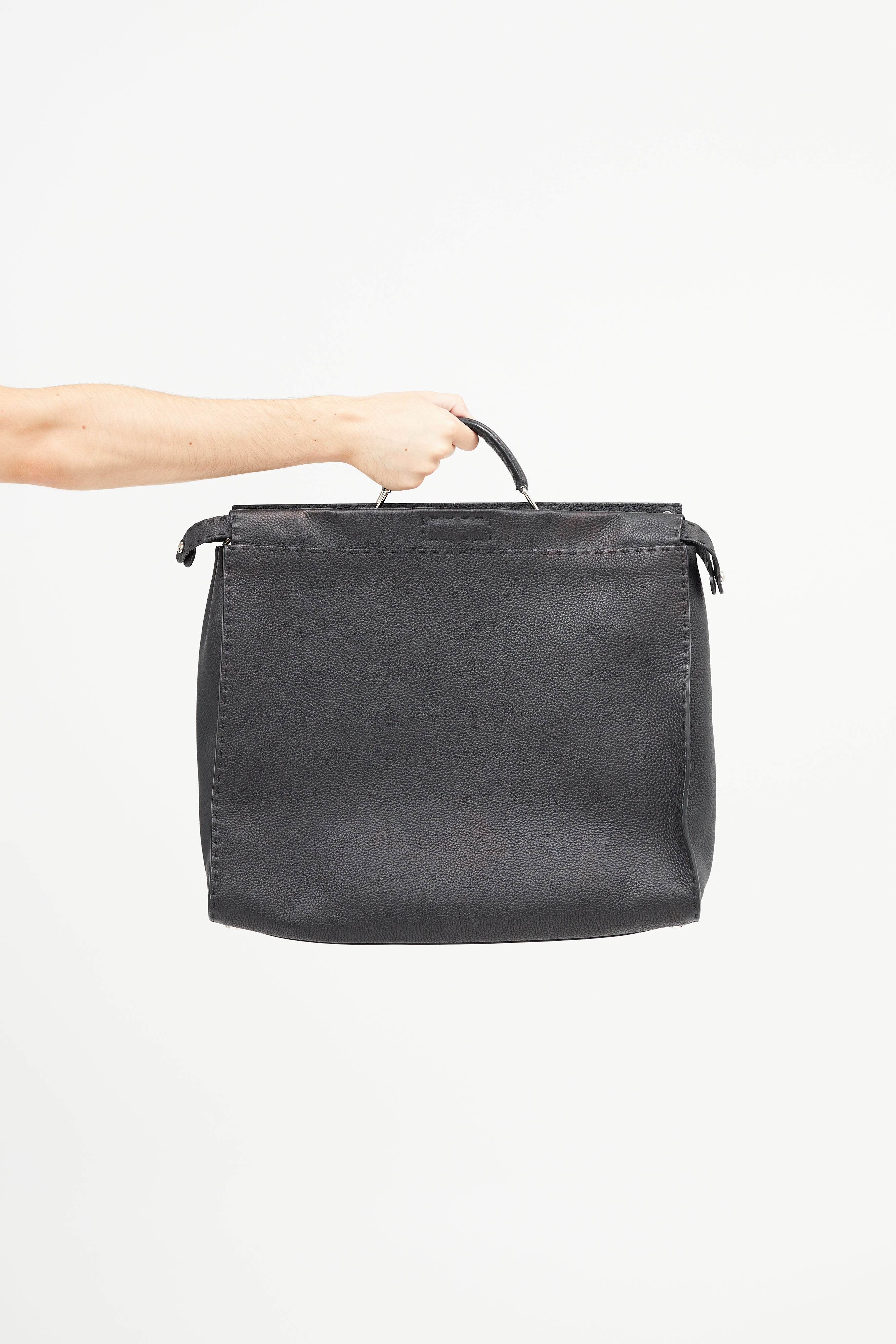 Pre-owned Fendi black Monster Selleria Peekaboo bag featuring structured top handle, detachable shoulder strap, tonal stitching throughout, clasp closure at front pocket, zip closure at back pocket, lined main compartment, and interior zip pocket. Comes with original dust bag. Entrupy Certificate included.
